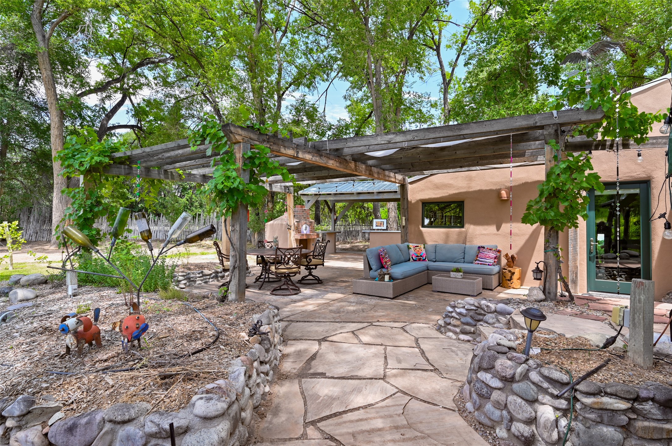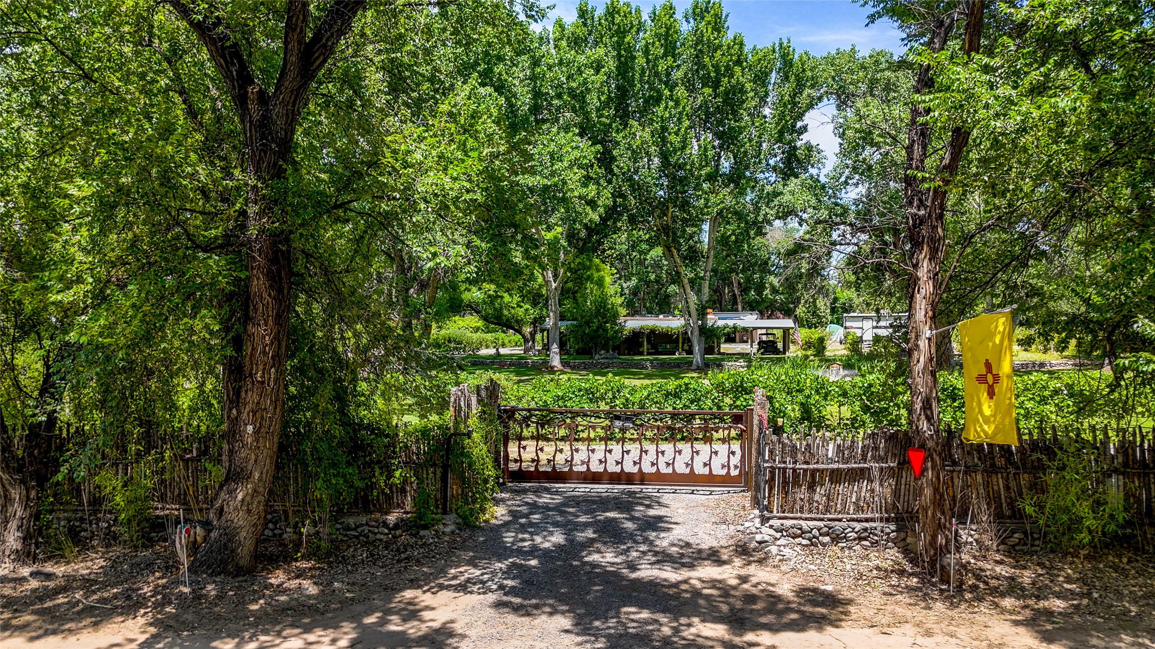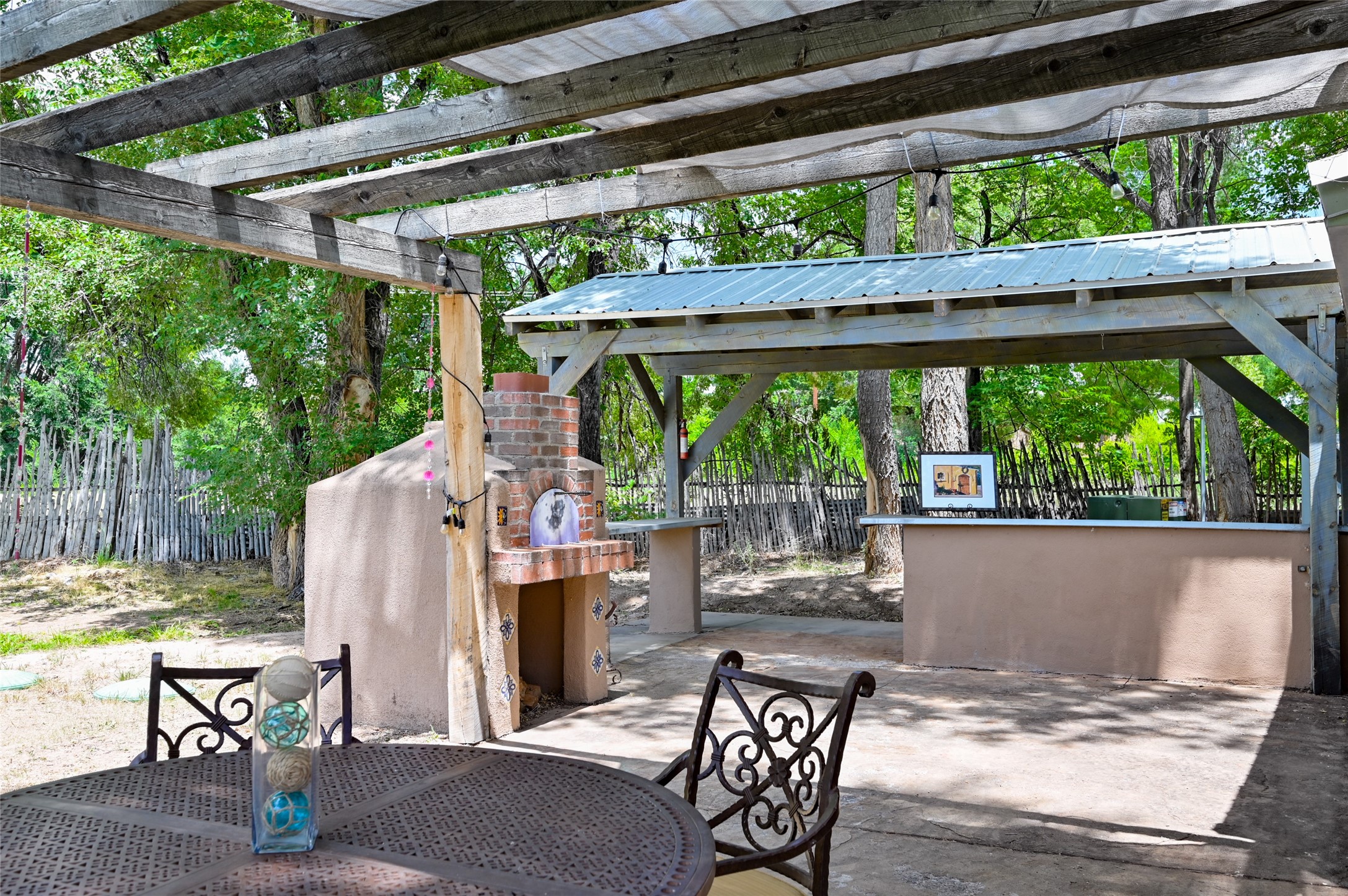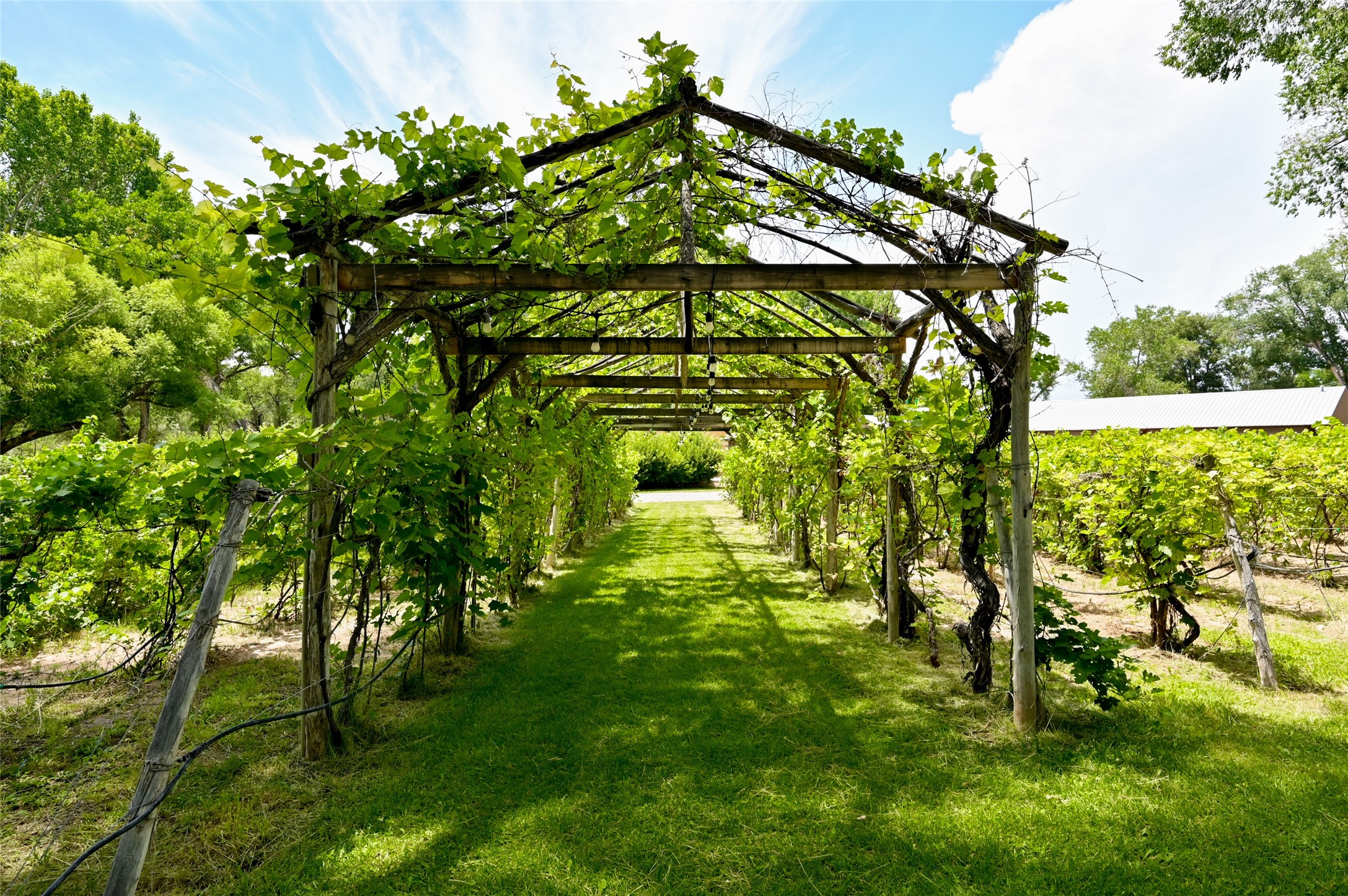 Heavenly 4.5-Acre Estate in Pojoaque Valley - Vineyard, Casitas & More!Rare opportunity to own one of the most spectacular estates in the Pojoaque Valley, just minutes from downtown Santa Fe. This 4.5-acre property offers a serene retreat with 3 acre-feet of domestic water rights and 6.91 acre-feet of irrigation water rights, supporting both vineyard expansion and lush garden potential. The grounds are also home to mature apple, plum, pear, and cherry trees.The main residence is a classic adobe featuring 4 bedrooms and 2 bathrooms (ESTIMATED SQ. FT. 2300), with traditional New Mexican details including vigas, brick floors, two rock fireplaces, and a spacious portal perfect for outdoor living.Three additional casitas (ESTIMATED TOTAL 3100 SQ. FT. COMBINED) provide excellent flexibility:1BR/1BA Casita - 800 sq. ft.2BR/2BA Casita - 811 sq. ft.1BR / 1BA Casita ready for your personal touch and renovation vision - 1500 sq. ft.Ideal for short-term rentals, guest stays, or multi-generational living.Outdoor amenities offer exceptional entertainment and relaxation opportunities:25-person hot tub/poolFirepit lounge areaOutdoor bathrooms and showersBrick pizza ovensWine cellar2 RV hookupsA large metal barn offers generous storage or potential for workshop, studio, or event use.Whether you dream of running a boutique vineyard, hosting retreats, or simply living in peaceful luxury, this unique Pojoaque Valley estate delivers charm, privacy, and unlimited potential.