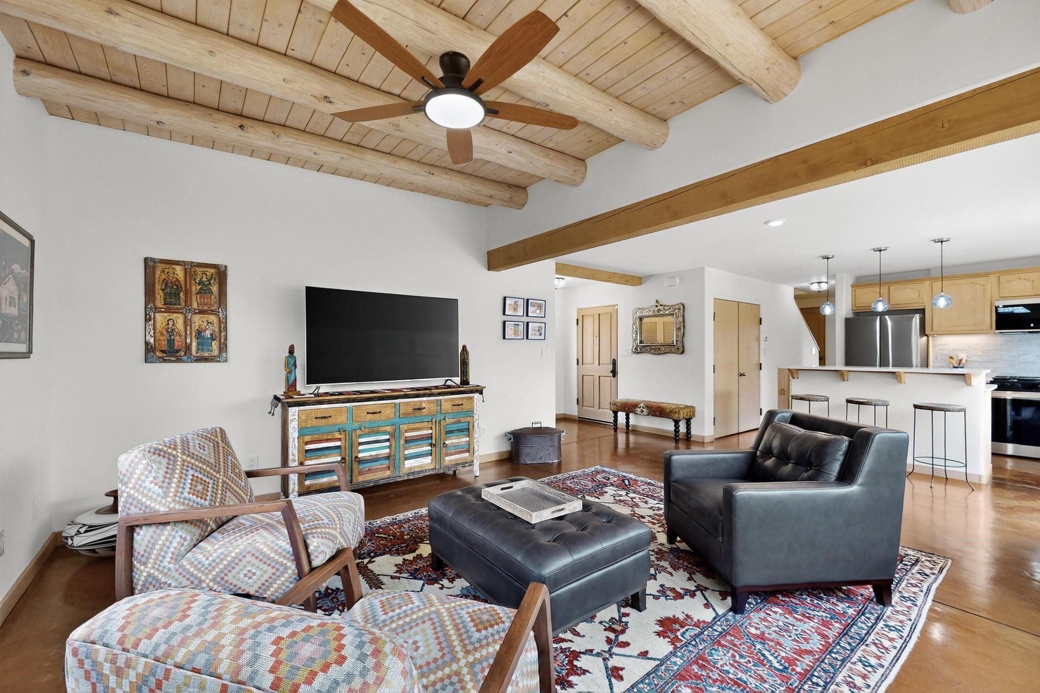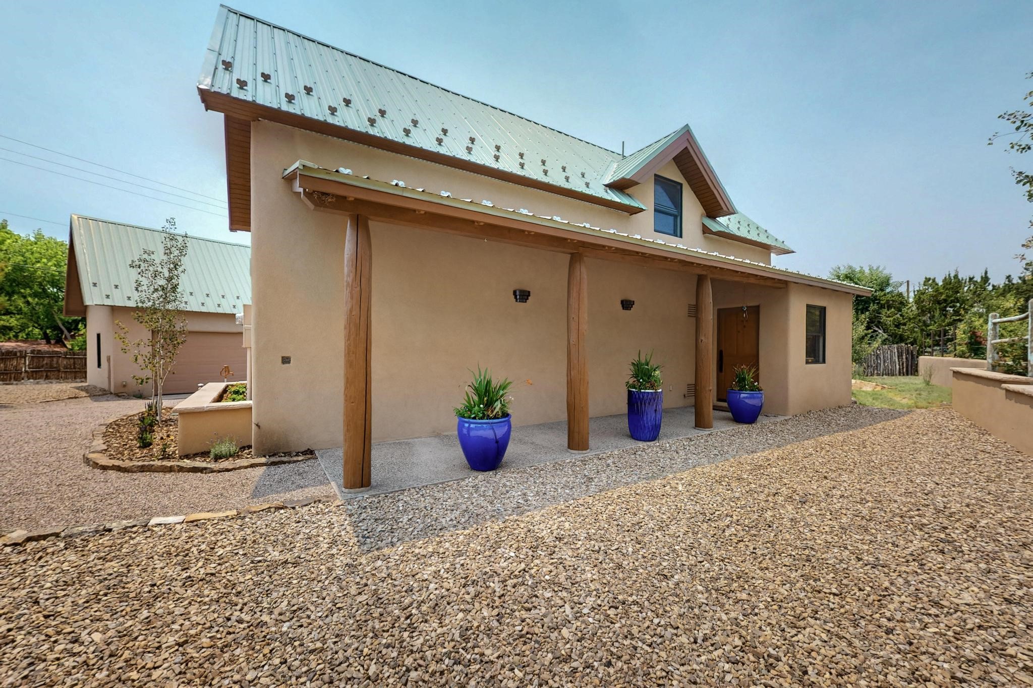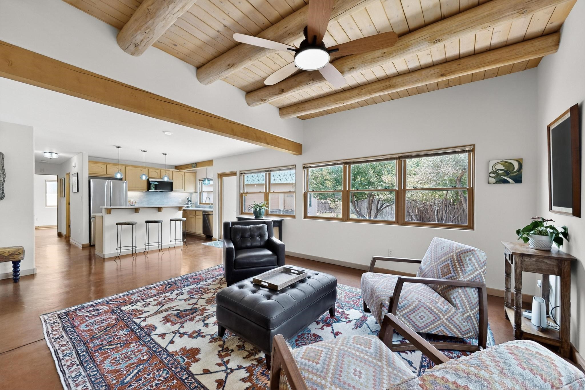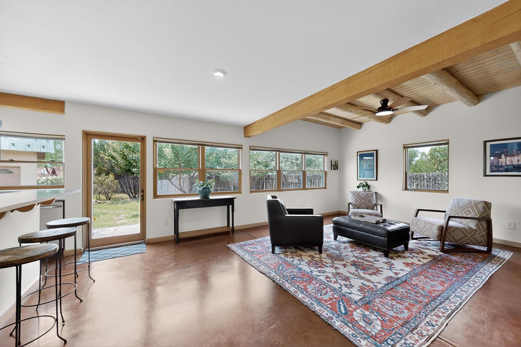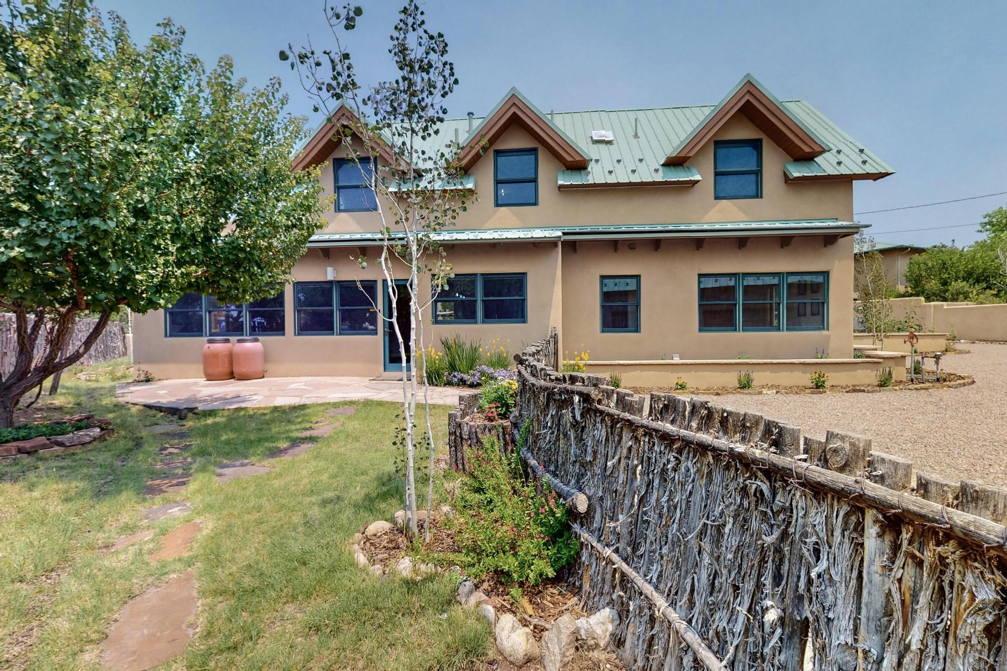 Smartly updated, Northern New Mexico Style, passive solar home. First Energy Starhome in New Mexico featuring high quality construction and outstanding efficiency!Inside you will find stained concrete radiant floors, new high-quality carpet upstairs andan abundance of beautiful natural light throughout the home. Tasteful finishes havebeen newly added to the kitchen and baths including new quartz countertops, sinks,matching faucets, lighting accents as well as brand new Wi-Fi ready Samsung StainlessSteel appliances. Other recent updates include a Lutron wireless automated lightingsystem, new smart smoke/CO detectors and thermostats, Moen Flow water leakdetection system and a filtered drinking water system. Feel at ease with brand newradiant heat boiler and control system as well as new domestic hot water heater. Thehome enjoys lovely Sangre de Cristo Mountain views from the primary upstairsbedroom with walk in closet. Outside you will find copious parking for guests and toys.The extensive low maintenance landscaping surrounding the property brings a pastoralfeeling with blue grama, Aspen trees and flowers amongst artful custom stone walls allautomatically watered with a Wi-Fi controlled irrigation and drip system. The detached580 sq/ft heated, insulated and finished garage could easily serve as an excellentworkshop, studio, or guest house. The garage also boasts a full, equally sized attic forextra storage or the option to finish. This would be a great location for the LANL commuter or someone looking for an ultra-convenient location just minutes from Plaza, the Railyard, and the Montanita Co-op. Enjoy a very short walk to the river trail, Frank Ortiz dog park and city open space trails, or a quick mountain bike ride from this hometo La Tierra trails and more. This home offers easy connection to all that Santa Fe has to offer!