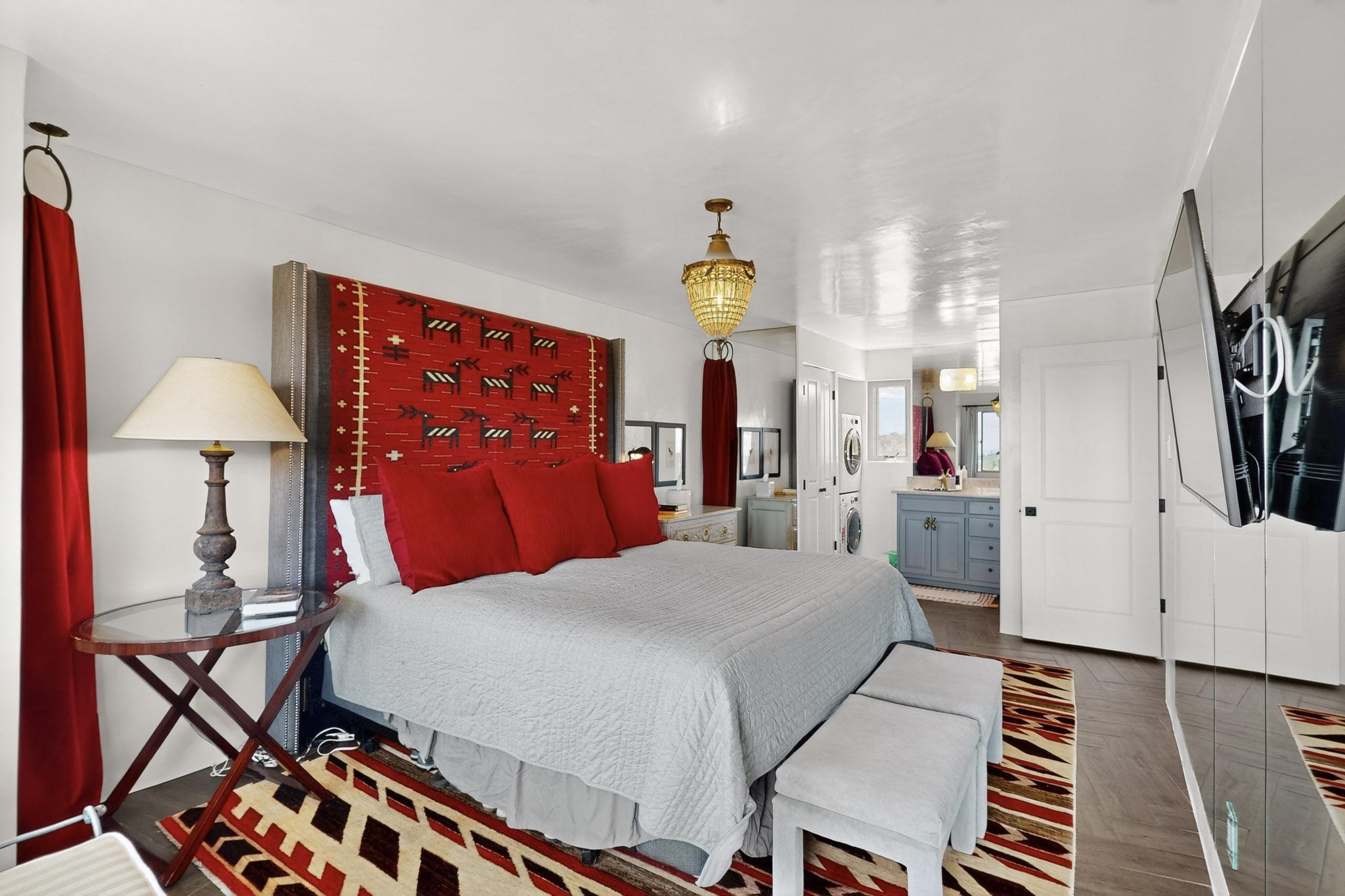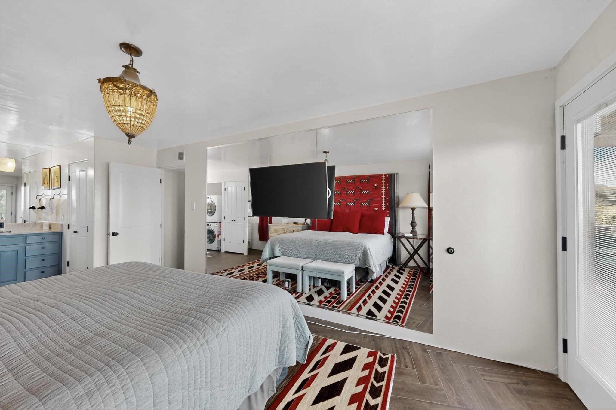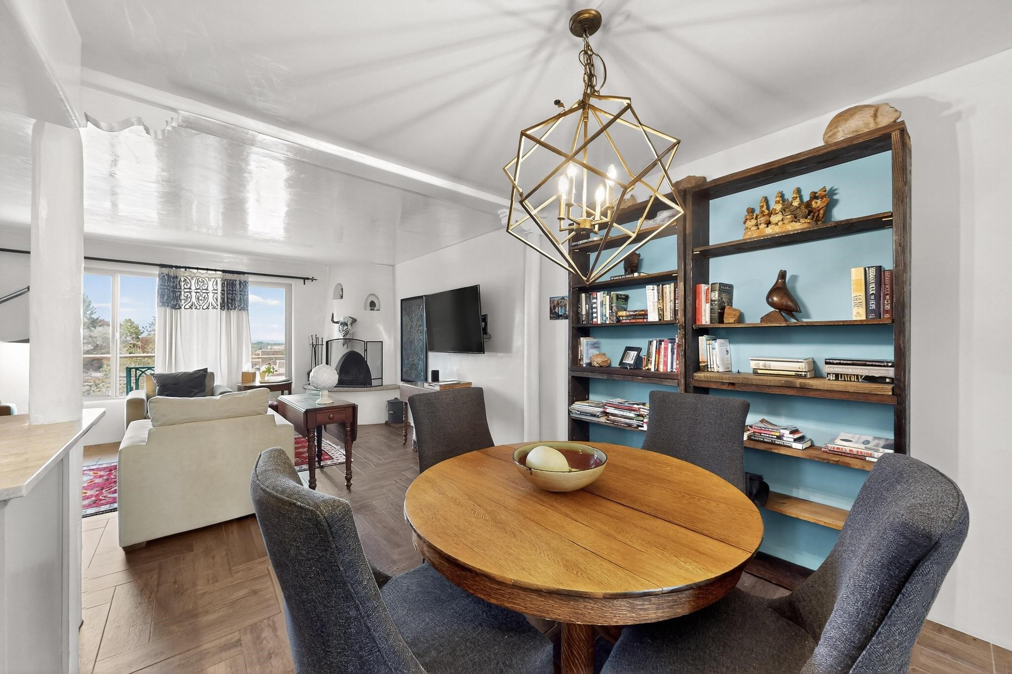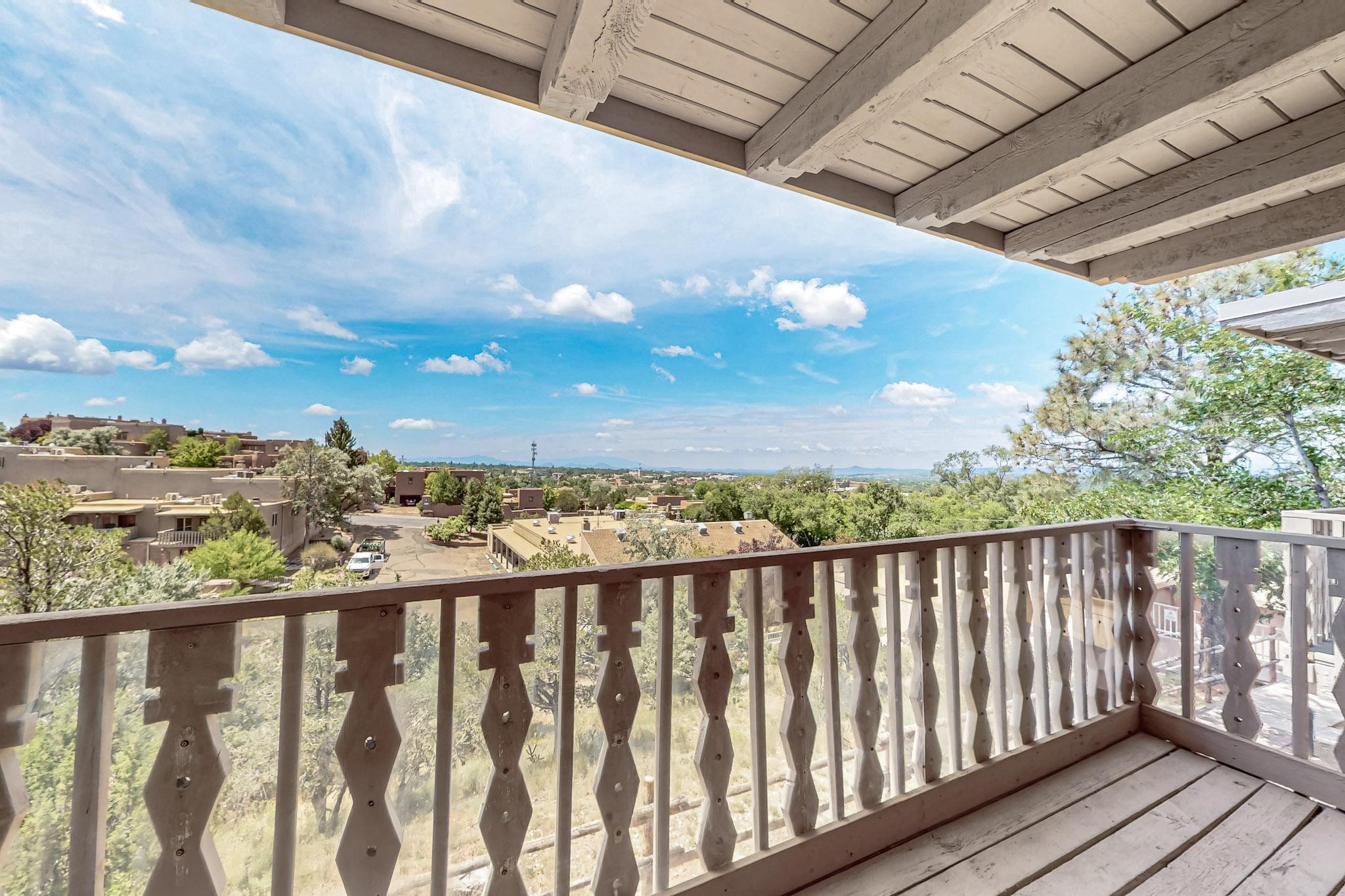 This lovely and convenient two story condo is located not far from the plaza, close to Fort Marcy, and at the bottom of the road leading up to the ski basin. The unit overlooks the green area in the center of the complex, with plenty of light. The living room has a charming kiva fireplace in the corner and views, the dining area has a full mirror to add to the space, and there are built in bookcases. The galley kitchen is convenient and a delight. Located on the main floor is a bath. Up the stairs are two bedrooms, both with access to a private balcony. There is a nicely sized primary bedroom with a private bath and a stacked laundry, and a guest bedroom with a bath in the hall. This beautiful condo complex is arranged on a hill with lovely views, a heated indoor swimming pool, hot tub, storage, rv parking, and on-site management. This particular unit has new heating, air conditioning, roof, and hot water on demand. All furnishings can be included.