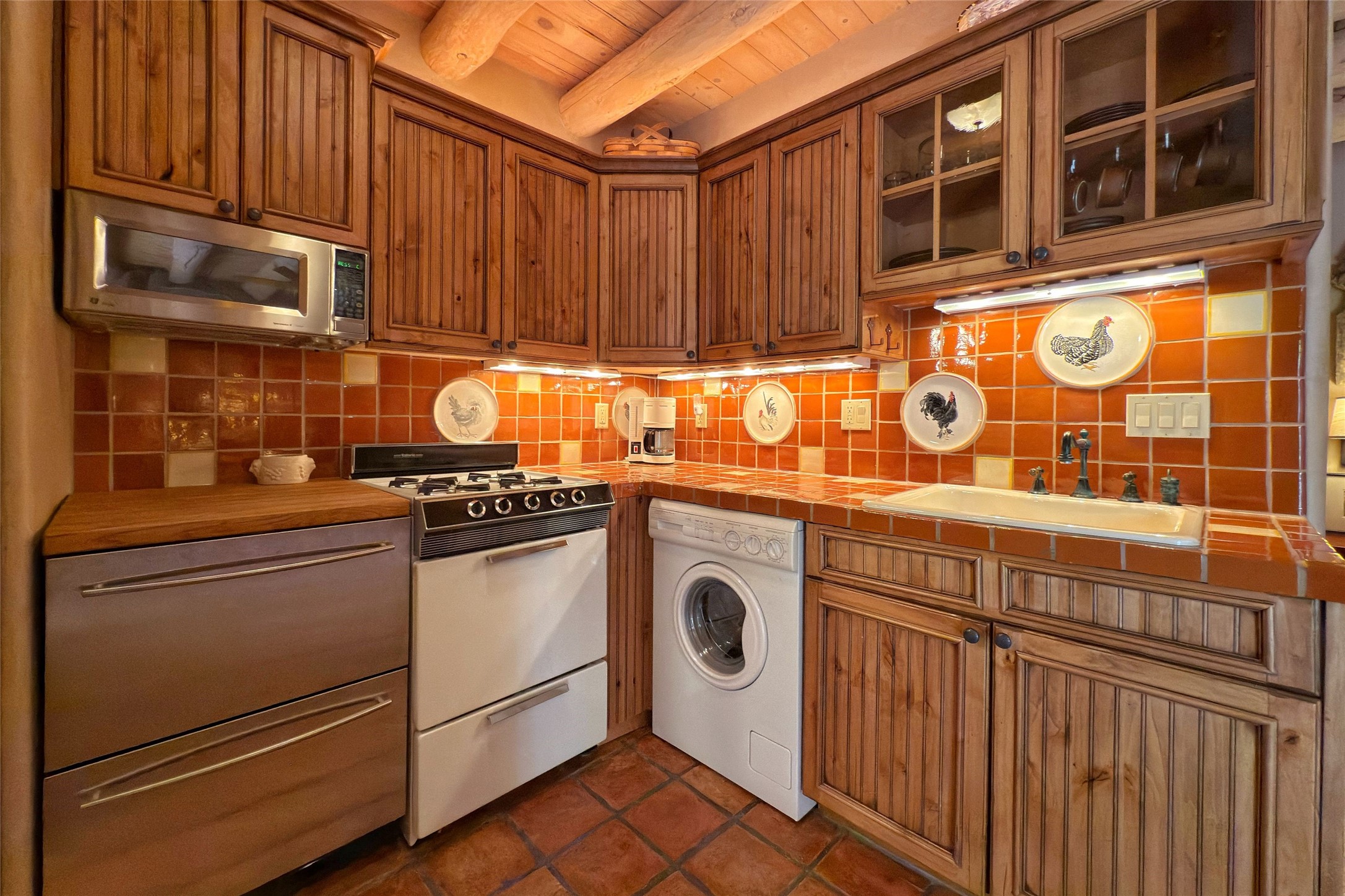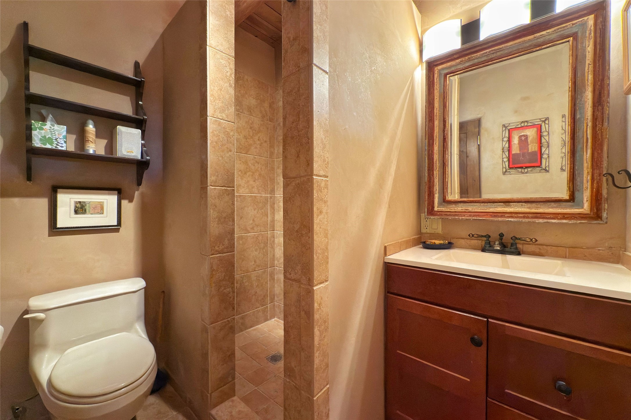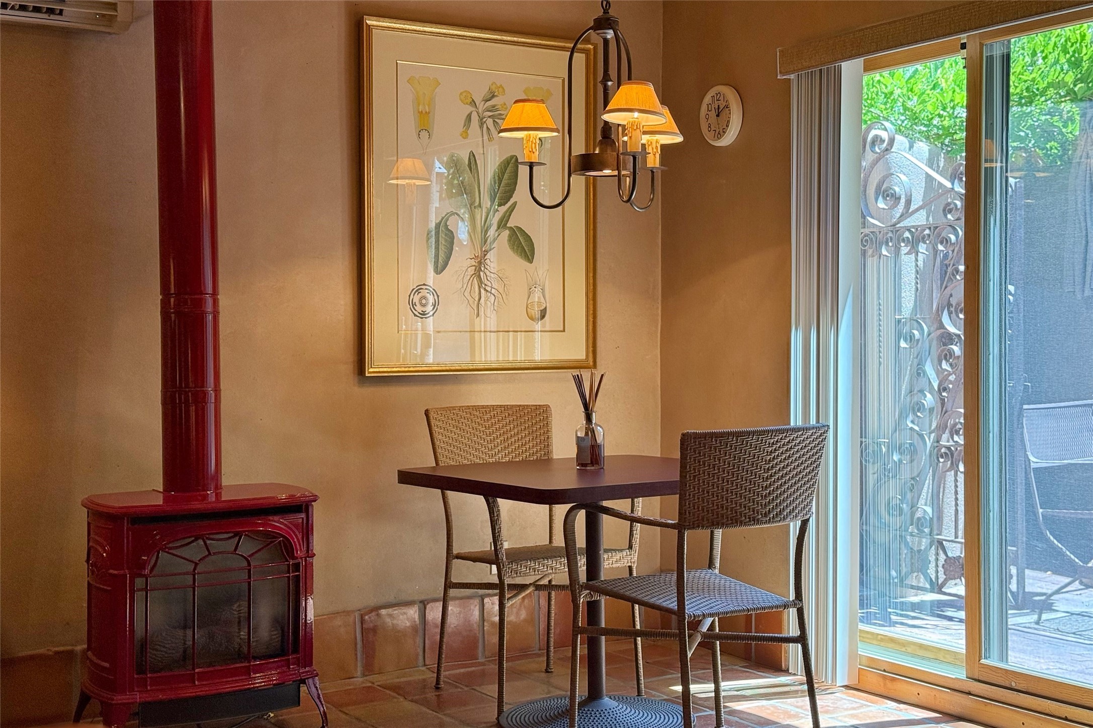 Old World elegance meets Santa Fe charm in this beautifully crafted 3 bed/3 bath in a prized location. The residence blends timeless design elements with thoughtful modern touches across a layout that is both sophisticated and comfortable. From the moment you step into the dramatic foyer, featuring carved wooden doors, crystal chandelier, and antique sconce, you're greeted by exquisite craftsmanship and distinctive character. The main living area is anchored by a large stone fireplace. Raw wood vigas enhance the design while venetian plaster walls, art display lighting, and elegant finishes create an ideal setting for both entertaining and relaxation. The dining room boasts a hand-painted Western motif ceiling while the chef's kitchen features cherry cabinetry, handmade tile backsplash, granite countertops, butler's pantry, and a wet bar with Italian tile and a wine fridge. Hidden storage adds functionality, and the kitchen opens to the main portal and garden. The first floor includes a versatile flex room/office with patio access and a stunning bathroom with a hand-carved Mexican vanity with bone inlay and copper basin. Upstairs, the family room includes another large stone gas fireplace, entertainment unit, expansive windows showcasing downtown views, and a wrap-around deck with oversized shaded lounge chair. The primary suite offers privacy and luxury with double doors, deck access, a hidden storage wall, and a spa-like bath with silver-leaf dome lighting, hand-made ceramic inlays, travertine finishes, and granite vanities. Outdoor living is elevated with a lush back garden with waterfall pond, tiled fresco wall, gas grill, and a dining portal shaded by mature trees. An attached casita welcomes you with a water feature at the private entrance, Saltillo tile, vigas, and kitchenette, perfect for guests or rental income. Truly a work of art, this turn-key home, includes all of the pictured furnishings, and captures the essence of Santa Fe living in every detail.