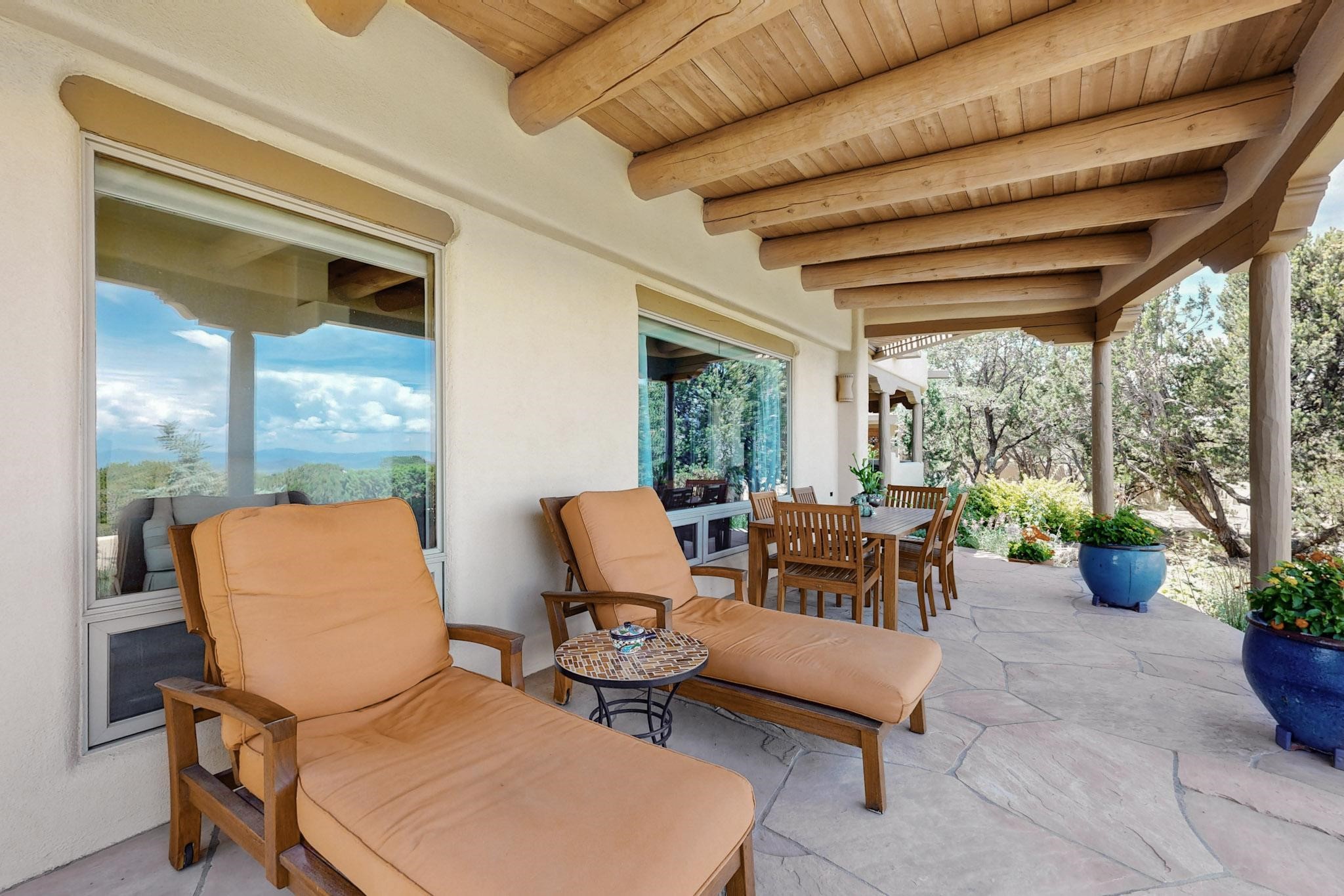 Vast sweeping panoramic western views define this exceptional property. The main house includes a primary bedroom suite with a fireplace, comfortable sitting area and a spa bath for relaxation. Large windows showcase the expansive western vistas, and doors lead to the portal. An additional room serves as either a TV room/office or bedroom and features its own fireplace and stunning views of the Sangres. The open floor plan seamlessly connects the living room, dining room, and kitchen, all centered around the fireplace. A unique and charming casita complements the main residence, equipped with a kitchenette, bath, and a cozy fireplace, making it ideal for guests or extended living. The wraparound portal, featuring a fireplace, showcases sweeping western views, offering the ideal setting to enjoy breathtaking sunsets. Relax to the soothing sounds of the stone fountain and enjoy watching the birds and butterflies in the fragrant colorful garden. A large patio area including a built-in grill, features additional space for relaxing and entertaining. The rooftop deck offers spectacular 360-degree views and the gated and walled property offers privacy.
