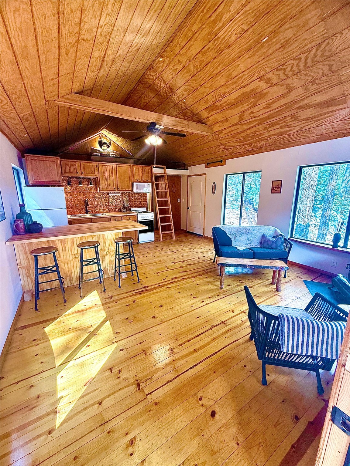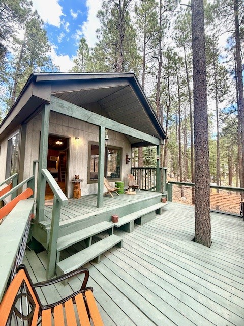 Elevated Mountain Style in Thompson Ridge! This newly refinished 1BR. 3/4 Bath -Cabin is the ultimate four-season escape, designed for effortless living & smart investing. Featuring a custom kitchen island, sleek new finishes, and a striking wood burning stove that anchors the space with warmth & character. Panoramic windows flood the interior with light framing stunning woodland views. A charming loft adds flexible space for guests or gear. Enjoy crisp mornings on the elevated deck, perfect for your best cup of coffee yet. Low maintenance, low cost, tasteful design. This is the refined Jemez Springs retreat you've been searching for--tucked among towering pines, and the best neighbors around. Minutes from hiking, fishing, hot springs, ski trails, this is where New Mexicans go to exhale.In the kitchen New stainless steel Farm Sink. New Microwave. New Island and new Butcher block Counters. Refinished all Pine wood floors * not in bathroom* Shed and Out house convey.