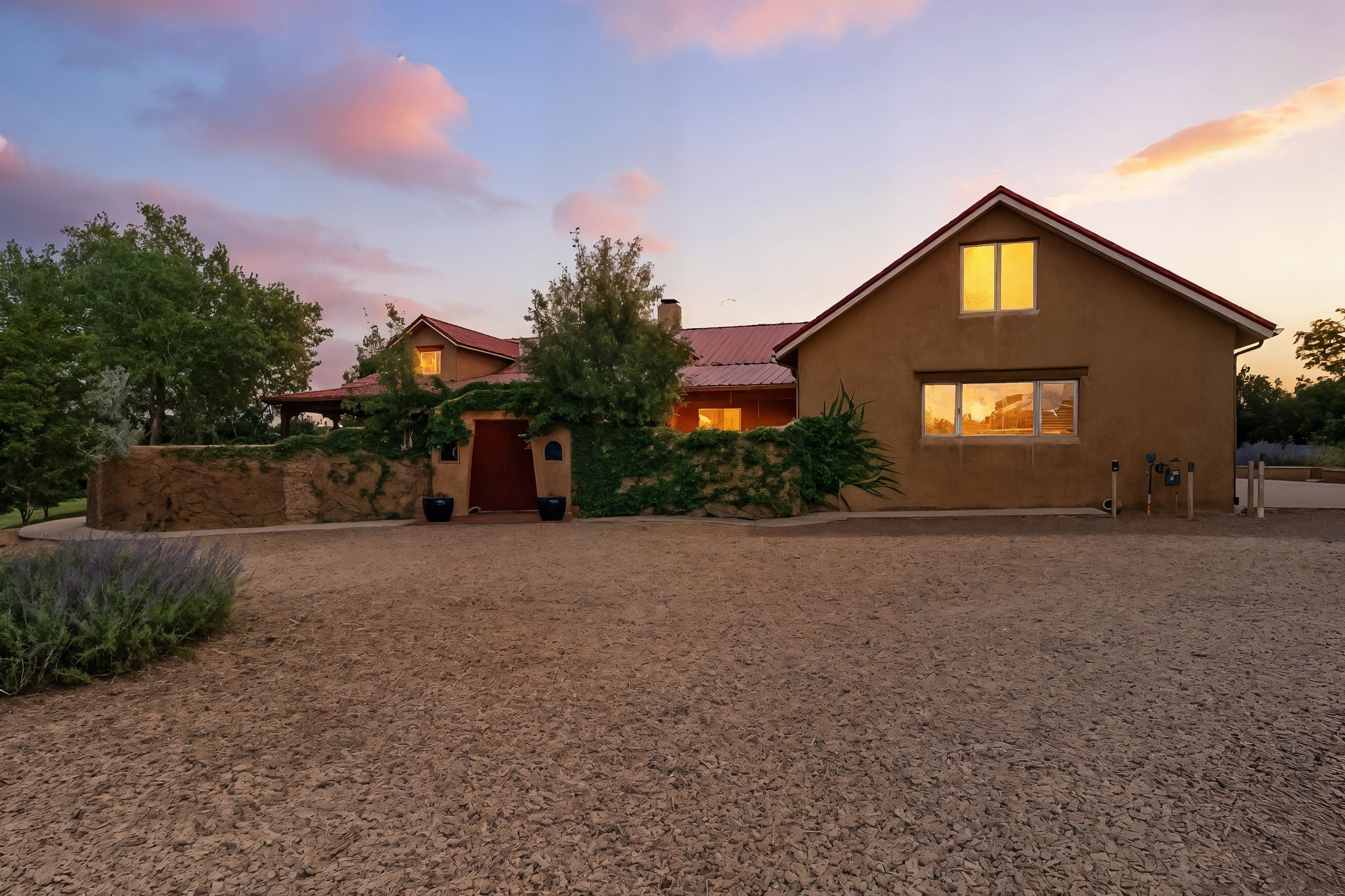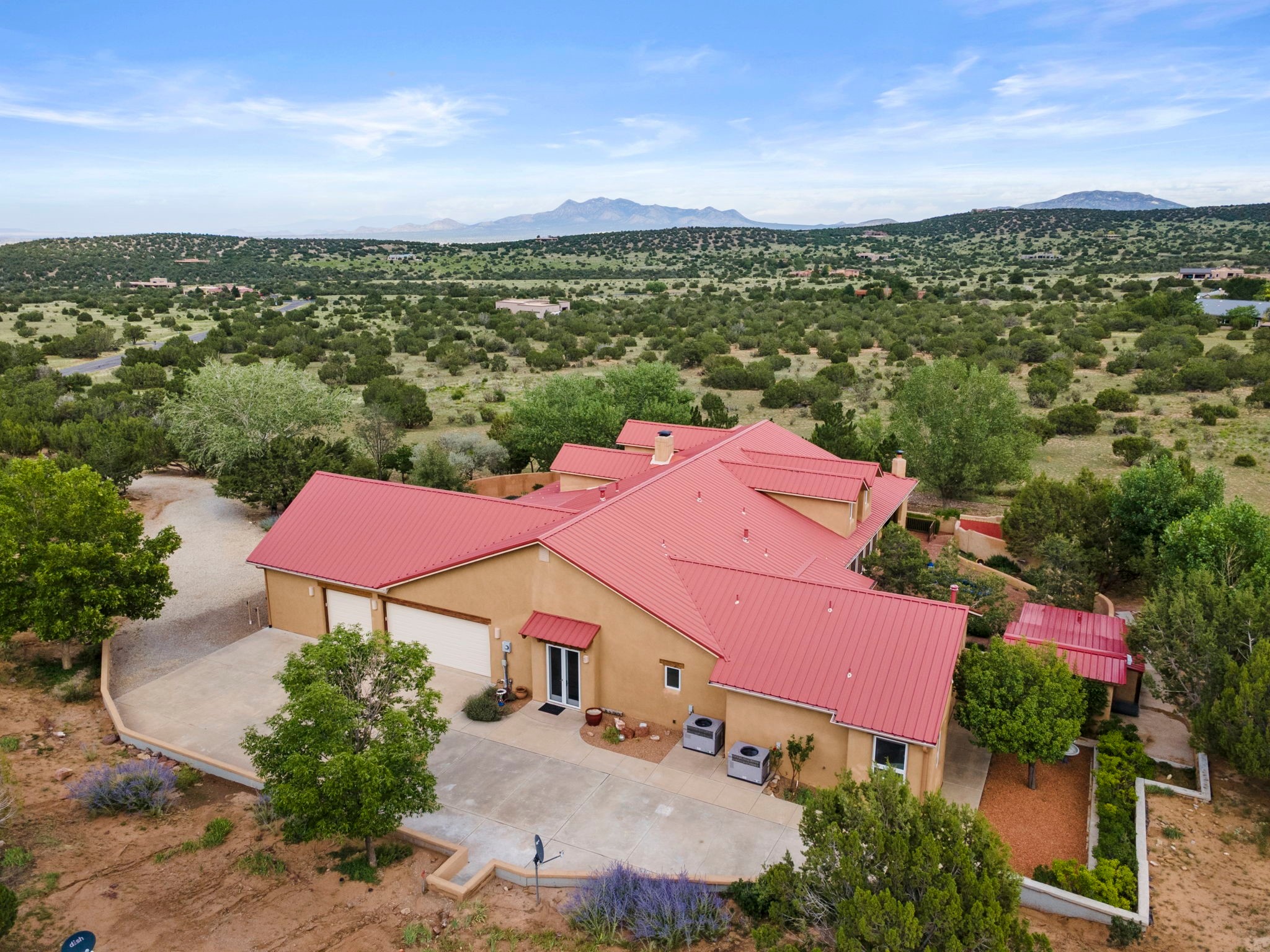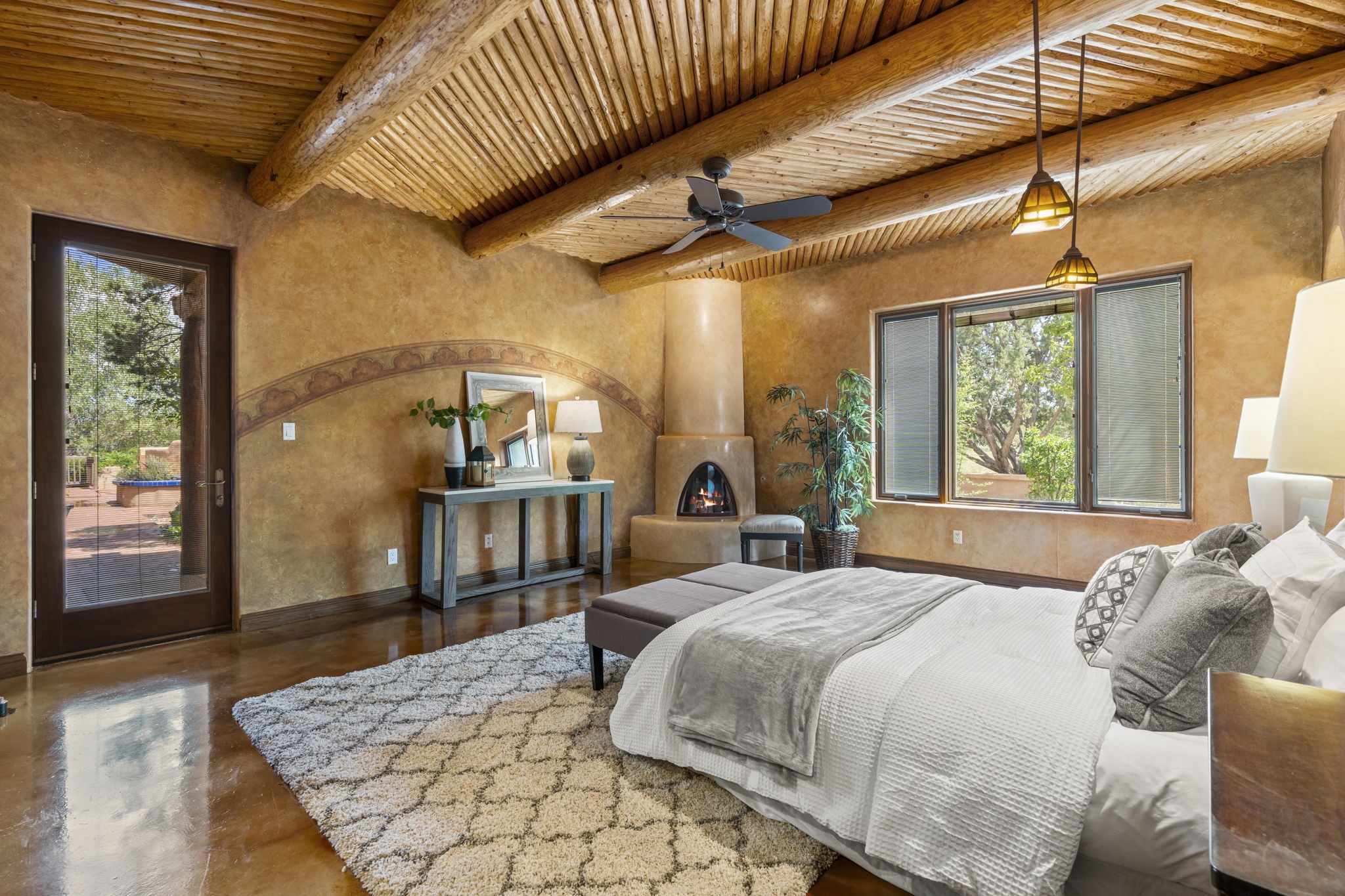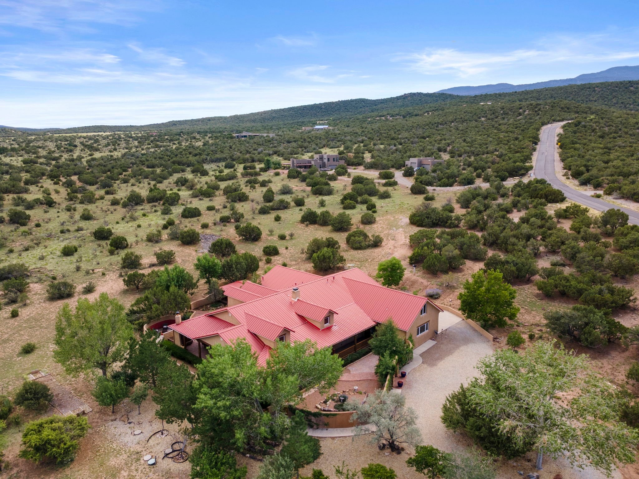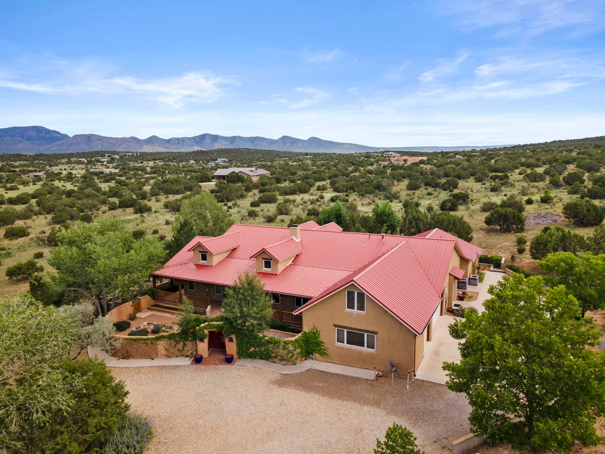 Artistic Mountain Home set on 10.14 private acres in San Pedro Creek, this distinctive 4 bedroom, 4 bath home is a true work of art- blending traditional Northern New Mexican design with creative, custom craftsmanship throughout. Built to inspire, the residence features expansive open-concept living with polished concrete floors, a dual-sided fireplace connecting the living and library areas, and large windows that frame panoramic views of ridges and endless skies. The kitchen is warm and welcoming, with artisanal cabinetry, handcrafted tile, and a layout that encourages gathering and creativity. The home features two separate bathrooms and walk-in closets within the primary bedroom making this space truly one of a kind! As you walk through, you'll be surrounded by beauty from thehand-painted murals, handmade tiles, and natural materials create a rich, organic feel throughout- tied with sleek modern touches in the tankless, wall-hung toilets and the zero entry showers. The office and a separate library offer quiet spaces for work or reading, while the light-filled attic studio is ideal for artists, writers, or anyone seeking a peaceful retreat above the trees. Outdoor living is just as intentional as the interior with all rooms having their own entrance to the exterior- leading to multiple patios and seating areas including an outdoor fireplace and a separate firepit, perfect for stargazing, storytelling, and cool desert evenings. A charming potting shed supports gardening and outdoor projects. The land offers room to roam, with space for gardens, or simply quiet observation of the surrounding wildlife and native flora. Schedule your private showing today!