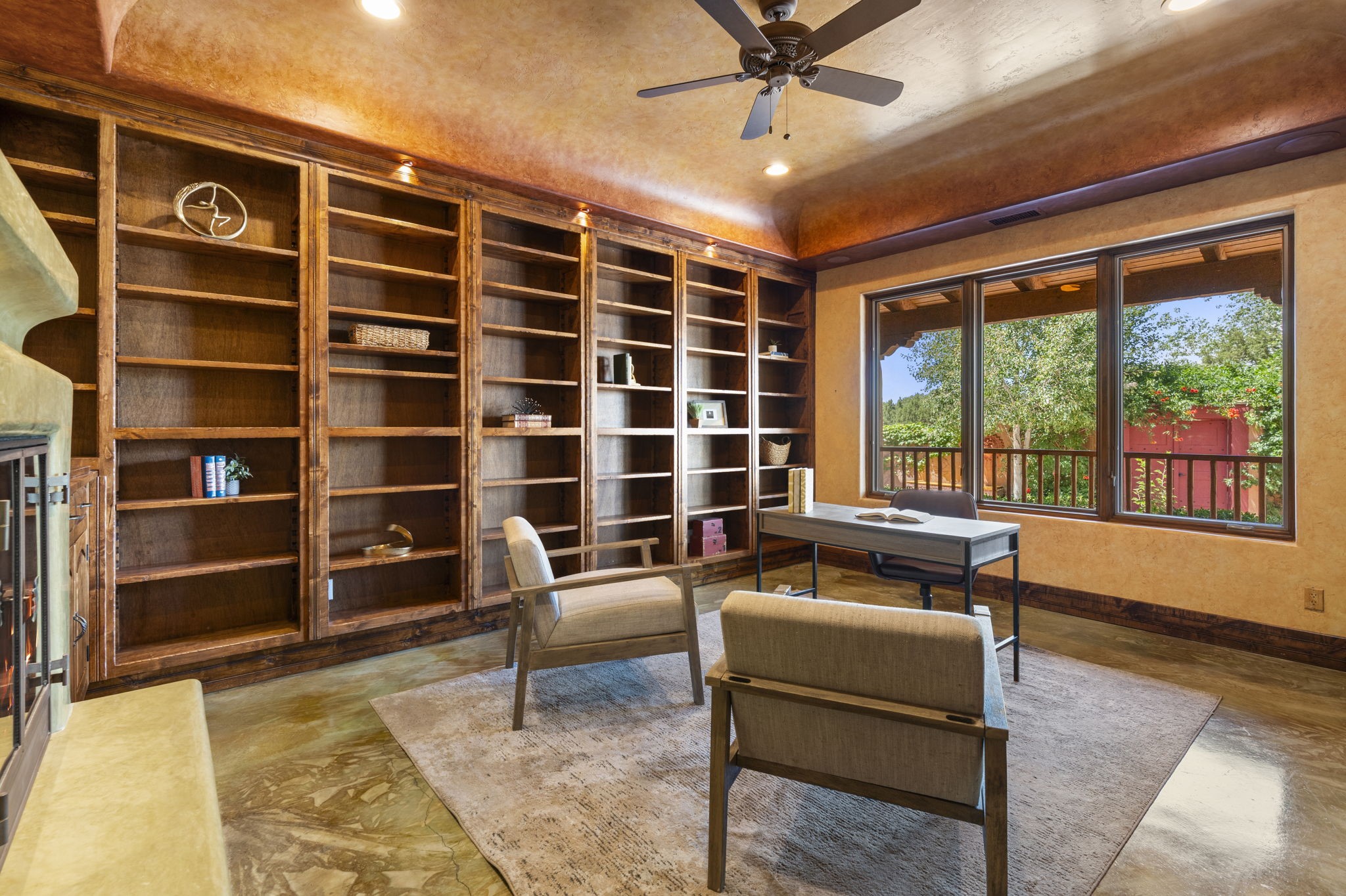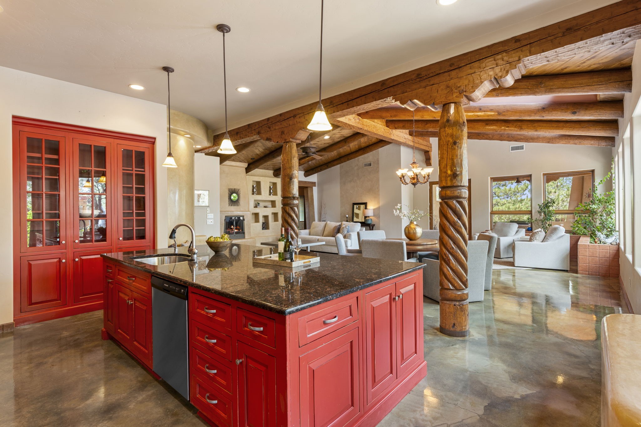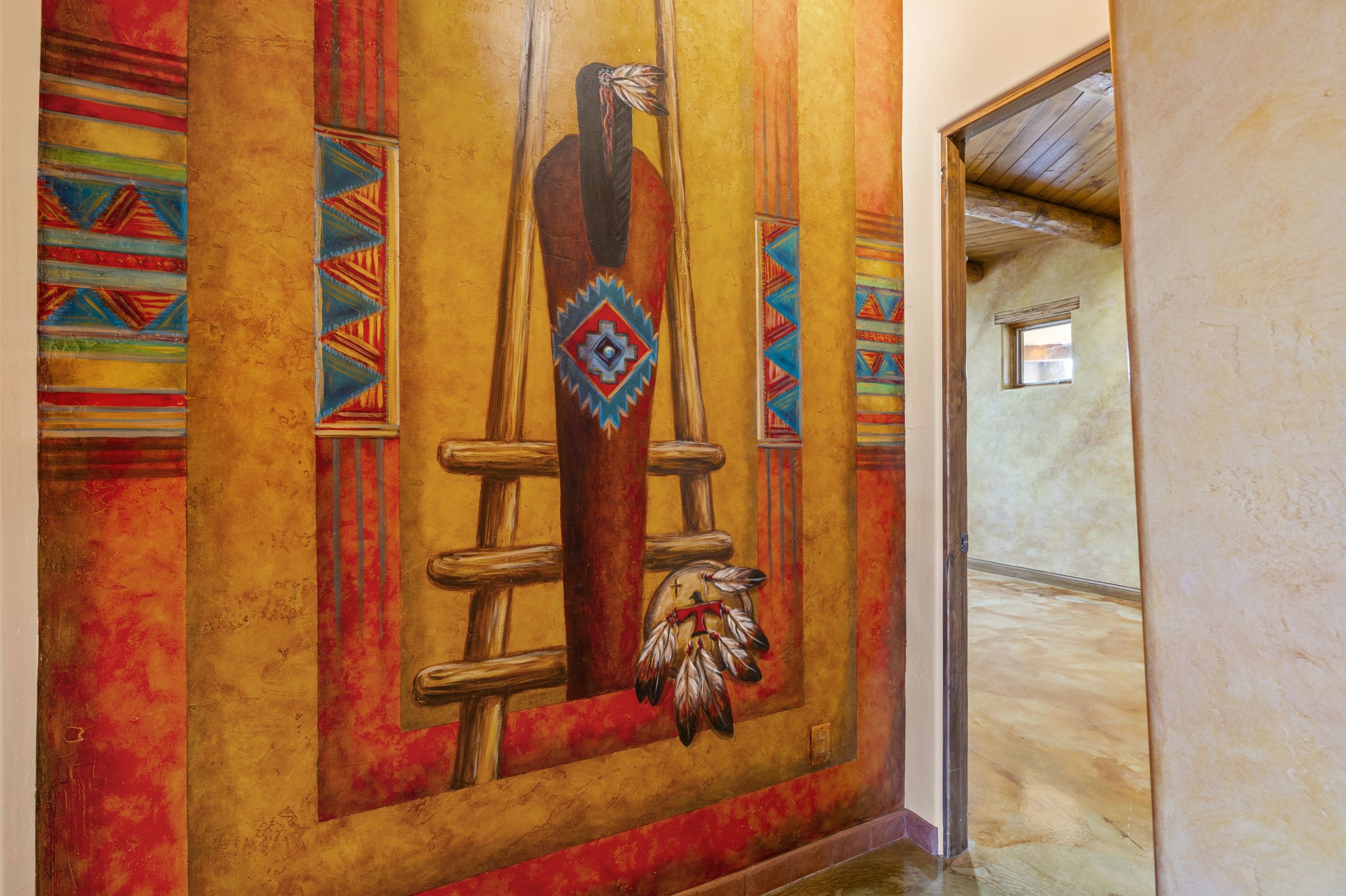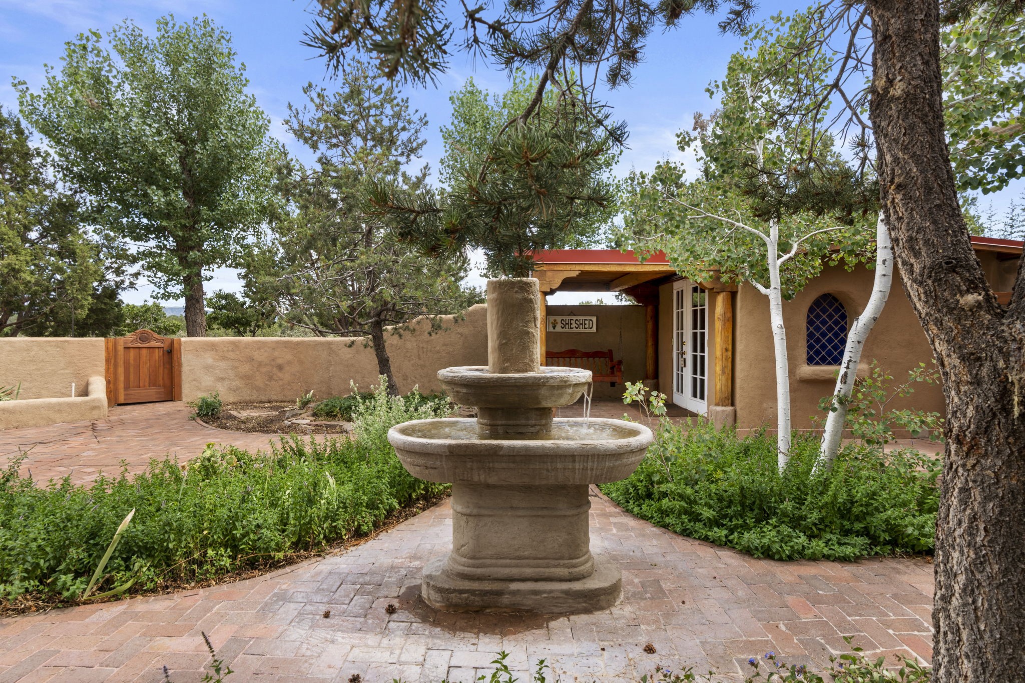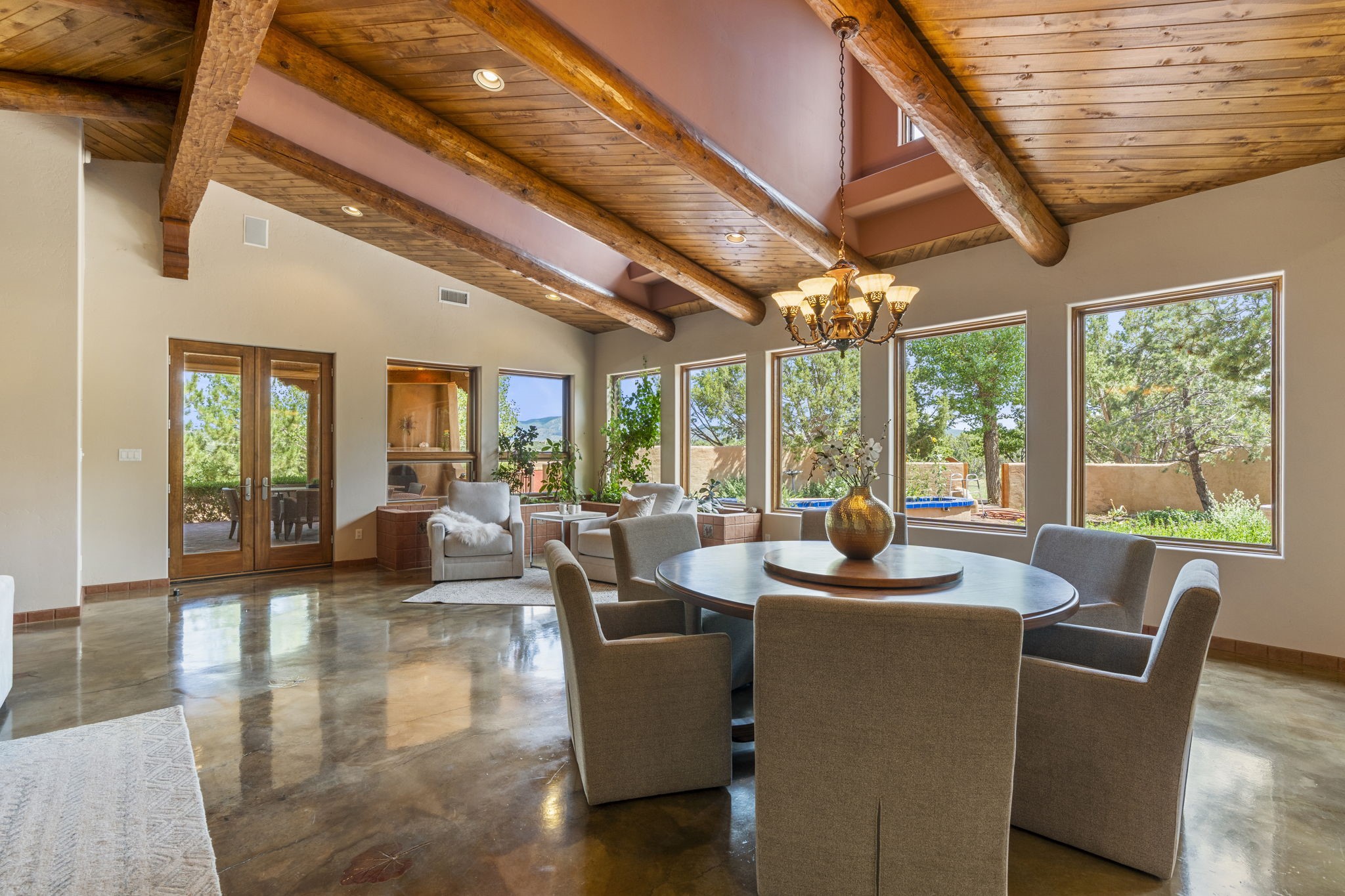 Artistic Mountain Home set on 10.14 private acres in San Pedro Creek, this distinctive 4 bedroom, 4 bath home is a true work of art- blending traditional Northern New Mexican design with creative, custom craftsmanship throughout. Built to inspire, the residence features expansive open-concept living with polished concrete floors, a dual-sided fireplace connecting the living and library areas, and large windows that frame panoramic views of ridges and endless skies. The kitchen is warm and welcoming, with artisanal cabinetry, handcrafted tile, and a layout that encourages gathering and creativity. The home features two separate bathrooms and walk-in closets within the primary bedroom making this space truly one of a kind! As you walk through, you'll be surrounded by beauty from thehand-painted murals, handmade tiles, and natural materials create a rich, organic feel throughout- tied with sleek modern touches in the tankless, wall-hung toilets and the zero entry showers. The office and a separate library offer quiet spaces for work or reading, while the light-filled attic studio is ideal for artists, writers, or anyone seeking a peaceful retreat above the trees. Outdoor living is just as intentional as the interior with all rooms having their own entrance to the exterior- leading to multiple patios and seating areas including an outdoor fireplace and a separate firepit, perfect for stargazing, storytelling, and cool desert evenings. A charming potting shed supports gardening and outdoor projects. The land offers room to roam, with space for gardens, or simply quiet observation of the surrounding wildlife and native flora. Schedule your private showing today!