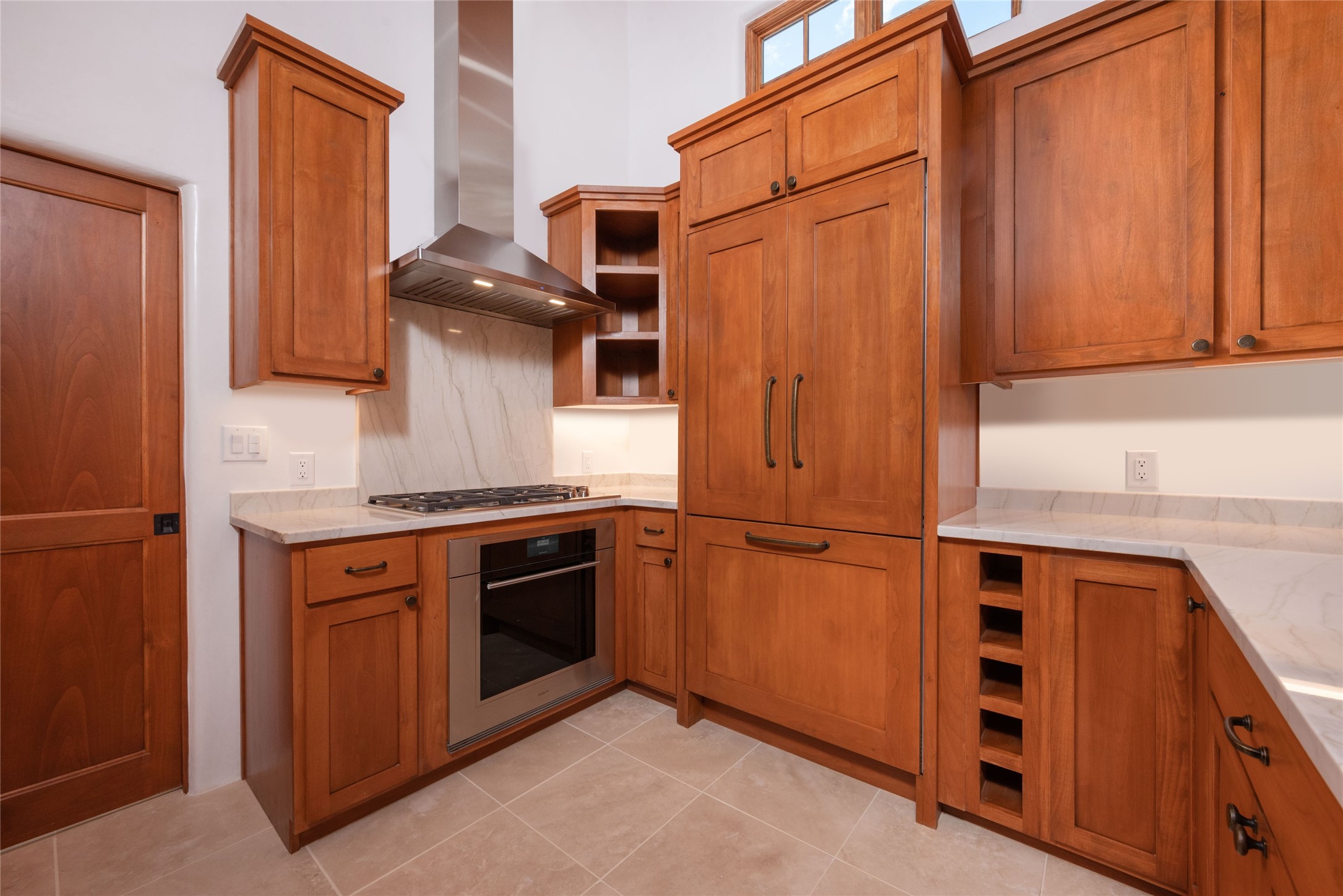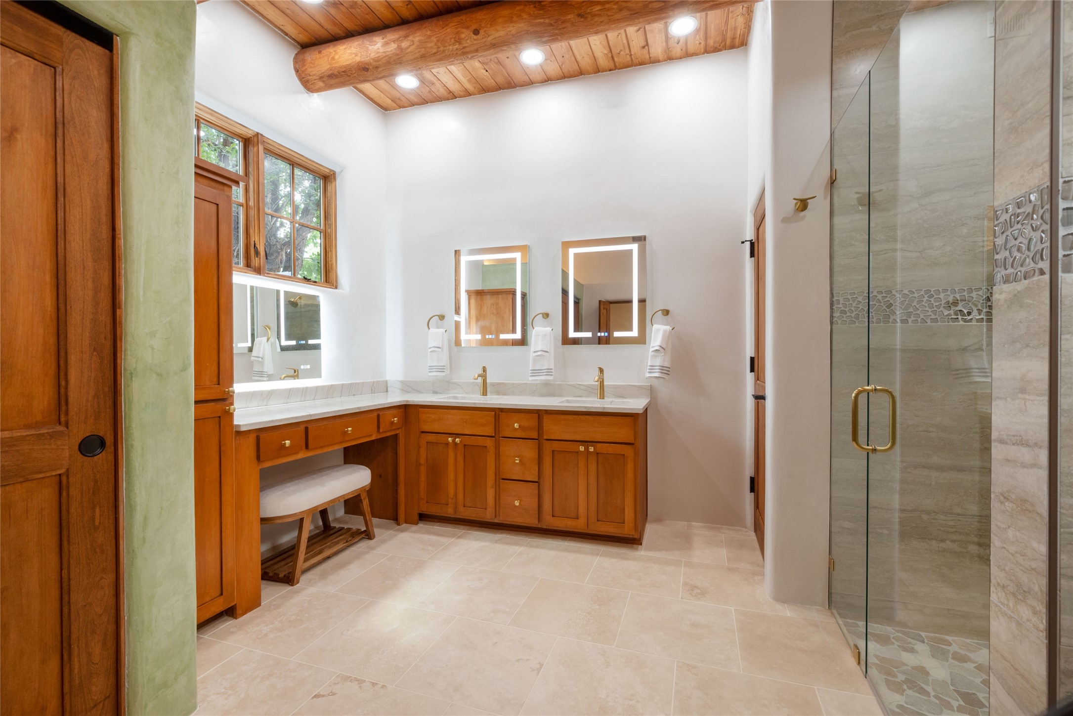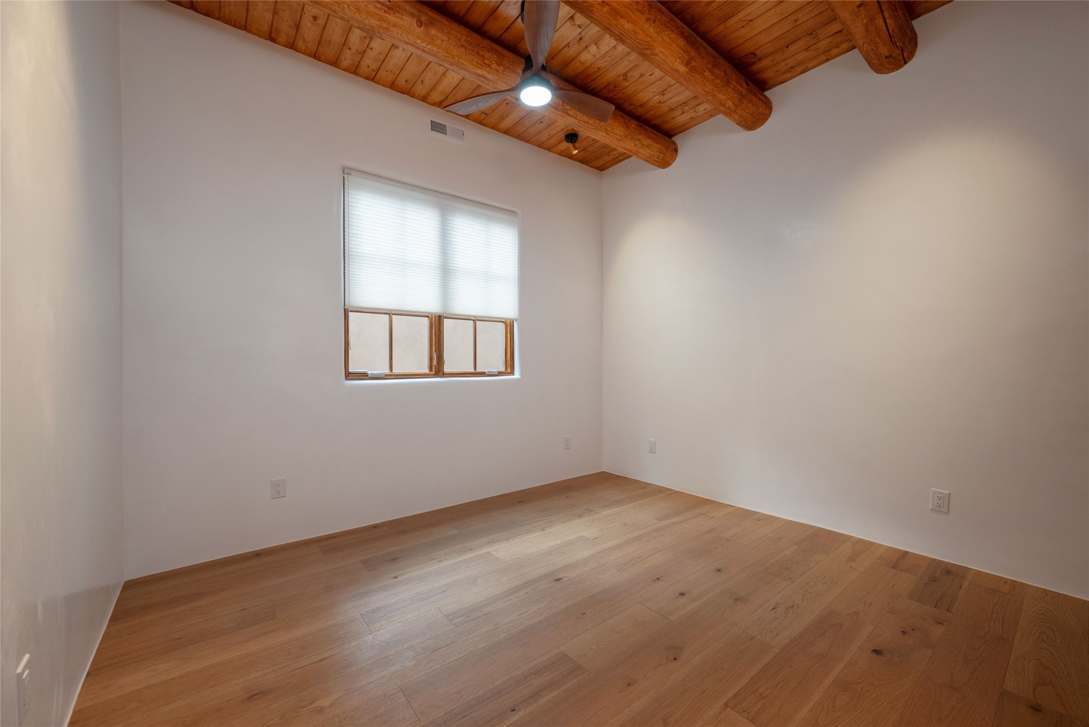 New construction throughout with a beautifully designed and hand-crafted adobe remodel and addition, this home blends classic Santa Fe style with modern comfort. A charming private courtyard greets you before the front door opens to a light-filled living room with high ceilings, exposed vigas, hand-troweled plaster walls, wood floors, and a custom-designed fireplace with quartz stone mantles. The gourmet kitchen features custom Alder cabinets, a built-in Wolf cooktop and oven, Fisher & Paykel refrigerator/freezer, Bosch dishwasher, quartz stone countertops, custom hardware and lighting, and travertine stone tile floors. The thoughtful three-bedroom, two-bath floor plan provides excellent separation between the luxurious primary suite and the additional bedrooms. One bedroom, located near the kitchen with its own entrance, offers flexibility for guests or use as a home office/den, with easy access to the courtyard. The primary suite exudes a spa-like feel, with warm plaster tones, natural wood finishes, custom Alder cabinetry and vanities, Italian porcelain tile surrounds, quartz countertops, a whirlpool bath, and a Kohler shower with body sprays. Additional bath features include mirrored, lighted anti-fog cabinets, a built-in makeup table with a lighted mirror, and elegant fixtures throughout. Other highlights include a custom-built entry gate, solid Alder doors, refrigerated air conditioning and heating, Pella windows, and Hunter Douglas blinds. Ideal as a full-time residence or a Santa Fe getaway, this home combines craftsmanship, comfort, and style in a prime location.
