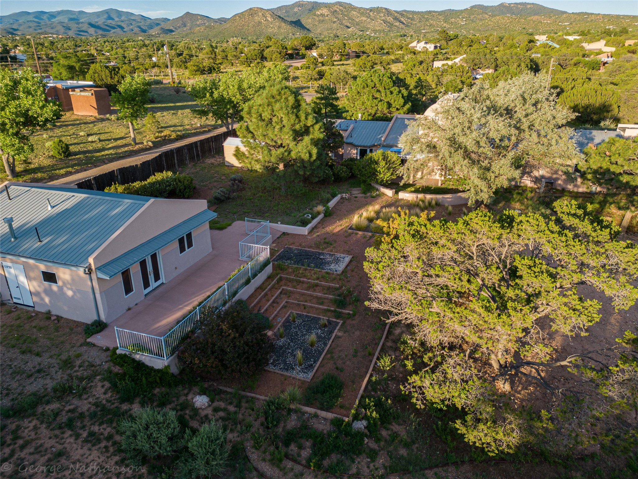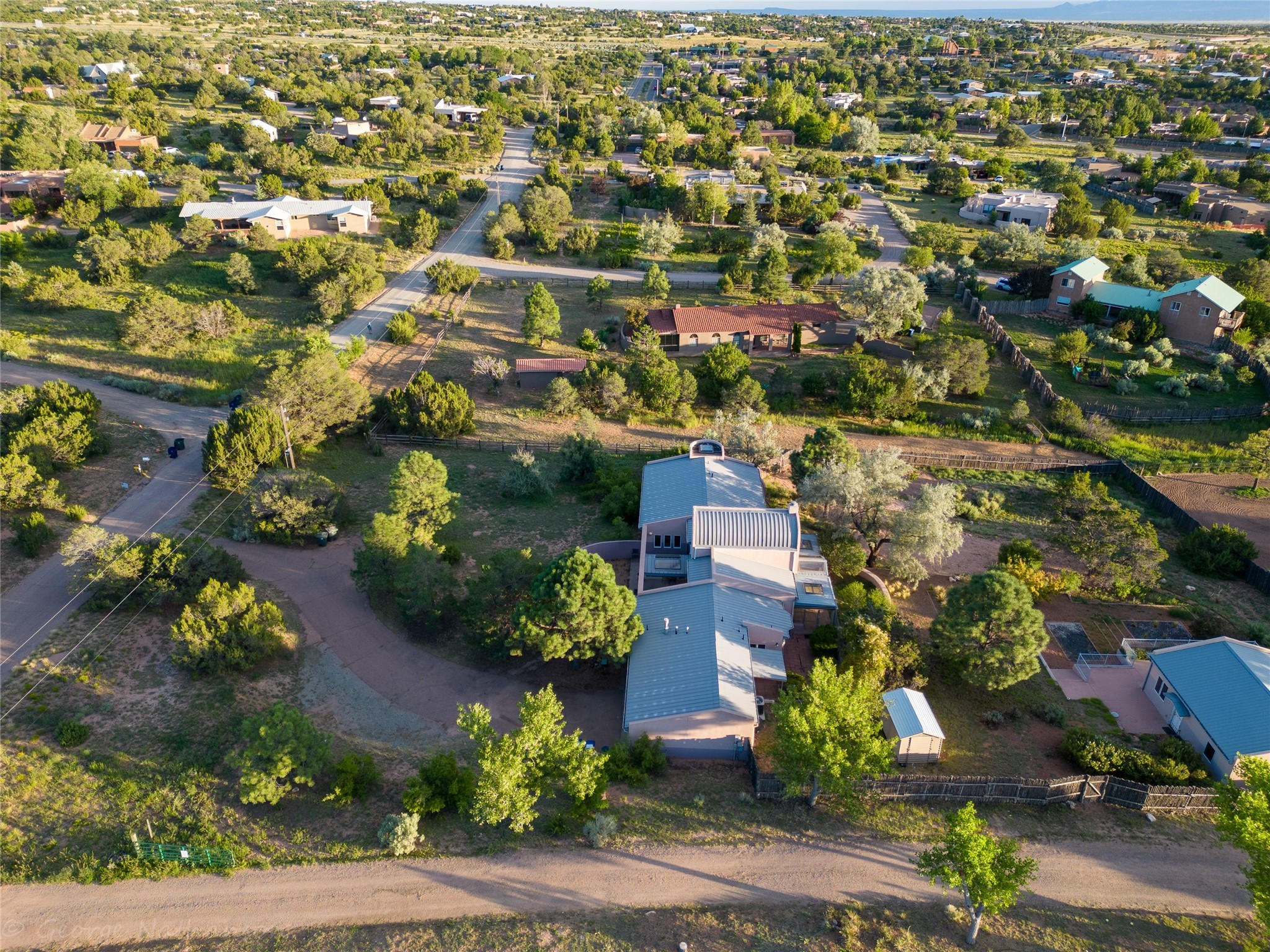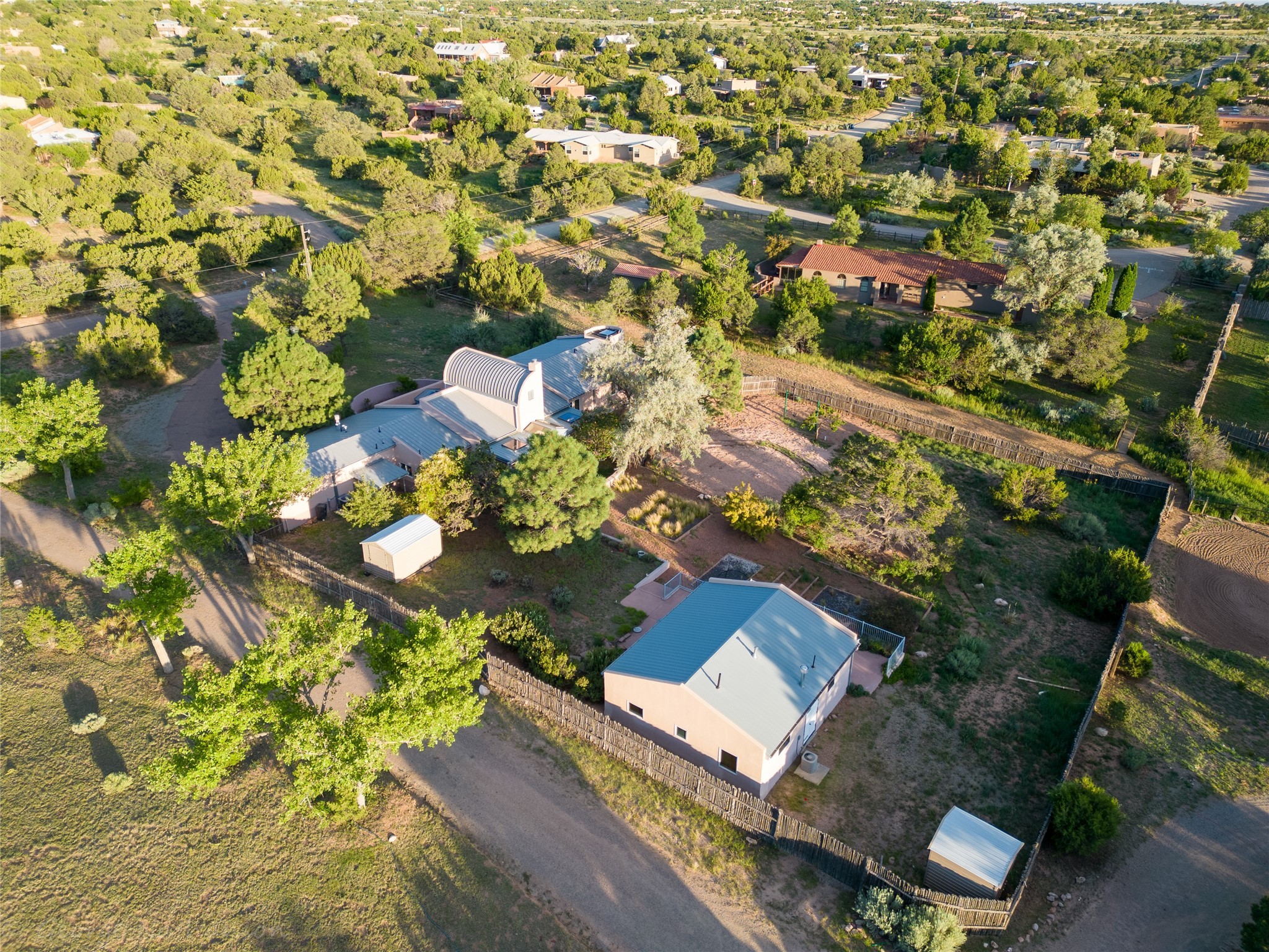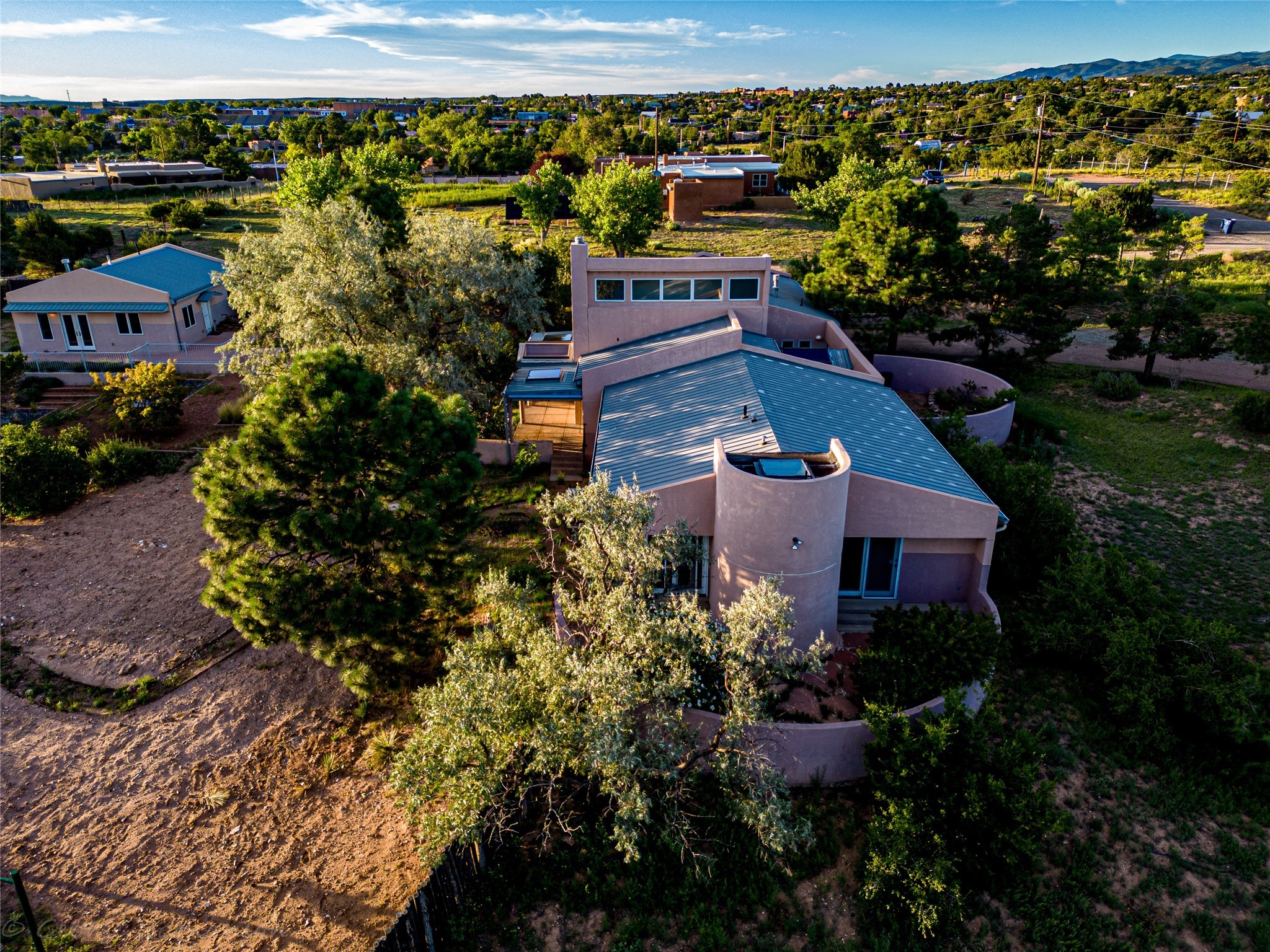 Income-producing property just 15 minutes from Downtown Santa Fe (3 mins. to St. Vincent's, close to shopping and the Rail Runner). Situated on a private 1-acre lot, this unique compound features a 3-bedroom main house designed with passive solar principles. The fully detached 2-bedroom guest house has its own entrance, kitchen, and bath-ideal for rentals, a guest suite, studio, or private office. Mature trees surround both homes, providing peace, privacy, and scenic beauty. The sustainability, and potential. Perfect for investors or multigenerational living