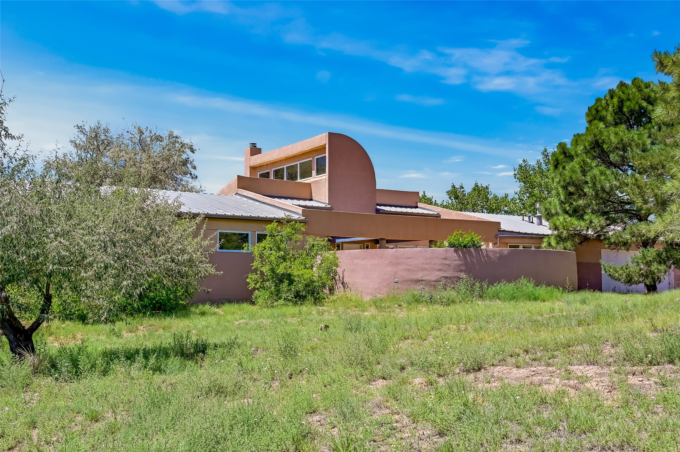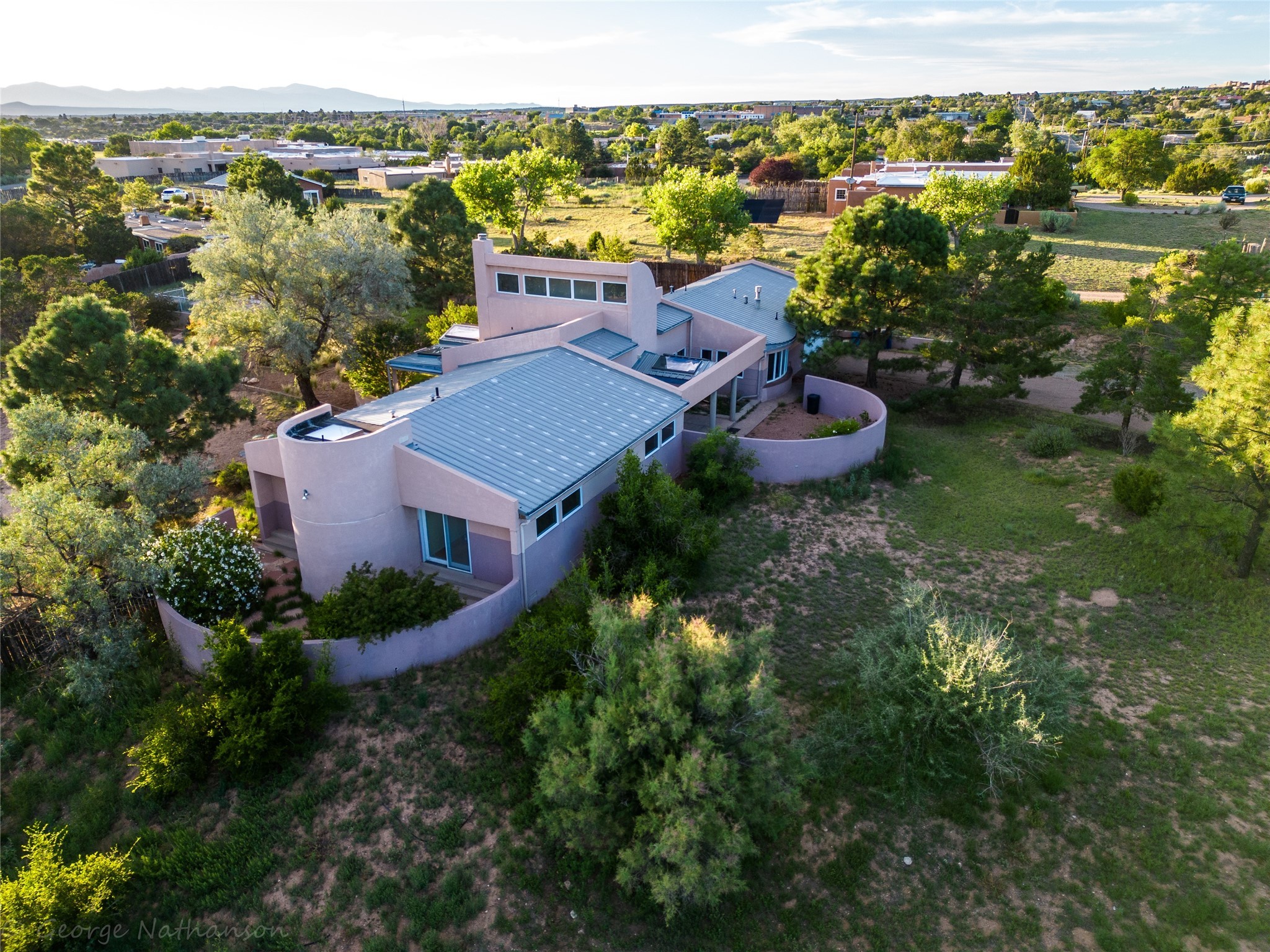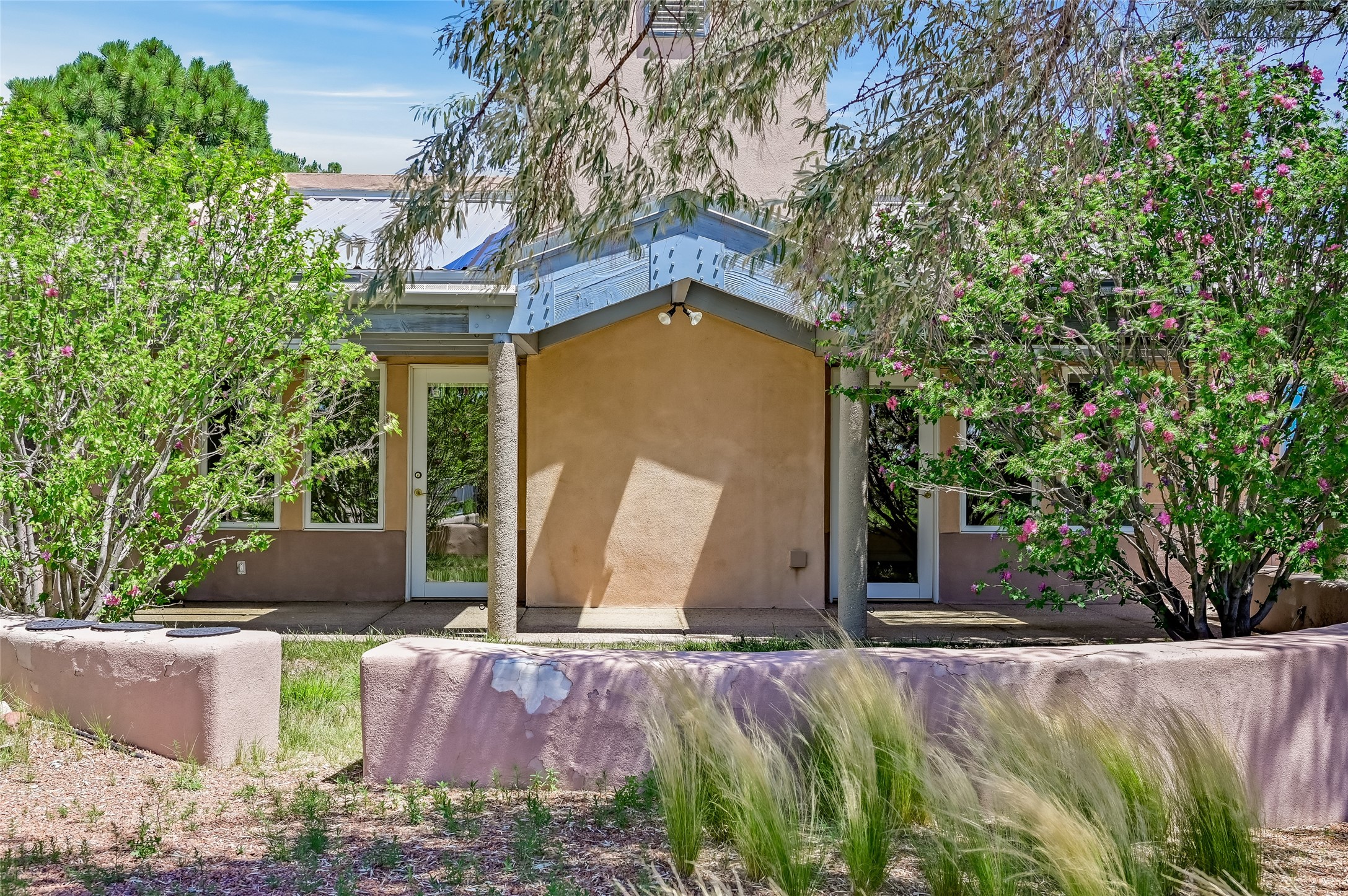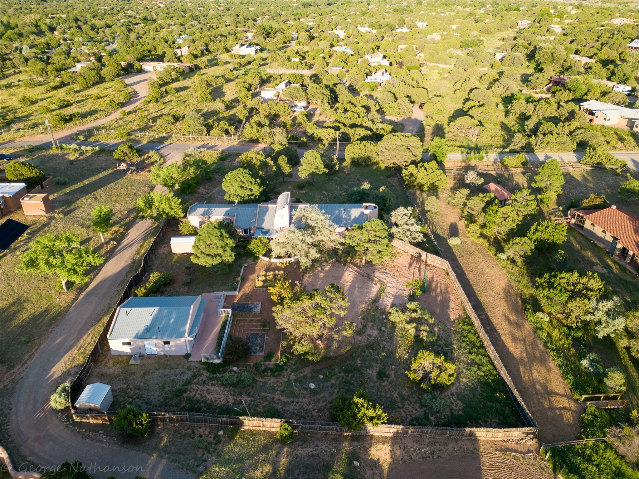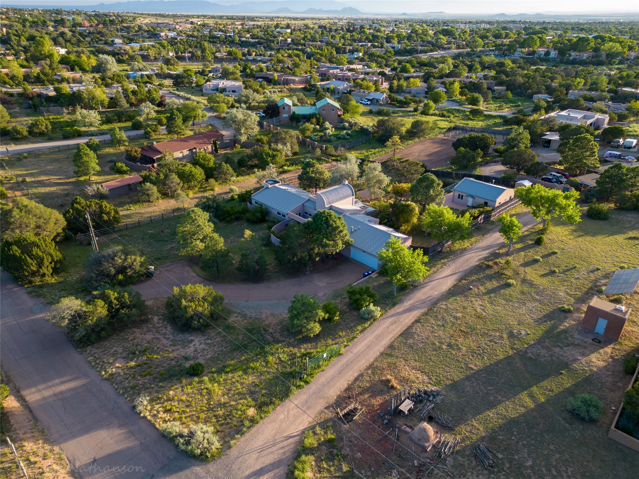 Income-producing property just 15 minutes from Downtown Santa Fe (3 mins. to St. Vincent's, close to shopping and the Rail Runner). Situated on a private 1-acre lot, this unique compound features a 3-bedroom main house designed with passive solar principles. The fully detached 2-bedroom guest house has its own entrance, kitchen, and bath-ideal for rentals, a guest suite, studio, or private office. Mature trees surround both homes, providing peace, privacy, and scenic beauty. The sustainability, and potential. Perfect for investors or multigenerational living