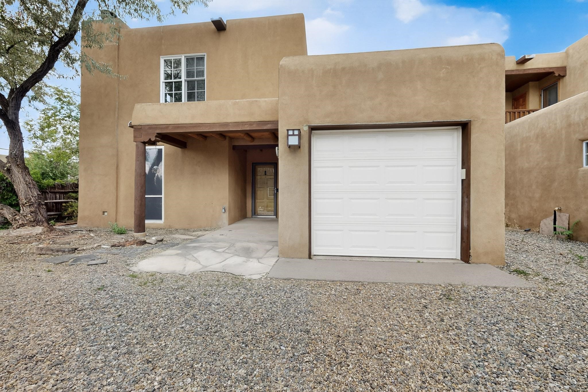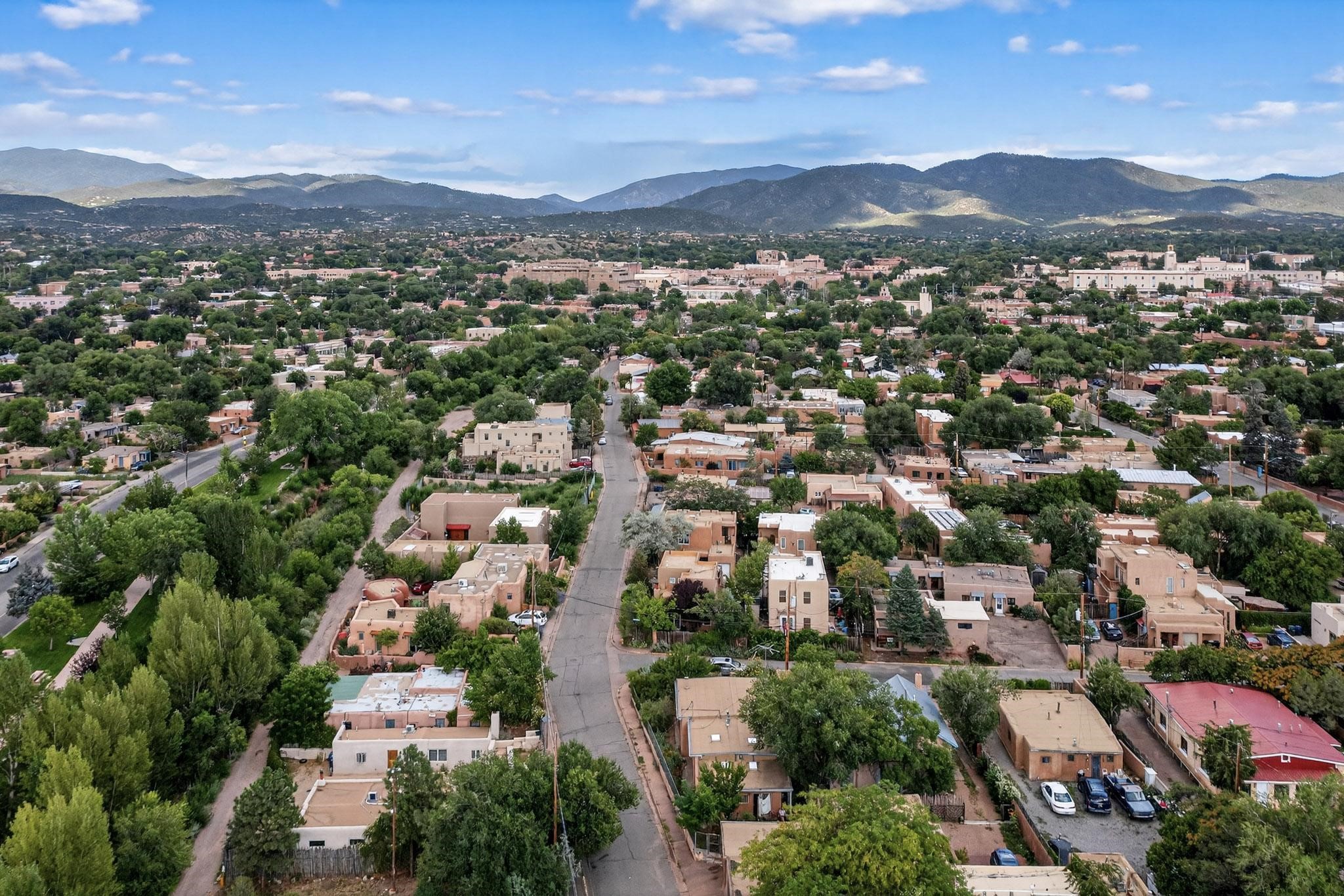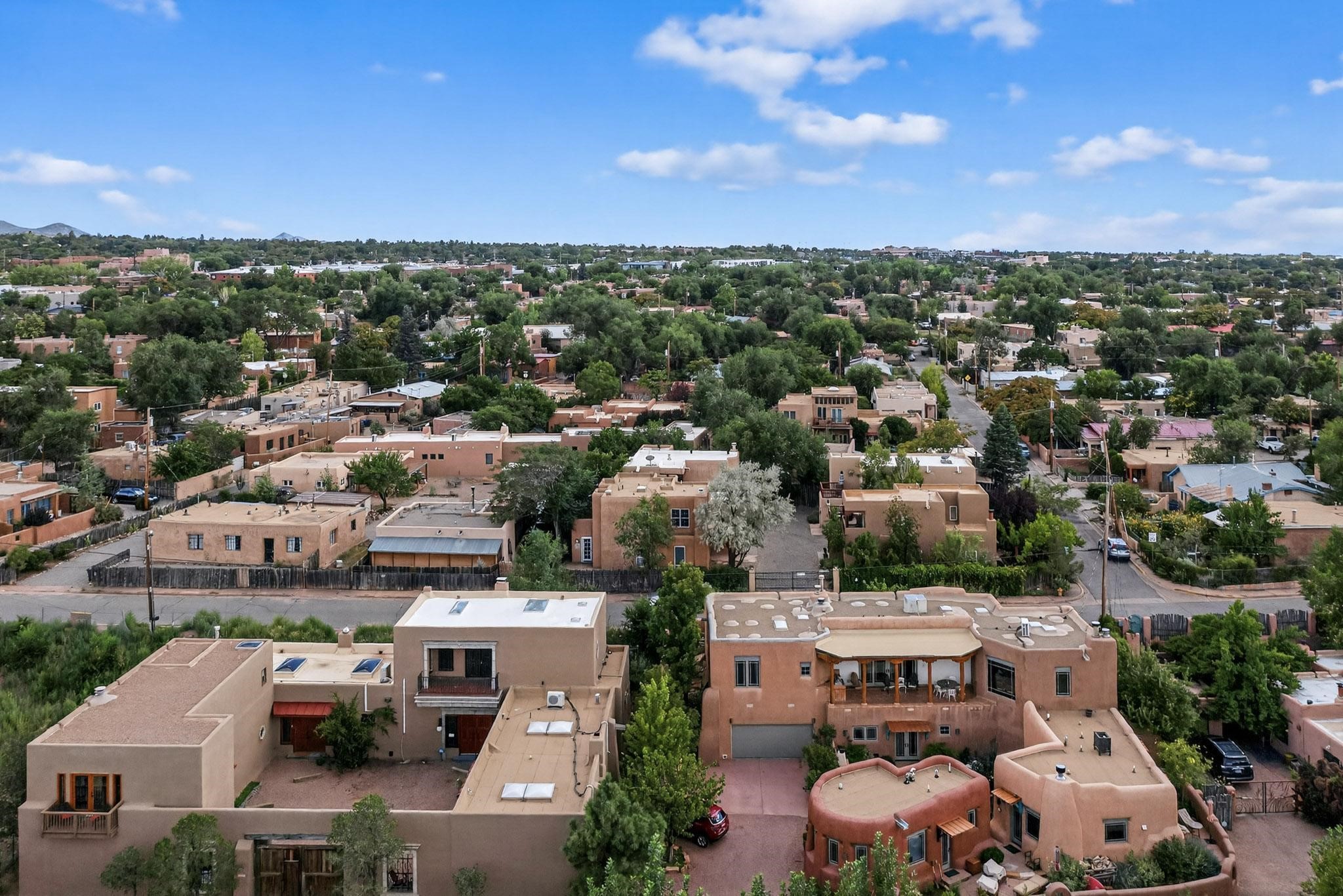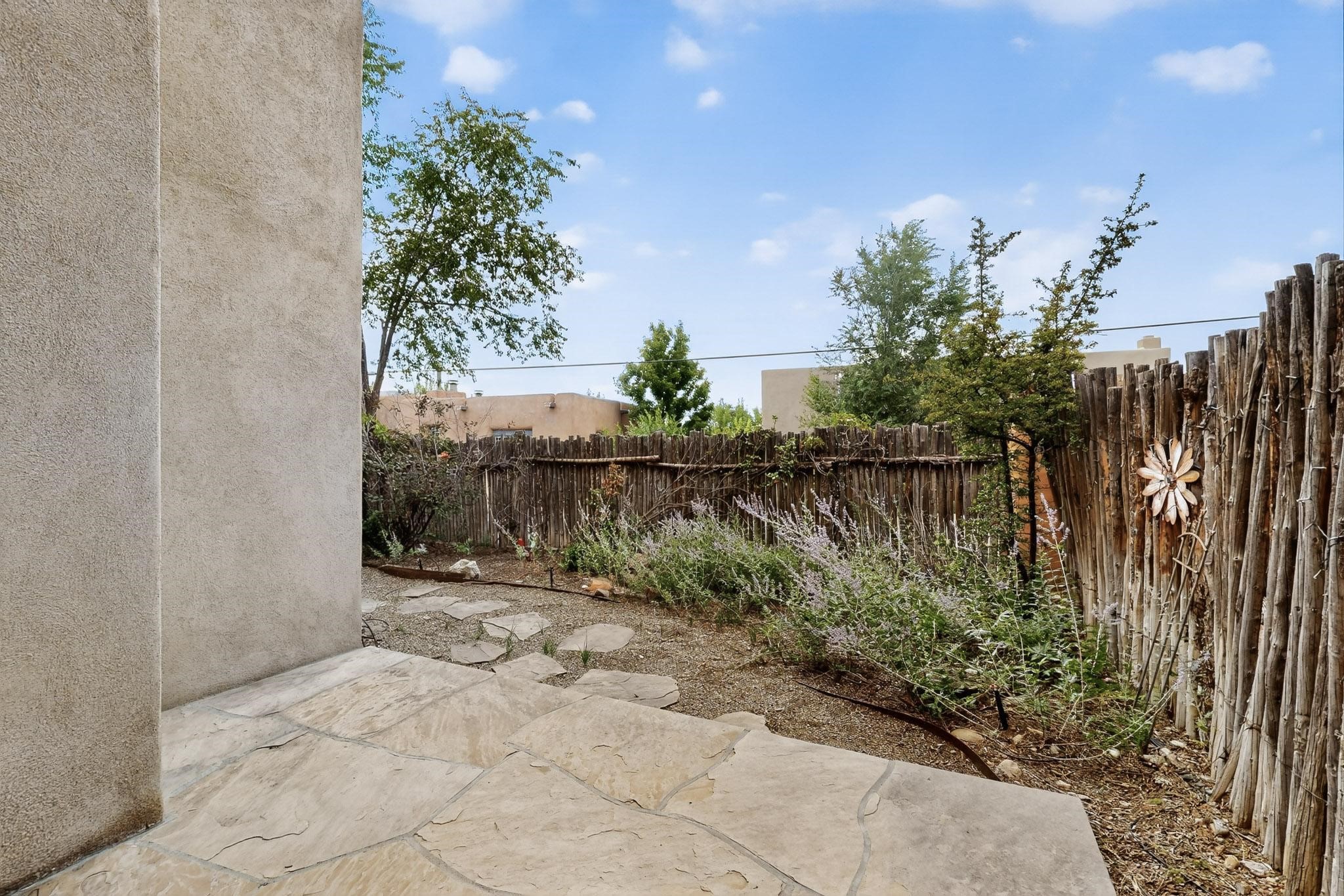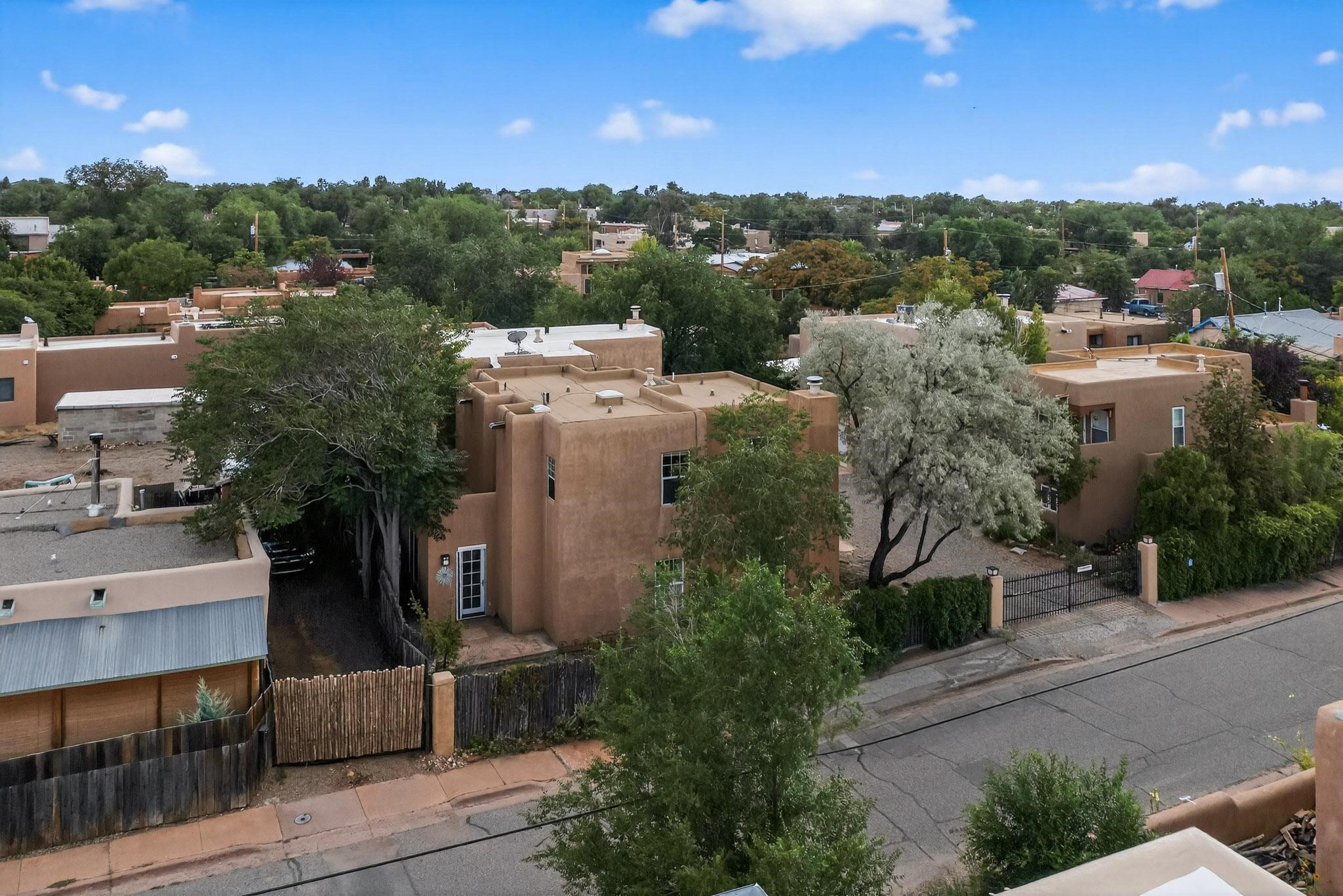 Welcome to your own private oasis minutes from the Plaza. A traditional SW style home where flagstone floors greet you when you walk in. Step down into the living room where high ceilings, tall windows, and a kiva fireplace create a cozy and relaxing space. There is a bathroom and bedroom on the bottom floor for easy and comfort. The updated kitchen flows to the dinning room, and outside to the multiple inviting patios with flowers and vines. Upstairs you'll find a suite with a walk through bathroom to the dressing area/office, and a balcony looking out to the mountains. Two more nicely appointed rooms are upstairs, and the laundry has been added to one of the bedrooms. Attached 1 car garage, newer carpet, kitchen and baths with granite countertops, fresh paint, and a newer roof. As you go out the small gated community, art filled streets and the Santa Fe River are right there where you can mosey along the path to the historic Downtown Santa Fe, or over to restaurants and stores. Now is your chance to have a lovely place so close to some of the things that make Santa Fe special. No HOA, and this is a free standing home in a gated community with 3 other 2 story homes.