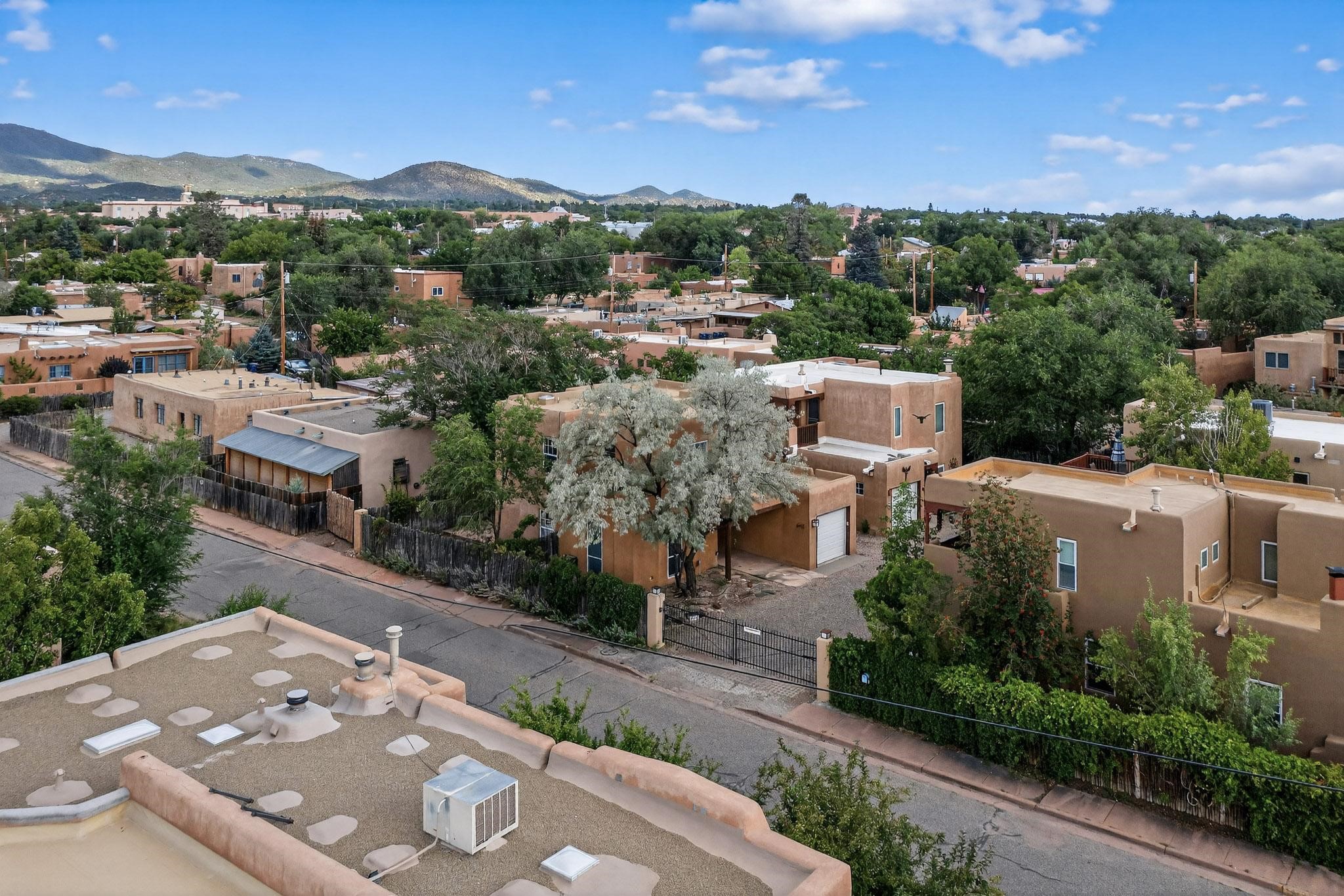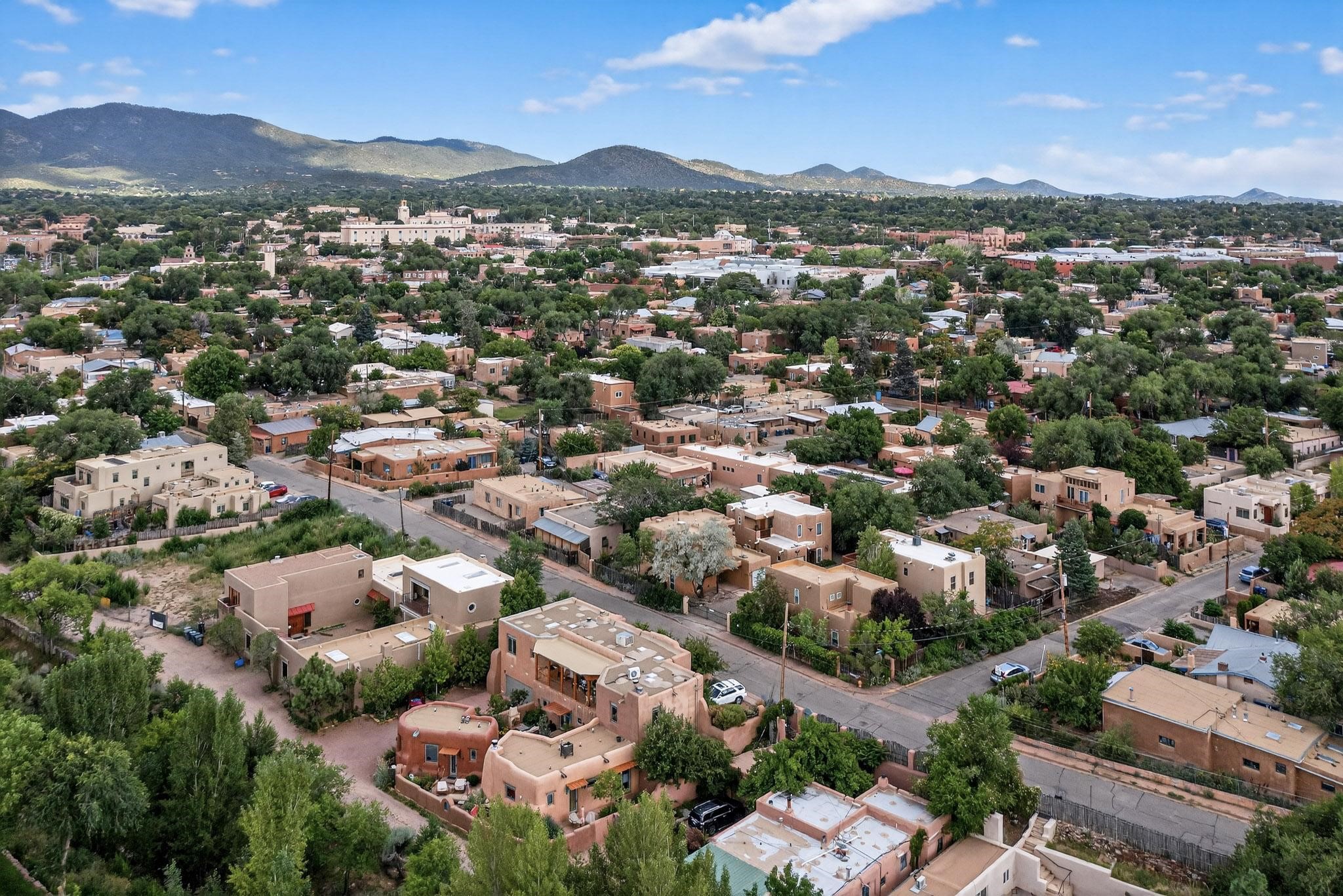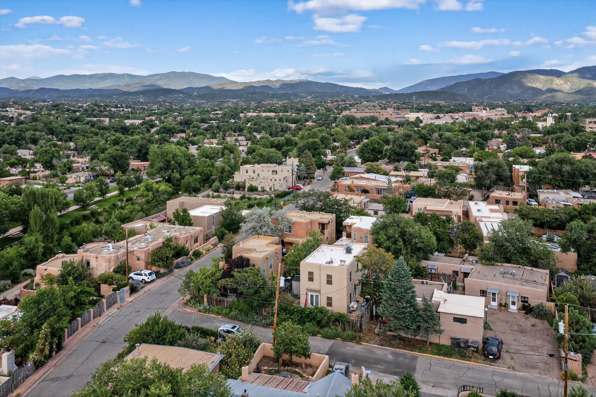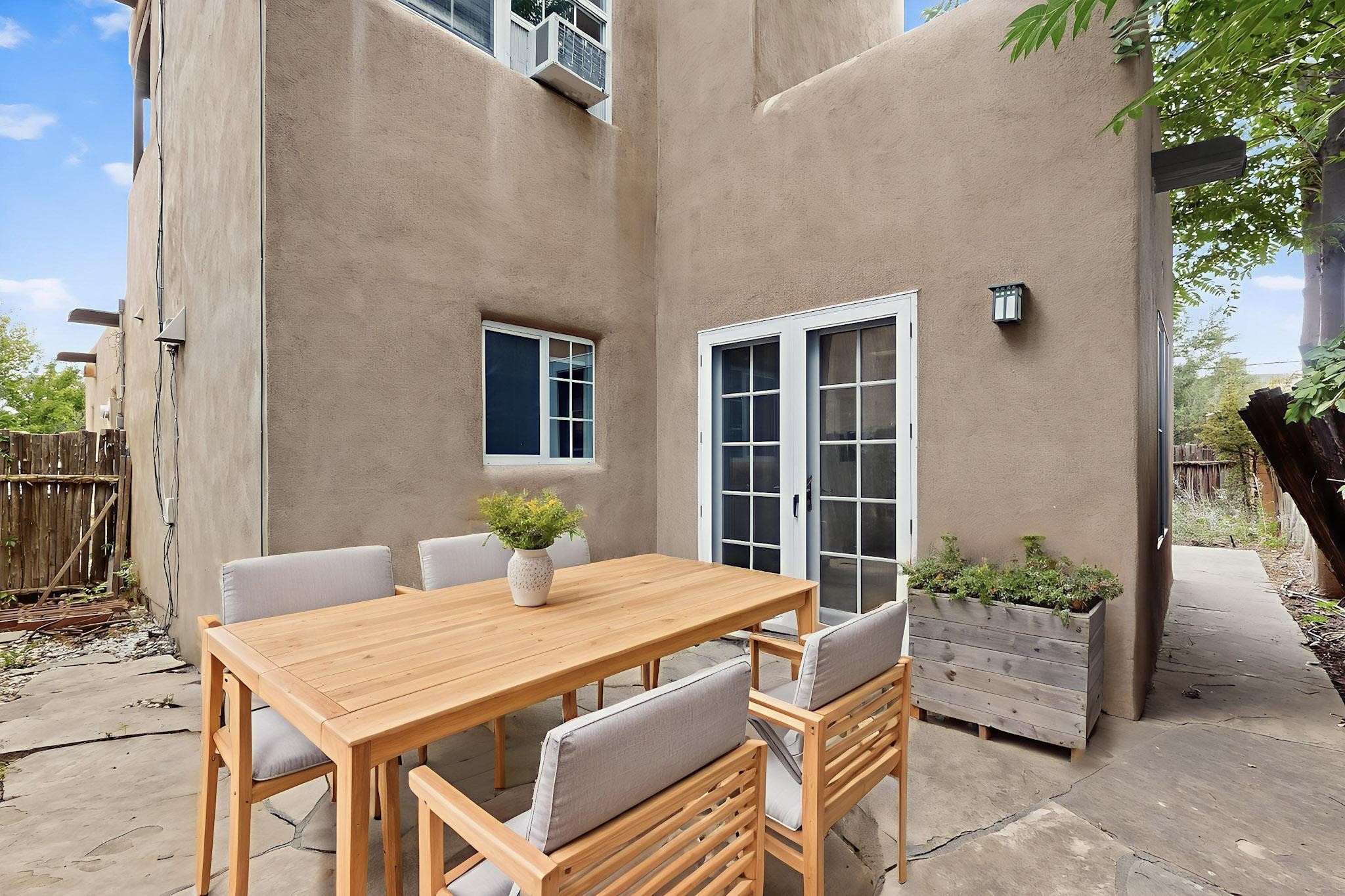 Welcome to your own private oasis minutes from the Plaza. A traditional SW style home where flagstone floors greet you when you walk in. Step down into the living room where high ceilings, tall windows, and a kiva fireplace create a cozy and relaxing space. There is a bathroom and bedroom on the bottom floor for easy and comfort. The updated kitchen flows to the dinning room, and outside to the multiple inviting patios with flowers and vines. Upstairs you'll find a suite with a walk through bathroom to the dressing area/office, and a balcony looking out to the mountains. Two more nicely appointed rooms are upstairs, and the laundry has been added to one of the bedrooms. Attached 1 car garage, newer carpet, kitchen and baths with granite countertops, fresh paint, and a newer roof. As you go out the small gated community, art filled streets and the Santa Fe River are right there where you can mosey along the path to the historic Downtown Santa Fe, or over to restaurants and stores. Now is your chance to have a lovely place so close to some of the things that make Santa Fe special. No HOA, and this is a free standing home in a gated community with 3 other 2 story homes.