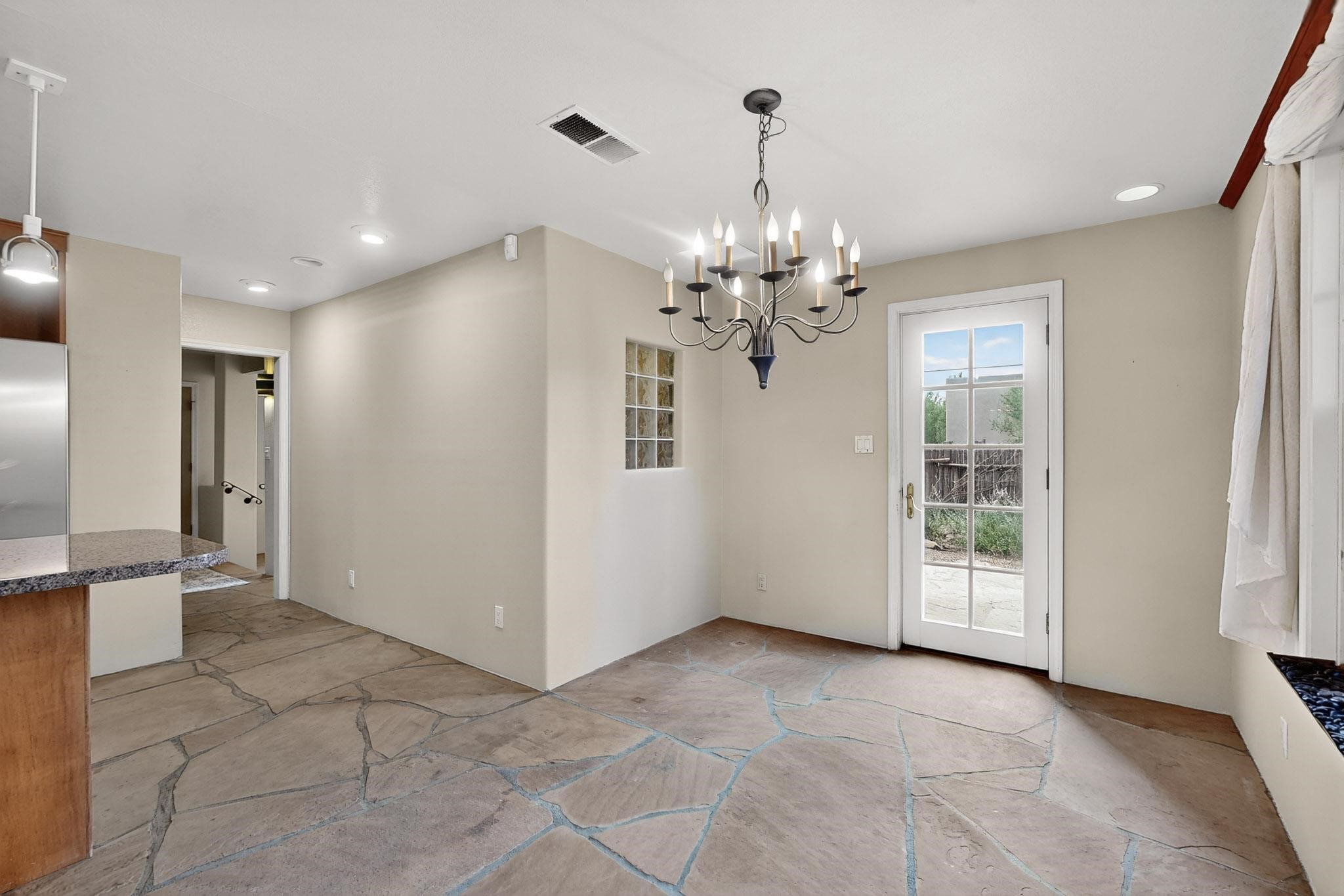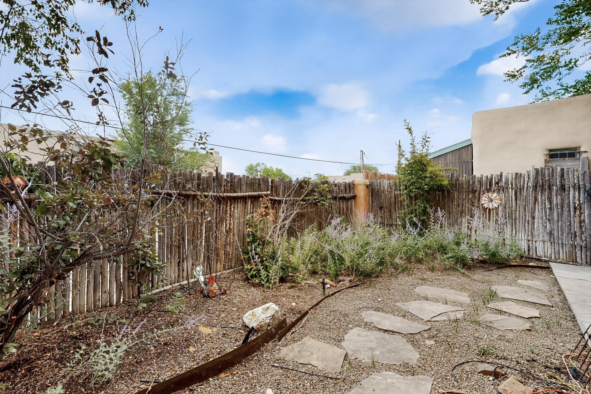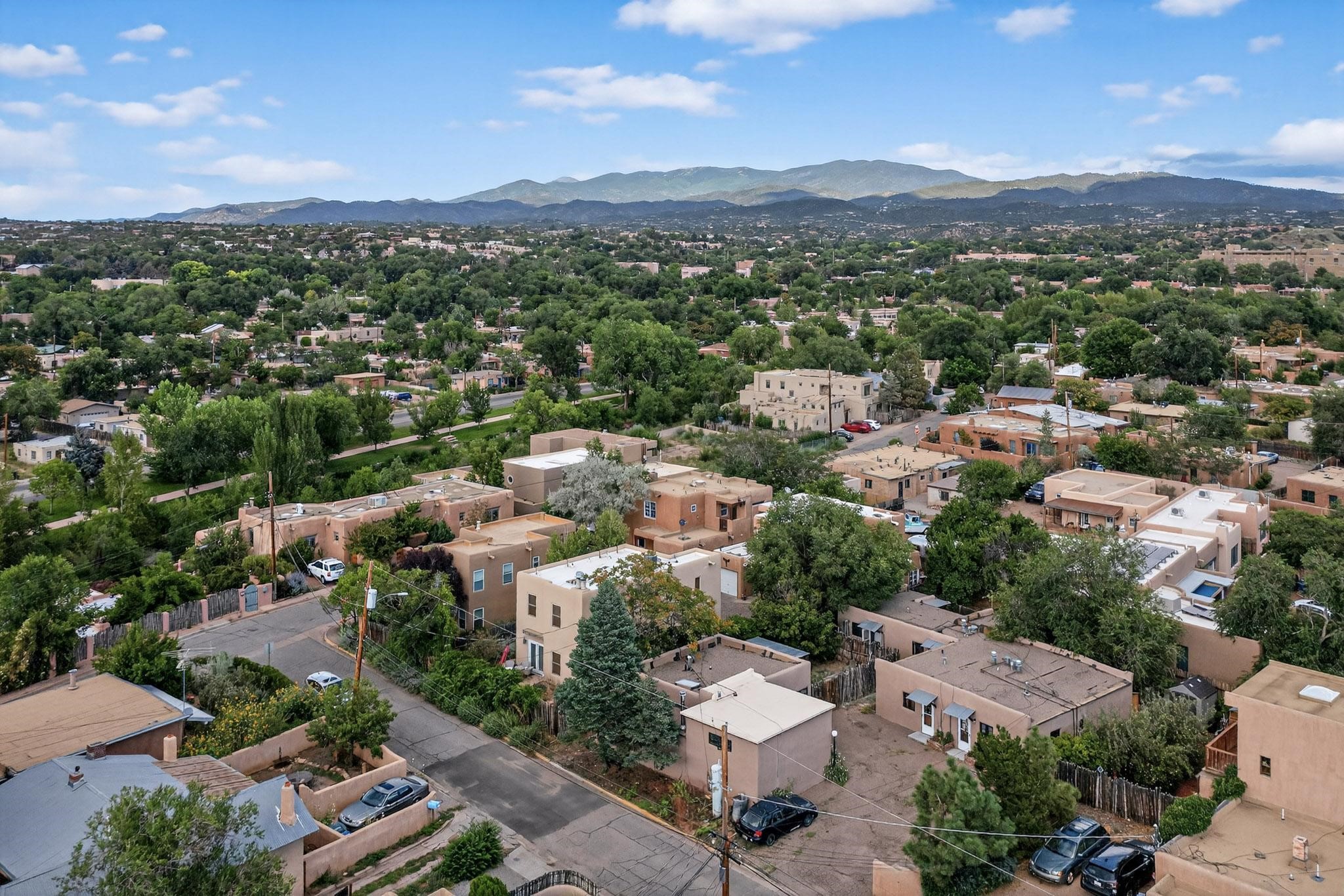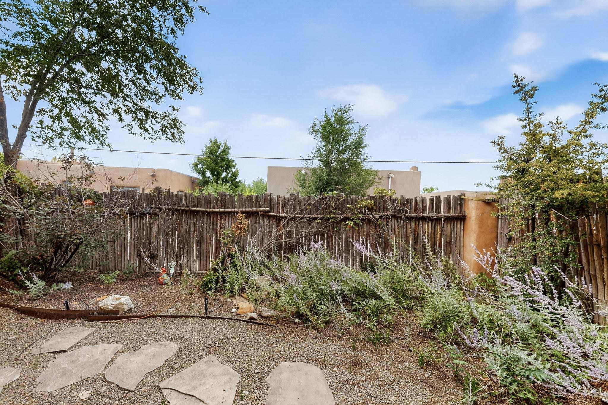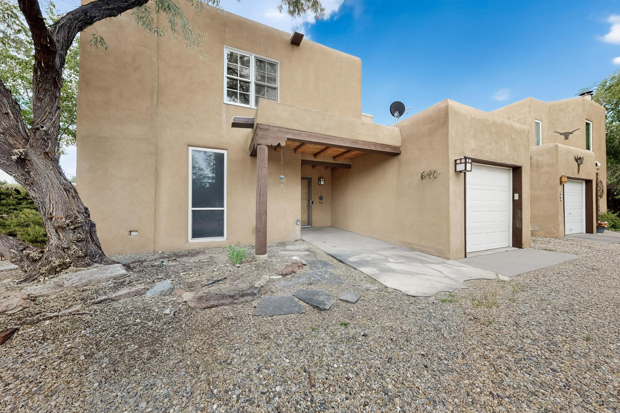 Welcome to your own private oasis minutes from the Plaza. A traditional SW style home where flagstone floors greet you when you walk in. Step down into the living room where high ceilings, tall windows, and a kiva fireplace create a cozy and relaxing space. There is a bathroom and bedroom on the bottom floor for easy and comfort. The updated kitchen flows to the dinning room, and outside to the multiple inviting patios with flowers and vines. Upstairs you'll find a suite with a walk through bathroom to the dressing area/office, and a balcony looking out to the mountains. Two more nicely appointed rooms are upstairs, and the laundry has been added to one of the bedrooms. Attached 1 car garage, newer carpet, kitchen and baths with granite countertops, fresh paint, and a newer roof. As you go out the small gated community, art filled streets and the Santa Fe River are right there where you can mosey along the path to the historic Downtown Santa Fe, or over to restaurants and stores. Now is your chance to have a lovely place so close to some of the things that make Santa Fe special. No HOA, and this is a free standing home in a gated community with 3 other 2 story homes.