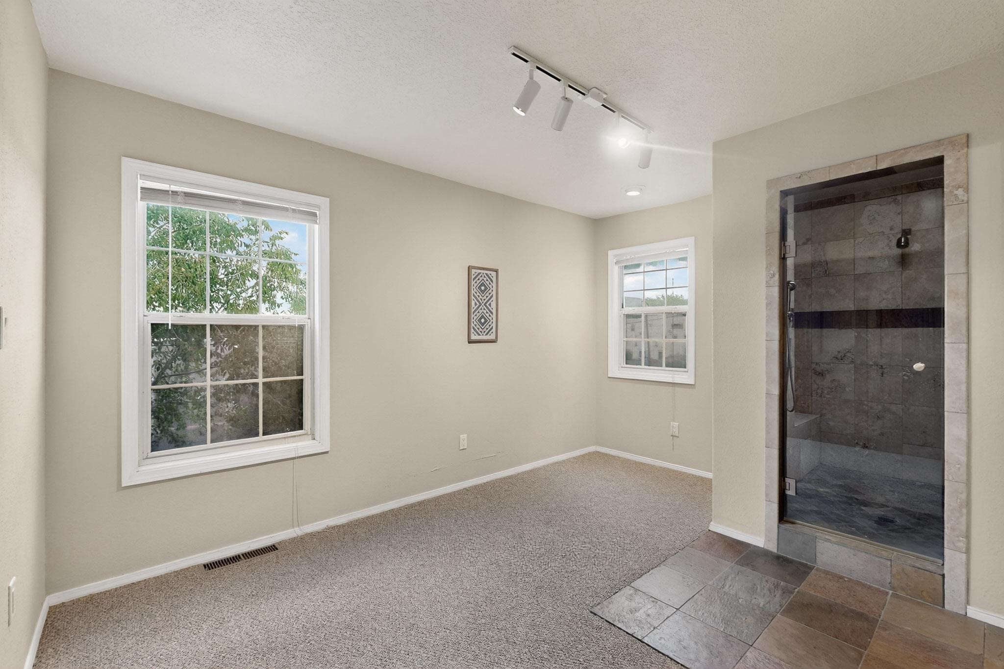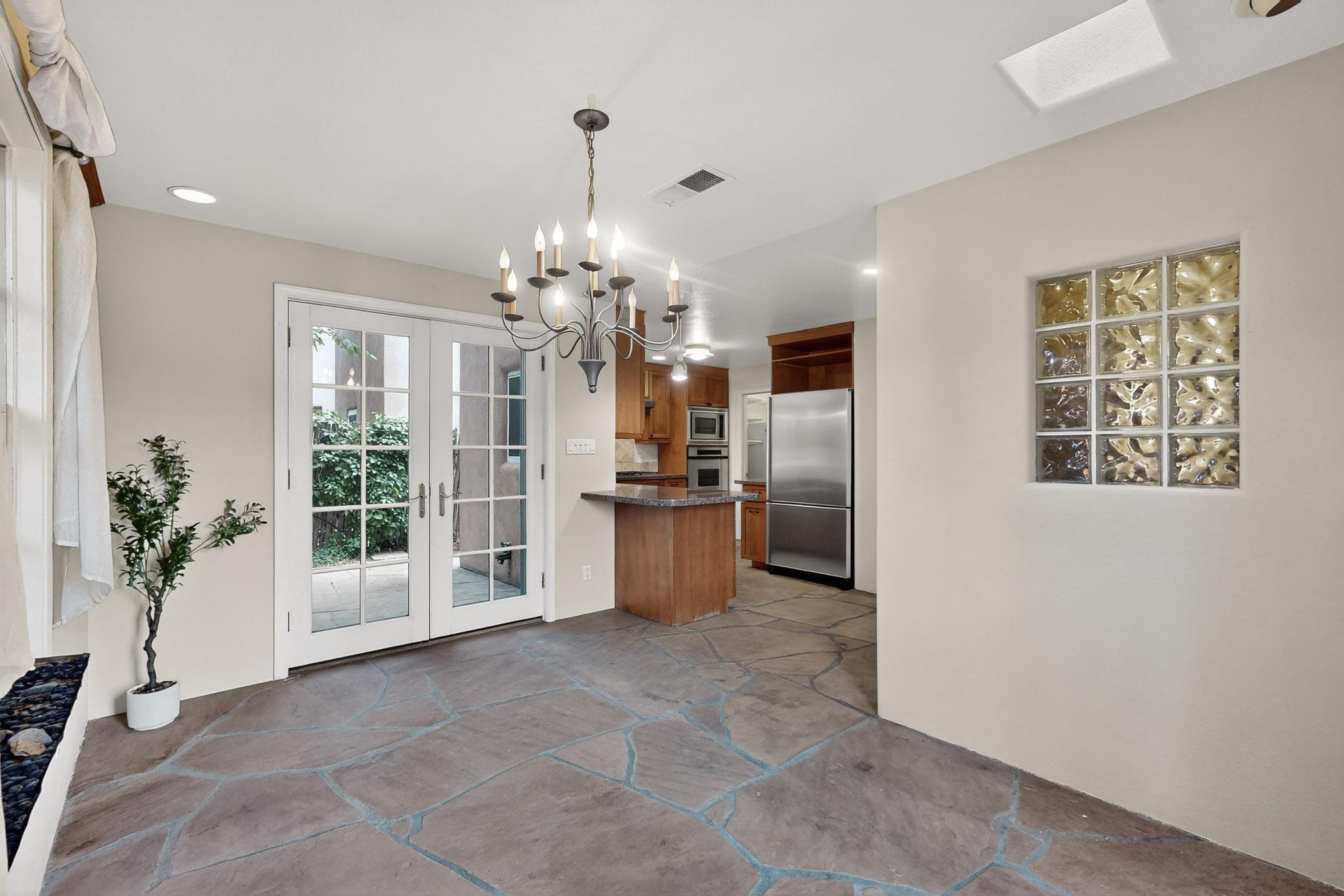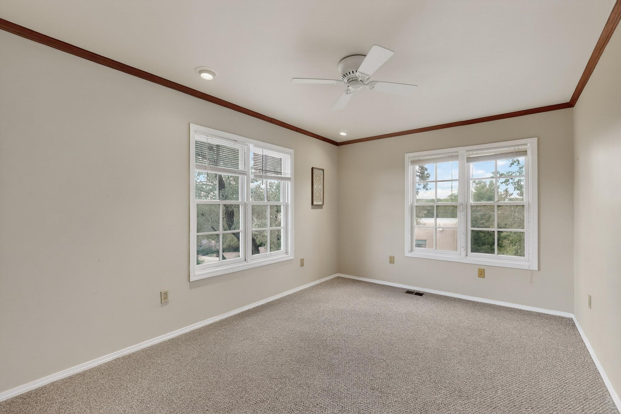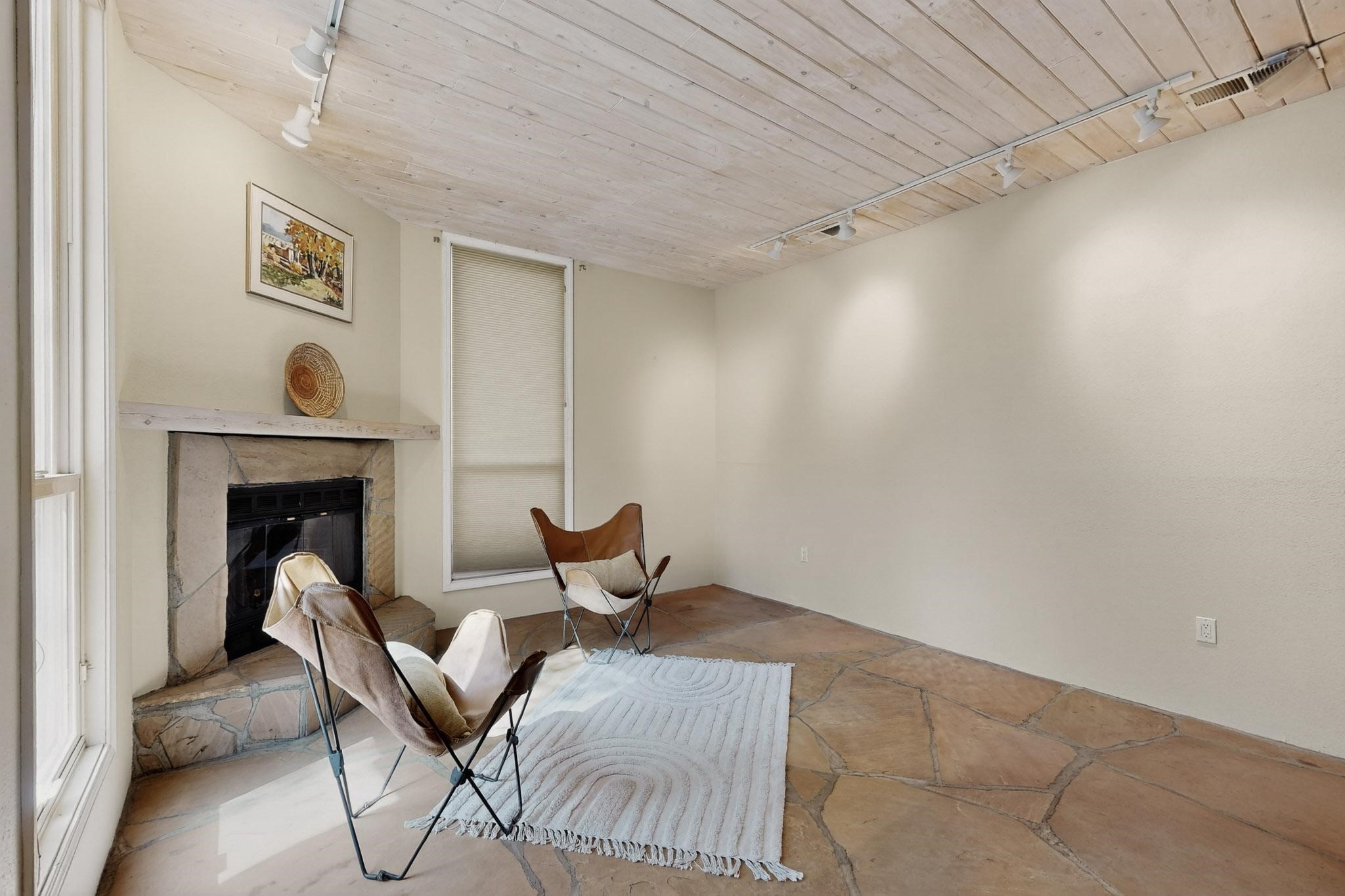 Welcome to your own private oasis minutes from the Plaza. A traditional SW style home where flagstone floors greet you when you walk in. Step down into the living room where high ceilings, tall windows, and a kiva fireplace create a cozy and relaxing space. There is a bathroom and bedroom on the bottom floor for easy and comfort. The updated kitchen flows to the dinning room, and outside to the multiple inviting patios with flowers and vines. Upstairs you'll find a suite with a walk through bathroom to the dressing area/office, and a balcony looking out to the mountains. Two more nicely appointed rooms are upstairs, and the laundry has been added to one of the bedrooms. Attached 1 car garage, newer carpet, kitchen and baths with granite countertops, fresh paint, and a newer roof. As you go out the small gated community, art filled streets and the Santa Fe River are right there where you can mosey along the path to the historic Downtown Santa Fe, or over to restaurants and stores. Now is your chance to have a lovely place so close to some of the things that make Santa Fe special. No HOA, and this is a free standing home in a gated community with 3 other 2 story homes.