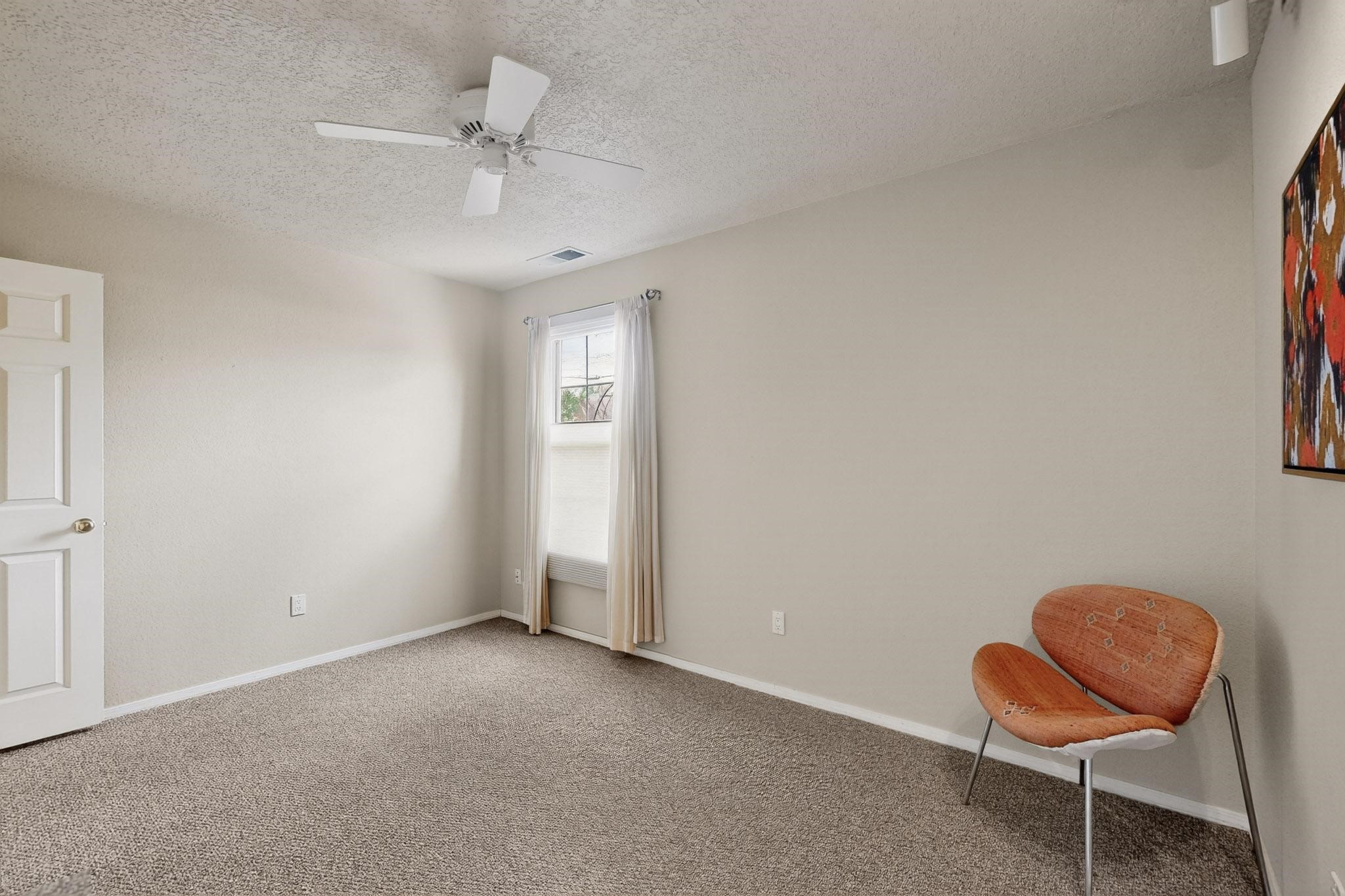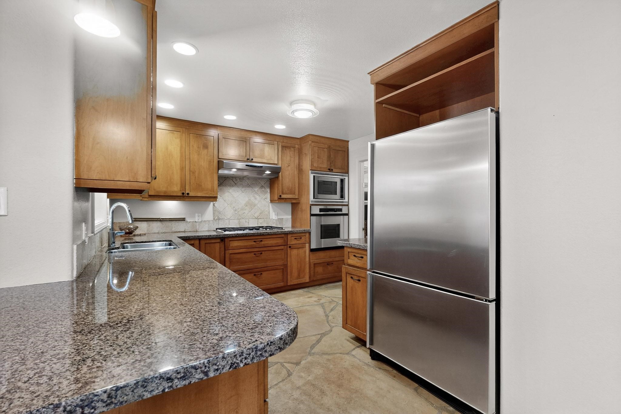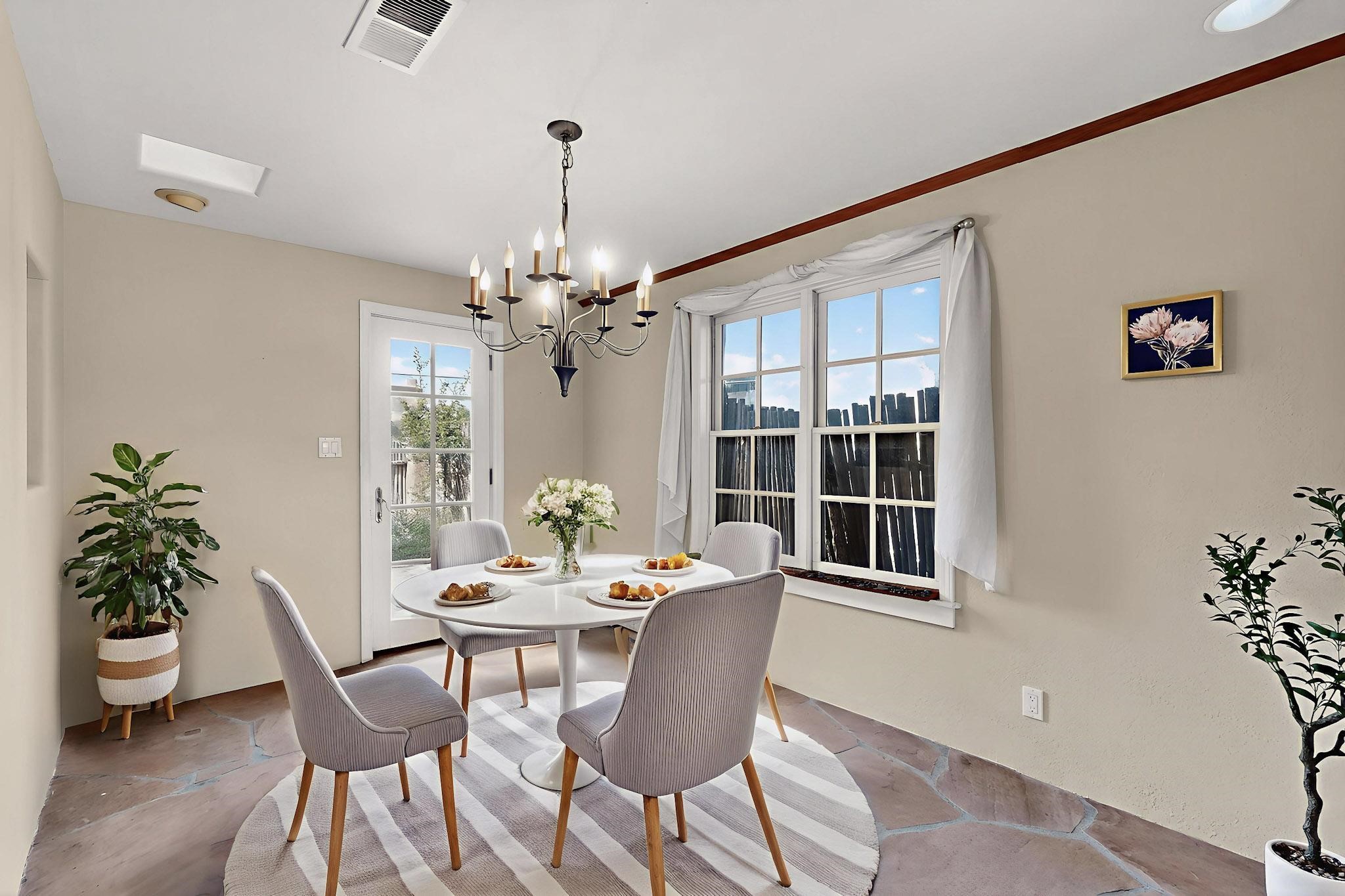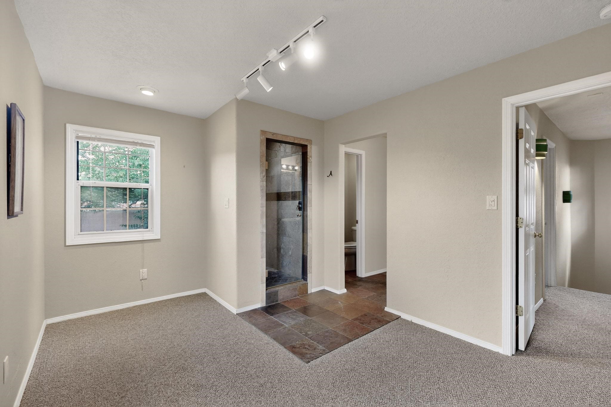 Welcome to your own private oasis minutes from the Plaza. A traditional SW style home where flagstone floors greet you when you walk in. Step down into the living room where high ceilings, tall windows, and a kiva fireplace create a cozy and relaxing space. There is a bathroom and bedroom on the bottom floor for easy and comfort. The updated kitchen flows to the dinning room, and outside to the multiple inviting patios with flowers and vines. Upstairs you'll find a suite with a walk through bathroom to the dressing area/office, and a balcony looking out to the mountains. Two more nicely appointed rooms are upstairs, and the laundry has been added to one of the bedrooms. Attached 1 car garage, newer carpet, kitchen and baths with granite countertops, fresh paint, and a newer roof. As you go out the small gated community, art filled streets and the Santa Fe River are right there where you can mosey along the path to the historic Downtown Santa Fe, or over to restaurants and stores. Now is your chance to have a lovely place so close to some of the things that make Santa Fe special. No HOA, and this is a free standing home in a gated community with 3 other 2 story homes.