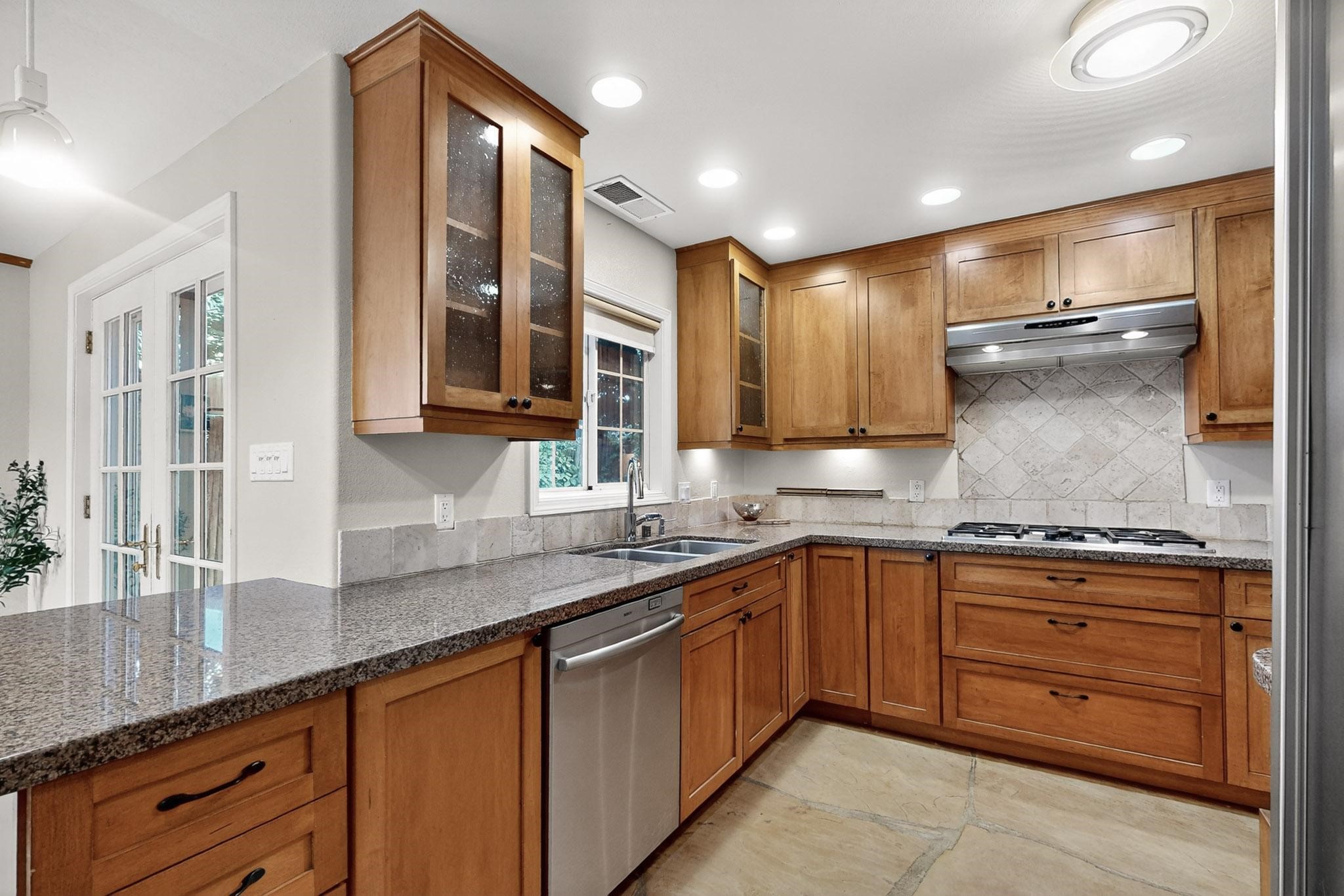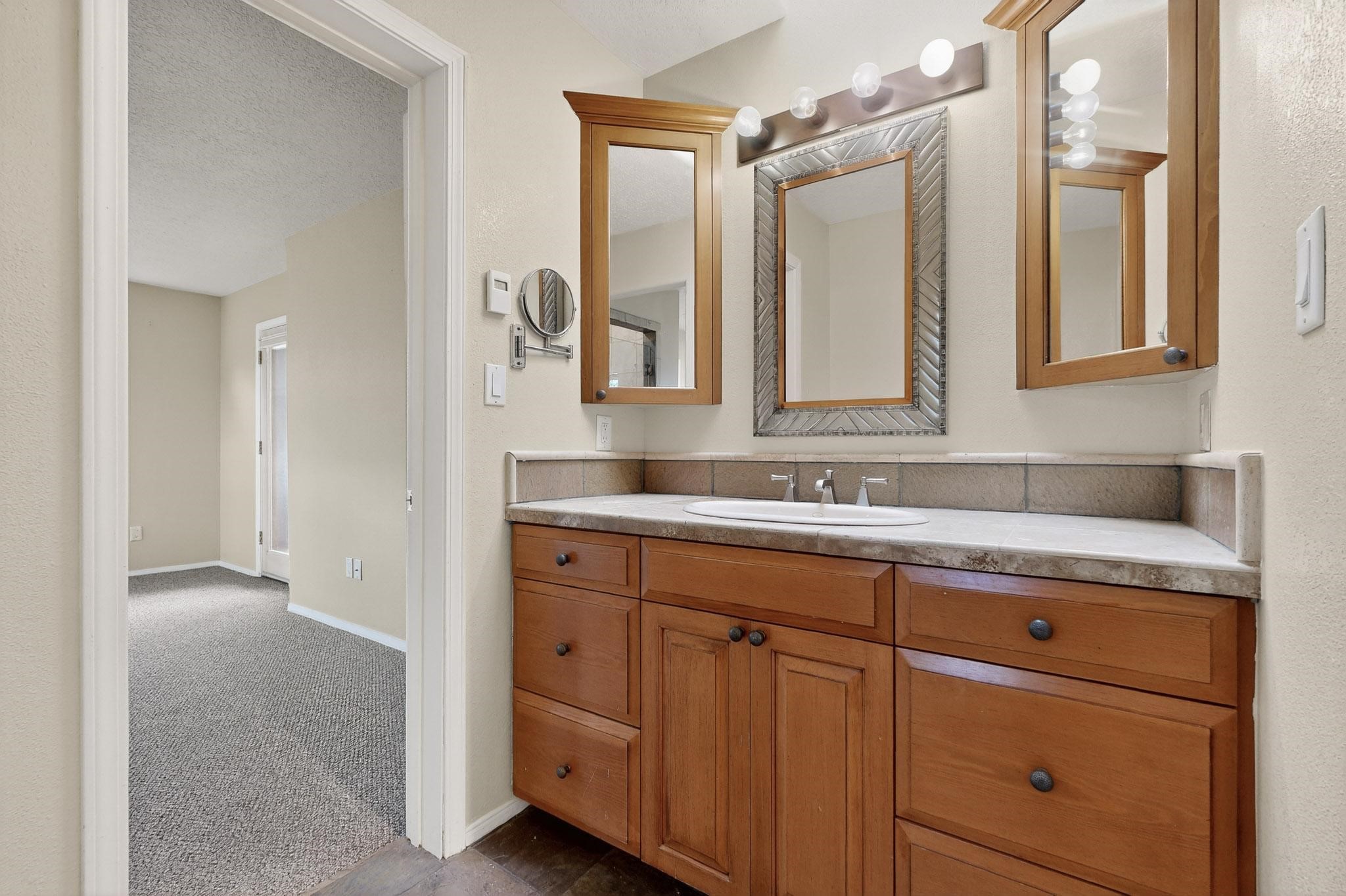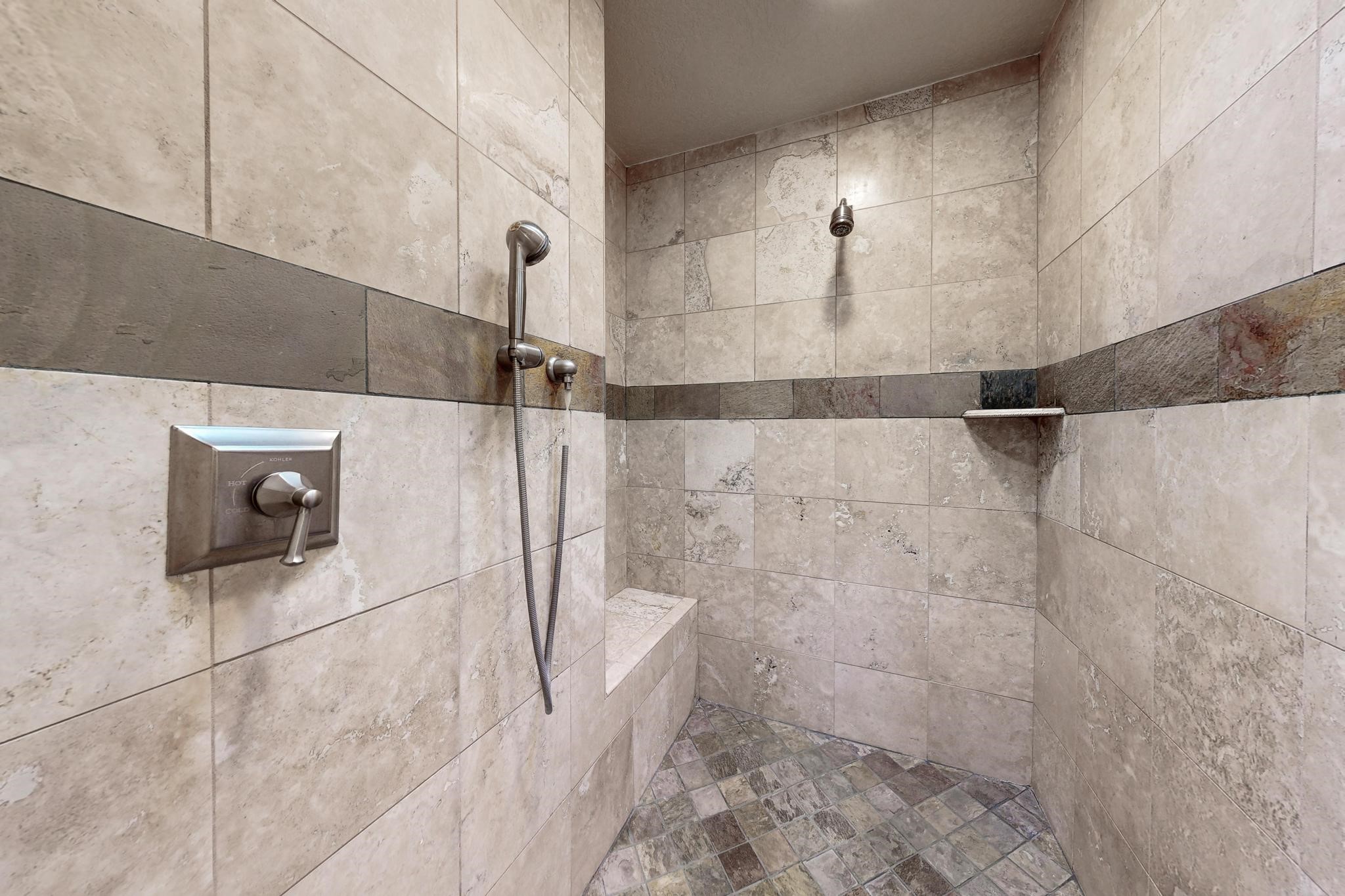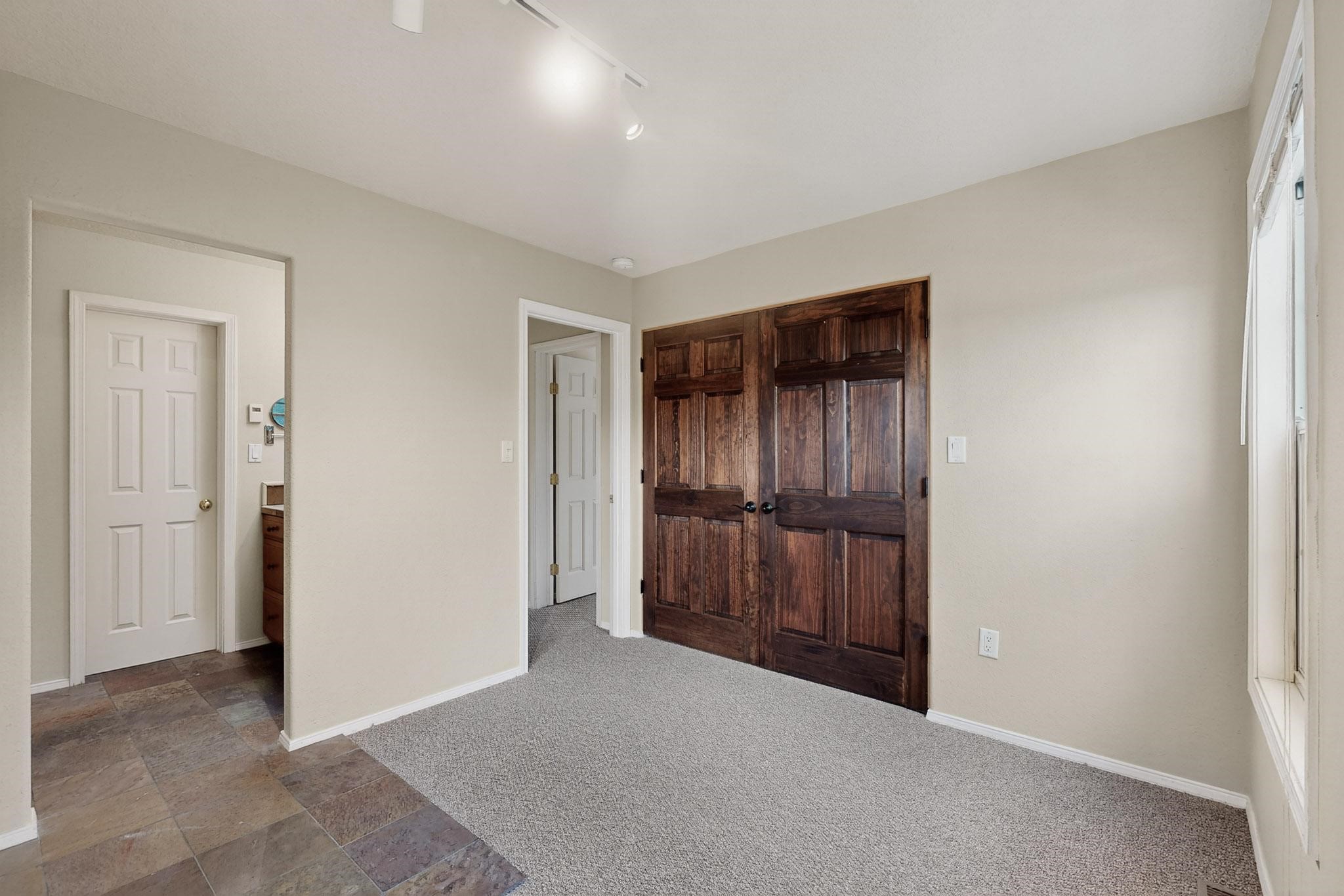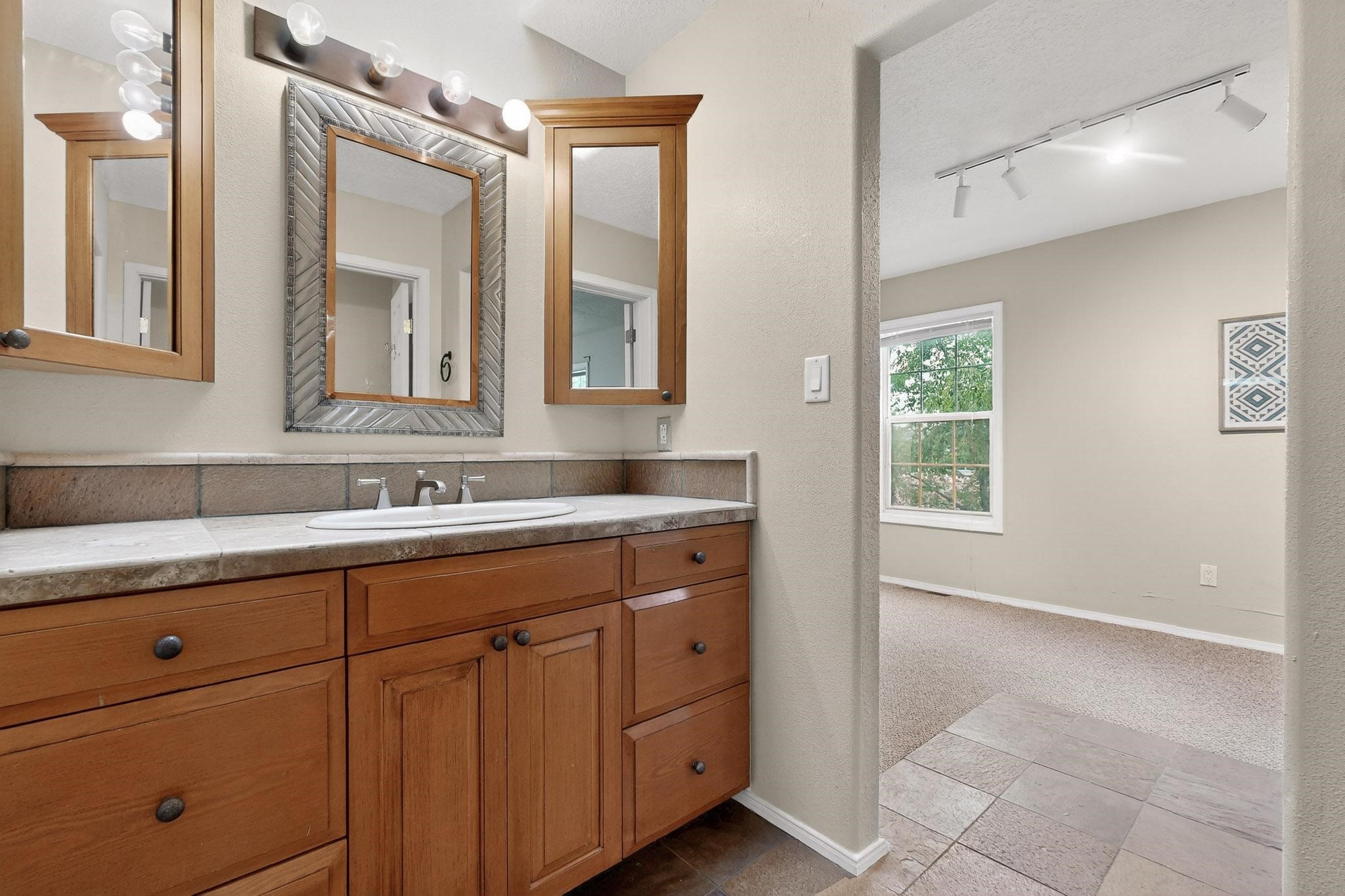 Welcome to your own private oasis minutes from the Plaza. A traditional SW style home where flagstone floors greet you when you walk in. Step down into the living room where high ceilings, tall windows, and a kiva fireplace create a cozy and relaxing space. There is a bathroom and bedroom on the bottom floor for easy and comfort. The updated kitchen flows to the dinning room, and outside to the multiple inviting patios with flowers and vines. Upstairs you'll find a suite with a walk through bathroom to the dressing area/office, and a balcony looking out to the mountains. Two more nicely appointed rooms are upstairs, and the laundry has been added to one of the bedrooms. Attached 1 car garage, newer carpet, kitchen and baths with granite countertops, fresh paint, and a newer roof. As you go out the small gated community, art filled streets and the Santa Fe River are right there where you can mosey along the path to the historic Downtown Santa Fe, or over to restaurants and stores. Now is your chance to have a lovely place so close to some of the things that make Santa Fe special. No HOA, and this is a free standing home in a gated community with 3 other 2 story homes.