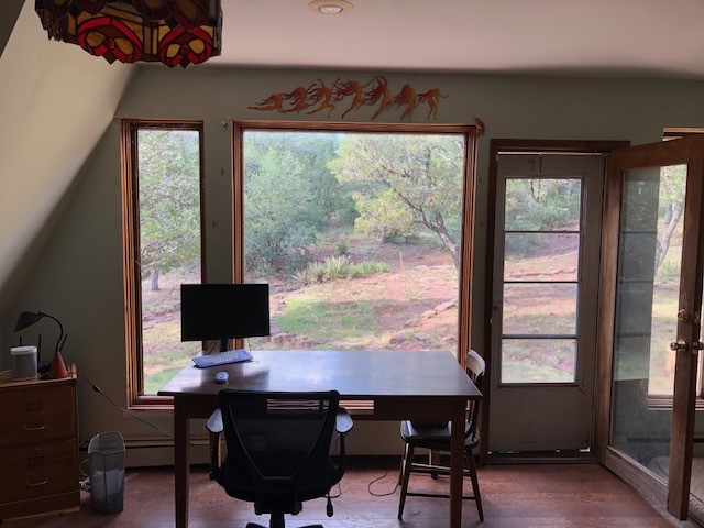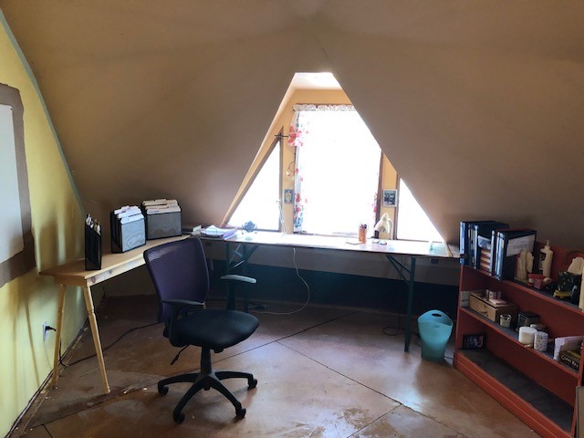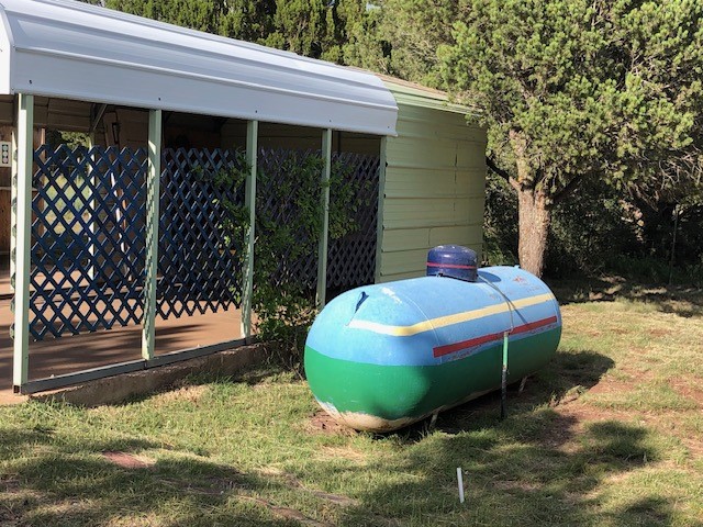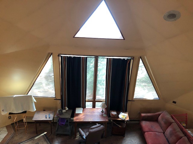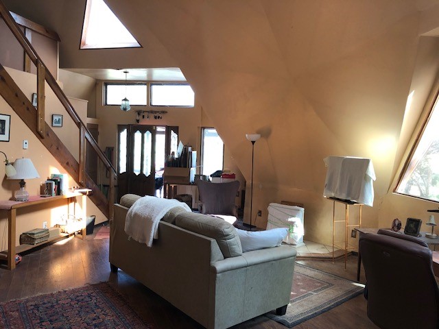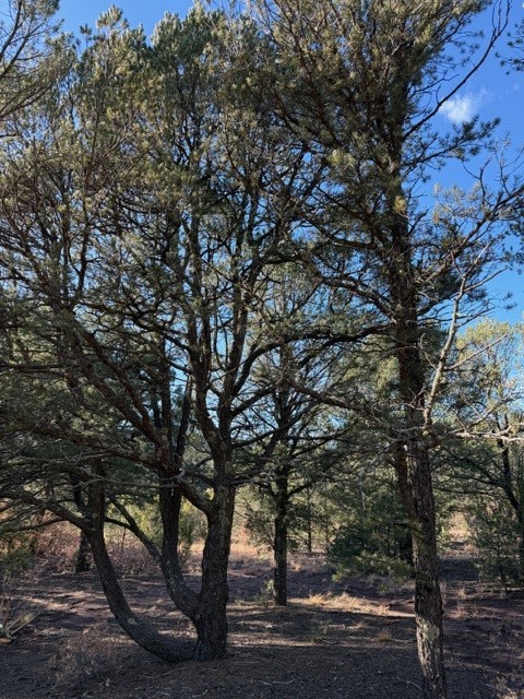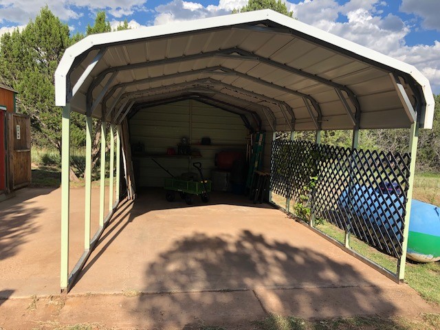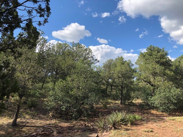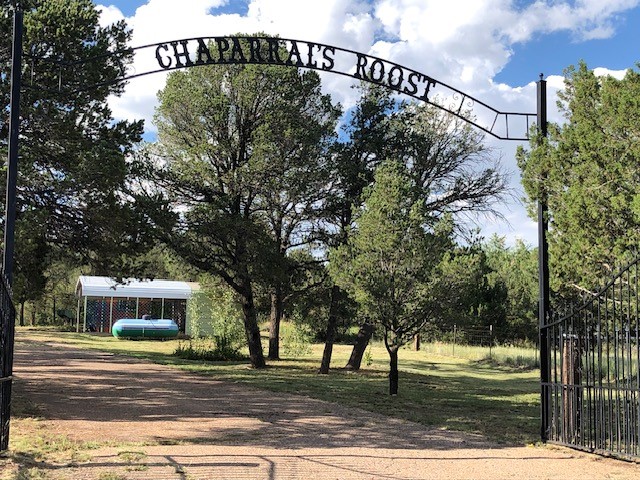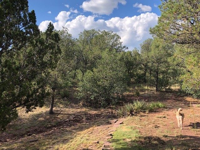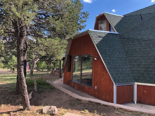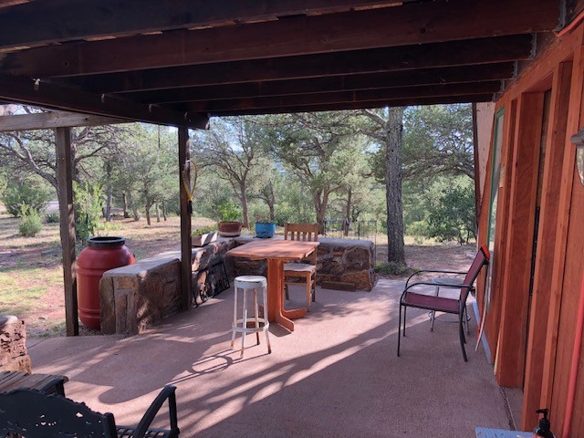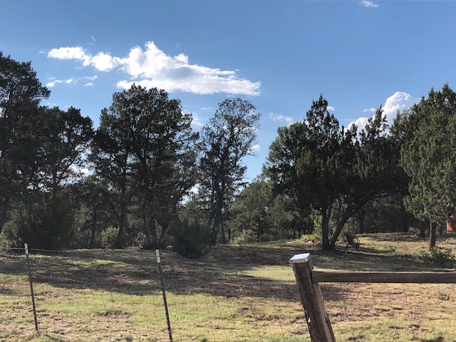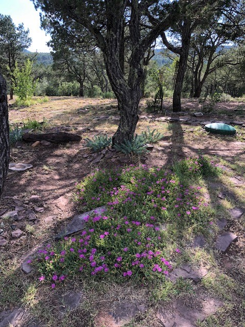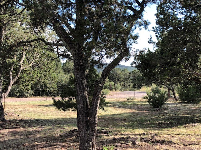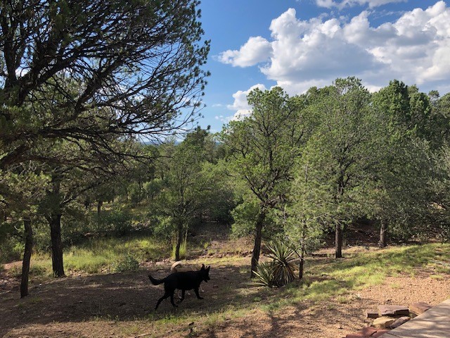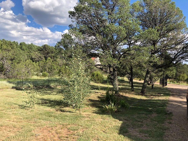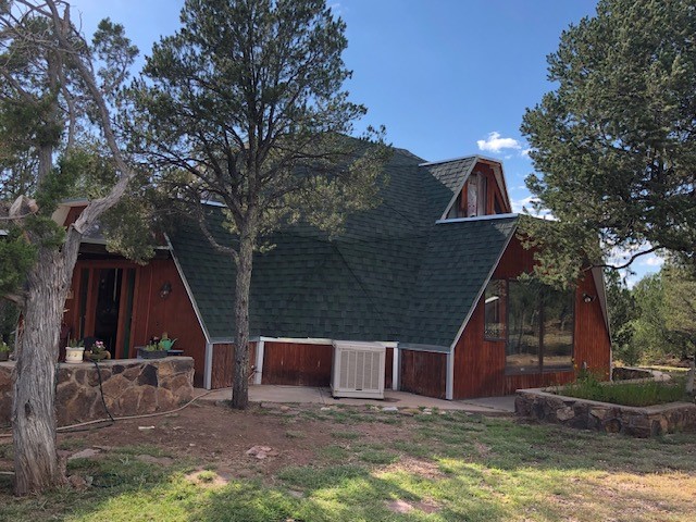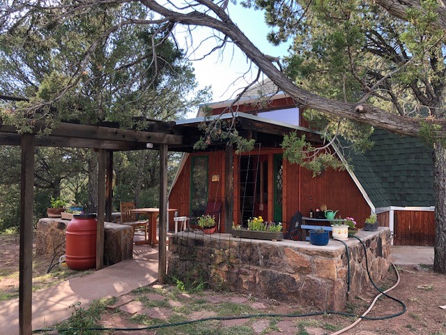 Fascinating geodesic dome home on five fenced acres which can be subdivided into 2 acre lots. The home features two primary suites with adjoining living areas. Downstairs suite has a Jacuzzi tub and a new Andersen window with eastern exposure. Awaken with the morning sun! Sunsets illuminate the upstairs suite with an unobstructed view of Hermit's Peak and beyond. New Andersen windows catch the breeze through the trees for cross ventilation.The manicured front yard is great for bocce ball or chipping from the rough. Enclosed carport and workshop are joined by a concrete pad. The 464' deep well pumps 15 GPM and is sufficient to water the trees, raised beds, a garden, and wash the cars, as well as provide for all domestic needs.The lower acreage is heavily forested and has a separate entrance. Water and power are available on the road. There is a 40' x 60' paved tennis court that has been protected by a retaining wall.