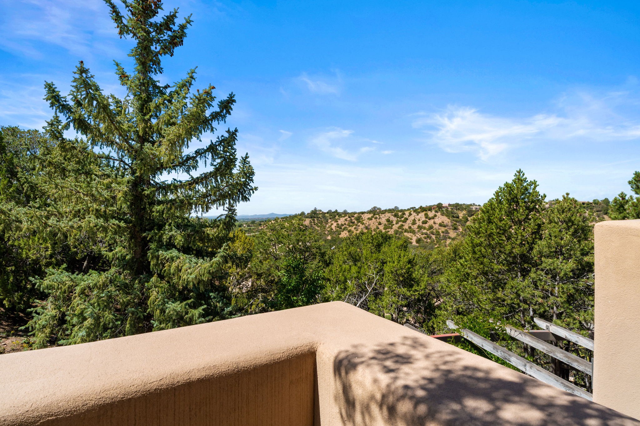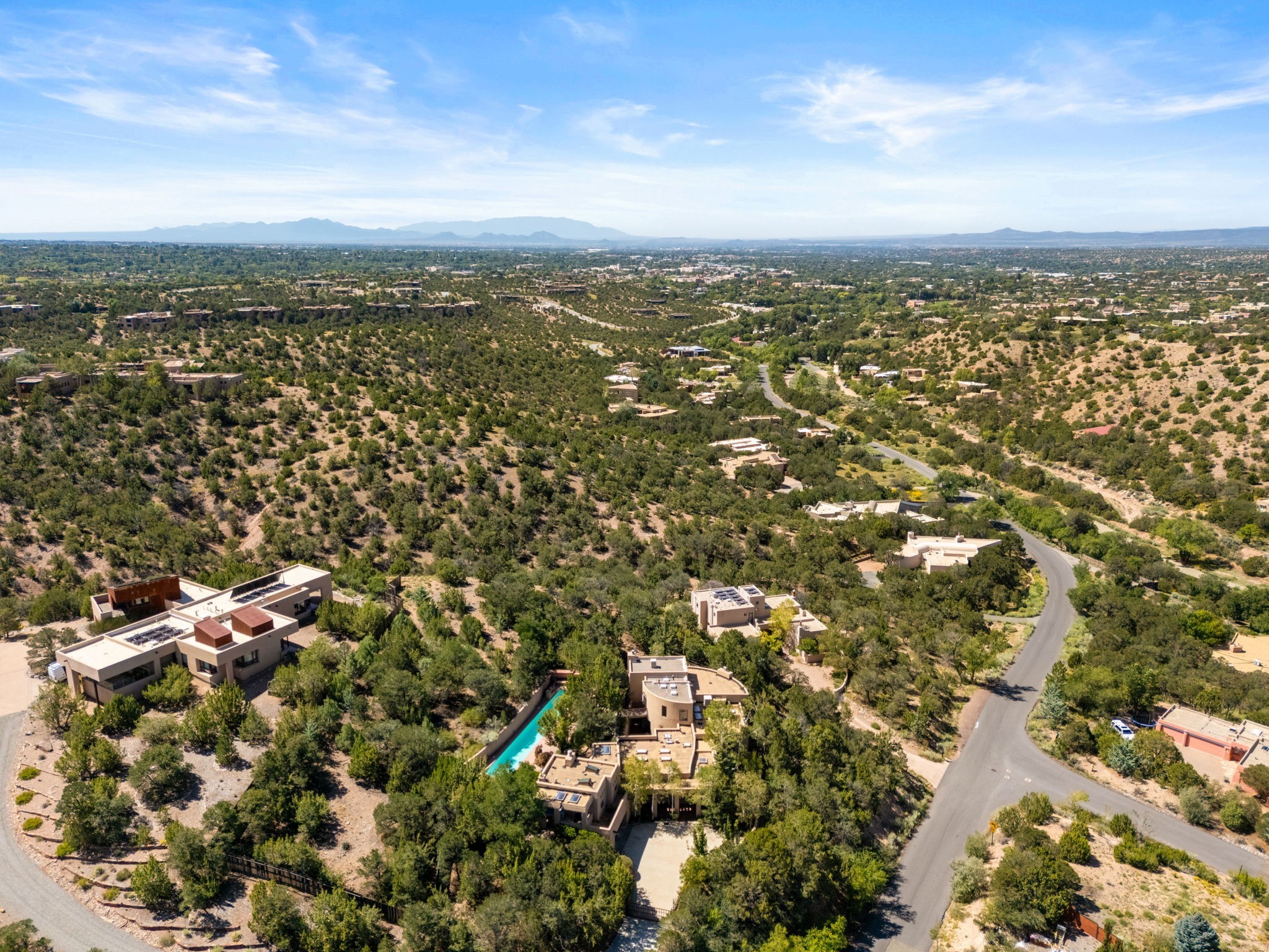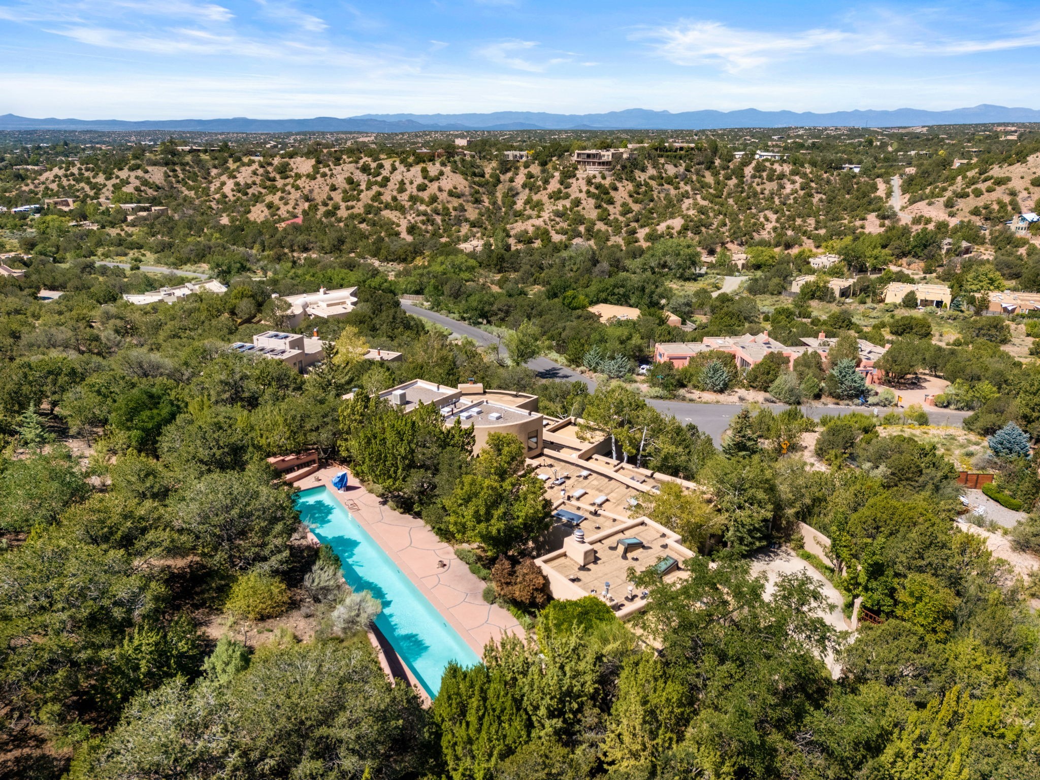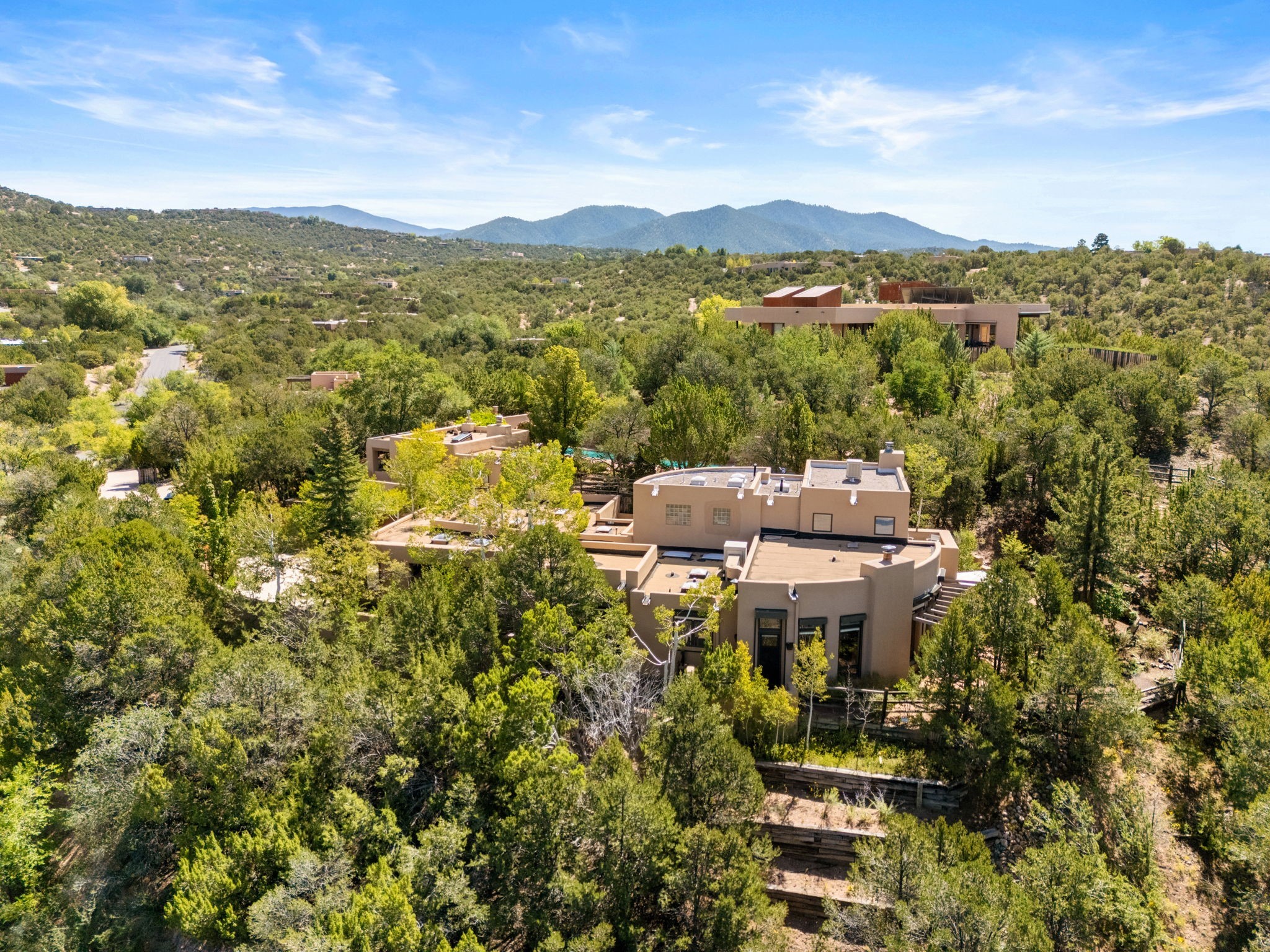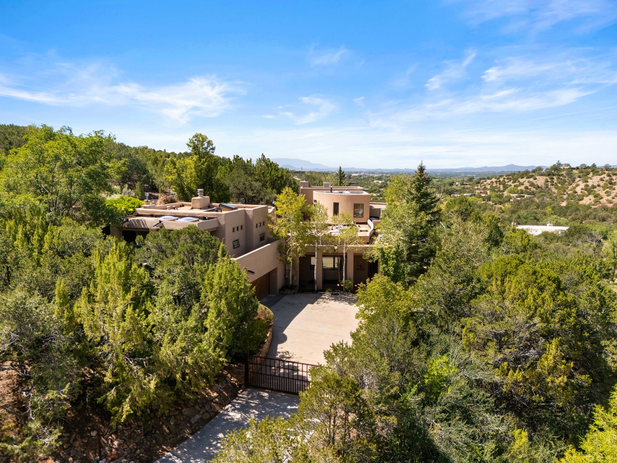 Perched high on a serene hilltop with commanding views of the Sangre de Cristo Mountains, this Santa Fe-style custom estate offers a masterful blend of artistry, comfort, and Southwestern soul. Just minutes from the historic Plaza yet nestled in a private enclave on a full acre, this 4,300-square-foot sanctuary embodies the magic of Northern New Mexico living.Step inside to sun-drenched interiors where massive windows frame mountain vistas. The dining room, with stenciled beams and a corner Kiva fireplace, is perfect for cozy evenings or elegant entertaining. The living room impresses with fan-shaped vigas, a dramatic fireplace, and custom mantle, flowing into a spacious kitchen with granite counters, island, gas stove, copper hood, skylights, and walk-in pantry.Two luxurious Primary Suites ensure privacy. The main-level suite includes a coved ceiling, updated bath, private den, and French doors to a tranquil patio. Upstairs, a curved staircase leads to the second suite with Kiva fireplace, private deck, and bridge walkway to a spectacular 75-foot lap pool.Perfect for gatherings, the entertainment room -- once home to two grand pianos -- opens to the front portal. A charming casita above the two-car garage adds versatility with sleeping space for five, full bath, closet, kitchenette, private patio, and separate entrance.Blending Santa Fe craftsmanship, modern updates, and breathtaking surroundings, this home is more than a residence -- it is a living work of art and a rare opportunity to own a piece of Santa Fe's soul.
