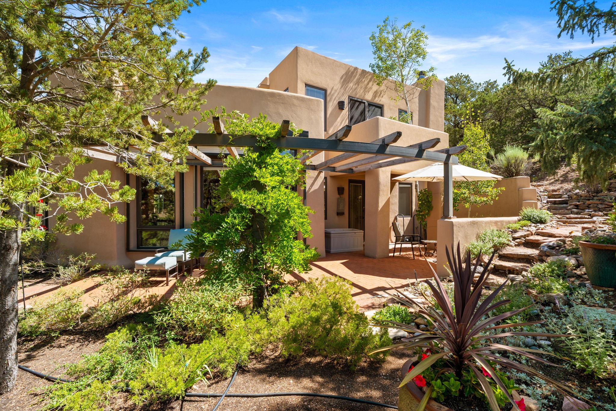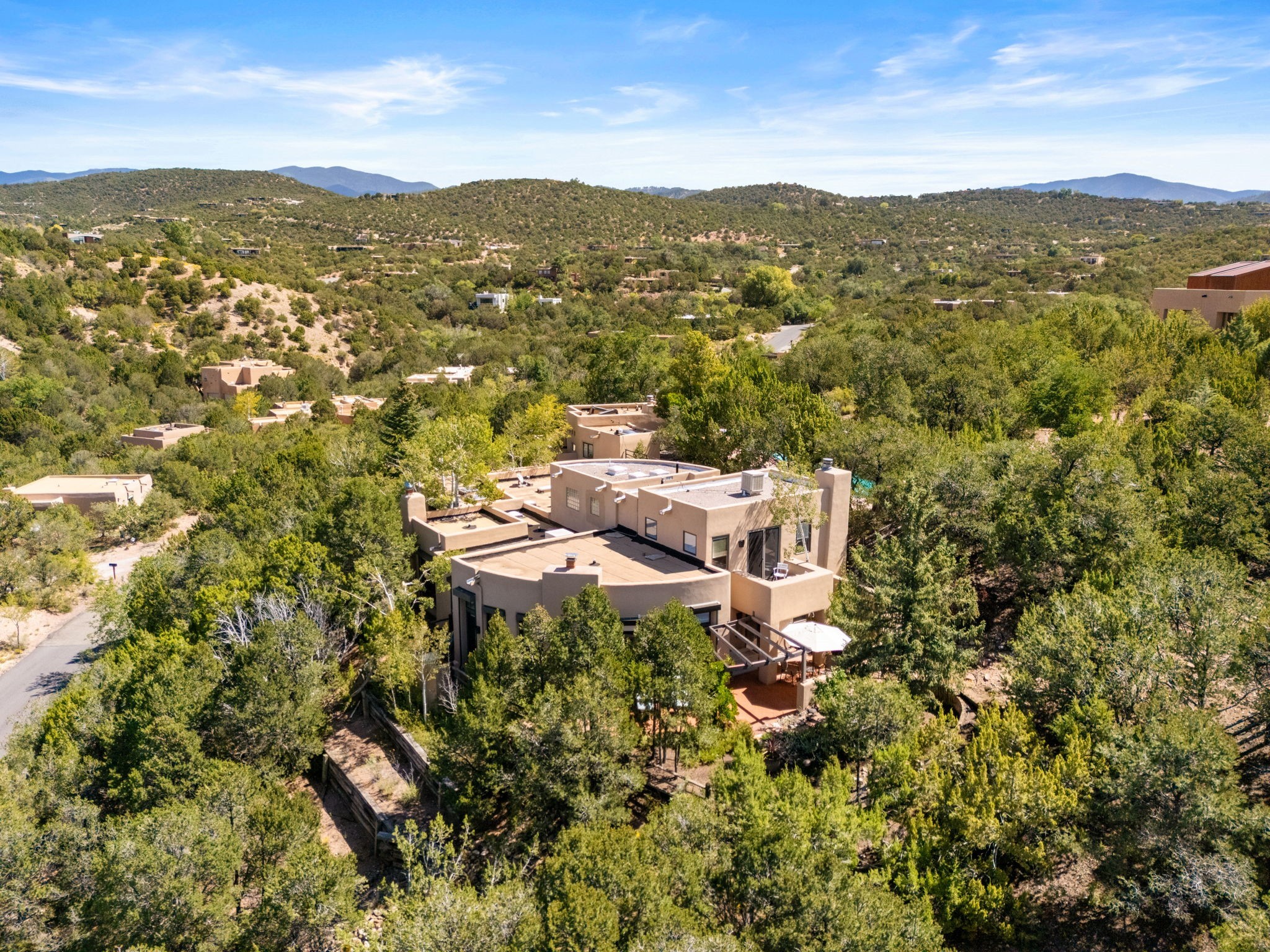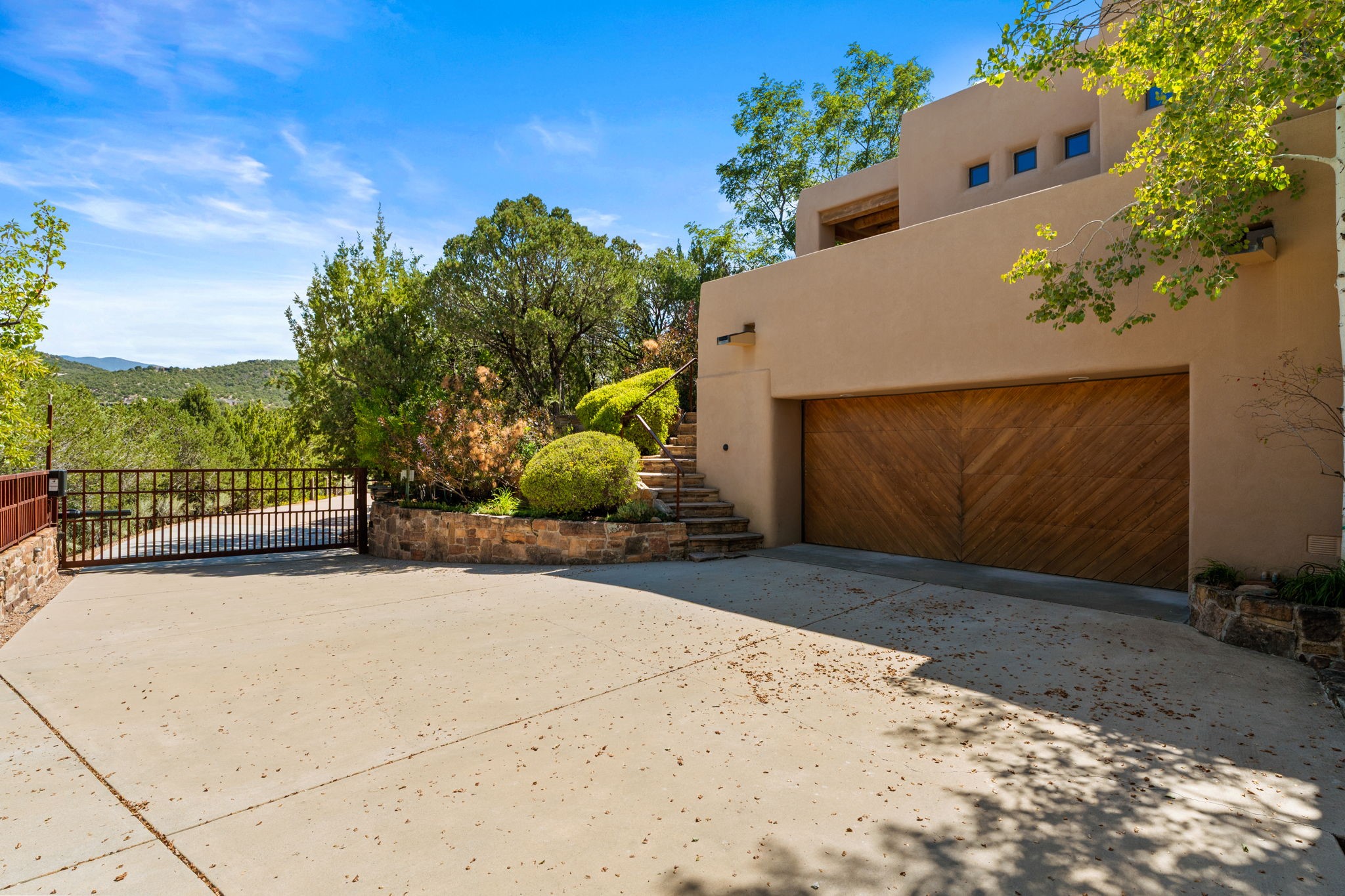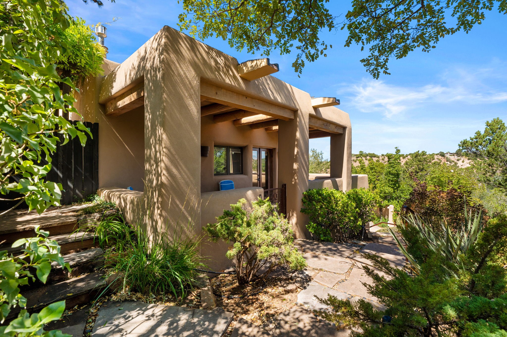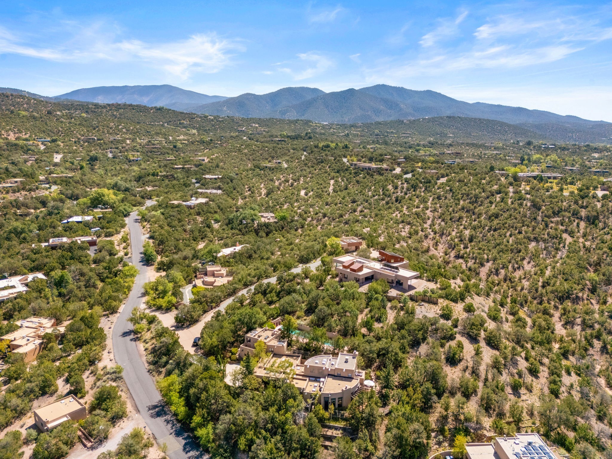 Perched high on a serene hilltop with commanding views of the Sangre de Cristo Mountains, this Santa Fe-style custom estate offers a masterful blend of artistry, comfort, and Southwestern soul. Just minutes from the historic Plaza yet nestled in a private enclave on a full acre, this 4,300-square-foot sanctuary embodies the magic of Northern New Mexico living.Step inside to sun-drenched interiors where massive windows frame mountain vistas. The dining room, with stenciled beams and a corner Kiva fireplace, is perfect for cozy evenings or elegant entertaining. The living room impresses with fan-shaped vigas, a dramatic fireplace, and custom mantle, flowing into a spacious kitchen with granite counters, island, gas stove, copper hood, skylights, and walk-in pantry.Two luxurious Primary Suites ensure privacy. The main-level suite includes a coved ceiling, updated bath, private den, and French doors to a tranquil patio. Upstairs, a curved staircase leads to the second suite with Kiva fireplace, private deck, and bridge walkway to a spectacular 75-foot lap pool.Perfect for gatherings, the entertainment room -- once home to two grand pianos -- opens to the front portal. A charming casita above the two-car garage adds versatility with sleeping space for five, full bath, closet, kitchenette, private patio, and separate entrance.Blending Santa Fe craftsmanship, modern updates, and breathtaking surroundings, this home is more than a residence -- it is a living work of art and a rare opportunity to own a piece of Santa Fe's soul.