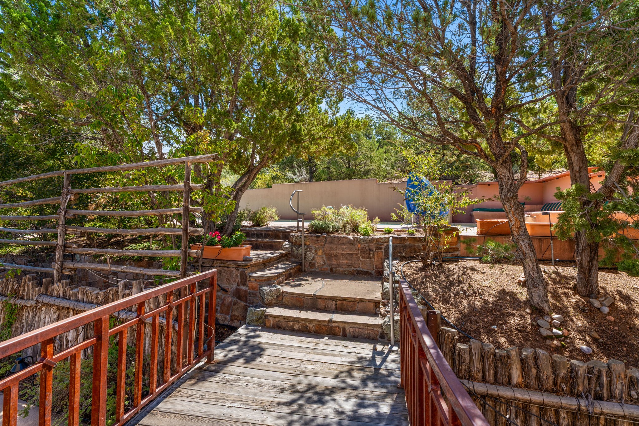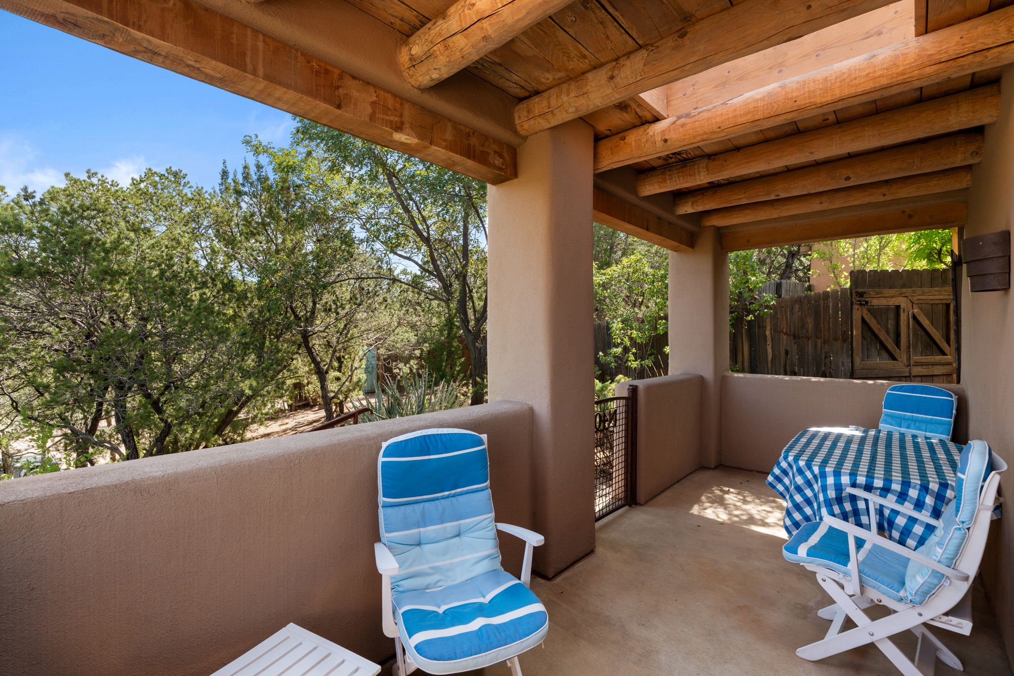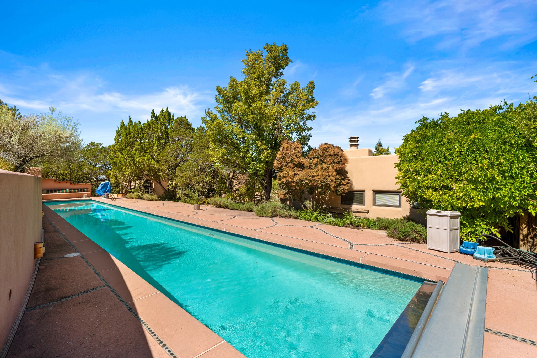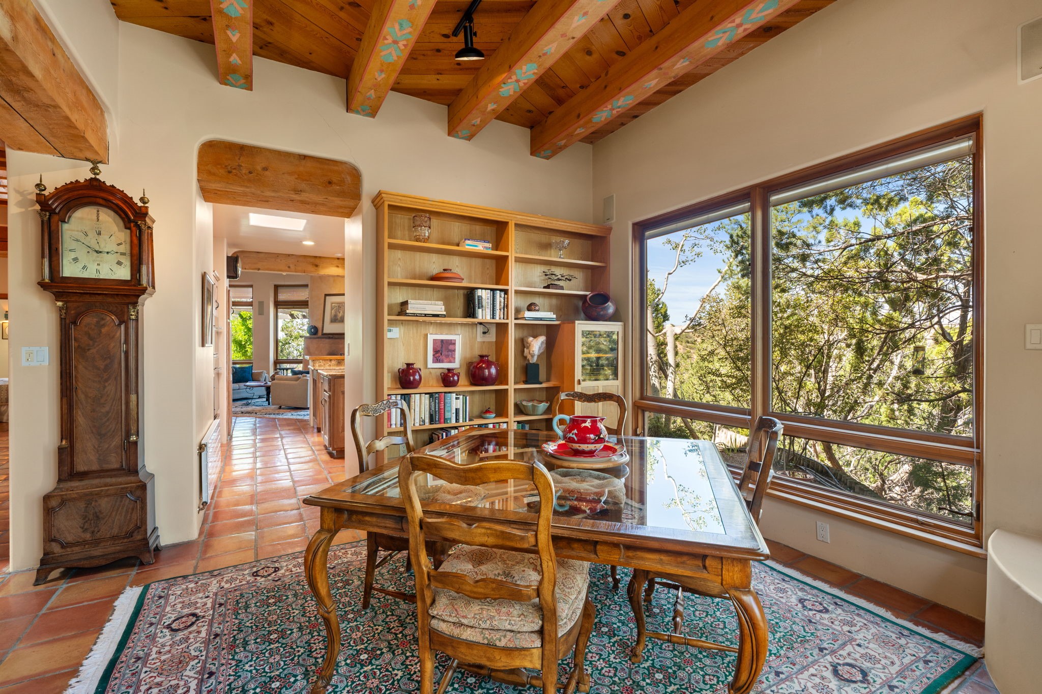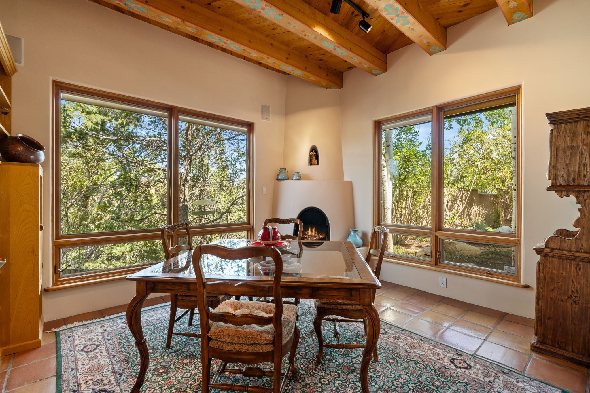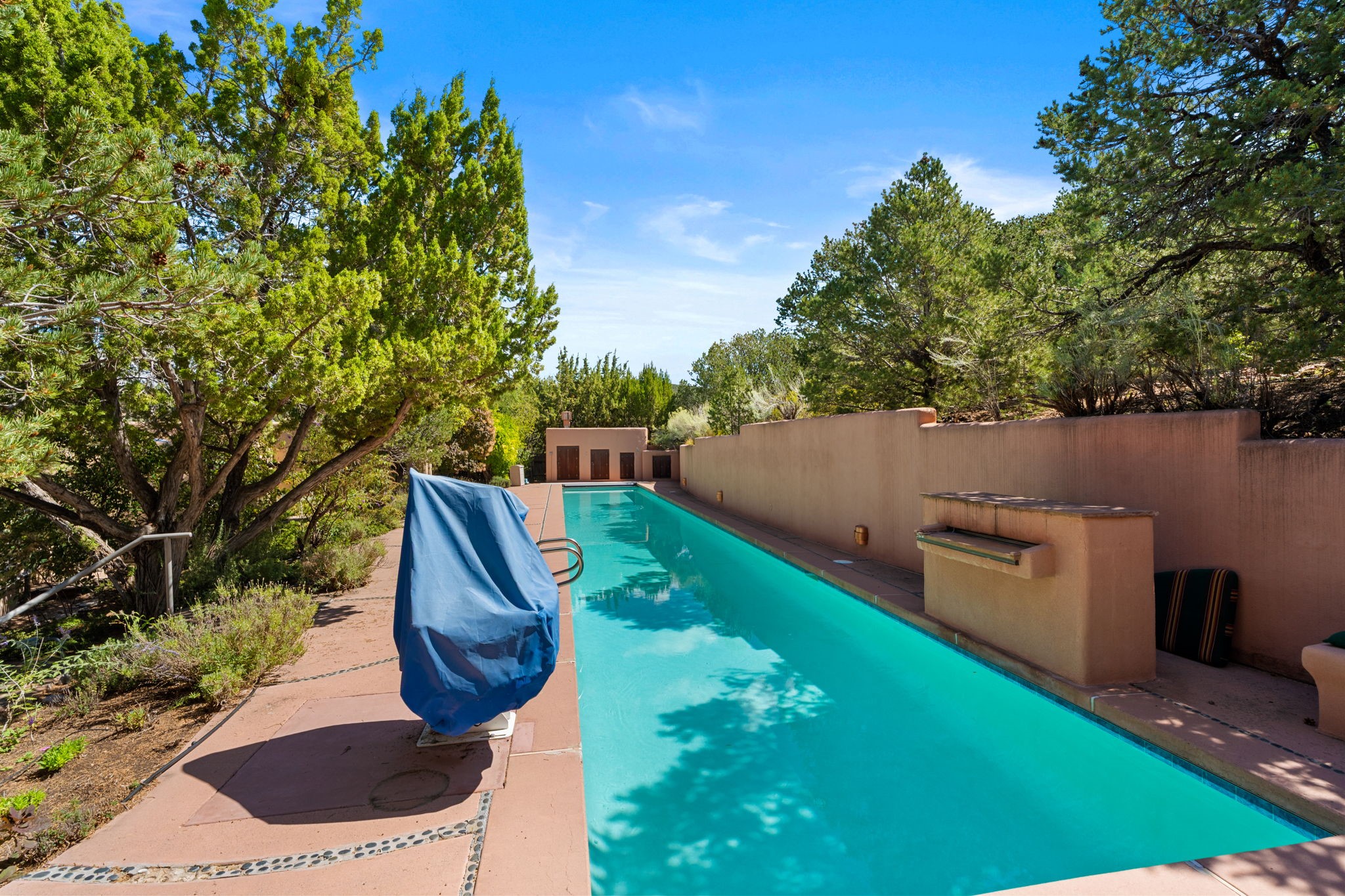 Perched high on a serene hilltop with commanding views of the Sangre de Cristo Mountains, this Santa Fe-style custom estate offers a masterful blend of artistry, comfort, and Southwestern soul. Just minutes from the historic Plaza yet nestled in a private enclave on a full acre, this 4,300-square-foot sanctuary embodies the magic of Northern New Mexico living.Step inside to sun-drenched interiors where massive windows frame mountain vistas. The dining room, with stenciled beams and a corner Kiva fireplace, is perfect for cozy evenings or elegant entertaining. The living room impresses with fan-shaped vigas, a dramatic fireplace, and custom mantle, flowing into a spacious kitchen with granite counters, island, gas stove, copper hood, skylights, and walk-in pantry.Two luxurious Primary Suites ensure privacy. The main-level suite includes a coved ceiling, updated bath, private den, and French doors to a tranquil patio. Upstairs, a curved staircase leads to the second suite with Kiva fireplace, private deck, and bridge walkway to a spectacular 75-foot lap pool.Perfect for gatherings, the entertainment room -- once home to two grand pianos -- opens to the front portal. A charming casita above the two-car garage adds versatility with sleeping space for five, full bath, closet, kitchenette, private patio, and separate entrance.Blending Santa Fe craftsmanship, modern updates, and breathtaking surroundings, this home is more than a residence -- it is a living work of art and a rare opportunity to own a piece of Santa Fe's soul.