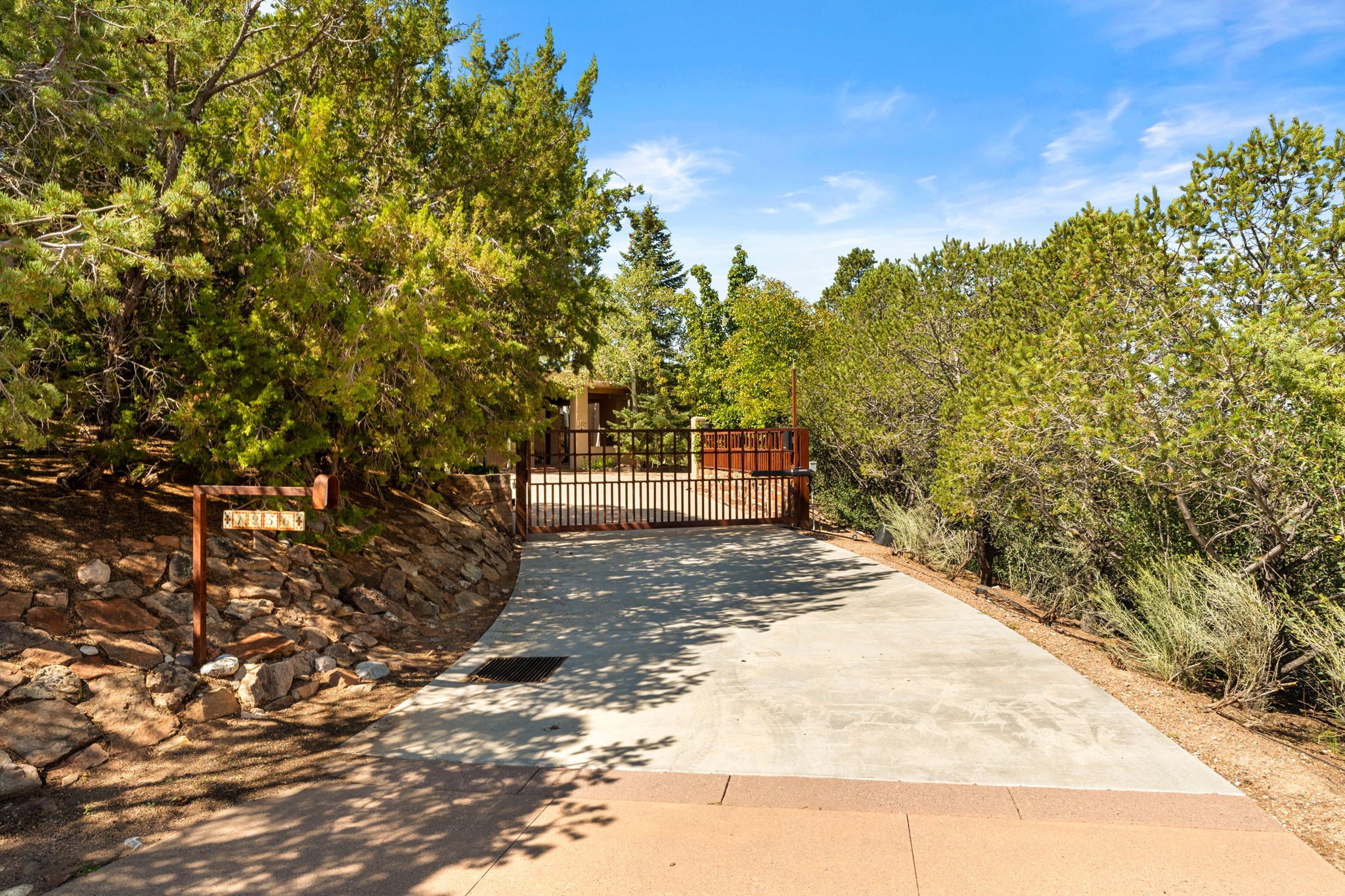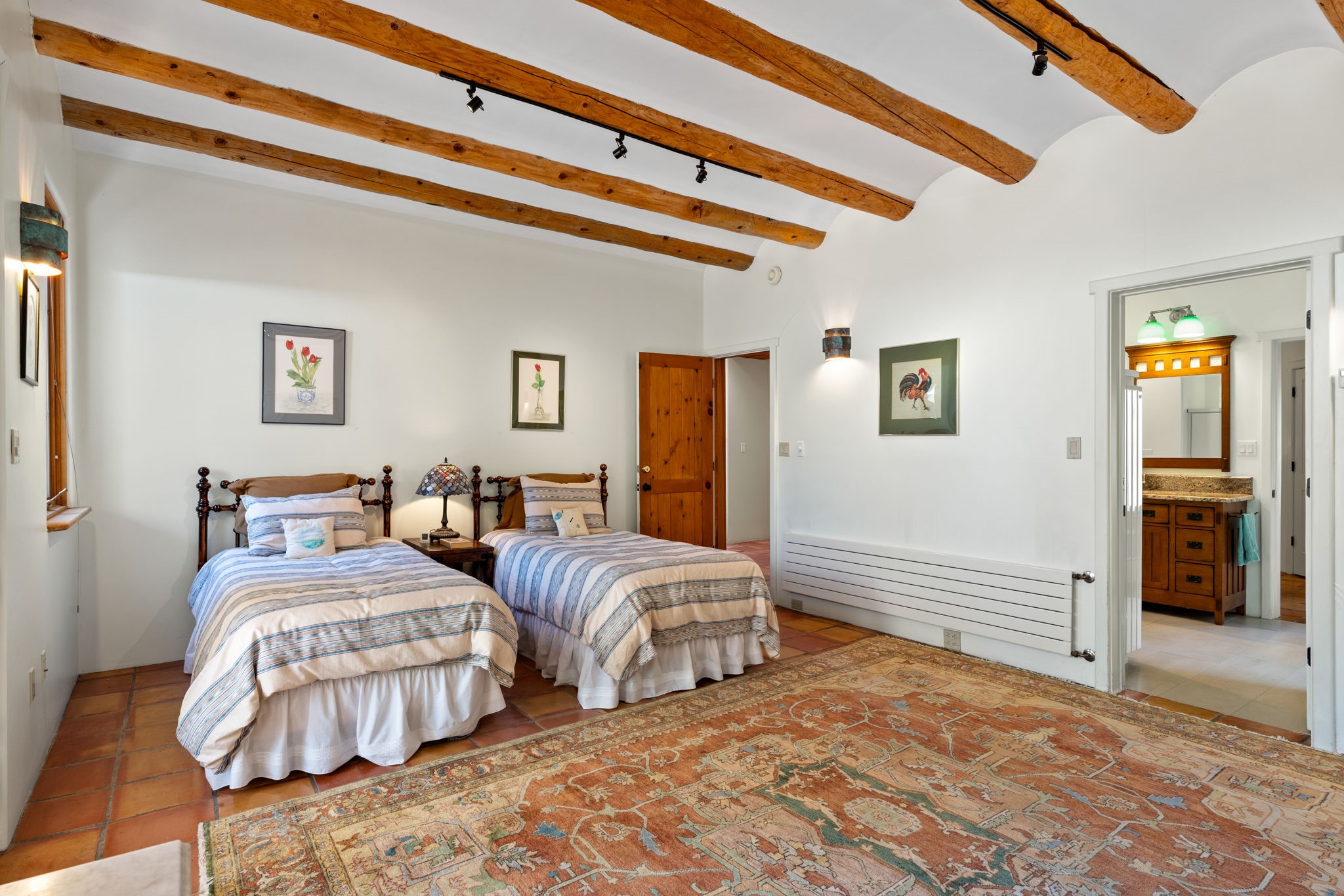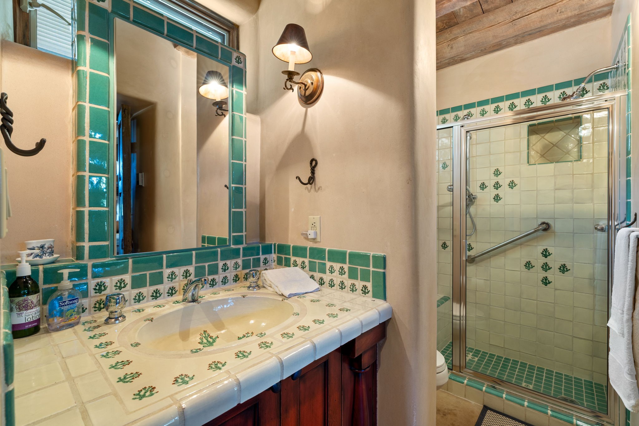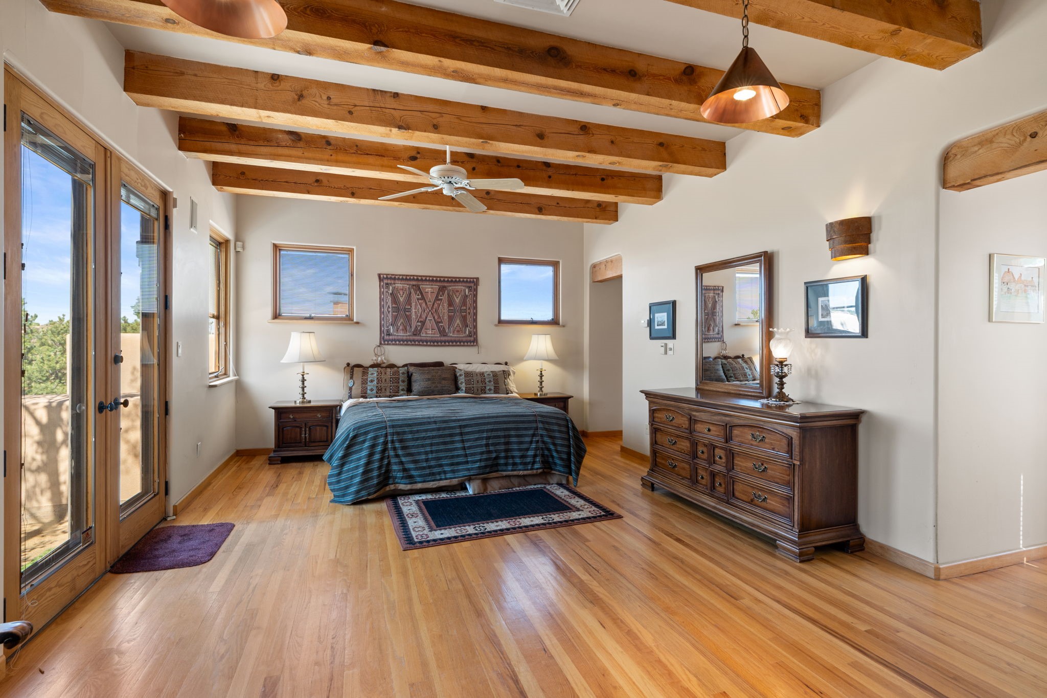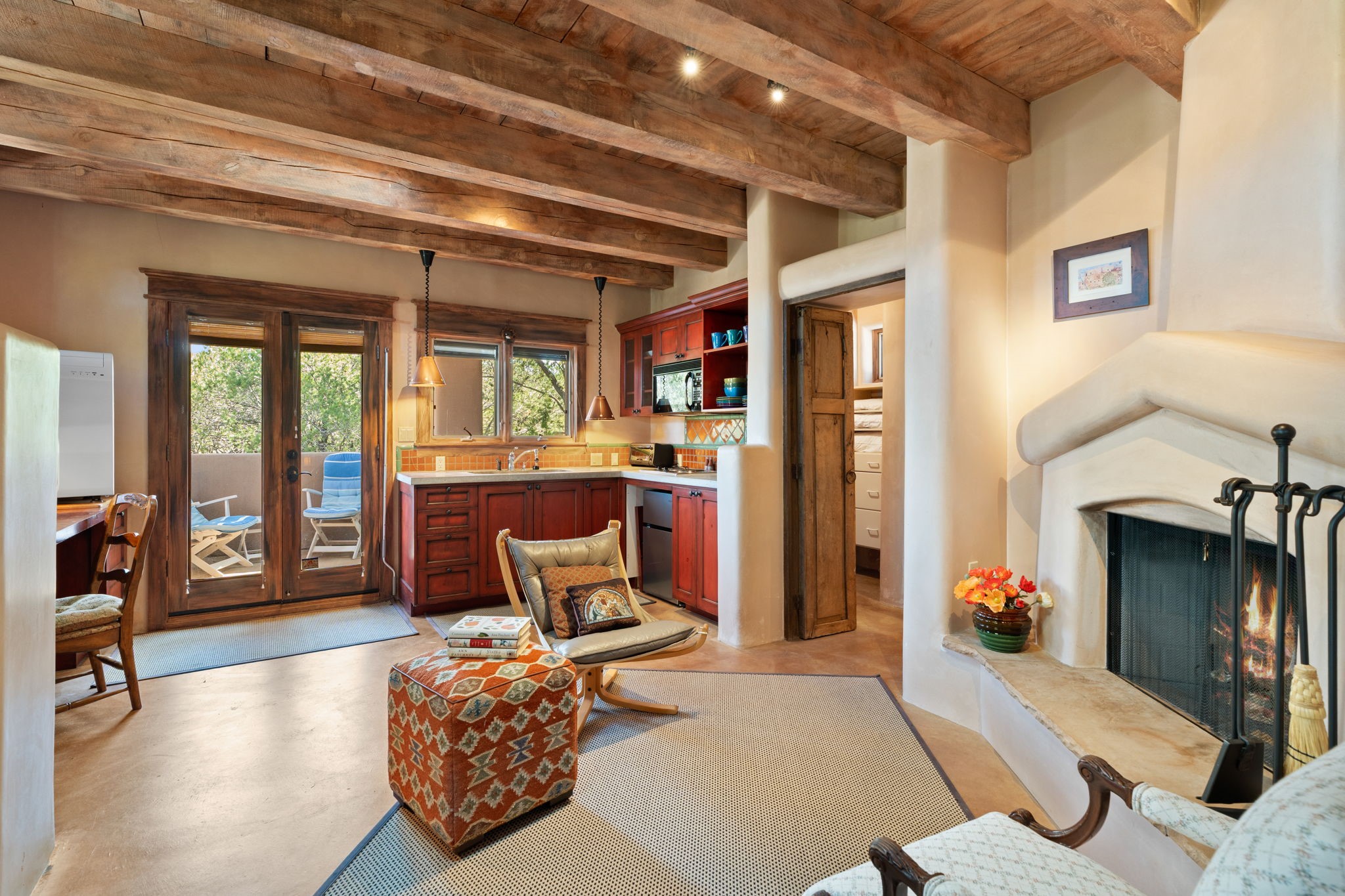 Perched high on a serene hilltop with commanding views of the Sangre de Cristo Mountains, this Santa Fe-style custom estate offers a masterful blend of artistry, comfort, and Southwestern soul. Just minutes from the historic Plaza yet nestled in a private enclave on a full acre, this 4,300-square-foot sanctuary embodies the magic of Northern New Mexico living.Step inside to sun-drenched interiors where massive windows frame mountain vistas. The dining room, with stenciled beams and a corner Kiva fireplace, is perfect for cozy evenings or elegant entertaining. The living room impresses with fan-shaped vigas, a dramatic fireplace, and custom mantle, flowing into a spacious kitchen with granite counters, island, gas stove, copper hood, skylights, and walk-in pantry.Two luxurious Primary Suites ensure privacy. The main-level suite includes a coved ceiling, updated bath, private den, and French doors to a tranquil patio. Upstairs, a curved staircase leads to the second suite with Kiva fireplace, private deck, and bridge walkway to a spectacular 75-foot lap pool.Perfect for gatherings, the entertainment room -- once home to two grand pianos -- opens to the front portal. A charming casita above the two-car garage adds versatility with sleeping space for five, full bath, closet, kitchenette, private patio, and separate entrance.Blending Santa Fe craftsmanship, modern updates, and breathtaking surroundings, this home is more than a residence -- it is a living work of art and a rare opportunity to own a piece of Santa Fe's soul.