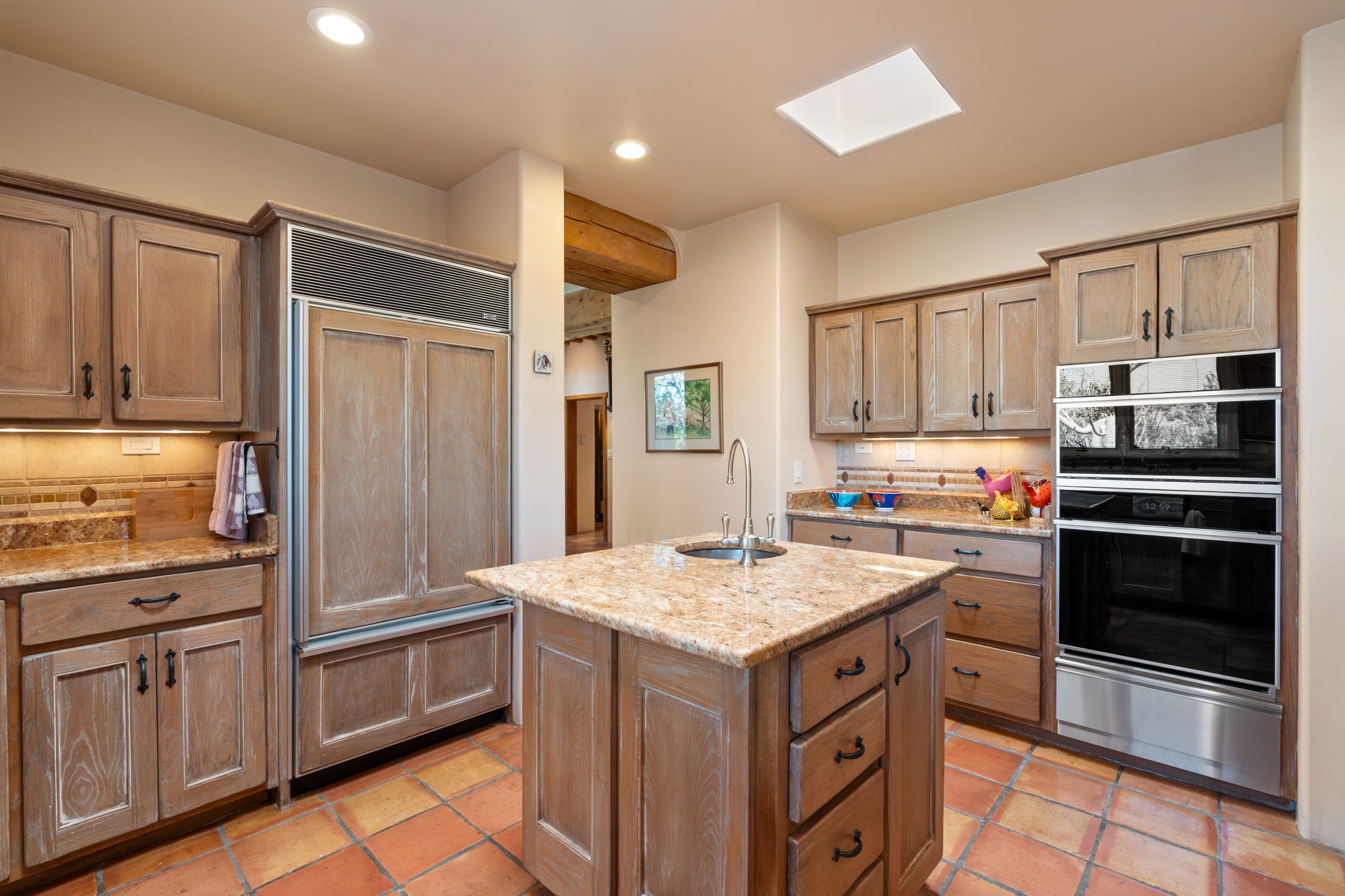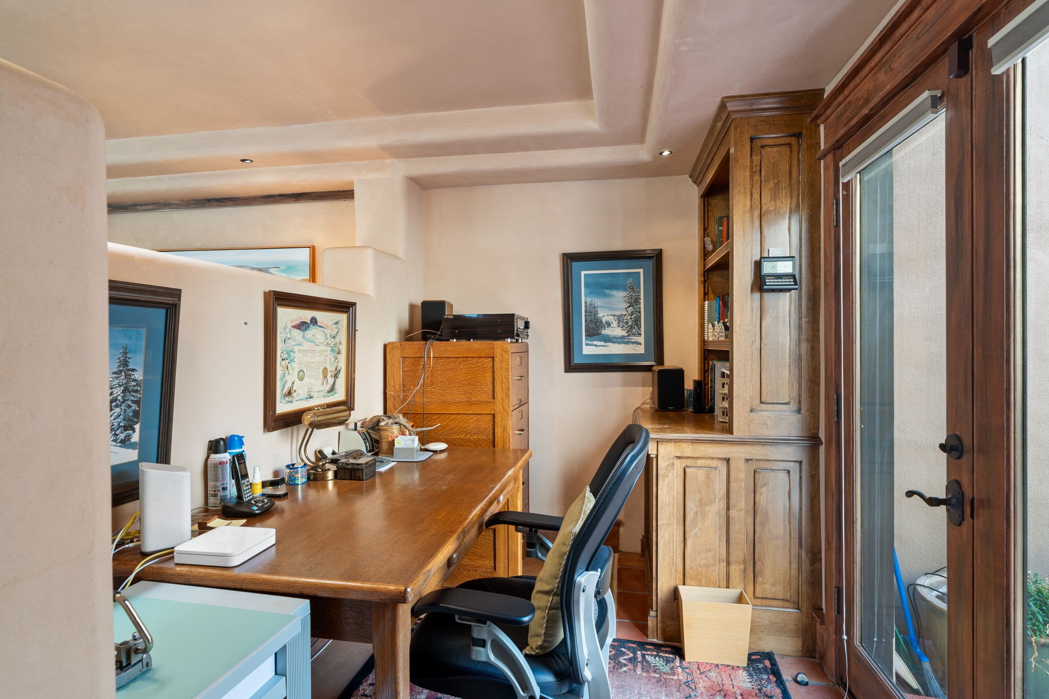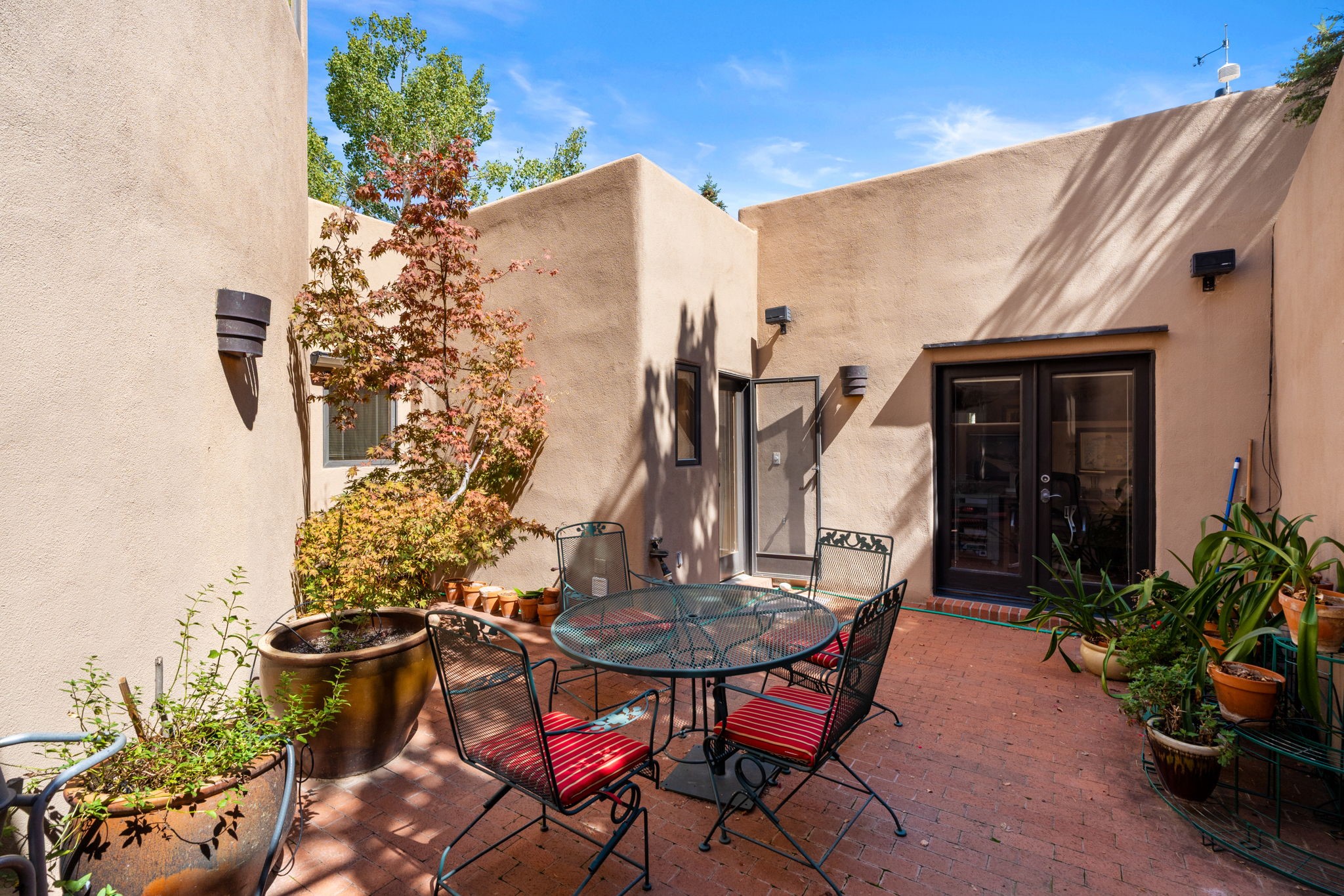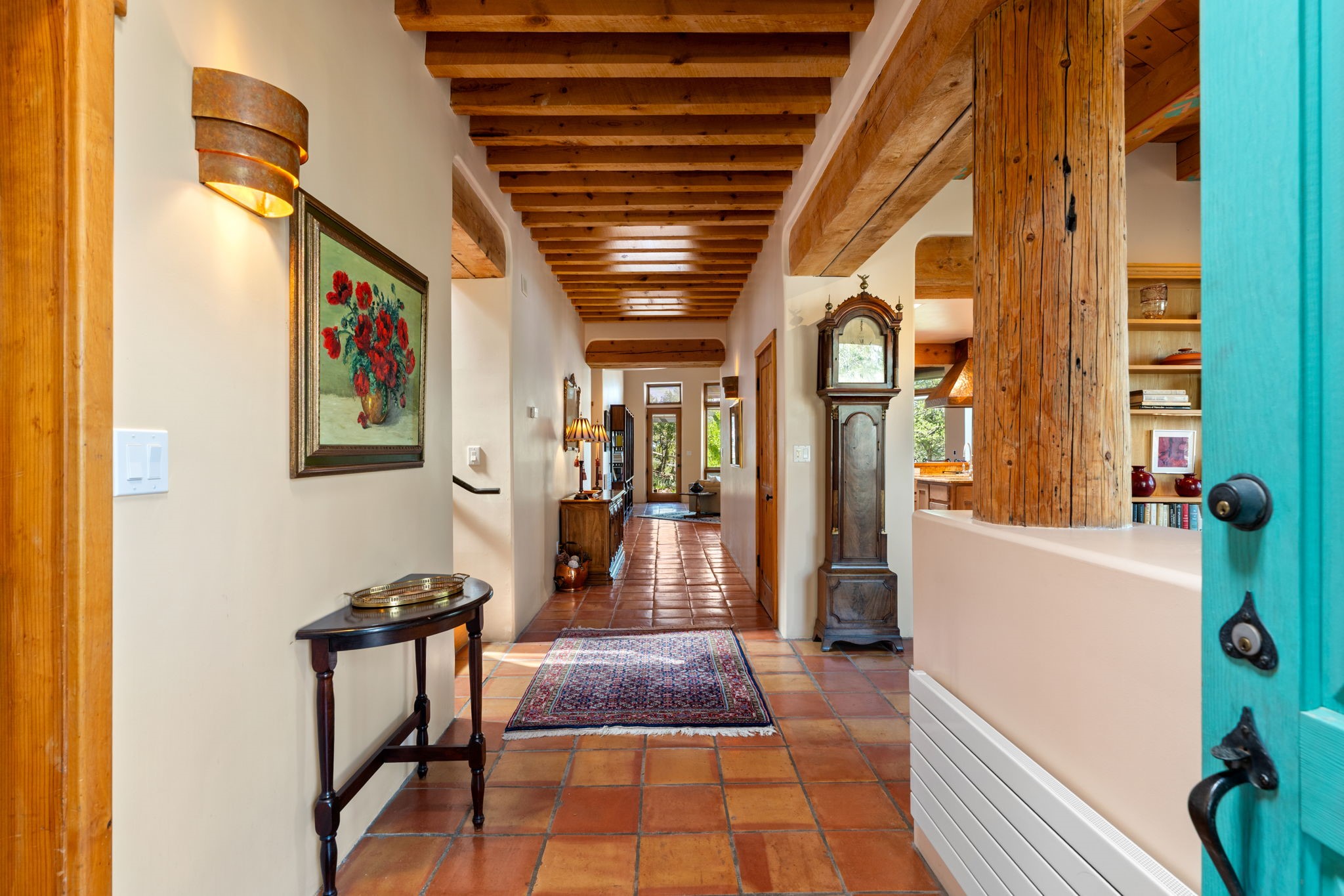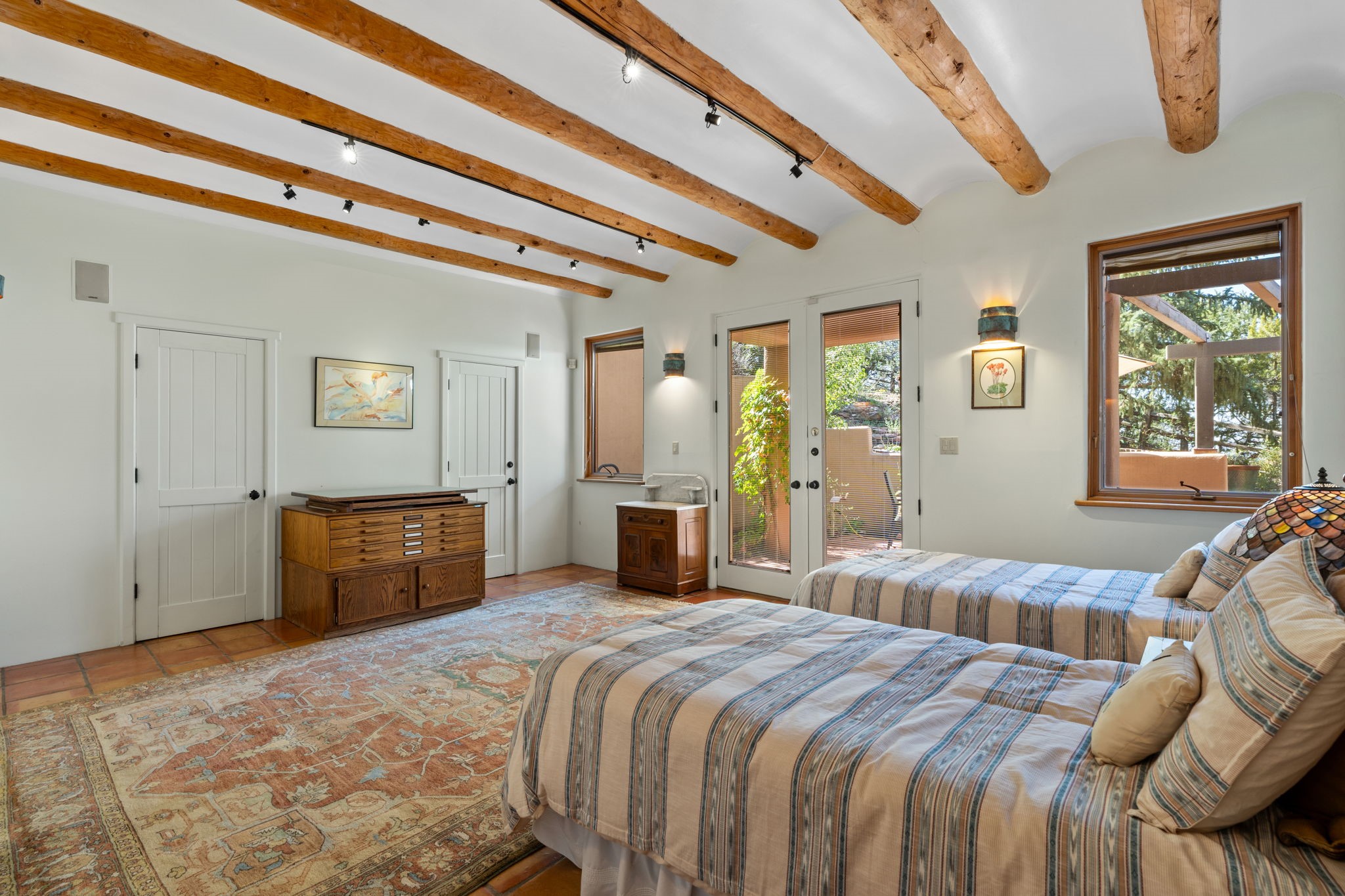 Perched high on a serene hilltop with commanding views of the Sangre de Cristo Mountains, this Santa Fe-style custom estate offers a masterful blend of artistry, comfort, and Southwestern soul. Just minutes from the historic Plaza yet nestled in a private enclave on a full acre, this 4,300-square-foot sanctuary embodies the magic of Northern New Mexico living.Step inside to sun-drenched interiors where massive windows frame mountain vistas. The dining room, with stenciled beams and a corner Kiva fireplace, is perfect for cozy evenings or elegant entertaining. The living room impresses with fan-shaped vigas, a dramatic fireplace, and custom mantle, flowing into a spacious kitchen with granite counters, island, gas stove, copper hood, skylights, and walk-in pantry.Two luxurious Primary Suites ensure privacy. The main-level suite includes a coved ceiling, updated bath, private den, and French doors to a tranquil patio. Upstairs, a curved staircase leads to the second suite with Kiva fireplace, private deck, and bridge walkway to a spectacular 75-foot lap pool.Perfect for gatherings, the entertainment room -- once home to two grand pianos -- opens to the front portal. A charming casita above the two-car garage adds versatility with sleeping space for five, full bath, closet, kitchenette, private patio, and separate entrance.Blending Santa Fe craftsmanship, modern updates, and breathtaking surroundings, this home is more than a residence -- it is a living work of art and a rare opportunity to own a piece of Santa Fe's soul.