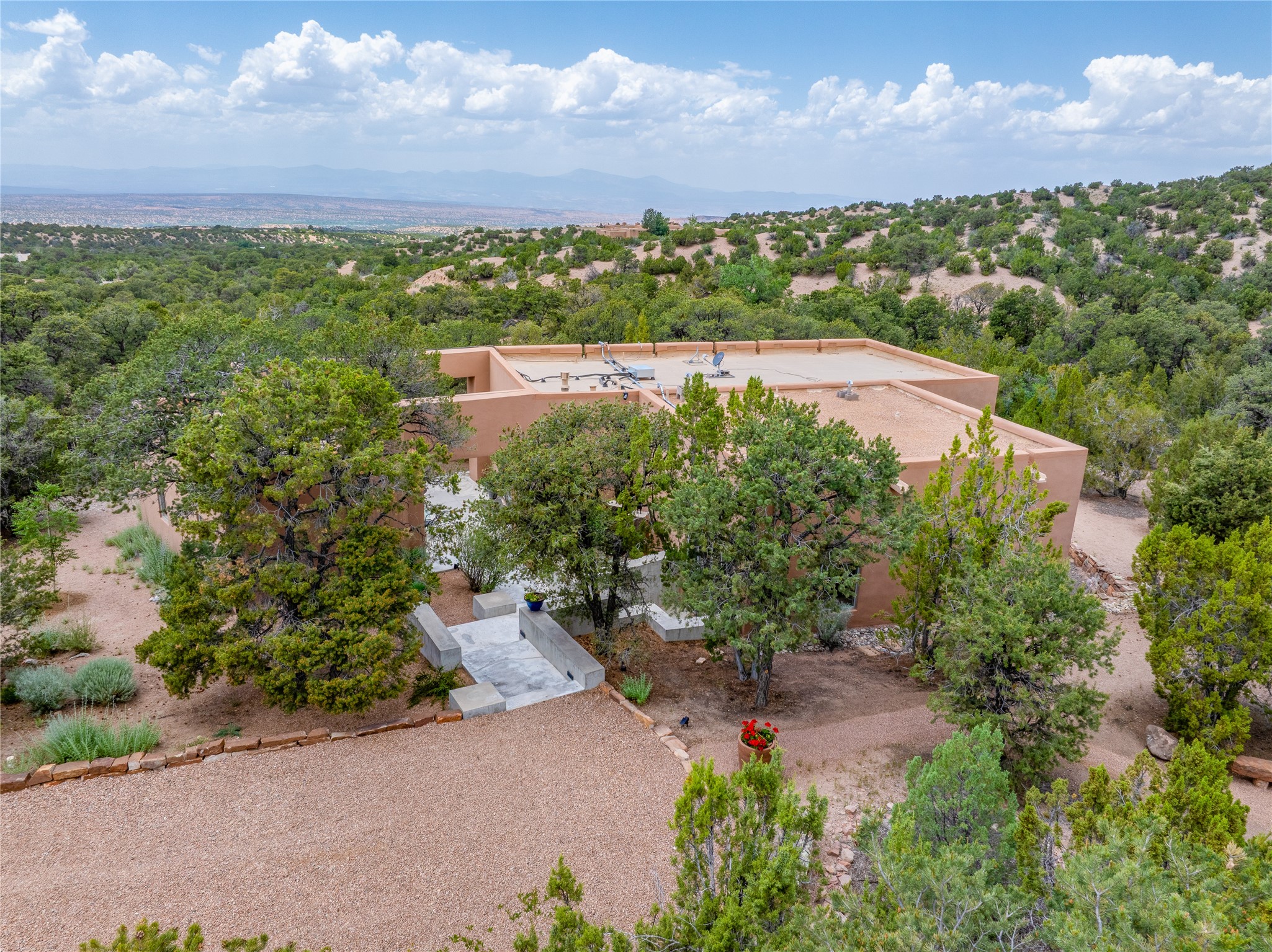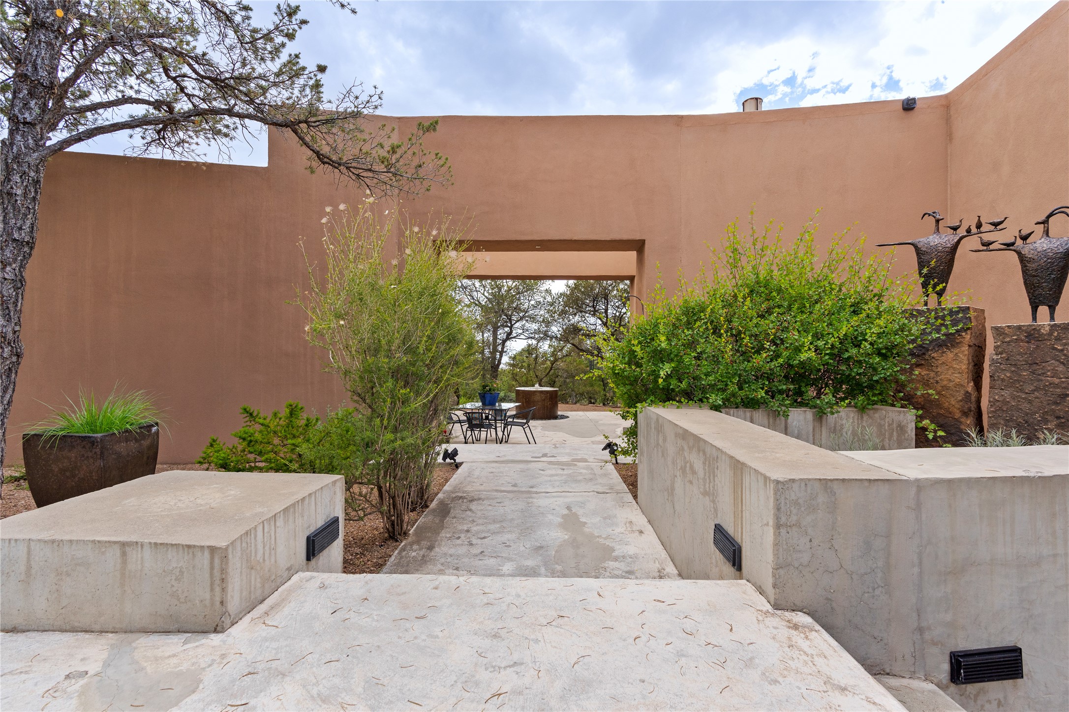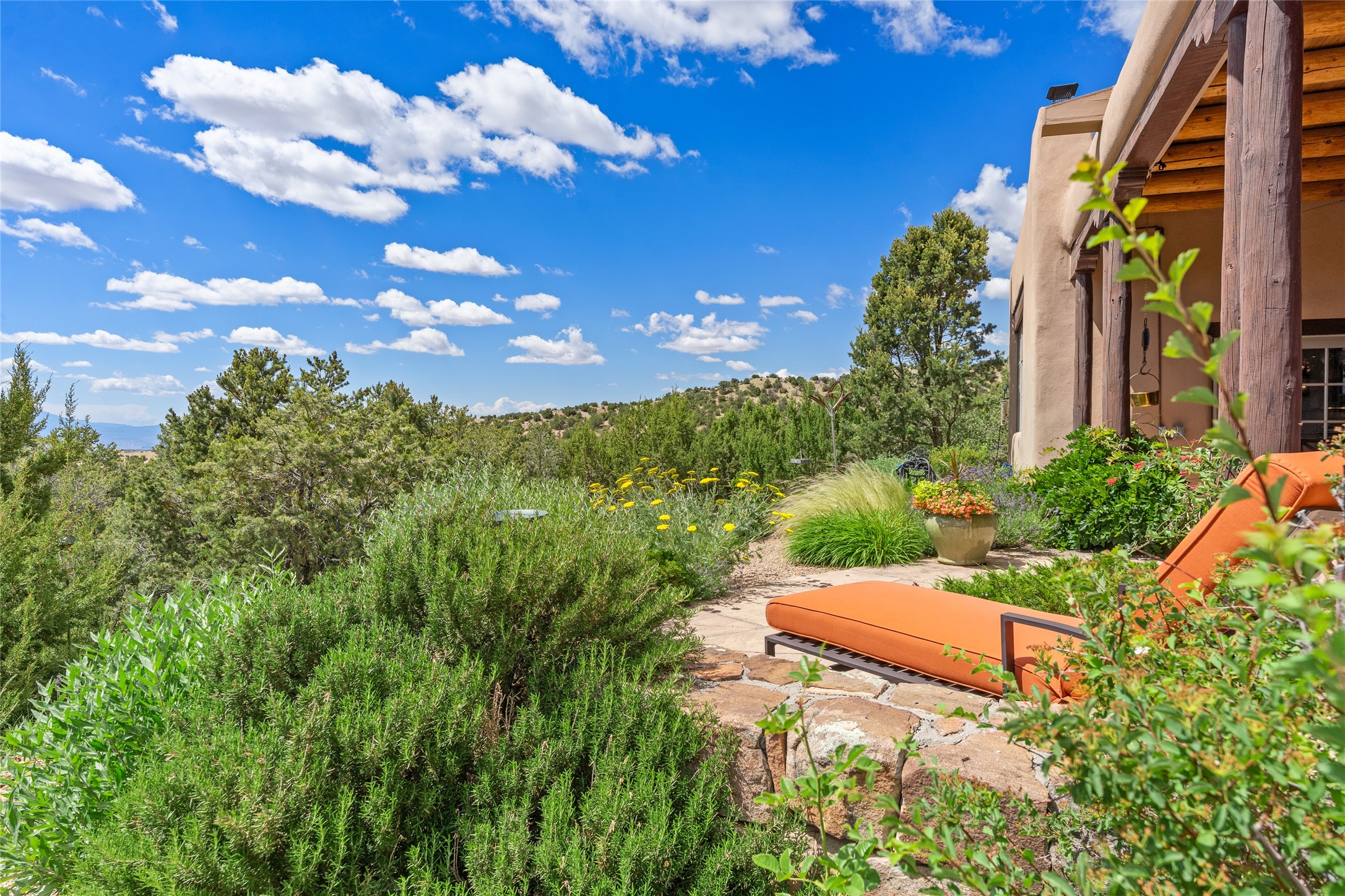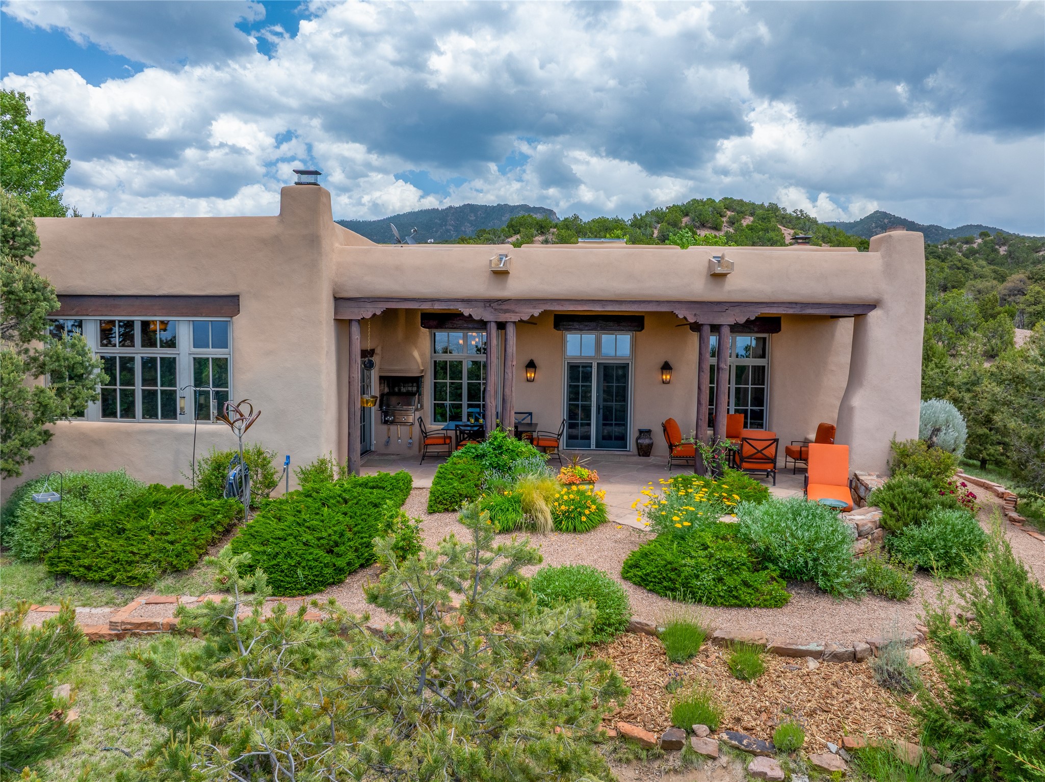 Welcome to a stunning Tesuque area compound in the prestigious gated Los Caminitos subdivision. On over 5 acres with a private well, fantastic Jemez and sunset views from main house built by Sharon Woods in 95'. The kitchen is stunning with doors to the portal with outdoor fireplace. Elegant living/dinning room surrounded on three sides by windows with upper end metal shades. Primary bedroom includes fireplace and access to rear patio. Two guest bedrooms have their own private deck with views of the Sangres. 3 car garage. Separate guest house with bath, as well as a large studio apartment and spacious studio with large north windows and new modern bathroom. Several owner upgrades including new entrance gate and septic field, new drip irrigation and pantry. Community pool and racquet courts. Lavender, roses, aspens, lilacs crab apple and peonies. 15 minutes from the plaza, adjacent to the Four Seasons resort, close to Tesuque Village Market and the world renowned Santa Fe Opera. If privacy, security and the New Mexico landscape is what you are looking for, come see.