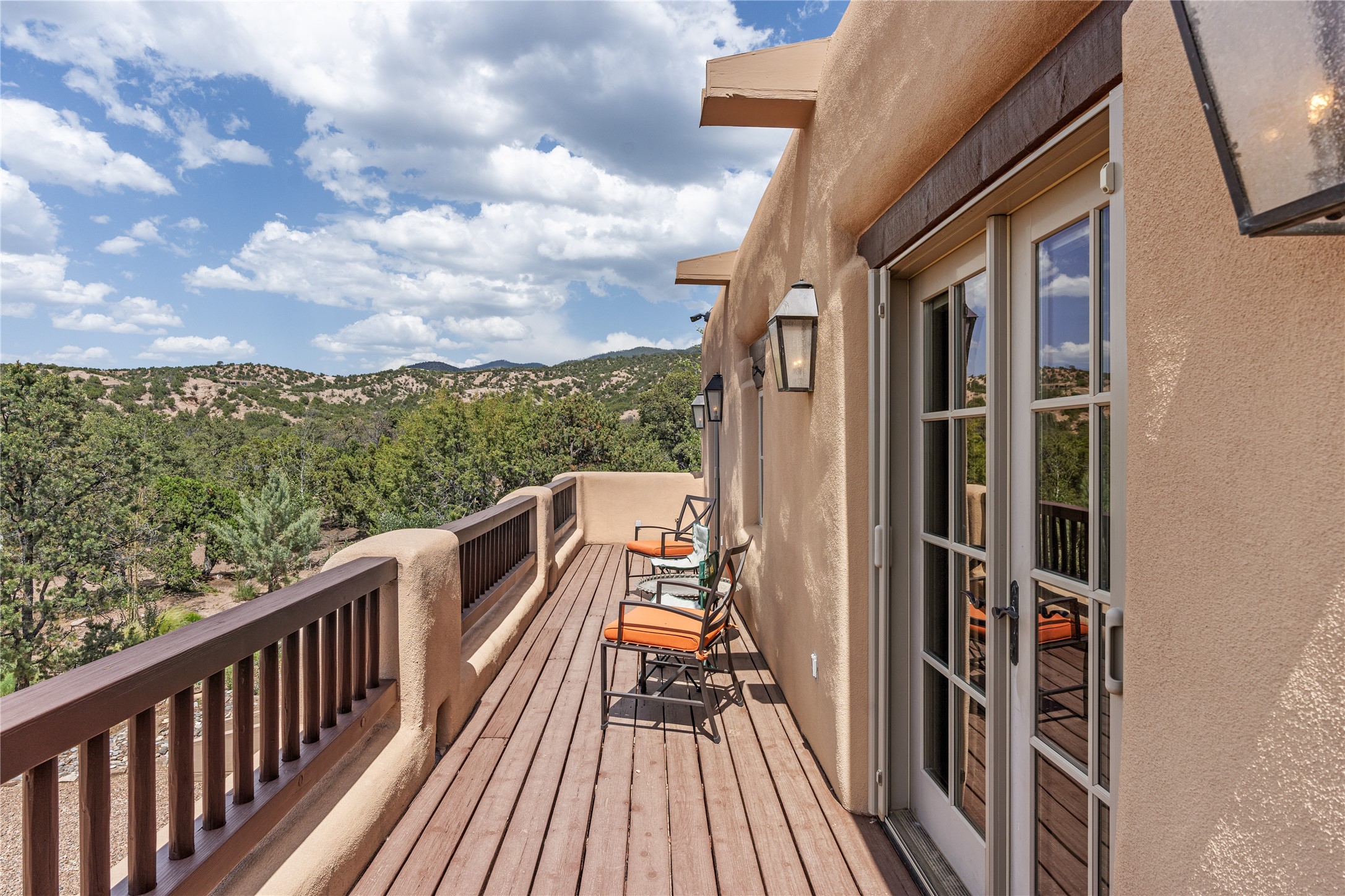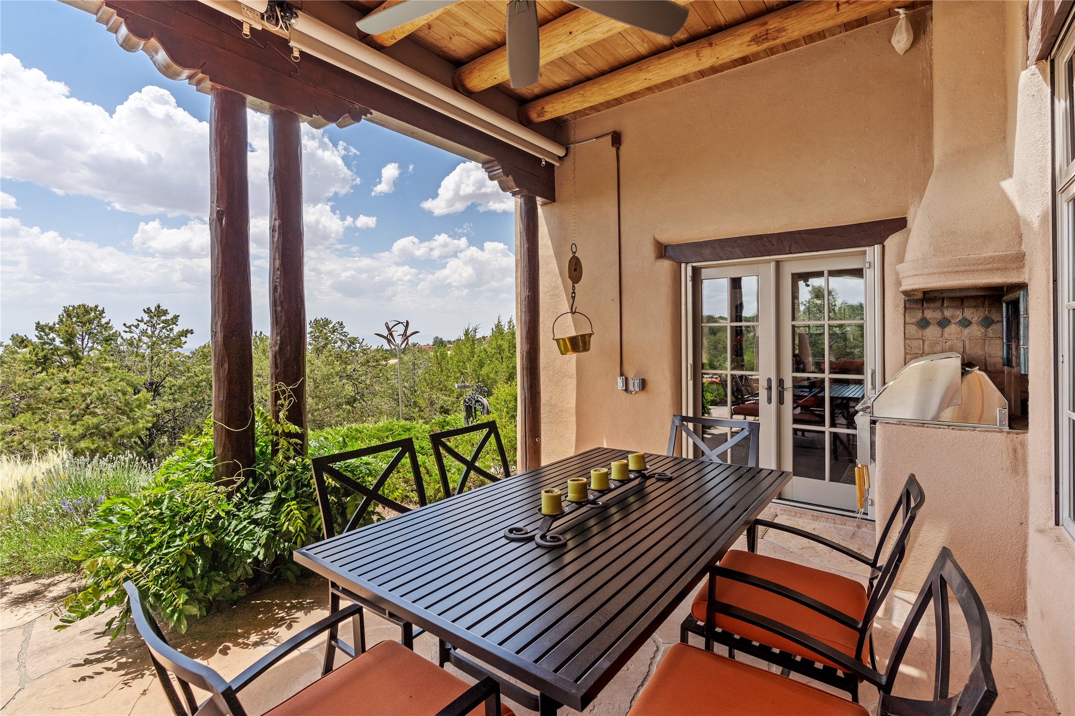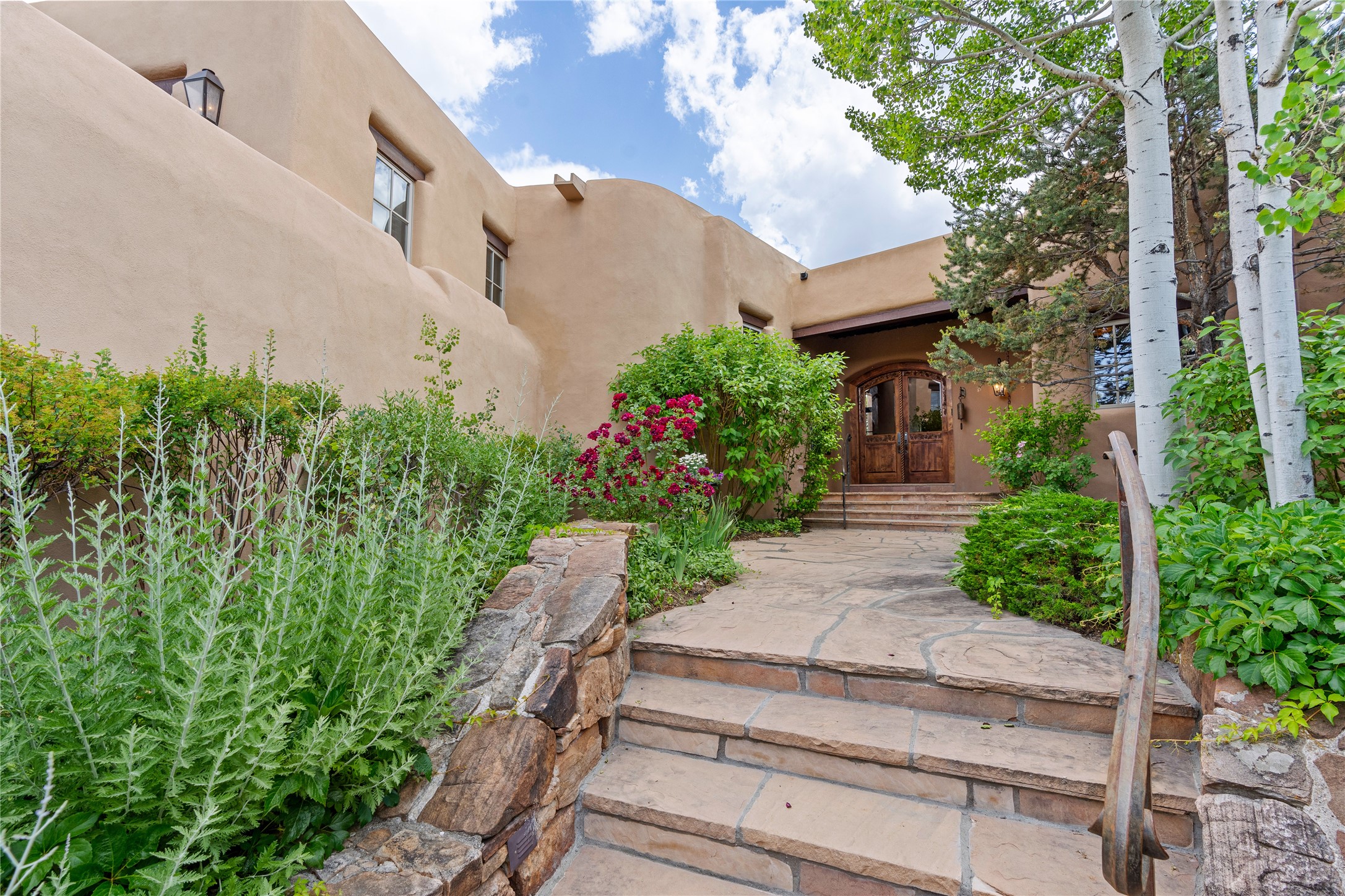 Welcome to a stunning Tesuque area compound in the prestigious gated Los Caminitos subdivision. On over 5 acres with a private well, fantastic Jemez and sunset views from main house built by Sharon Woods in 95'. The kitchen is stunning with doors to the portal with outdoor fireplace. Elegant living/dinning room surrounded on three sides by windows with upper end metal shades. Primary bedroom includes fireplace and access to rear patio. Two guest bedrooms have their own private deck with views of the Sangres. 3 car garage. Separate guest house with bath, as well as a large studio apartment and spacious studio with large north windows and new modern bathroom. Several owner upgrades including new entrance gate and septic field, new drip irrigation and pantry. Community pool and racquet courts. Lavender, roses, aspens, lilacs crab apple and peonies. 15 minutes from the plaza, adjacent to the Four Seasons resort, close to Tesuque Village Market and the world renowned Santa Fe Opera. If privacy, security and the New Mexico landscape is what you are looking for, come see.