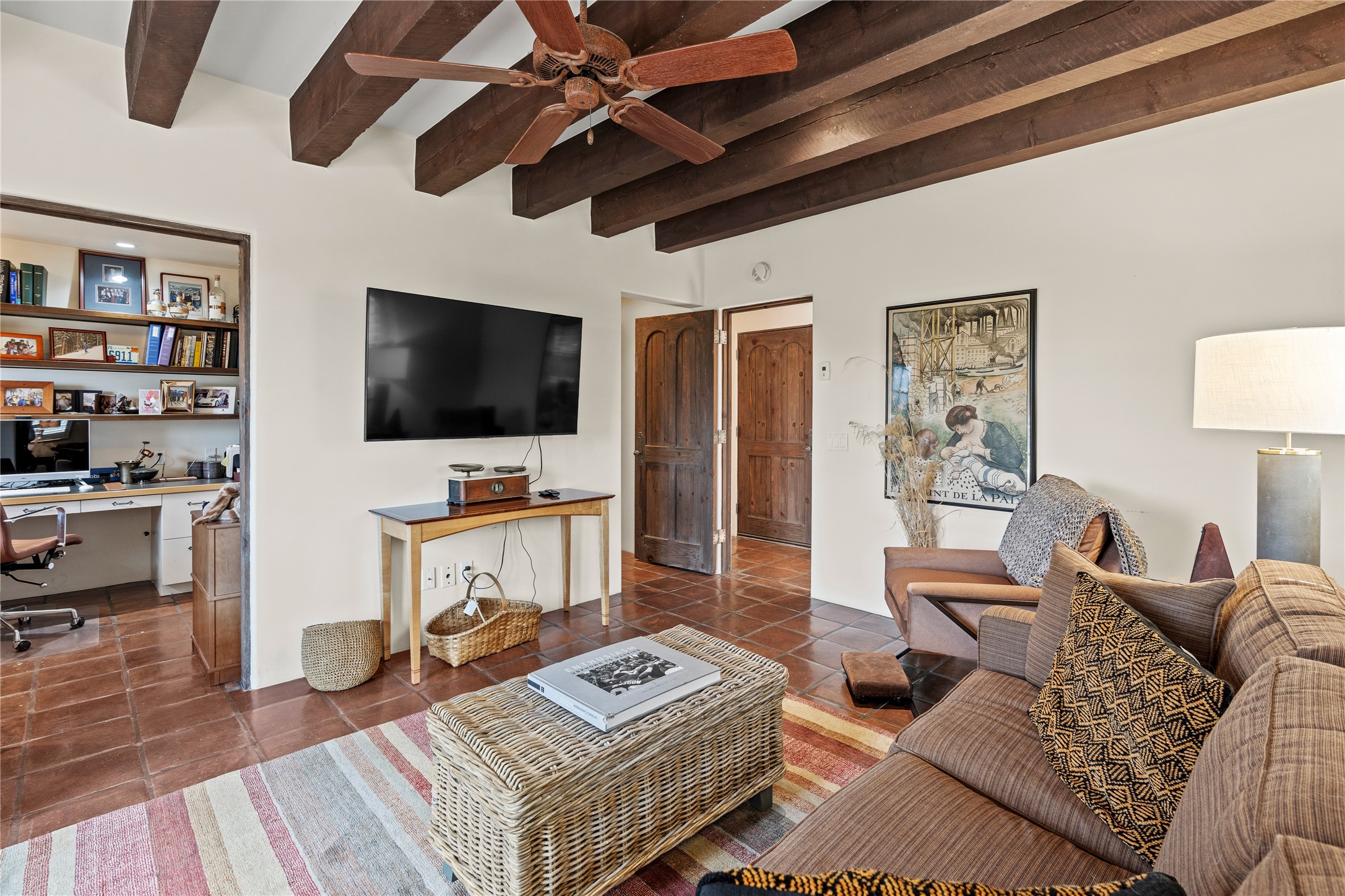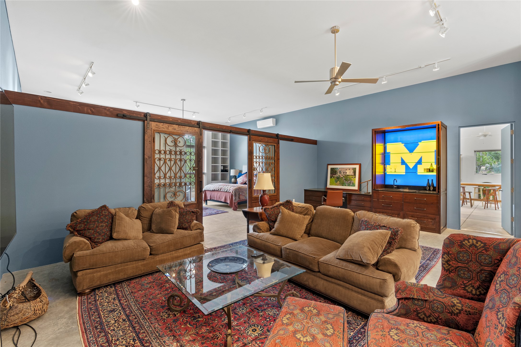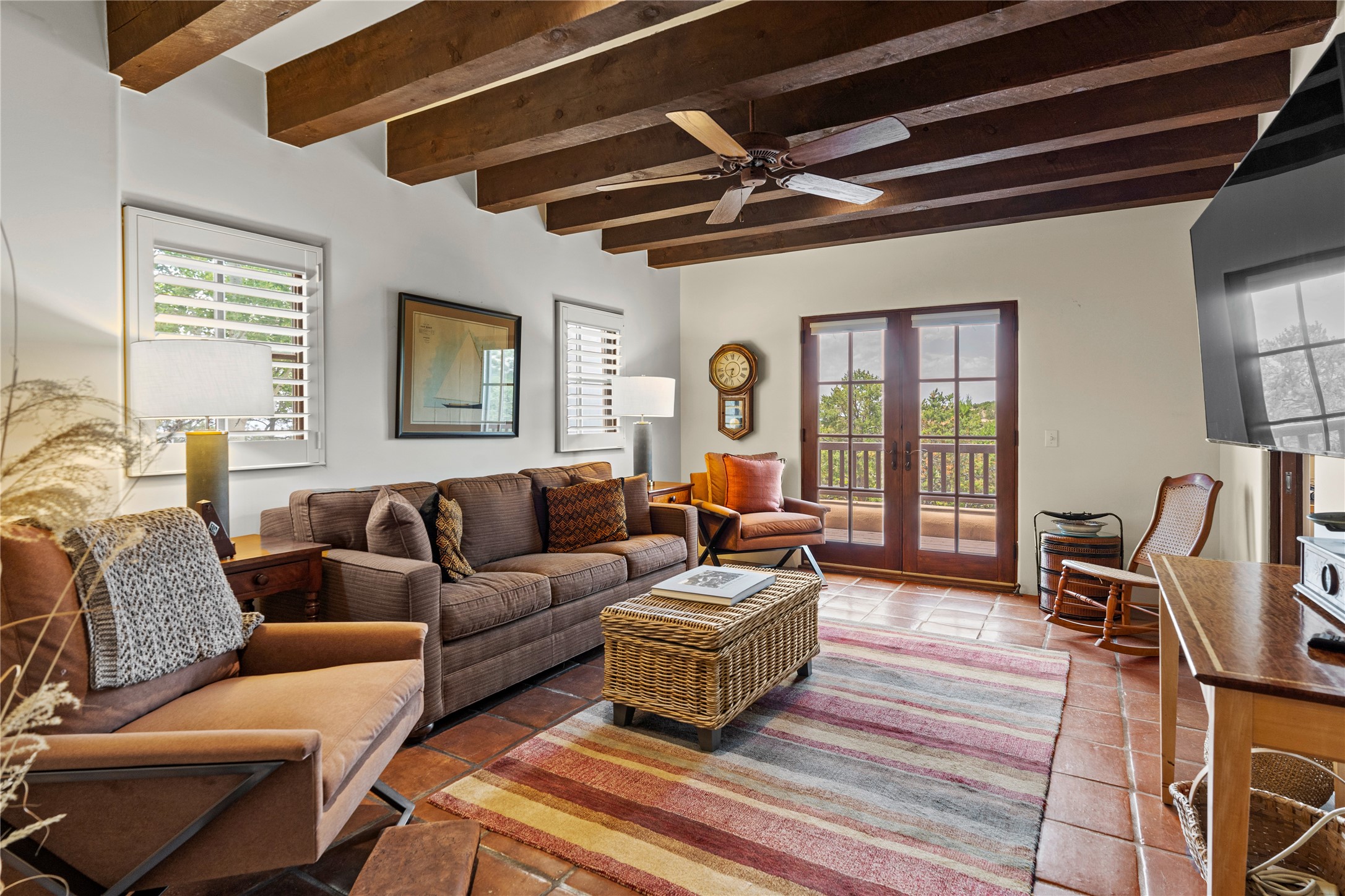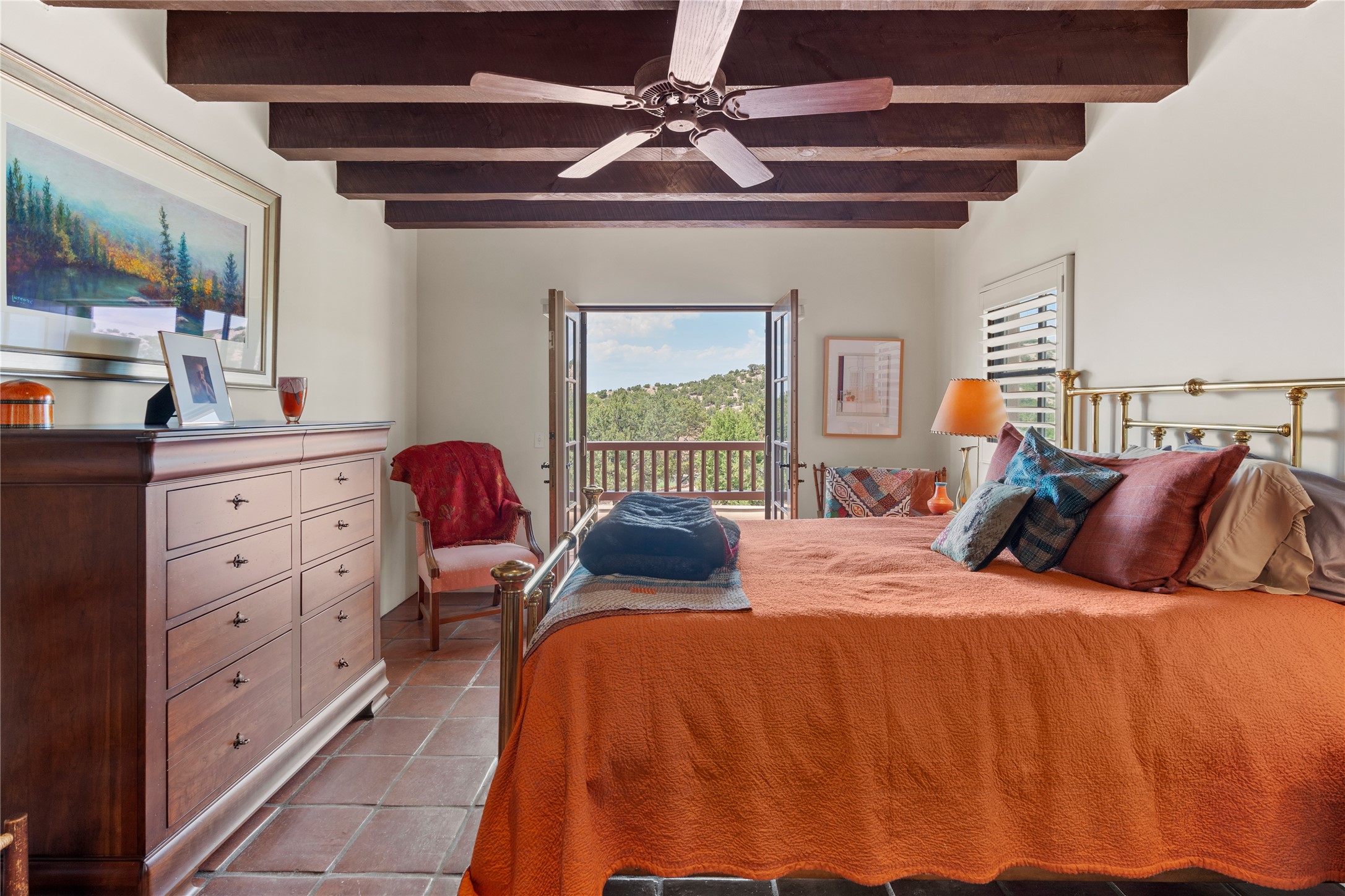 Welcome to a stunning Tesuque area compound in the prestigious gated Los Caminitos subdivision. On over 5 acres with a private well, fantastic Jemez and sunset views from main house built by Sharon Woods in 95'. The kitchen is stunning with doors to the portal with outdoor fireplace. Elegant living/dinning room surrounded on three sides by windows with upper end metal shades. Primary bedroom includes fireplace and access to rear patio. Two guest bedrooms have their own private deck with views of the Sangres. 3 car garage. Separate guest house with bath, as well as a large studio apartment and spacious studio with large north windows and new modern bathroom. Several owner upgrades including new entrance gate and septic field, new drip irrigation and pantry. Community pool and racquet courts. Lavender, roses, aspens, lilacs crab apple and peonies. 15 minutes from the plaza, adjacent to the Four Seasons resort, close to Tesuque Village Market and the world renowned Santa Fe Opera. If privacy, security and the New Mexico landscape is what you are looking for, come see.