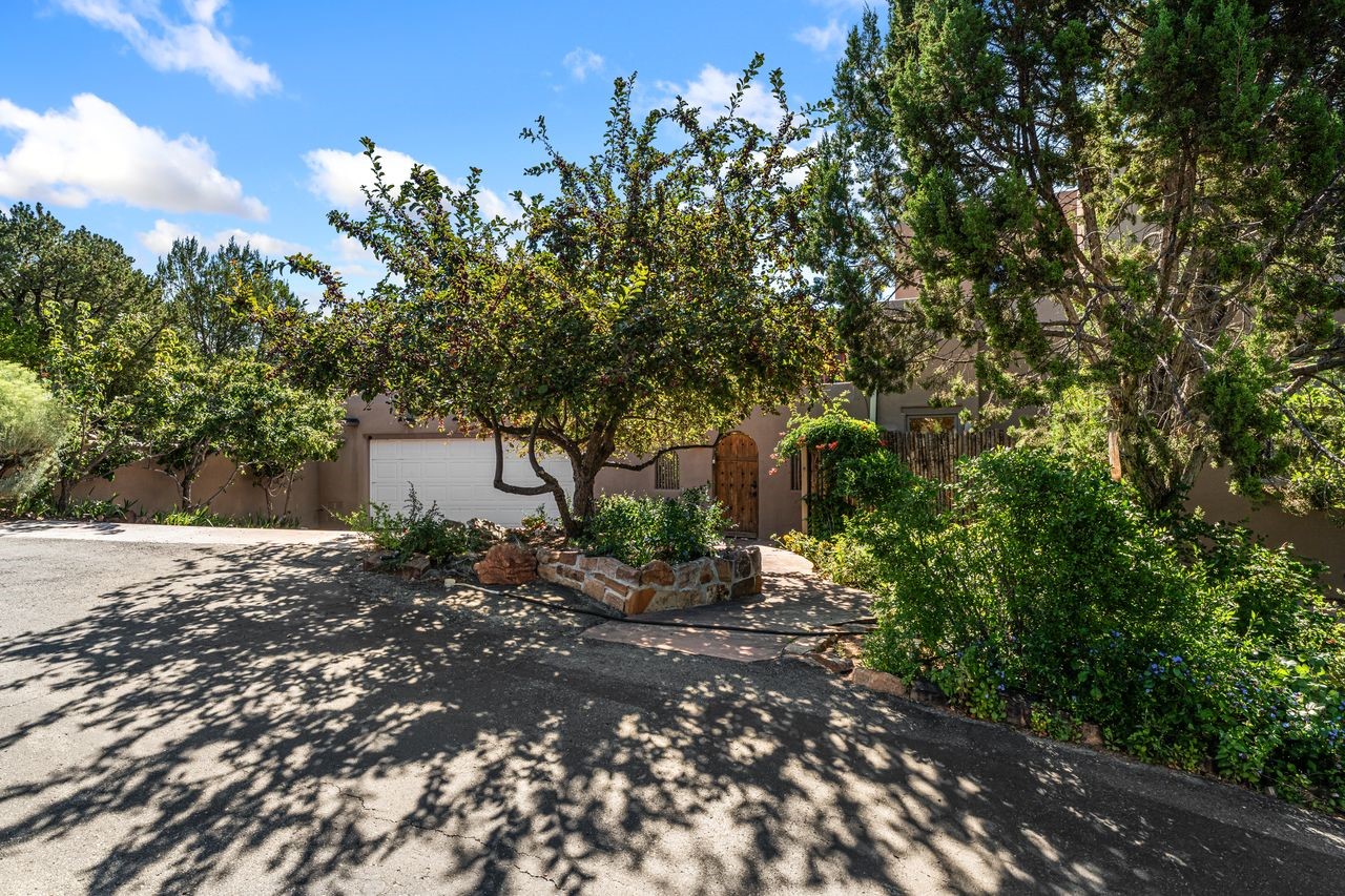 Beautifully built home overlooking the arroyo and with stellar views over downtown Santa Fe to the south! The home has a lovely private courtyard with water feature greeting you as you step in. All the living areas on the first floor: Living room, dining room, kitchen, full bathroom, and laundry room. the back of the home has a full suite that is currently being used as a working artist studio. This space is easily converted and designed to be a one-bedroom suite on the first floor. Upstairs is the primary suite with two walk-in closets and primary bath. There are two more bedrooms with a full bath. The two-car garage is off the courtyard. There are two 2nd story balconies, and lovely portal off the living room, and wonderful landscaping around the home. Bonus** full unfinished basement! Four off-street parking spots available for your guests. Please make sure you make plans to see this lovely home is Seirra Del Norte!
