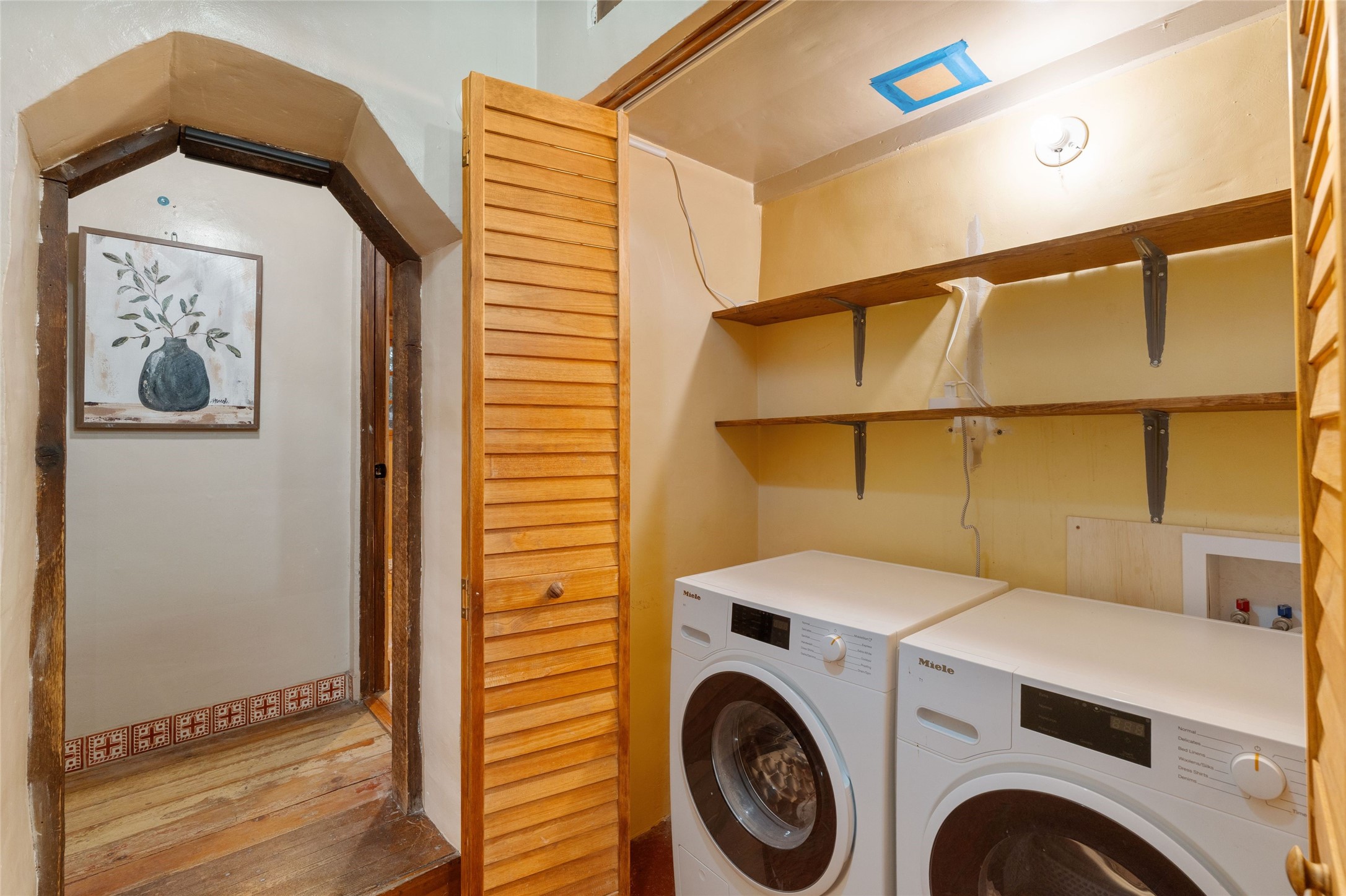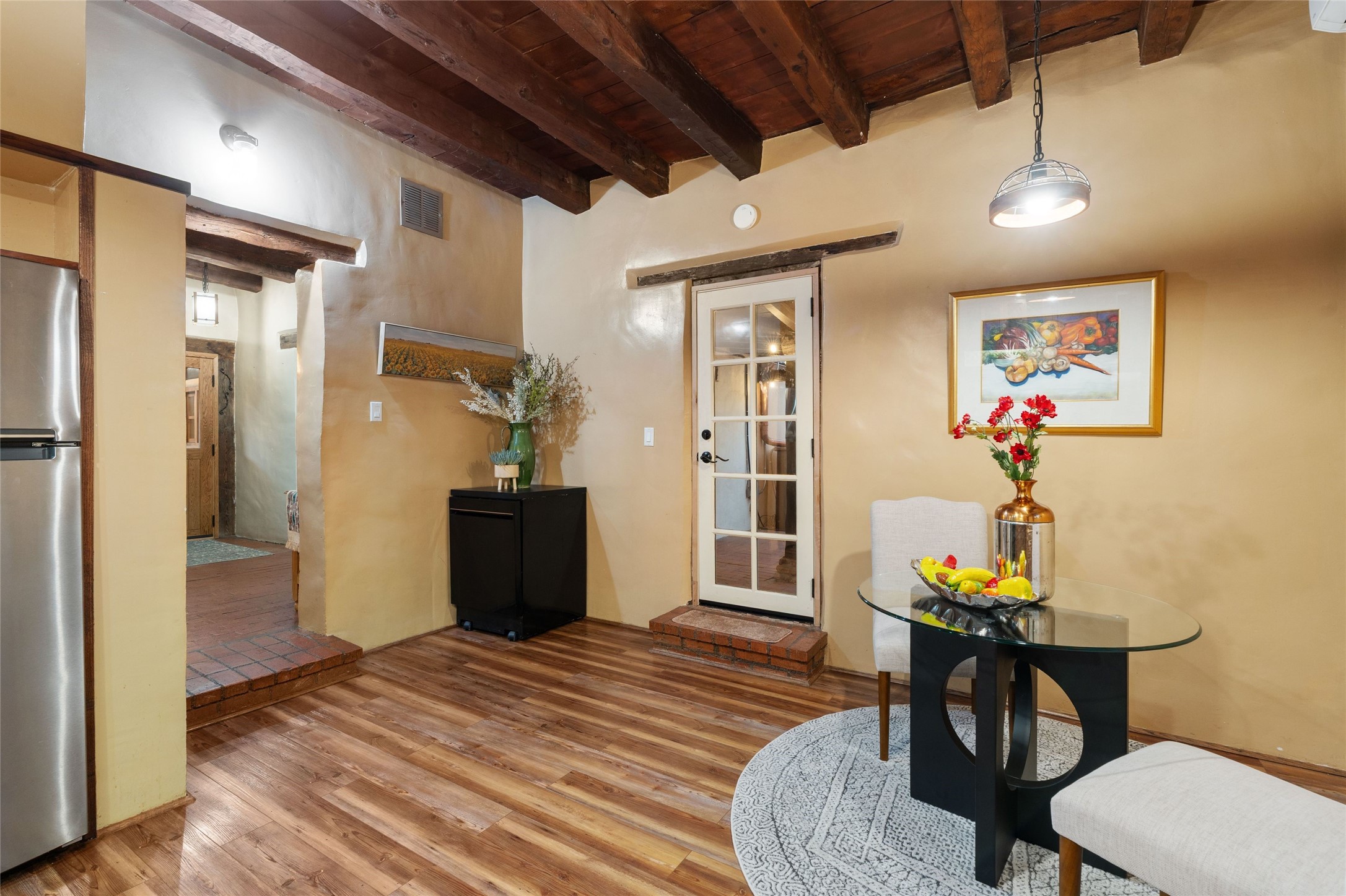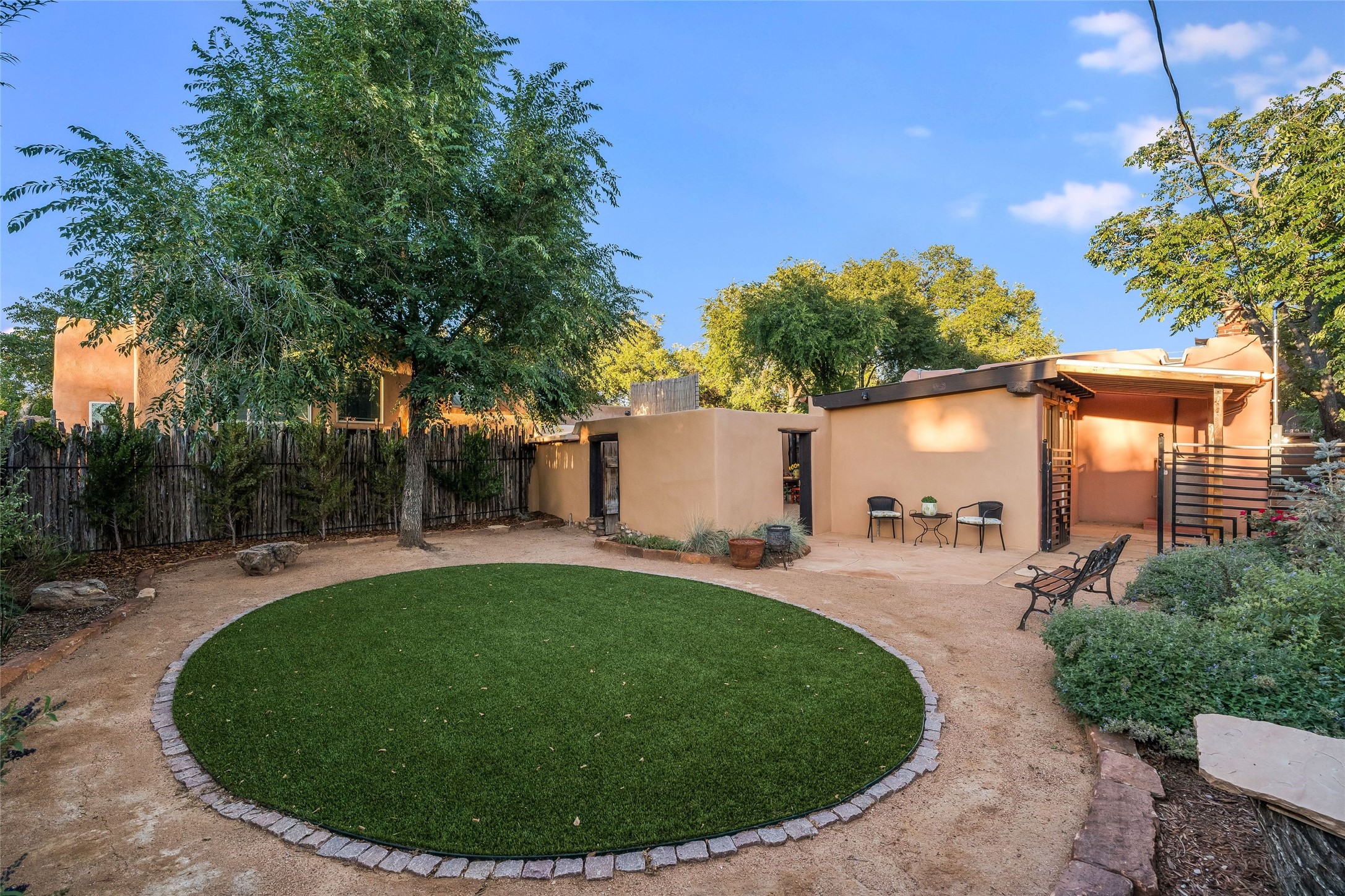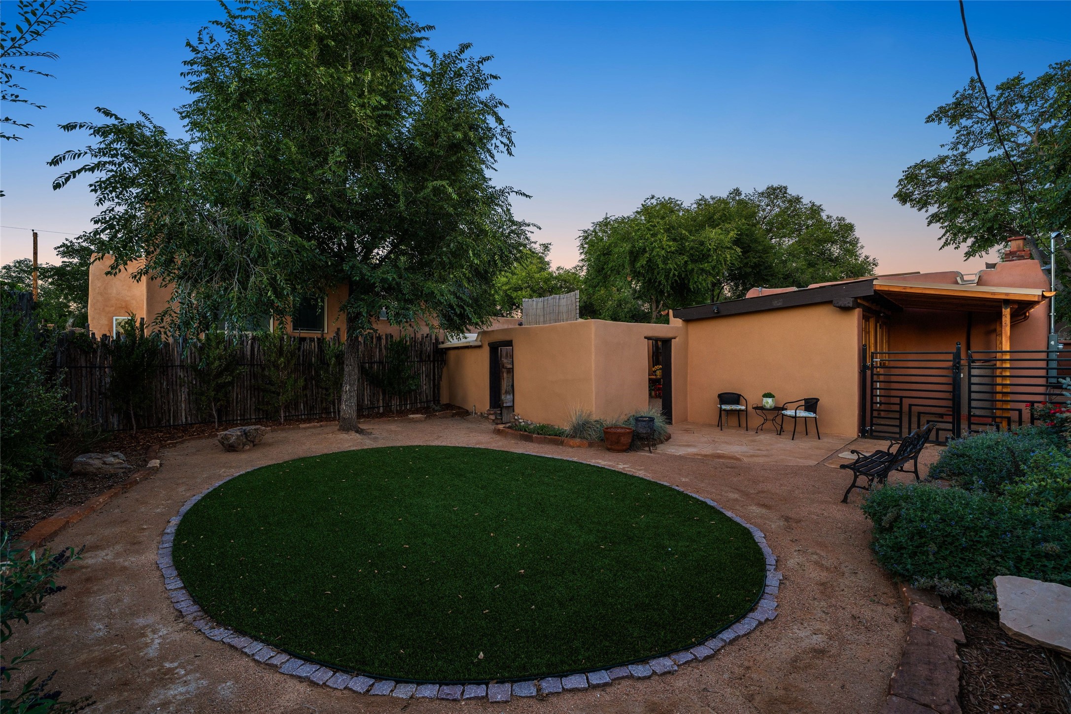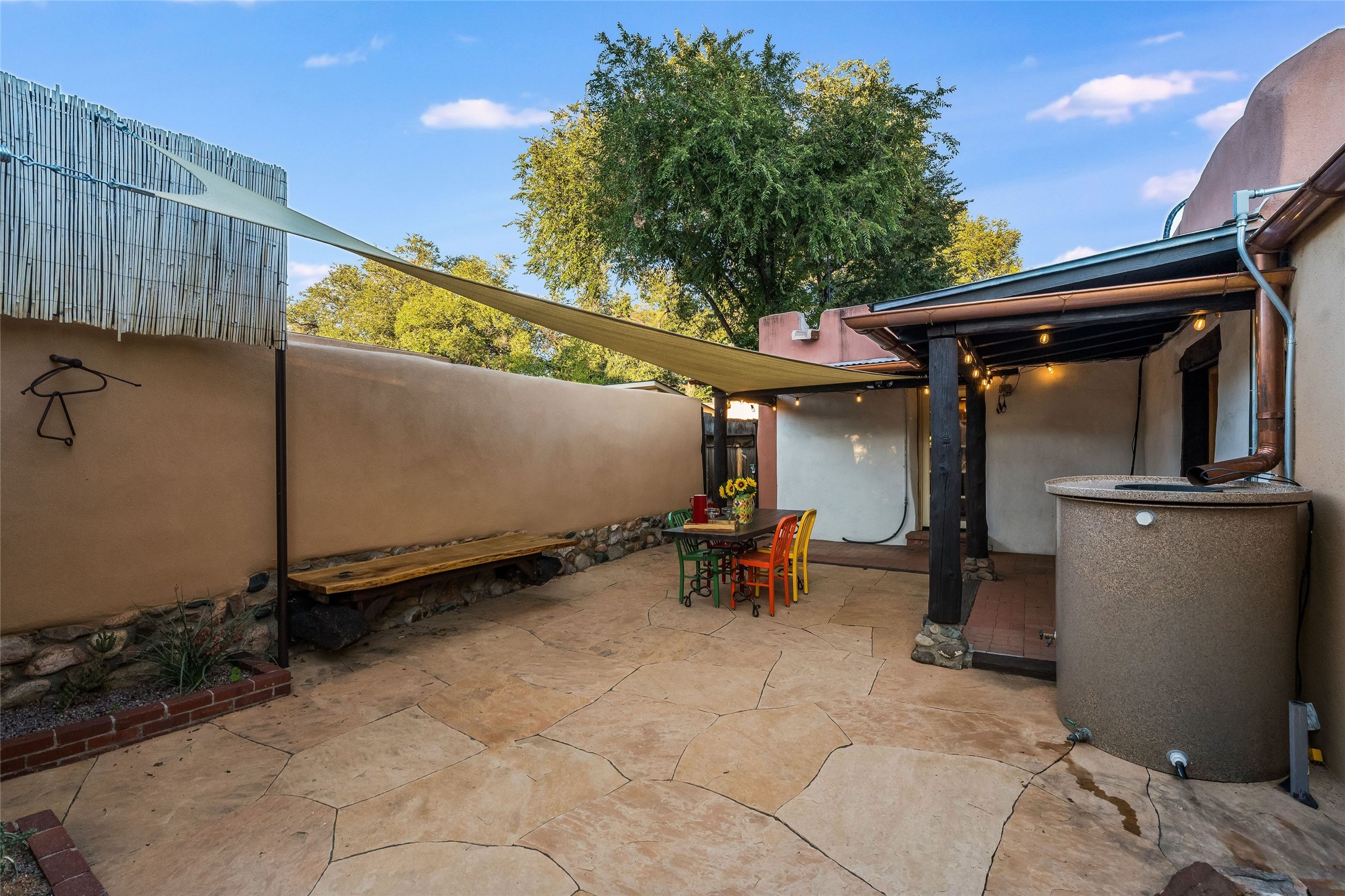 Just a few blocks from the historic Santa Fe Plaza, 534 1/2 W Alameda is quietly nestled in the heart of the West Guadalupe Historic Neighborhood, one of the city's most treasured and walkable enclaves.Beyond a modest gate, this unique property includes a classic adobe home surrounded by spacious exteriors and verdant landscaping. Inside, original flagstone floors and smooth plaster walls ground the space, while hand-hewn vigas and reclaimed barn wood headers--sourced from an 1800s Washington barn--add character and story. Custom wood French doors anchor the living room, and solar tubes bring additional natural light into the bedrooms.The 3-bedroom, 2-bath layout flows to three distinct outdoor living areas with newly-installed flagstone hardscaping, lush plantings, and an automated drip irrigation system. The fully fenced yard is ideal for pets, with two dog doors for added convenience. A freestanding, large storage shed has been updated with new roof, electricity and dormer window, ready for conversion to an office. A courtyard sail shade and privacy fencing round out the outdoor upgrades.Nearly every major system has been thoughtfully updated: a new 15-year transferable-warranty roof (2024) with updated canales, 10 new custom wood windows, upgraded portals, new copper gutters along the inner and outer courtyards, new stucco painting on all external walls, upgraded electrical and plumbing, a new kitchen door, a new solid oak front door, and four ductless mini-splits for efficient heating and cooling. Four Tijeras rain barrels support sustainable living.Although you're minutes from art galleries, restaurants, the river path, and the hum of downtown, this home is also a quiet, peaceful sanctuary. Here, life unfolds slowly. Beautifully. Just as it should.