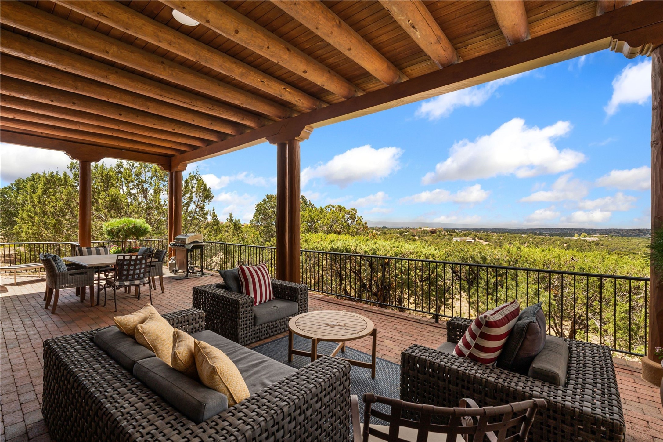 Tucked high up in Las Campanas on a generous 2.4-acre lot, this gorgeous Kim Dressel pueblo-style home is all about views, vibes, and space to breathe. From the moment you stroll through the professionally landscaped courtyard, you'll feel the magic--unobstructed vistas of the Jemez Mountains and sunsets that'll make you stop mid-sentence just to stare. Inside, it's a custom masterpiece. Think flagstone floors, hand-hewn beams, and those classic vigas that give it that warm, earthy soul. The ceilings and walls? Absolutely stunning, with textures and treatments that make every room feel like a work of art. Natural light pours in through expansive skylights, bouncing off the hand-troweled plaster walls and stone floors, creating that signature New Mexican glow. The chef's kitchen is a showstopper--top-tier appliances, loads of granite counter space, and a butler's pantry that's ready for your next dinner party or midnight snack run. And if you've got guests (or just want a little extra privacy), the attached casita is a sweet bonus: separate entrance, kitchenette, and all the cozy charm. You'll find two primary suites plus two additional bedroom suites--one even has its own mini kitchen and sitting room, perfect for long-term guests or multi-gen living. Whether you're hosting a formal gathering or kicking back in the informal living spaces, this home flows effortlessly. Over 1,000 square feet of private outdoor space to soak in the views, sip your morning coffee, or toast the sunset. With its perch on one of the highest lots in the area, you'll enjoy peace, privacy, and those jaw-dropping Northwest views over untouched land. This isn't just a house--it's a lifestyle. Come see it, feel it, fall in love.
