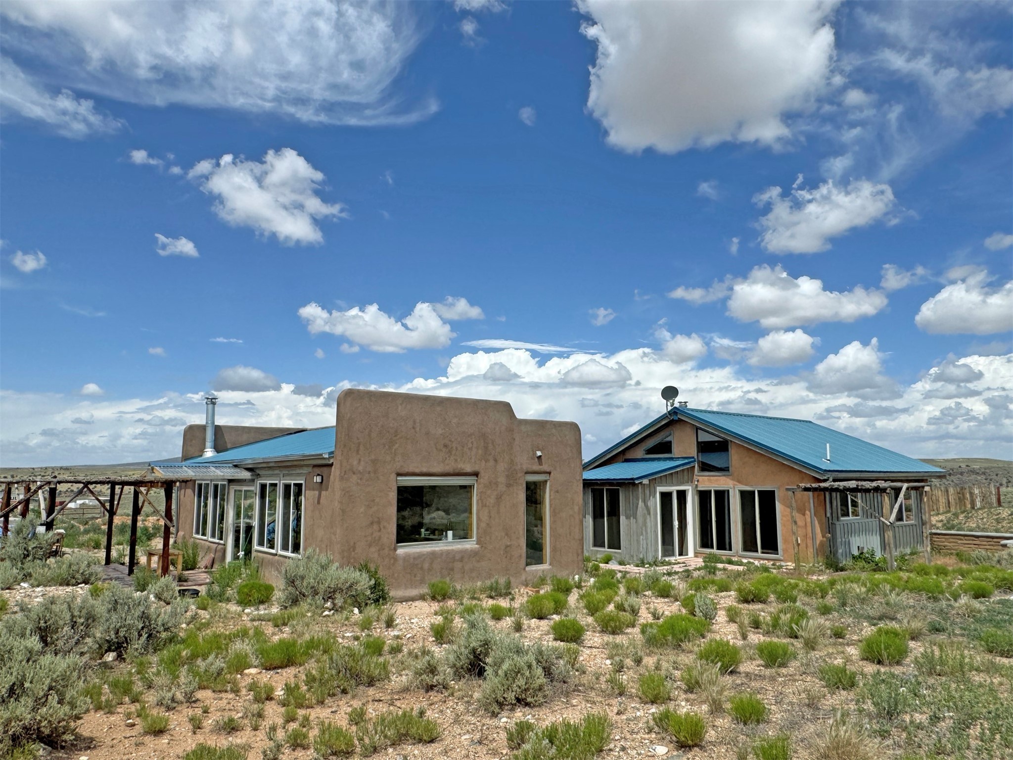Here's a flexible property featuring two 700 square feet casitas on 2.53 unrestricted acres! Main house constructed in 2017 has entrymud room and open living/dining/kitchen areas with lots of windows framing wrap around views of sunset, Taos Mountain and Sangre deCristo Mountains. Painted concrete floors with in floor radiant heat. Pitched tongue and groove ceiling, ceiling fan and woodstovemaintain comfortable temperatures year round. Easily accessible, finished loft with cabinets provides ample storage. Cook's kitchen hasgranite tile countertops, is wired for under counter lighting, and has a propane gas range and fridge. Comfortable bedroom with T&G andbeams ceiling features a spacious ensuite bathroom with cast iron tub, personal shower and ample linen storage. Mechanical/utility roomincludes a washer which conveys with sale and storage shelving. On the north side is a sweet exposed adobe wall courtyard containinga paver stone patio and latilla ramada, perfect for dining al fresco and star gazing. Pitched Propanel roof delivers water catchment for a1700 gallon buried cistern in lieu of conventional well. Seller typically orders supplemental water 1-2 times a year for a cost ofapproximately $230 each delivery of 1700 gallons. Exterior siding is a combination of stucco and Cape Cod wood siding. Guest houseis 714 square feet of flexible space built in 2023 featuring kitchenette with fridge, full bath, wood stove, exposed adobes, and vaultedT&G ceiling with beams and columns. Comfortable full bathroom with linen storage, tub and shower. This structure is heated and cooledwith a heat pump mini split system. This space could serve as a studio/workshop, studio apartment rental, or additional property livingspace. Painted cement floors and wrap around windows with mountain views. Entertain outside with a latilla ramada over paver stonepatio. Propanel metal shed roof is plumbed for cistern catchment. Landscape berms cradle both structures, adding privacy and providinga canvass for gardeners. Taosnet broadband Internet in both houses (Kit Carson fiber optic in Tune Drive); cell service on site. Locatedon a rise with stellar 360 degree views and easy walk to the Rio Grande Gorge and John Dunn bridge, Mamby/Stagecoach and BlackRock springs. GPS: 36.52508202679919, -05.70209218650817. Approximately one acre around the structures is fully fence with a farmgate at the entrance. Wood board fencing provides additional privacy. Circle drive and ample guest parking. Property could besubdivided into three separate parcels. Electric transformer has been installed in lower part of property for future development. Allconstruction county permitted with C/Os in Associated Documents. Seller has left firewood, Colorado red flagstone, adobe bricks andnew generator in the original box for the buyer. Approximately twenty minutes from Taos Plaza and half an hour from Taos Ski Valley.Only half a mile off the paved road. This quiet, peaceful property could be developed into three residential properties, a family compound, investment rentals, or horse property. So many options for this creative, energy efficient property built with love!