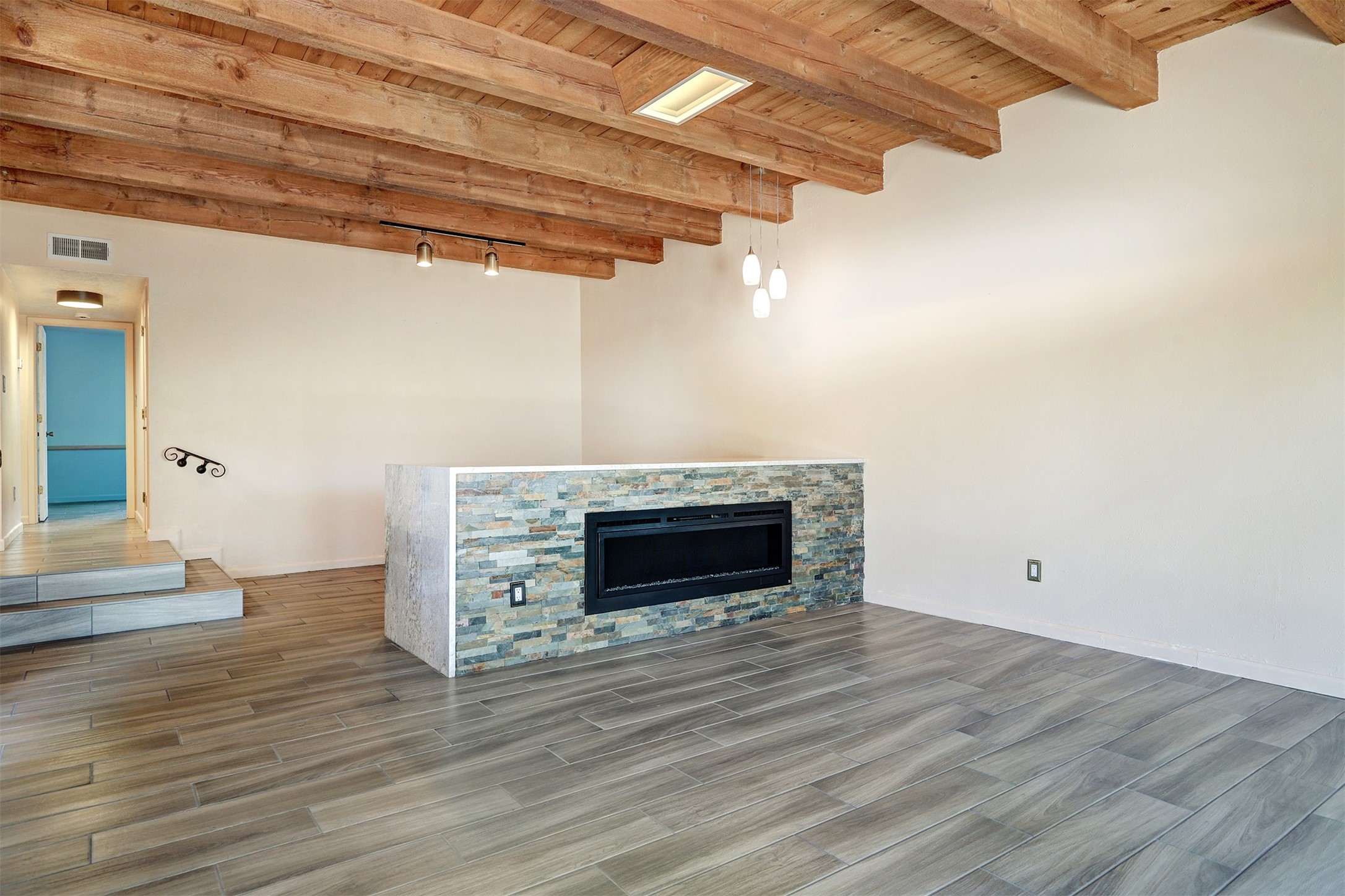 This updated 2-bedroom, 2-bathroom ground-floor end-unit condo on Santa Fe's Northside offers a comfortable blend of privacy and convenience. The location is hard to beat, just minutes to the Plaza, the Opera, shopping, and restaurants, with easy access to Los Alamos and only 17 miles to the ski basin. The living room and kitchen open to a generous wraparound front patio with unobstructed views of the Sangre de Cristo mountains, a perfect spot for morning coffee, dining outdoors, or watching the evening sky. Inside, the light-filled floor plan features tongue-and-groove ceilings with exposed beams and new tile flooring throughout. The kitchen is outfitted with custom cabinetry and newer washer and dryer. Both bedrooms are set at the rear of the home. The primary suite opens to a private walled courtyard with Anderson windows and an Anderson new entry door, adding to the updates. Parking is convenient with a dedicated space behind the condo, as well as an oversized garage below that offers excellent storage. The express bus to LANL is nearby. Whether you're looking for a full-time residence, a second home, or a rental property, this Northside condo is a wonderful place to enjoy Santa Fe living close to everything Santa Fe has to offer.