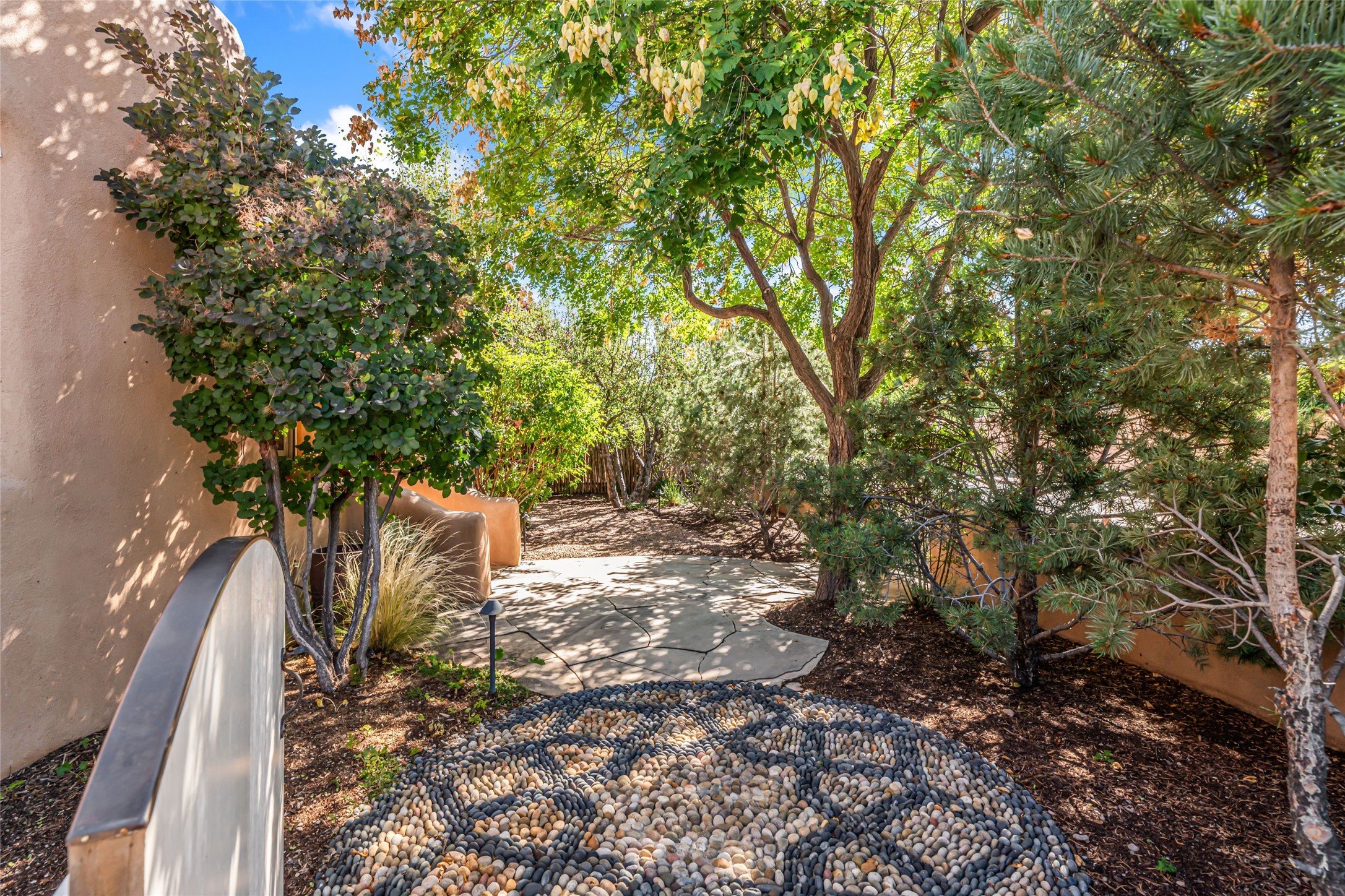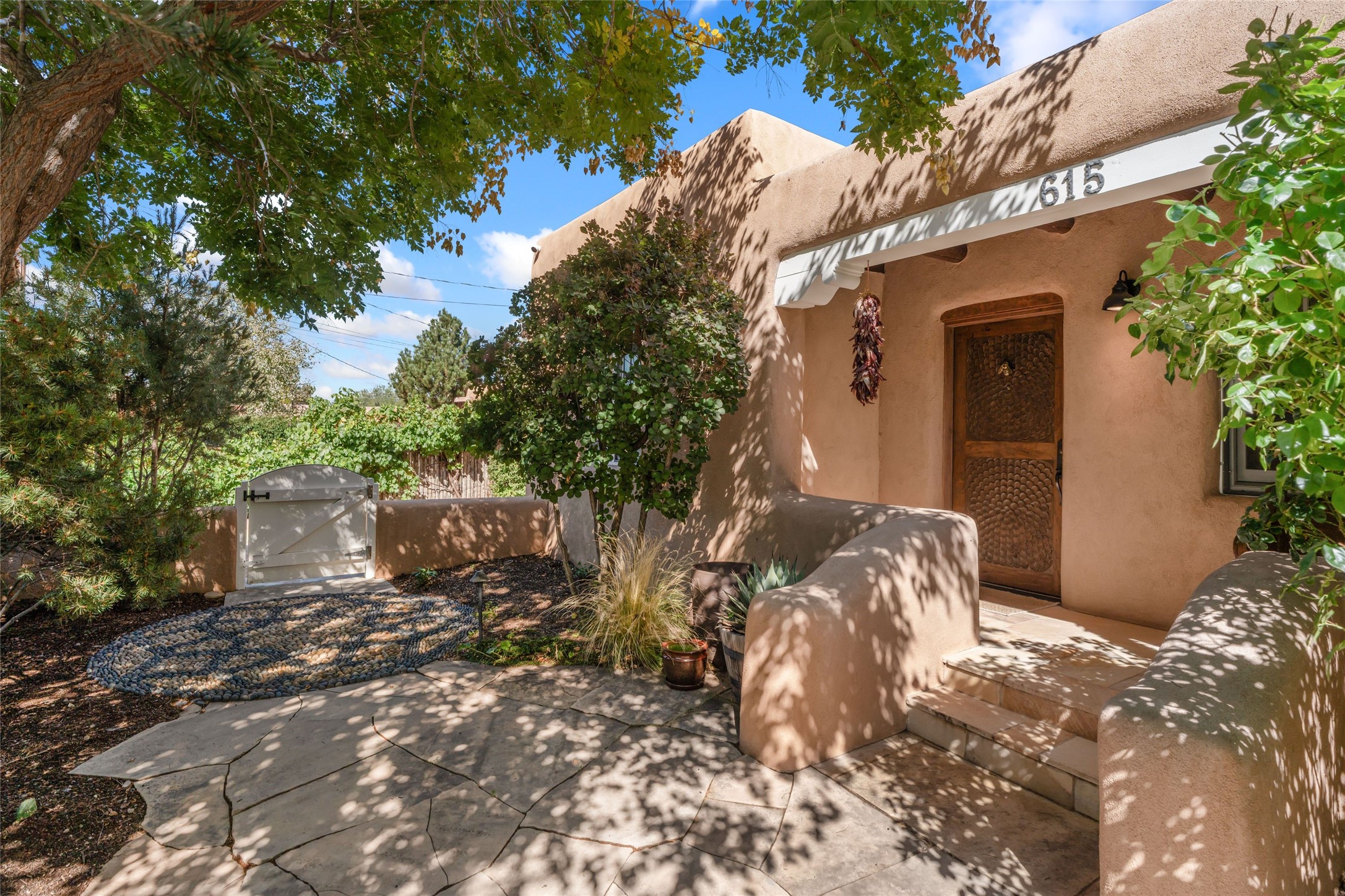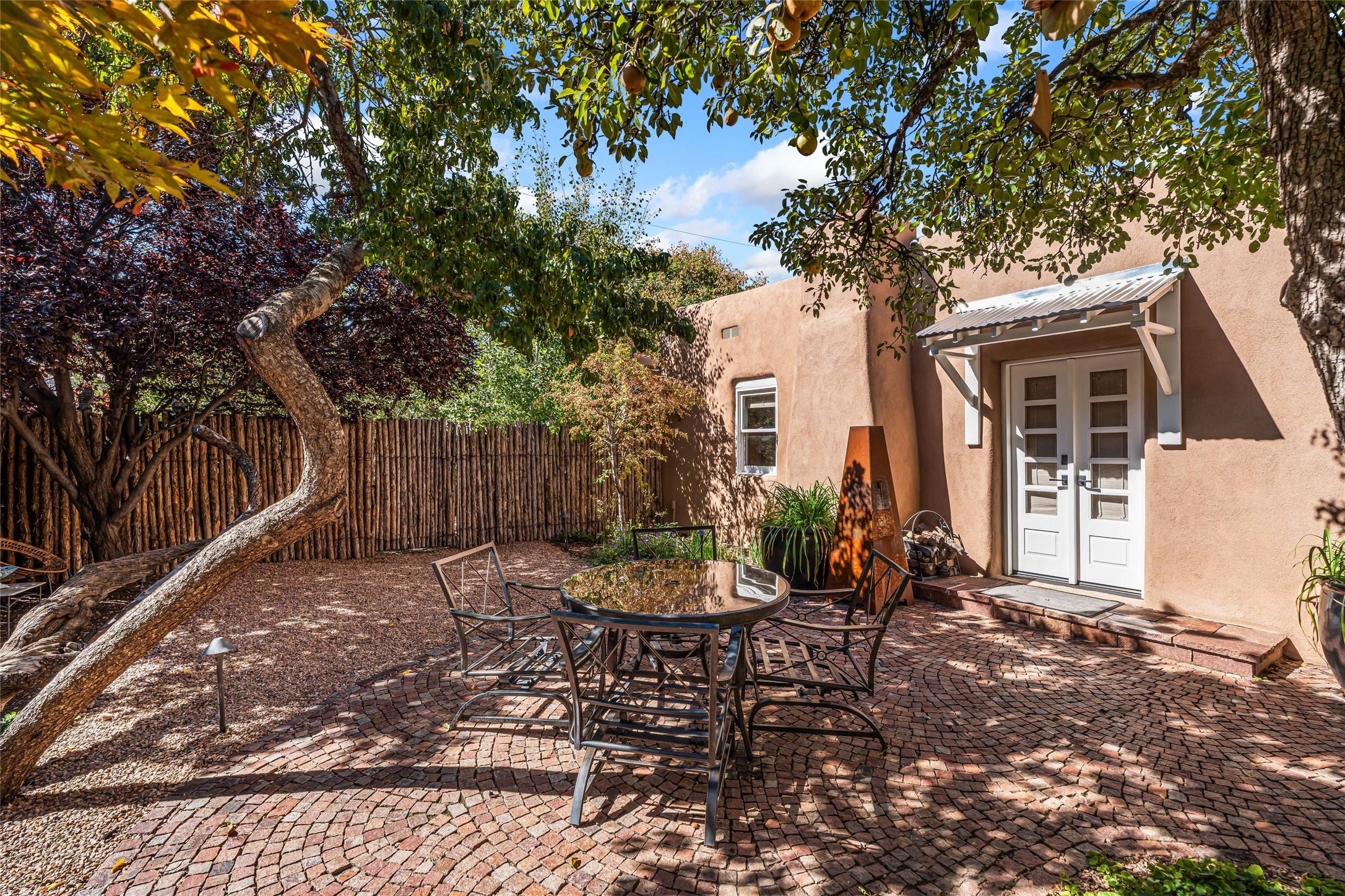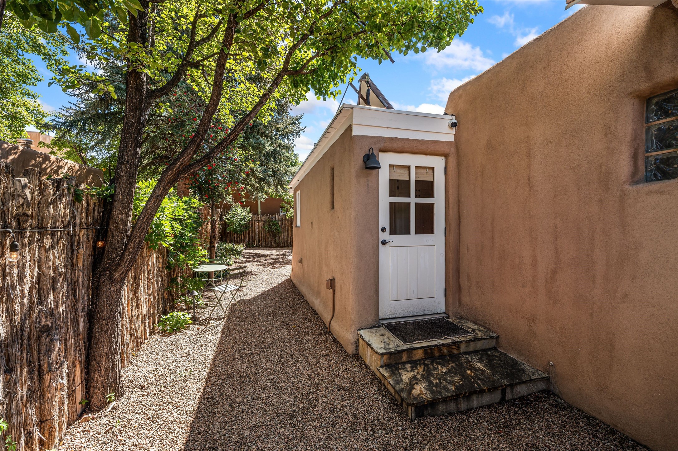 A rare Santa Fe gem - this adobe sanctuary on an oversized lot offers seamless indoor-outdoor living with a fully fenced wraparound yard. Stacked stone walls, wooden gates, a grapevine-covered arbor, and fragrant landscaped gardens create a serene setting where every window frames natural beauty. Inside, renovations preserve authentic adobe character while introducing a fresh, contemporary feel. Skylights brighten the kitchen, and the spacious great room with French doors to the courtyard is ideal for entertaining. The floor plan includes two bedrooms, a full bath, powder room, large laundry room, and a flexible study or dressing room off the primary suite. A private downstairs space provides additional storage or the opportunity for a refinished retreat. Nestled at the heart of the Railyard District, just blocks from Joseph's Pub, Mille, Dolina, Paloma, and minutes to the Plaza, this calming home combines timeless Santa Fe charm with modern updates and unbeatable location.