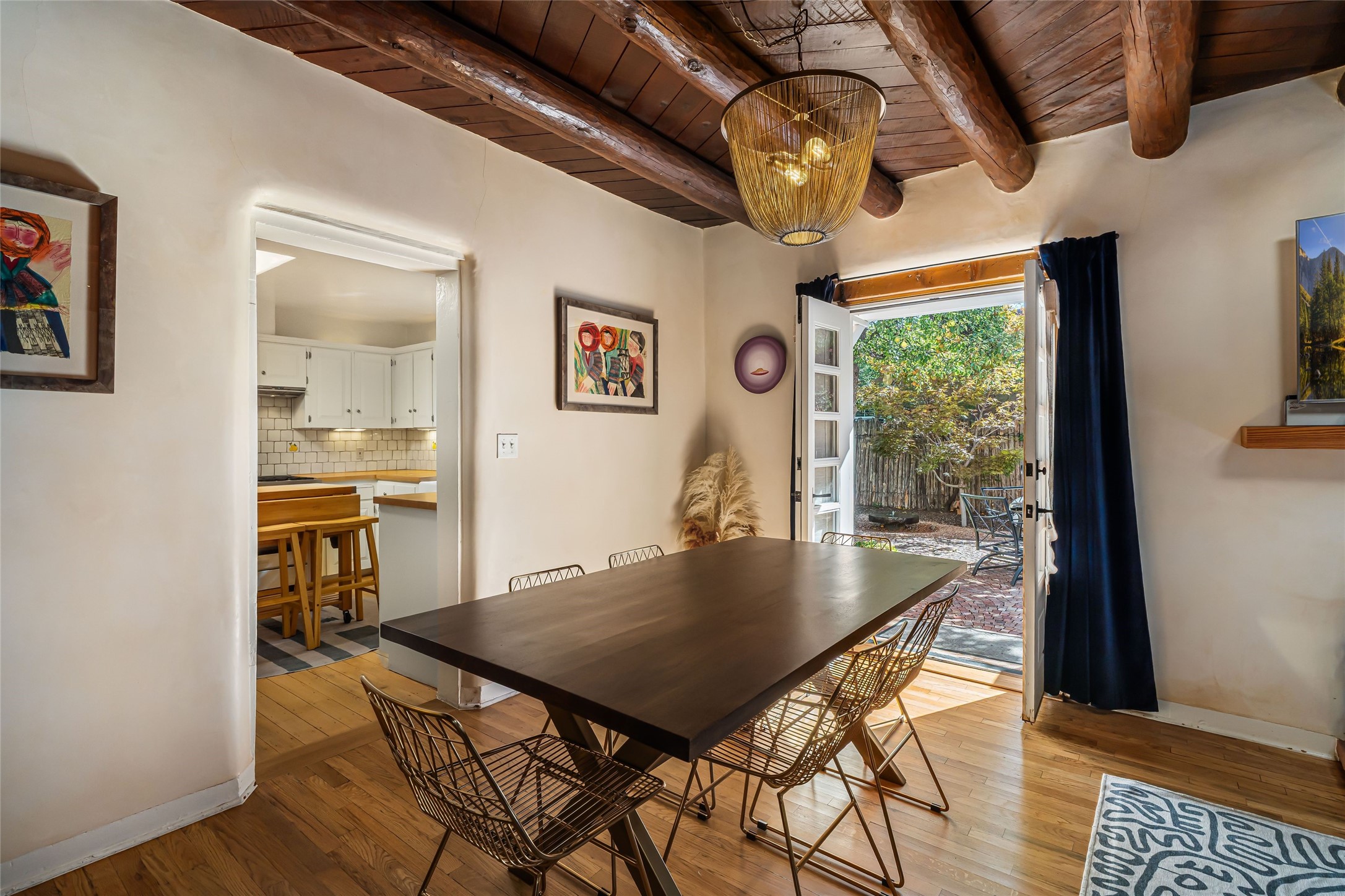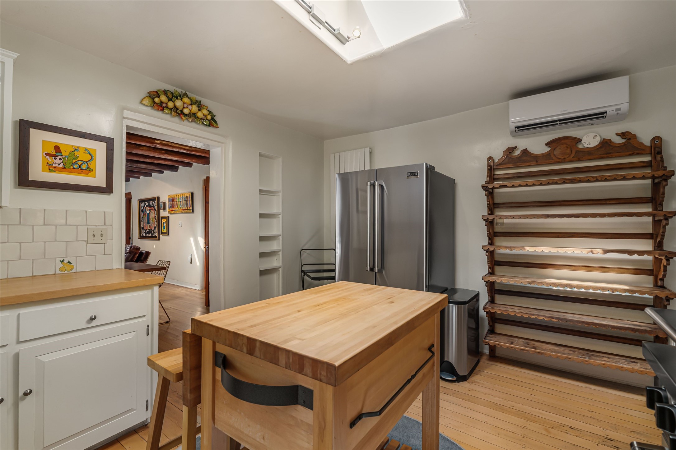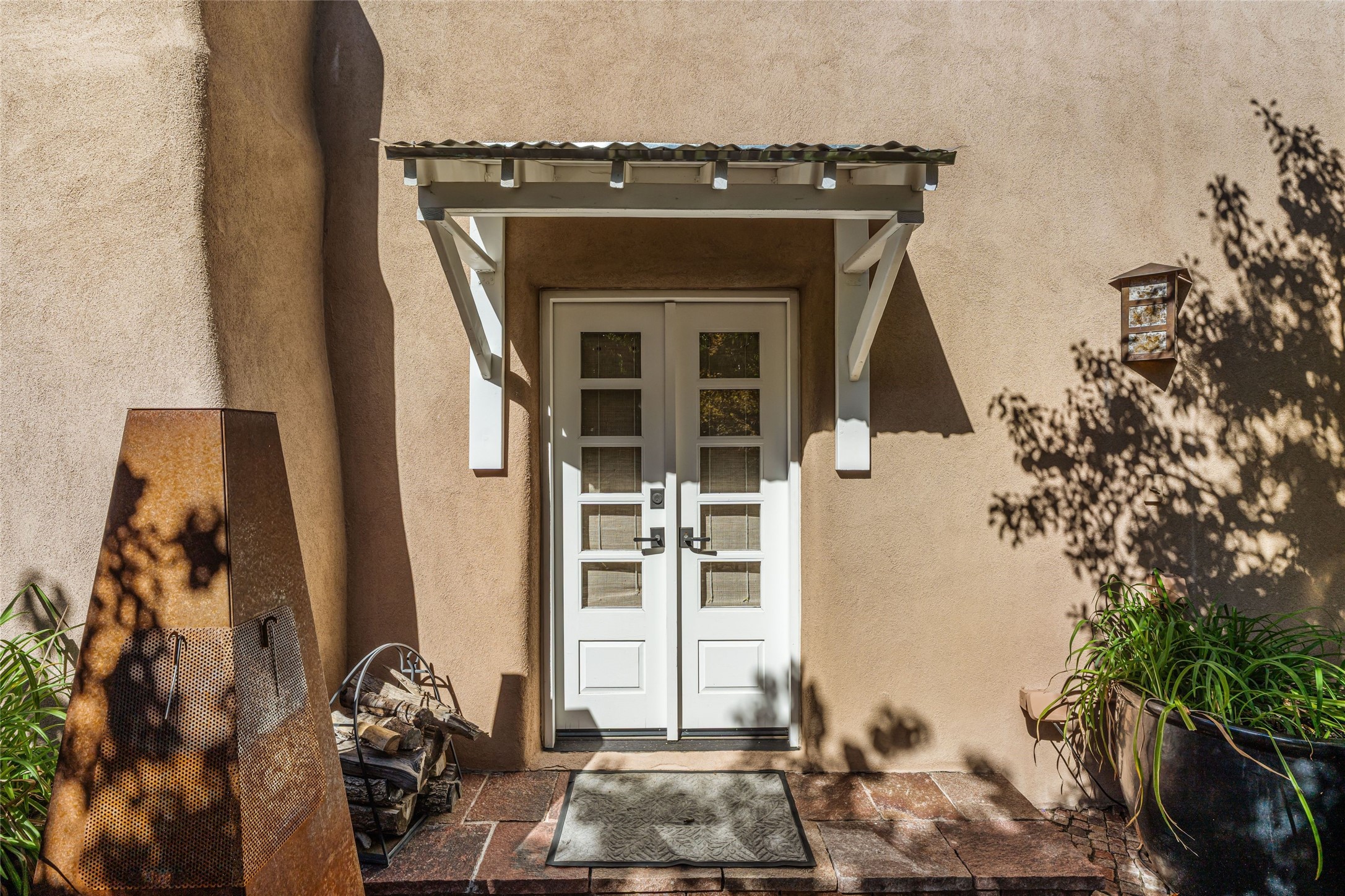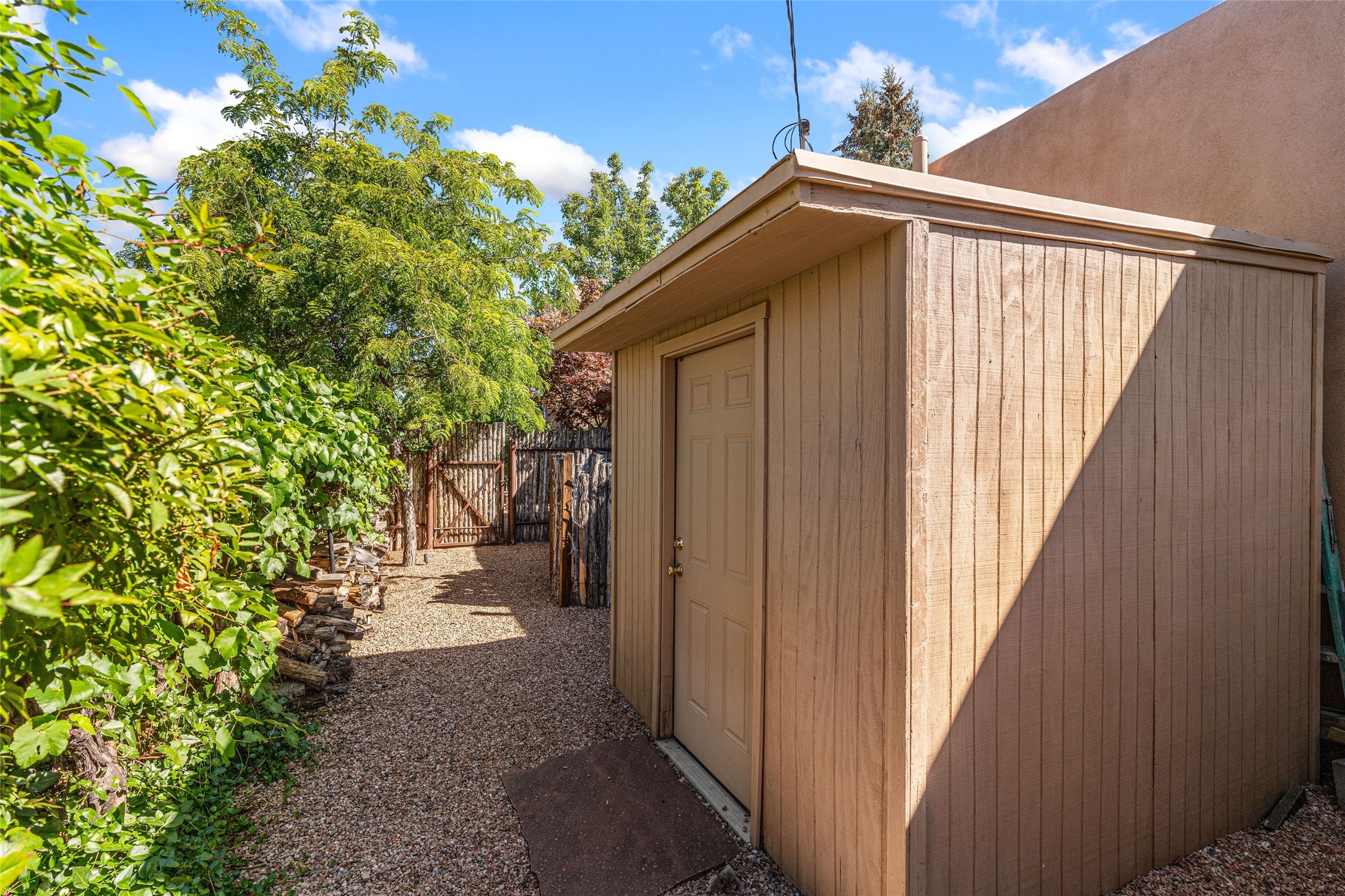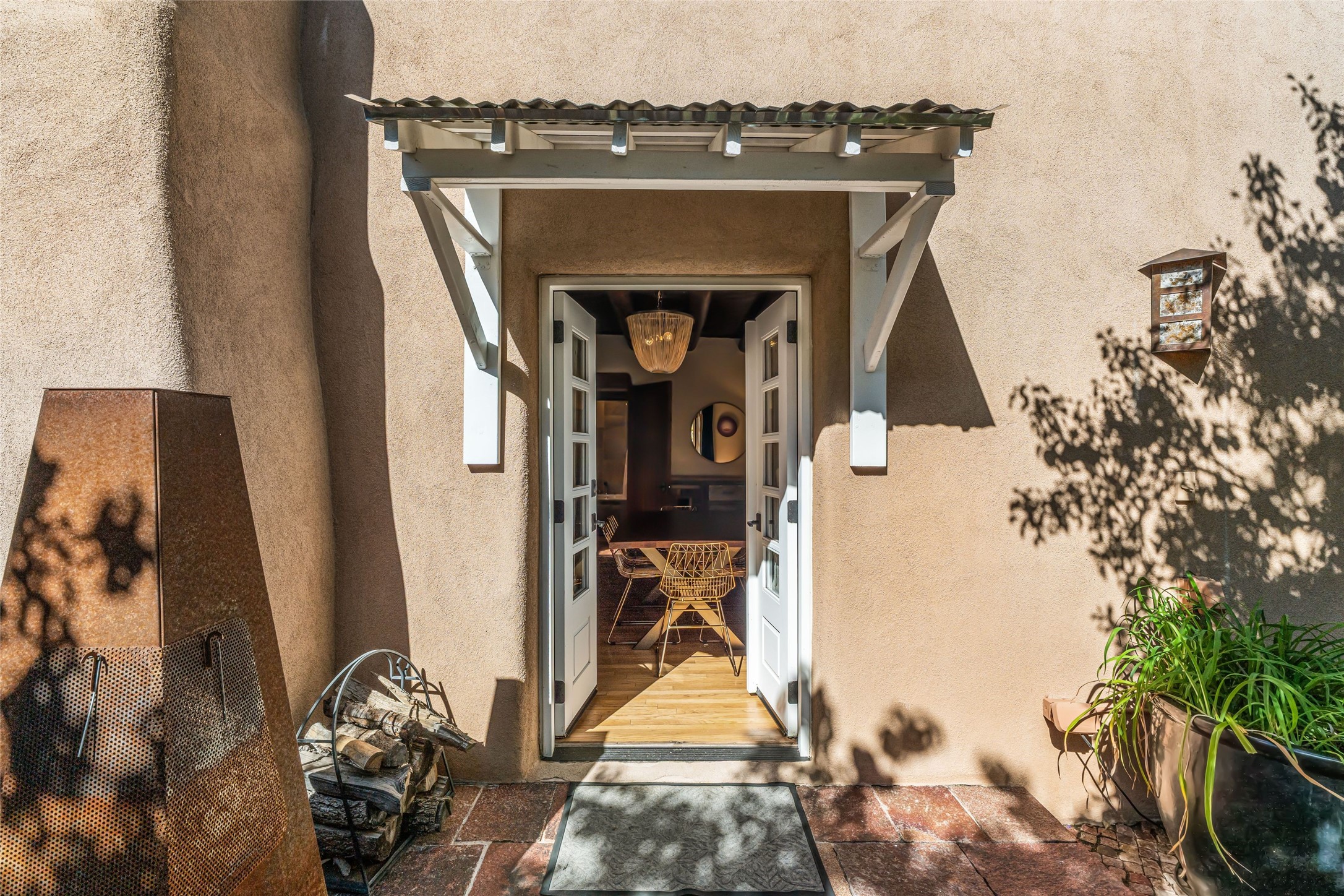 A rare Santa Fe gem - this adobe sanctuary on an oversized lot offers seamless indoor-outdoor living with a fully fenced wraparound yard. Stacked stone walls, wooden gates, a grapevine-covered arbor, and fragrant landscaped gardens create a serene setting where every window frames natural beauty. Inside, renovations preserve authentic adobe character while introducing a fresh, contemporary feel. Skylights brighten the kitchen, and the spacious great room with French doors to the courtyard is ideal for entertaining. The floor plan includes two bedrooms, a full bath, powder room, large laundry room, and a flexible study or dressing room off the primary suite. A private downstairs space provides additional storage or the opportunity for a refinished retreat. Nestled at the heart of the Railyard District, just blocks from Joseph's Pub, Mille, Dolina, Paloma, and minutes to the Plaza, this calming home combines timeless Santa Fe charm with modern updates and unbeatable location.