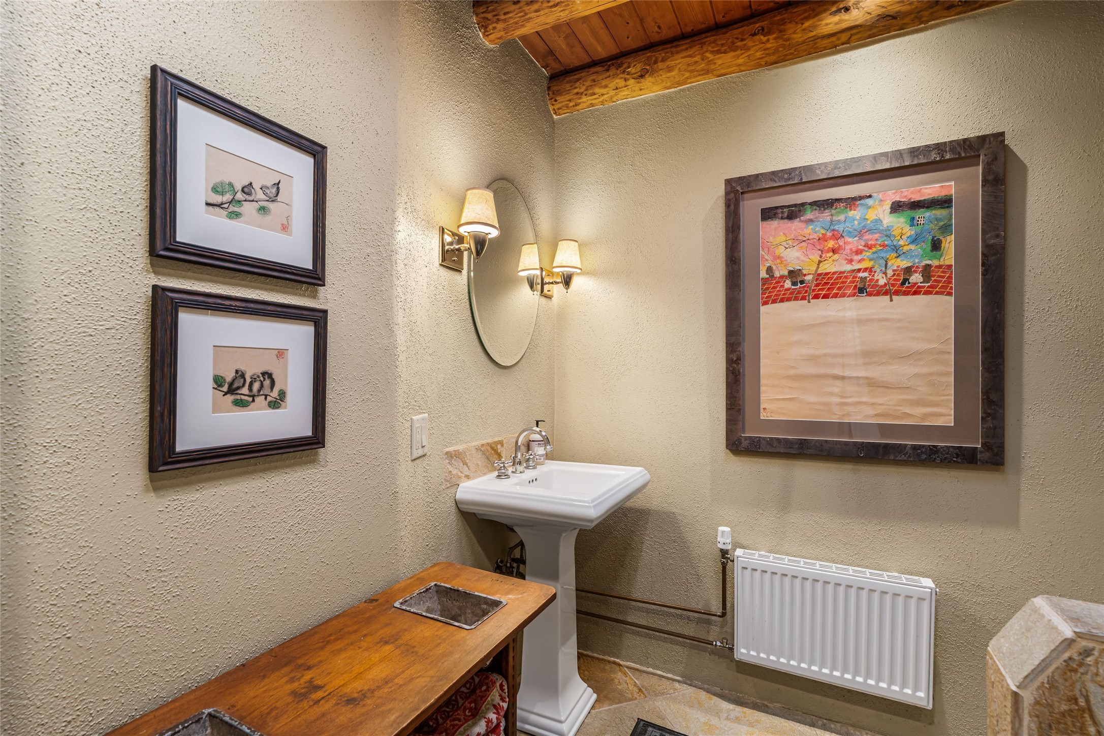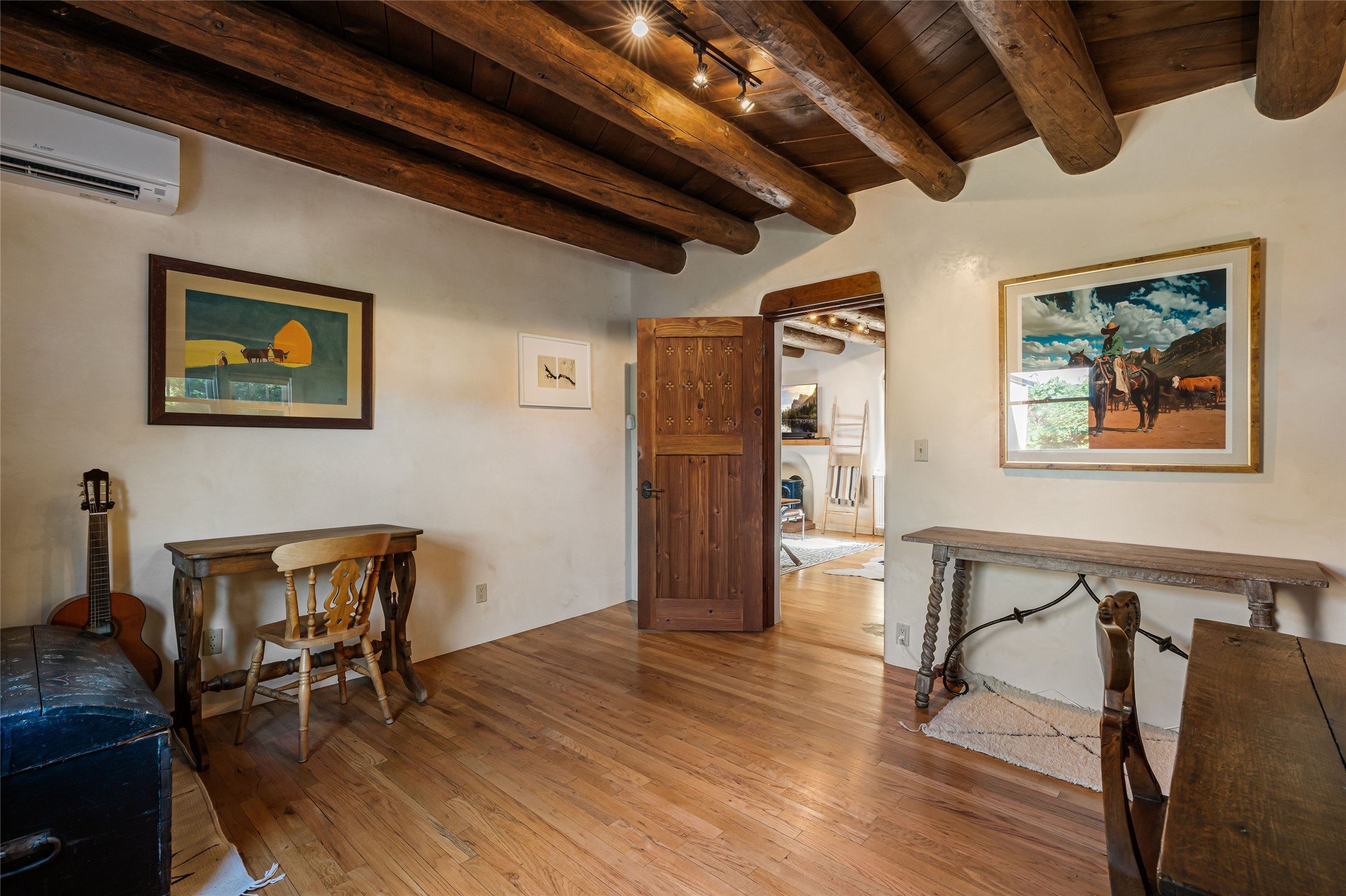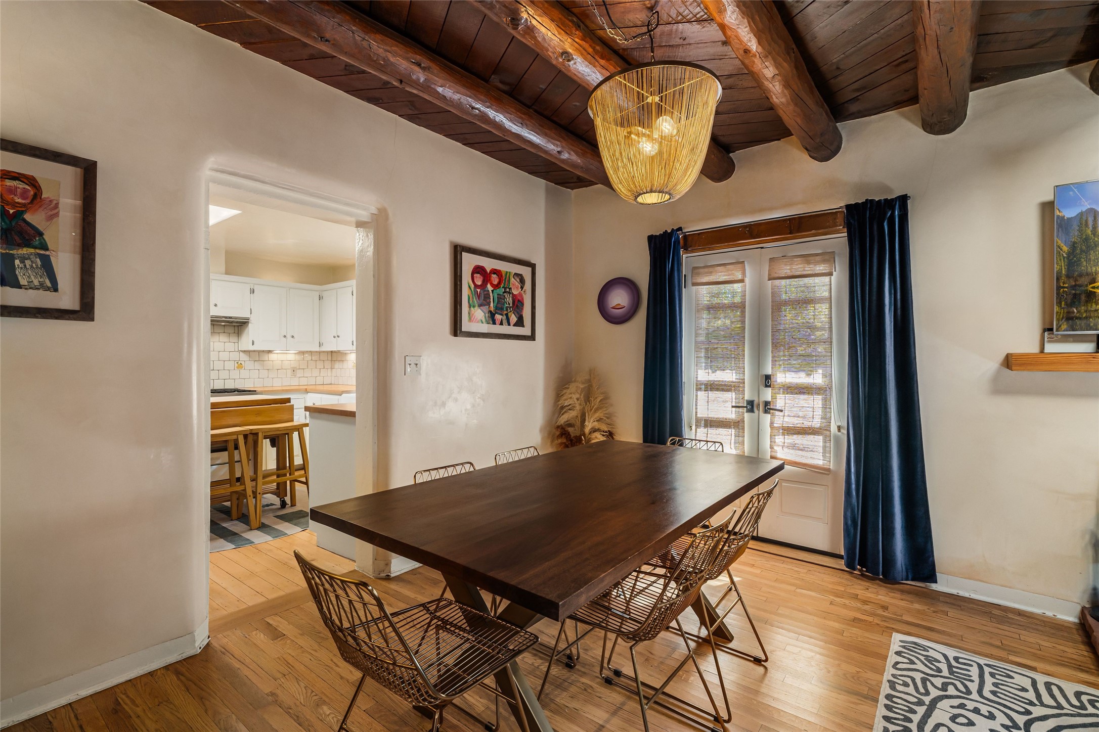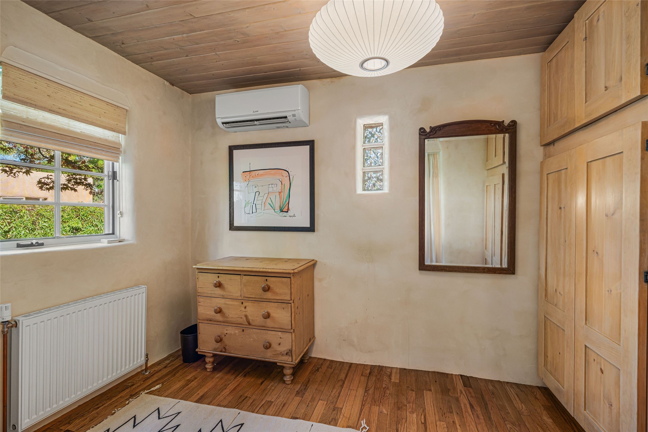 A rare Santa Fe gem - this adobe sanctuary on an oversized lot offers seamless indoor-outdoor living with a fully fenced wraparound yard. Stacked stone walls, wooden gates, a grapevine-covered arbor, and fragrant landscaped gardens create a serene setting where every window frames natural beauty. Inside, renovations preserve authentic adobe character while introducing a fresh, contemporary feel. Skylights brighten the kitchen, and the spacious great room with French doors to the courtyard is ideal for entertaining. The floor plan includes two bedrooms, a full bath, powder room, large laundry room, and a flexible study or dressing room off the primary suite. A private downstairs space provides additional storage or the opportunity for a refinished retreat. Nestled at the heart of the Railyard District, just blocks from Joseph's Pub, Mille, Dolina, Paloma, and minutes to the Plaza, this calming home combines timeless Santa Fe charm with modern updates and unbeatable location.