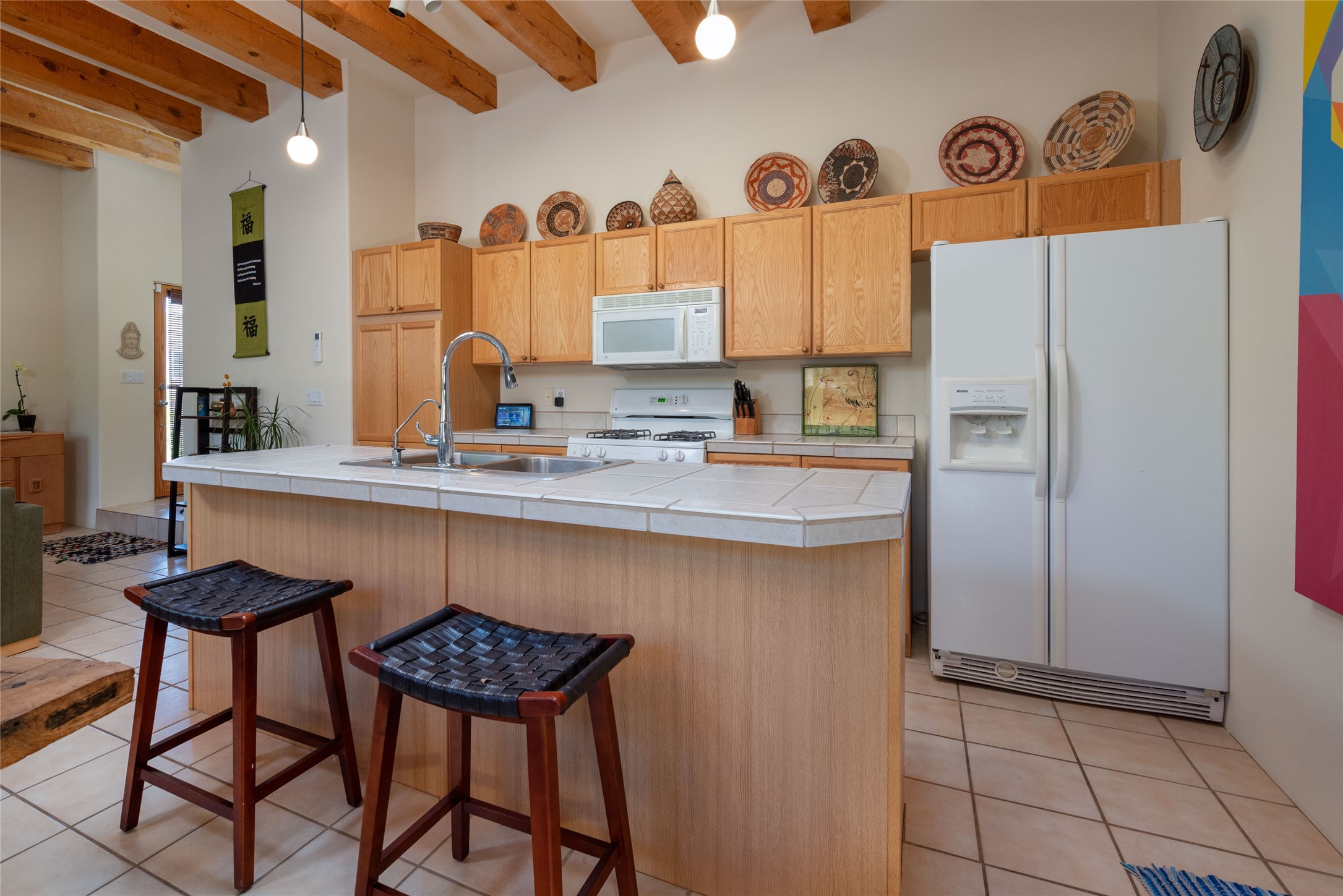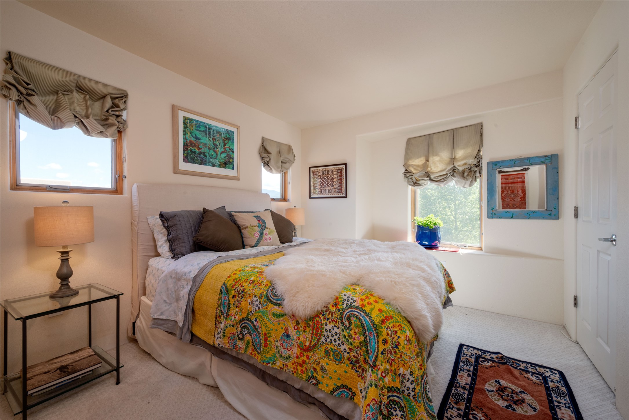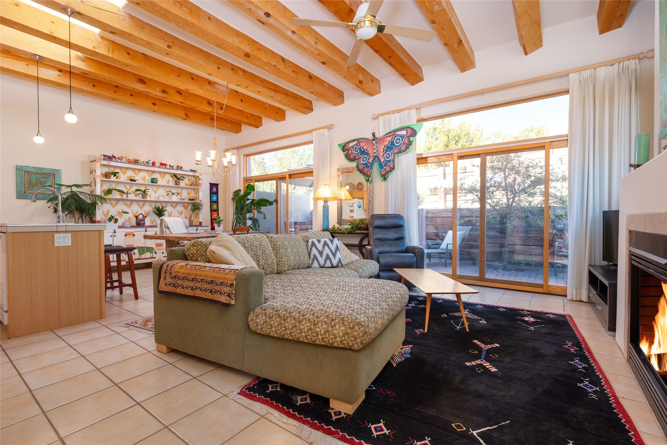 Minutes to De Vargas Mall, Down Town Plaza and Highway 285/84 .This light filled Townhome with spectacular views has it all. The open Living area features Cathedral ceilings, vigas, fireplace and walk out to private courtyard..The radiant floor heating is enhanced with refrigerated ductless A/C heat splits in living room and both upstairs bedrooms. Each Bedroom features en suite baths and the primary bedroom has its own balcony and walk in closet. Other features include skylights, nichos, and parking for guests .. Furniture for sale separately...Don't forget the oversized 2 car garage which offers extra storage space !!