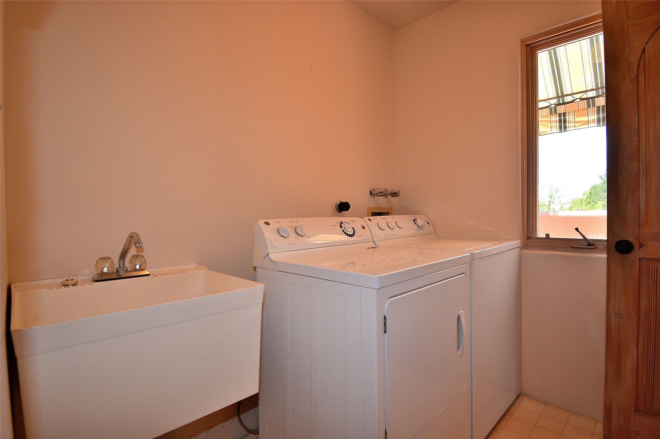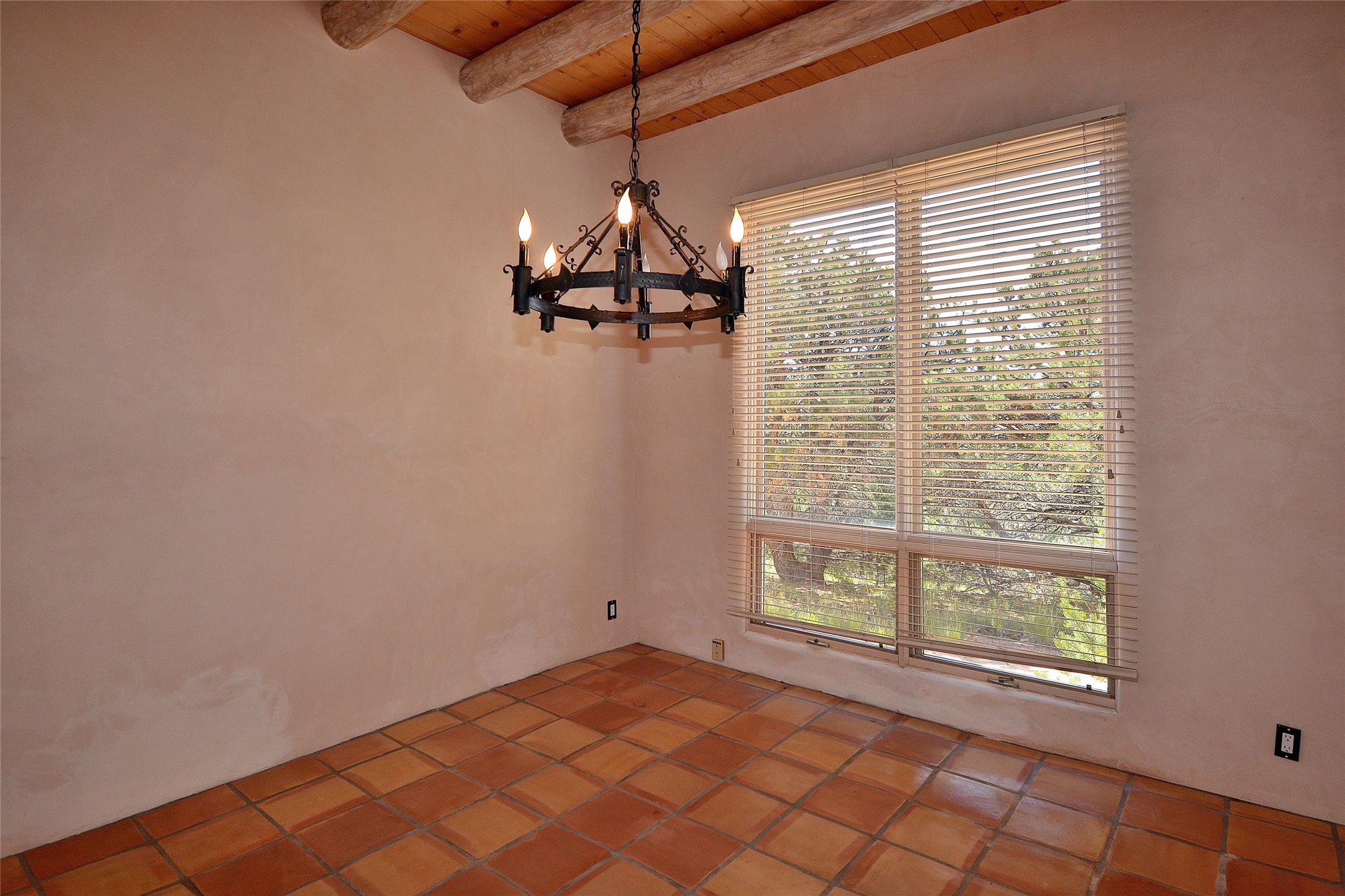 Nestled on two acres dotted with pion and juniper, this inviting Santa Fe-style home blends traditional charm with modern comforts. A gravel driveway leads to a graceful walkway, which in turn leads to a beautifully landscaped, enclosed front yard, The house features plastered walls, and the ground-level floors are adorned with traditional Saltillo tiles, except for the guest bedroom, which has carpet and an en-suite bathroom. The living and dining rooms feature soaring ceilings with vigas. A gas fireplace in the living room adds ambiance during cold winter nights.The kitchen, featuring skylights, granite countertops, and a gas cooktop, microwave, oven, and fridge/freezer, opens to a breakfast nook on one side, complete with its own private patio. Continuing from the breakfast nook, you enter the laundry and then the garage. On the other side of the kitchen is the dining room. The main level also features a second guest room or den with a nearby half-bath. The downstairs has in-floor radiant heat.Upstairs, the spacious main bedroom offers vigas, a second gas fireplace, radiant baseboard heat, and mountain views on one side and a deck on the other. The adjoining bath offers dual sinks, a Jacuzzi-style tub, a shower with seating, and a walk-in cedar closet.With an alarm system and thoughtful storage throughout, this home offers a blend of traditional Santa Fe style and practicality in a serene setting, just a couple of minutes drive to 599 and access to Santa Fe (approx.10 minutes) or to Los Alamos, the Santa Fe airport, and Albuquerque.Adjacent to the subdivision is the La Tierra open space of almost 1500 acres, offering 25 miles of walking trails.