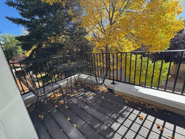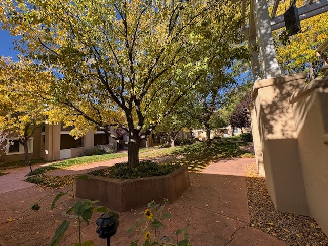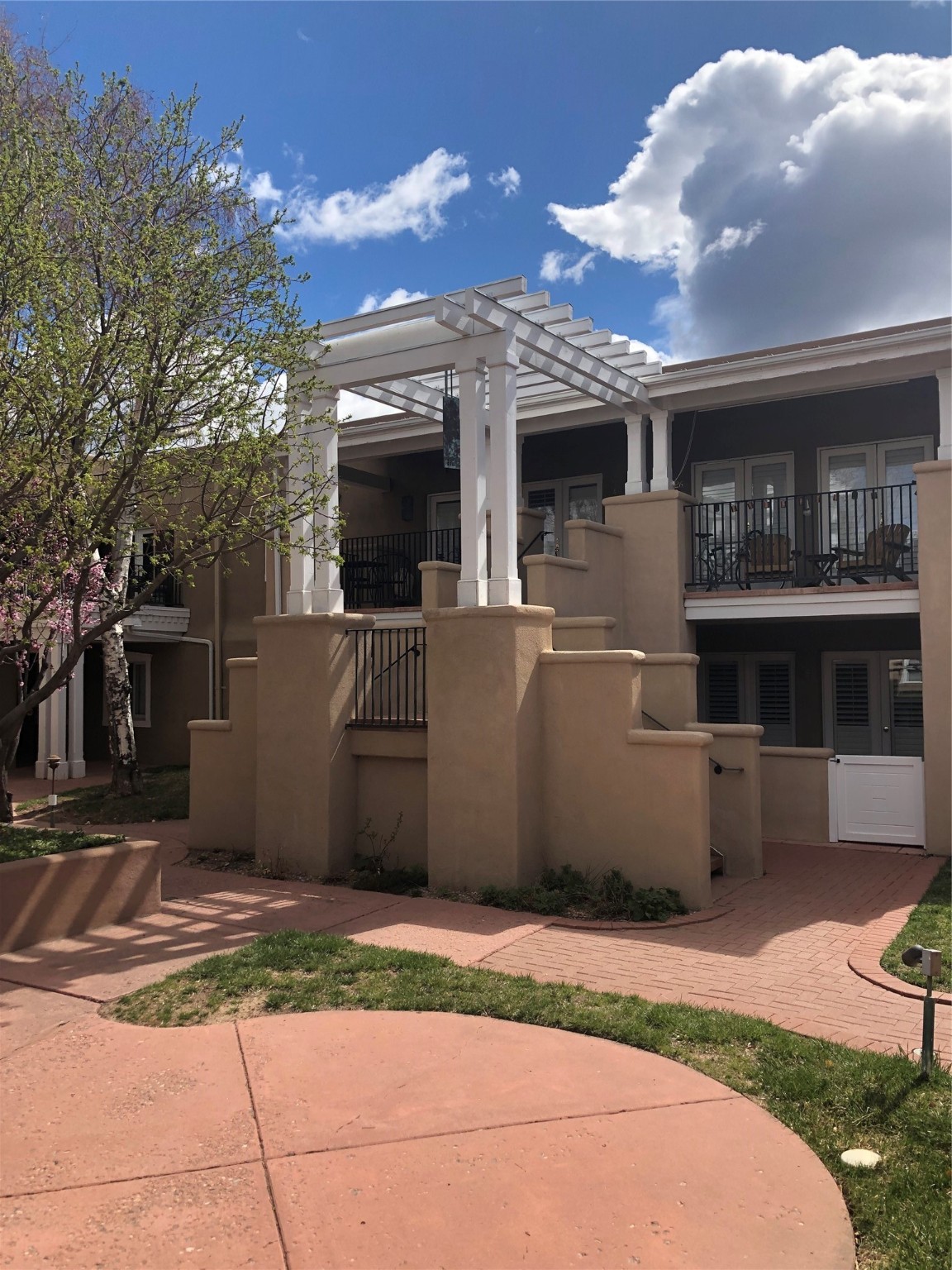 Tantalizing opportunity to live walking distance to the Plaza. Behind the gates of El Matador, you will find this sweet two bedroom one bath off the courtyard with eagle's eye view of the beautifully landscaped courtyard. You'll have a patio to enjoy Santa Fe air and it leads into the open concept of living space graced with crown molding and plantation shutters. Built in shelving offers additional storage along with an elegant fireplace. The kitchen/dining area has been upgraded with all new LG Suite appliances, soft lighting, and efficient cabinetry. LVP and tile flooring throughout. Furnace with refrigerated air installed in 2023, as well as newer washer/dryer combo allowing extra space. Remodeled bathroom is filled with light and ambiance. One bedroom with a full balcony and extra storage, the other bedroom with a Juliette balcony, have built-in drawer/hanging closets with auto light system. Somewhat unique to El Matador is two covered parking spaces. The easy access to Los Alamos, the National Forest, and The Plaza are crowning jewels.