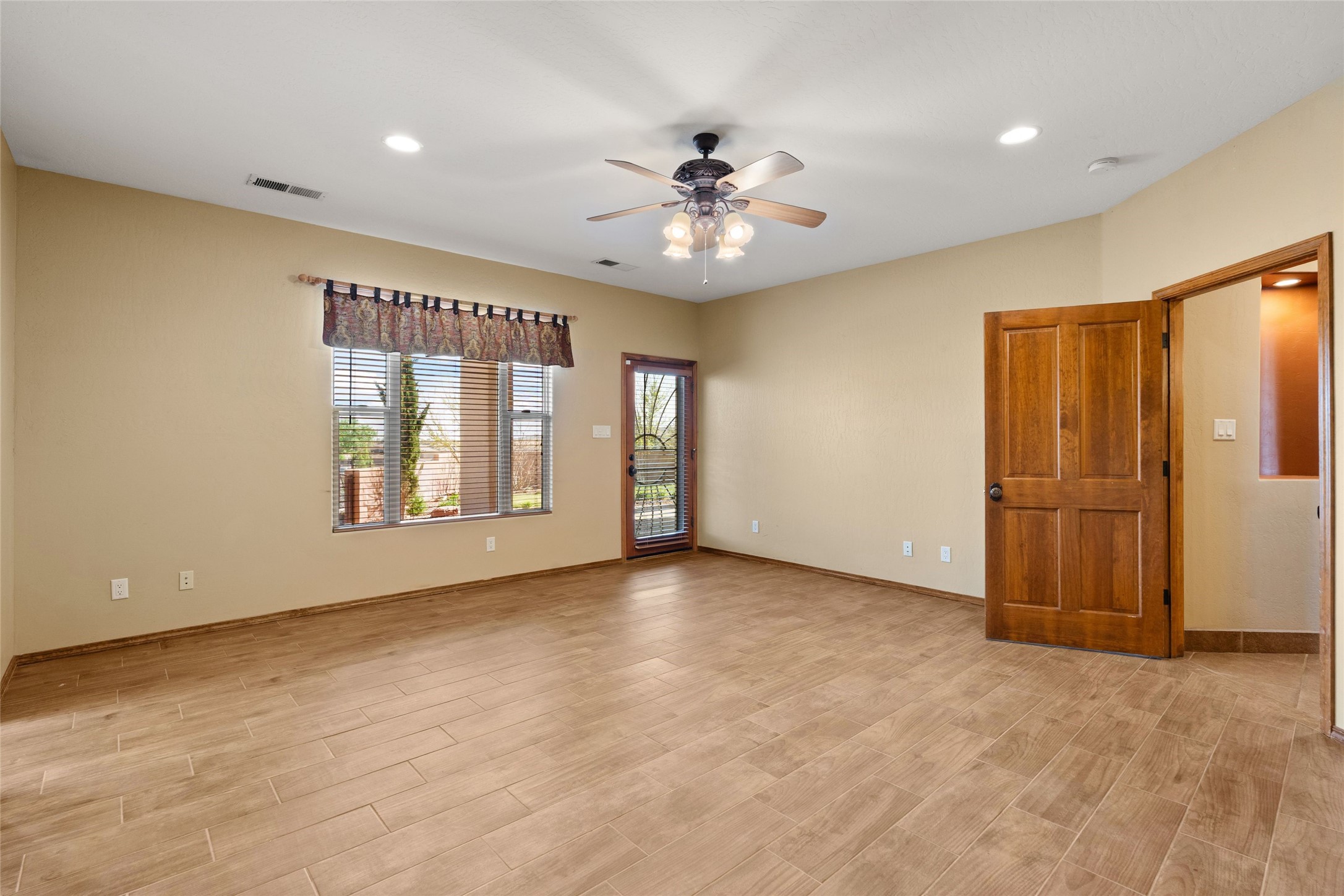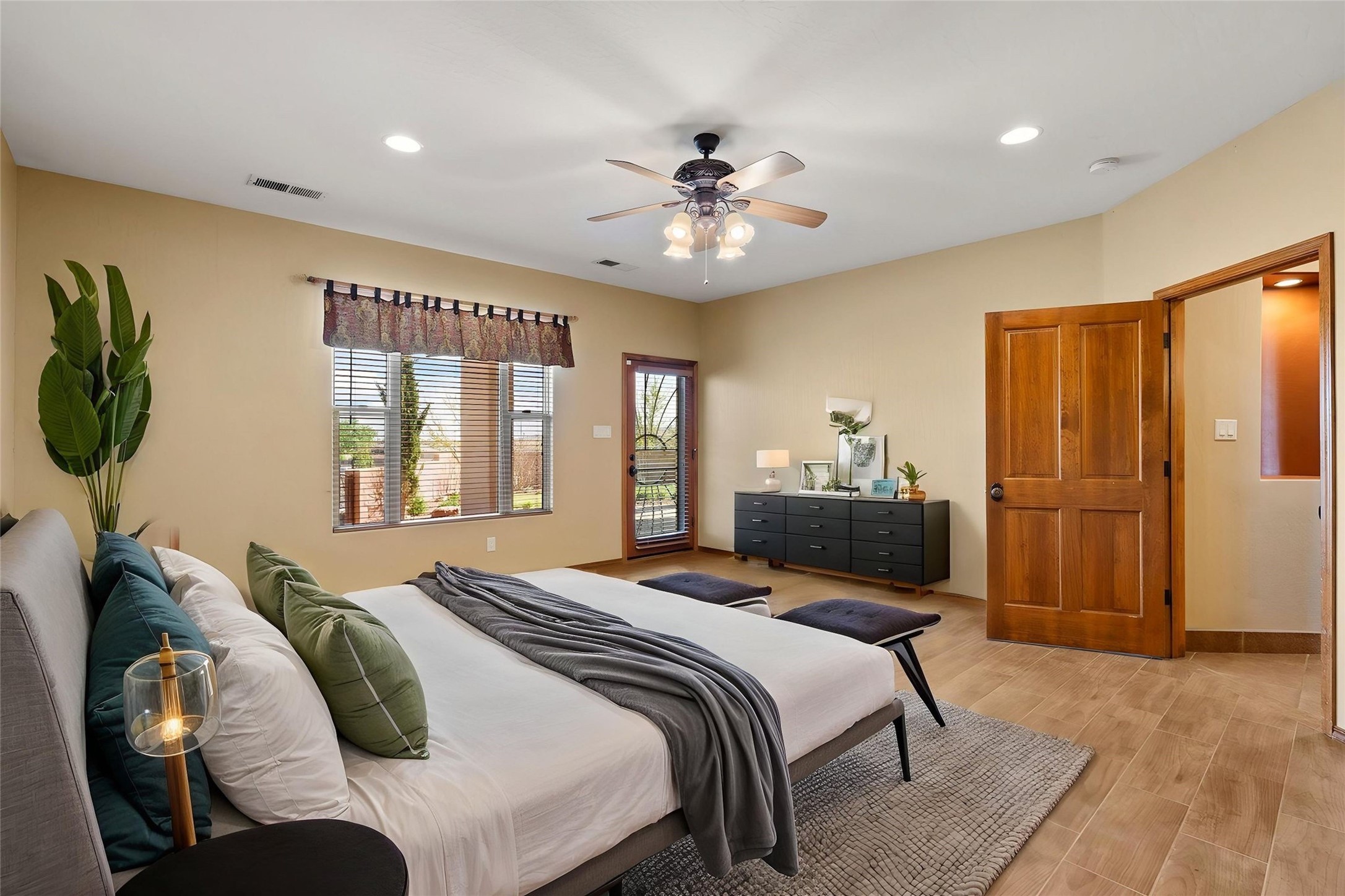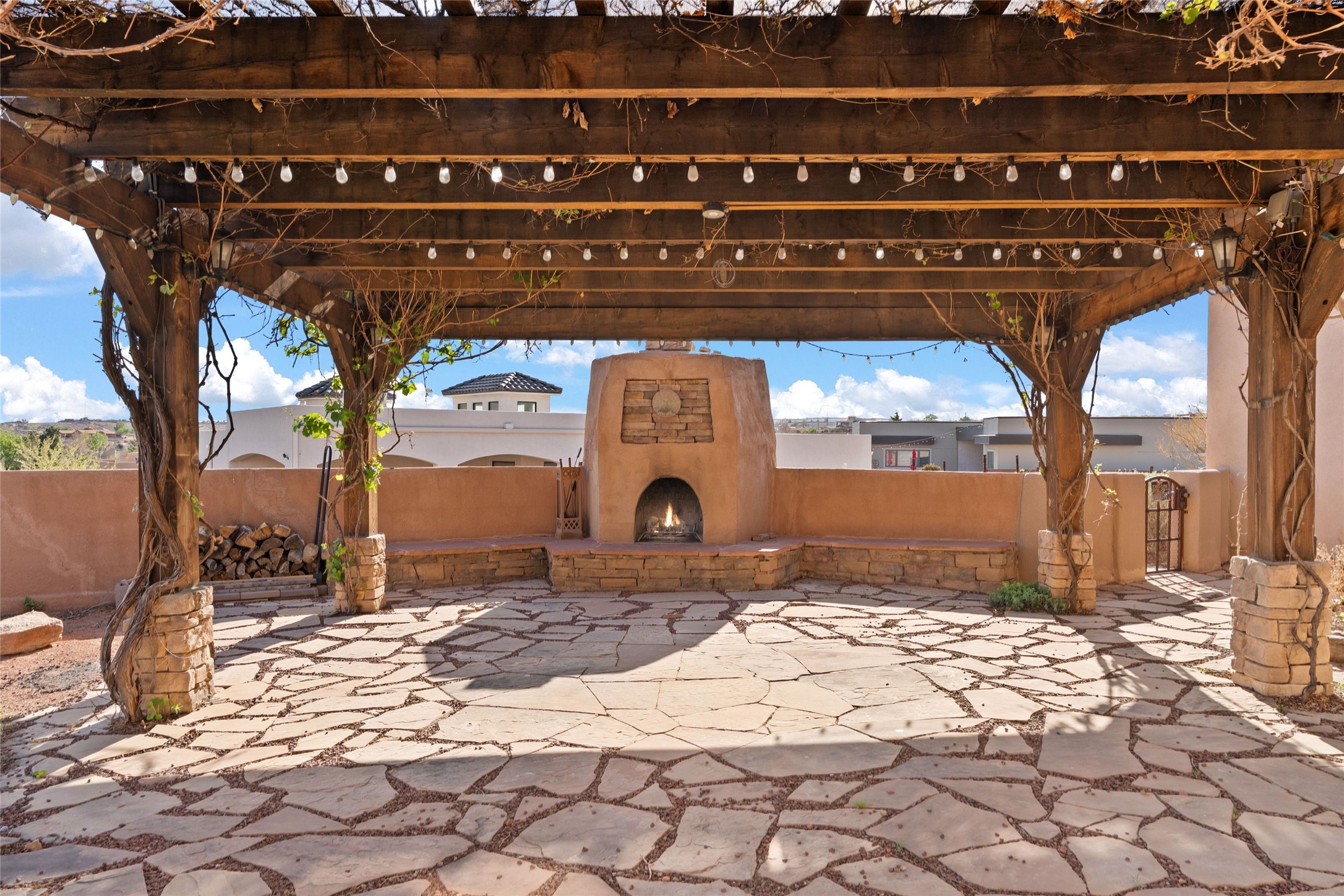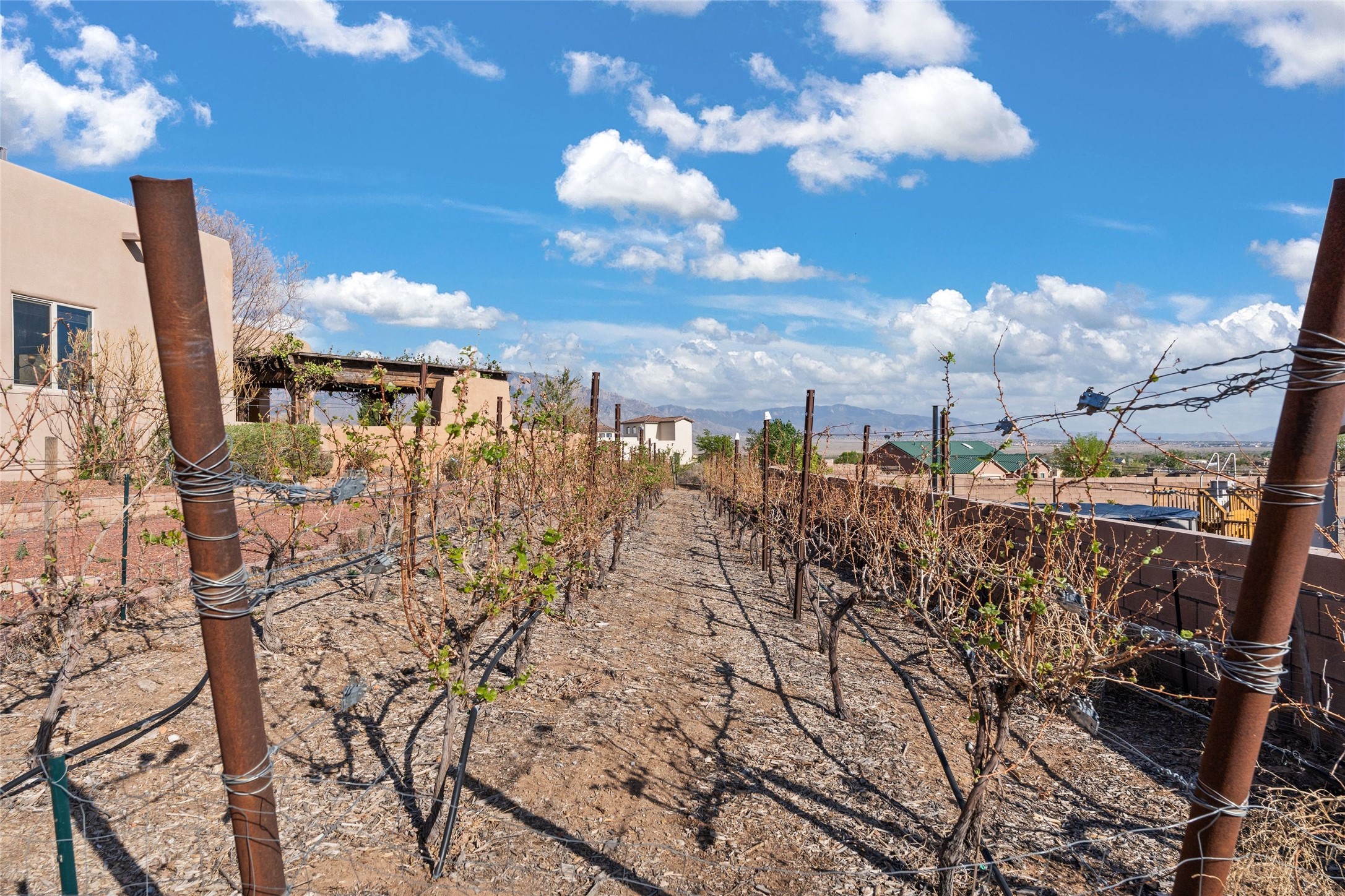Seller owned solar and a private well! Enjoy the space without the high costs. Nestled on a lush and generous .52-acre lot in Rio Rancho, this property delivers expansive indoor-outdoor living, and countless features including a separate living area/casita. The home includes an oversized 3-car garage (1,488 SF) with extended depth, a dedicated hobby/game room, a 10x15 woodworking space, and a separate storage shed -- perfect for every project or pastime. The main house is designed with community and comfort in mind. The chef's kitchen boasts a gas cooktop, double convection ovens, dual sinks, a walk-in pantry, and flows effortlessly into the dining and living areas -- perfect for entertaining.A stacked stone custom gas log fireplace with banco seating adds cozy ambiance. The primary suite features southern views and private access to the extended covered back patio, a snail shower, garden tub, dual sinks, and a walk-in closet. Three additional bedrooms and two bathrooms provide ample room for children, guests, or office space.18-panel owned solar system installed in 2016. A central vacuum system adds further convenience. A standout feature is the spacious attached 800 SF casita, offering a full kitchen, living room, walk-in closet, and ensuite bathroom with linen storage. All on one level with no carpet, this private space is ideal for in-laws, guests, or even potential rental income.Outdoors, create unforgettable memories in the pergola-covered patio wrapped in grapevines, with a custom wood-burning fireplace and banco seating -- ideal for BBQs, al fresco dinners, and relaxing evenings. The property's mature vineyard includes Cabernet Sauvignon, Chardonnay, and more. Owners and past owners have previously had local farmers care for the grapes in exchange for the fruit at harvest time making this lush landscaping easy to enjoy.Edible landscaping surrounds you with fruit trees and raised garden beds for vegetables and herbs. New roof (2019).
