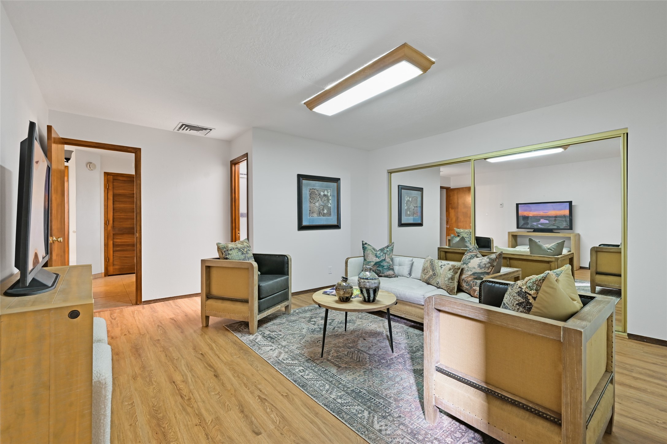 This house feels like a home. It's the real estate equivalent of comfort food! From the mid century modern details in the living/dining area to the updated kitchen to a lovely sunroom opening onto the large, private patio and rose garden, everything about this place is welcoming. The primary suite offers many options with a spacious bedroom, ensuite bath, huge walk-in closet and two adjoining rooms that can be configured to suit many needs -- home office, media room, workout space, nursery, play room, yoga shanti, you name it! Two additional bedrooms and another full bath, all with ample storage, complete the picture. On a corner lot in a true neighborhood where people watch out for one another, you will be minutes from grocery shopping, schools, restaurants, healthcare facilities with easy access to the Railrunner and I-25. Take advantage of the recent price reduction and start your new chapter in this versatile and meticulously maintained home.