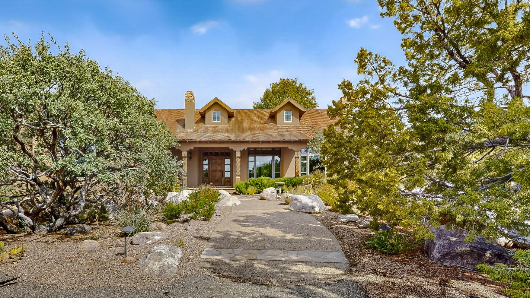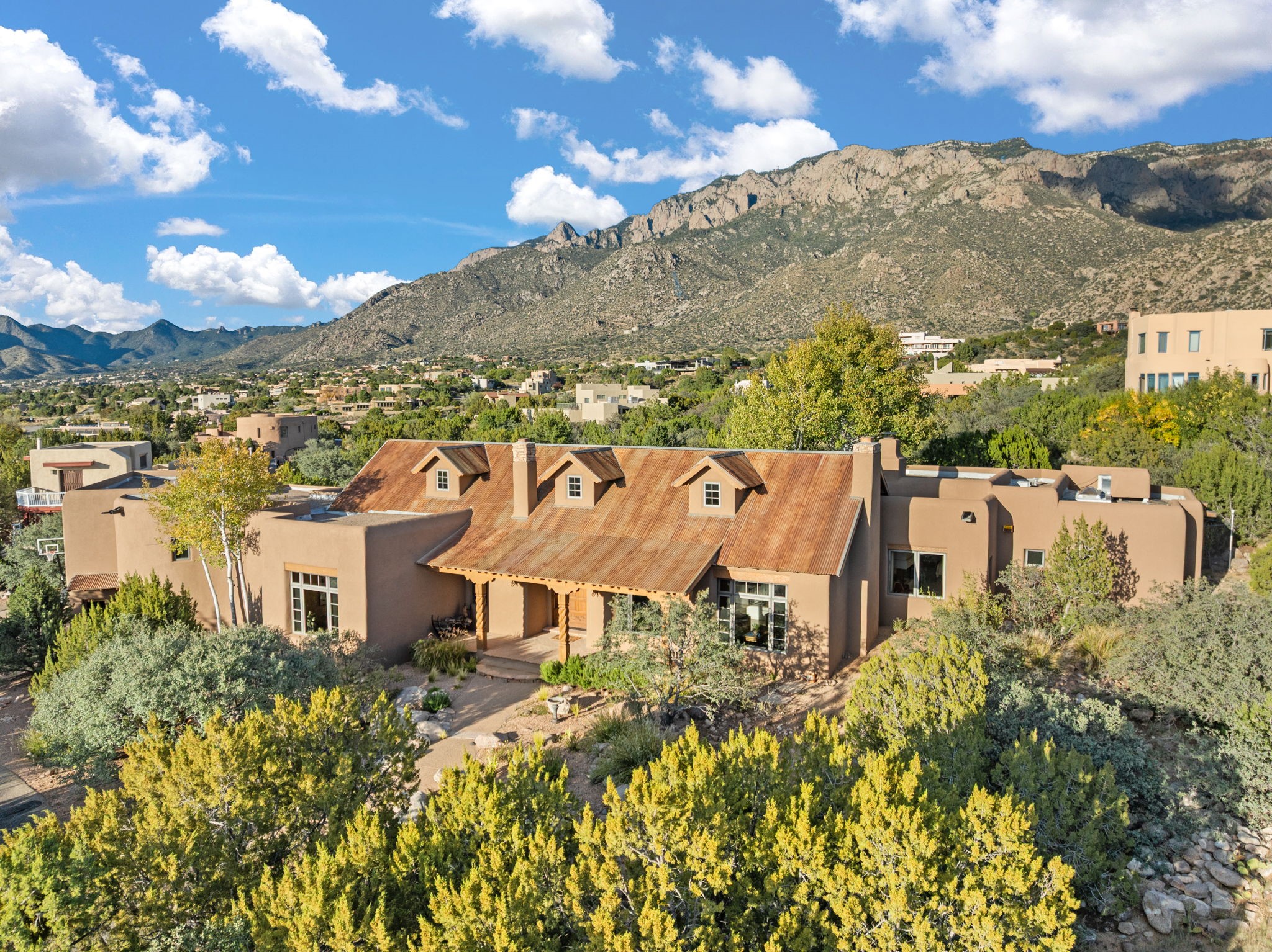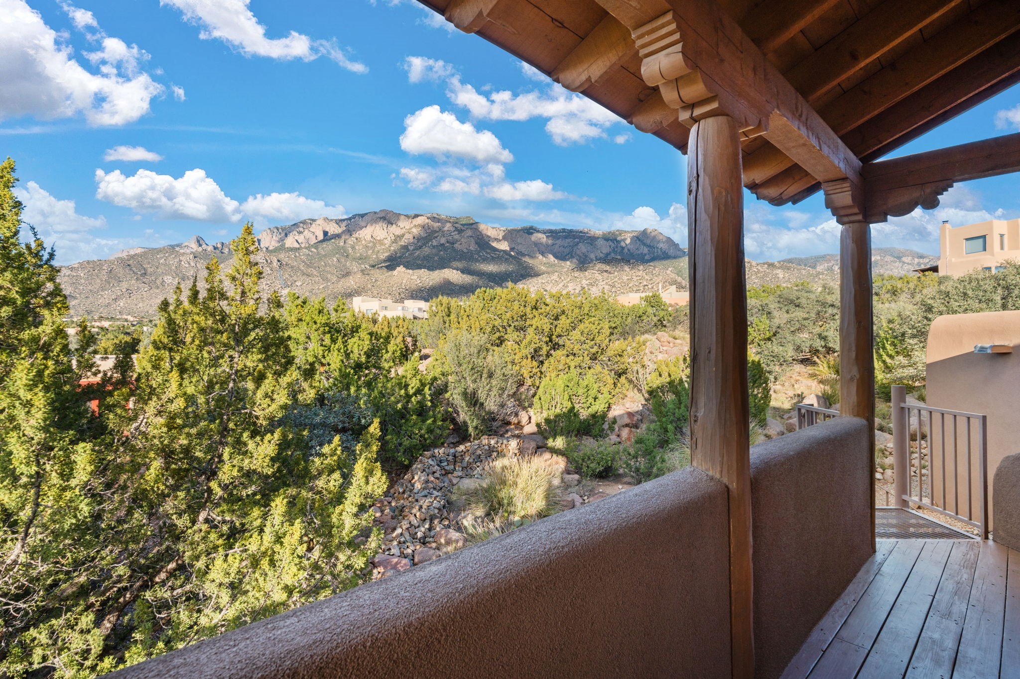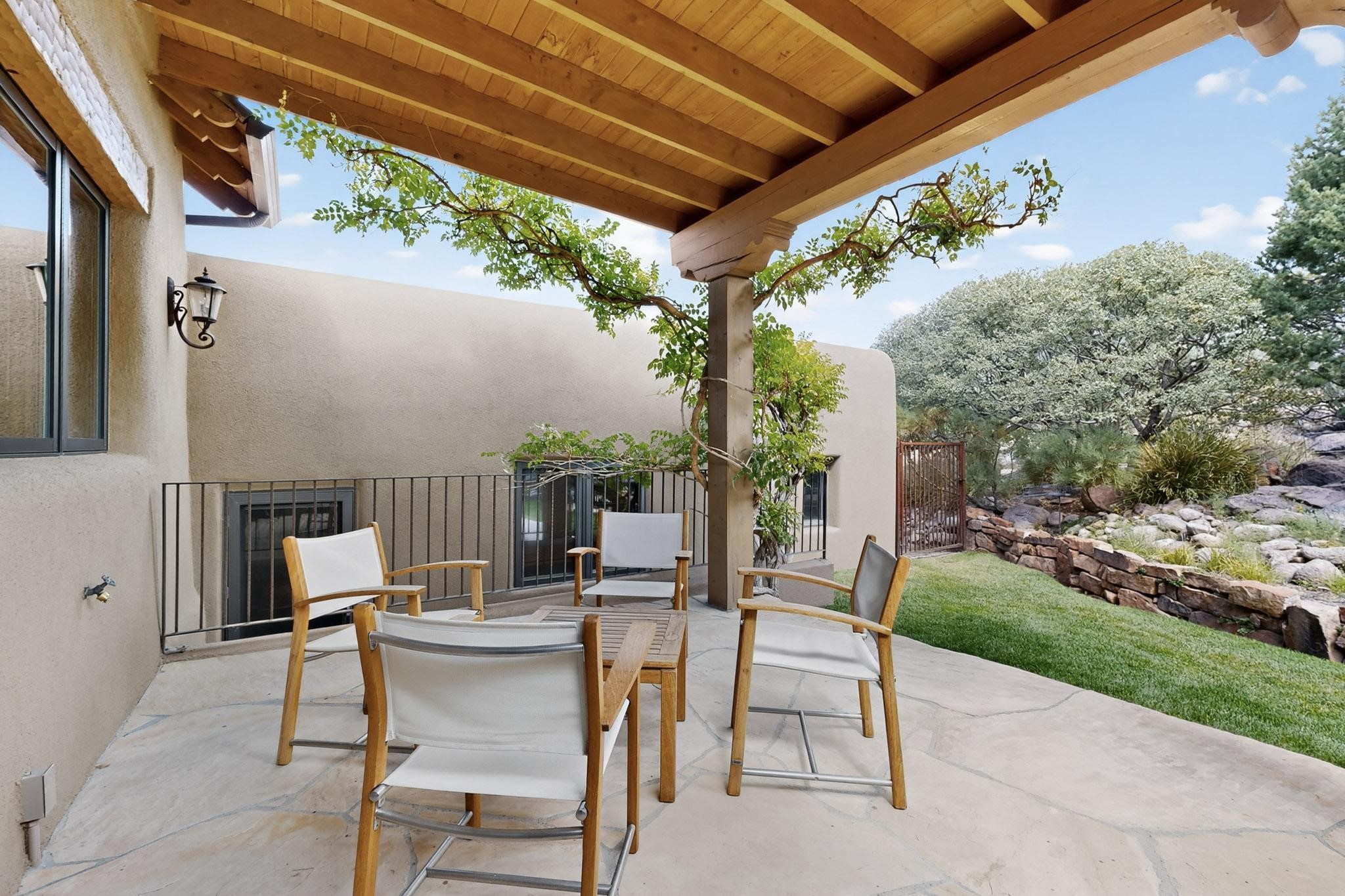 With vistas of the Sandia Mountains and city lights, this spacious 5,513 sq. ft. Sandia Heights estate is a rare blend of artistry, craftsmanship, and luxury. Upon entering the front door, the spacious living area introduces the understated beauty of this special home with hand-crafted details, deep sandstone sills, and a beautiful wood-burning fireplace. Features such as expansive chip-carved beams, custom doors, and diamond plaster walls provide warmth and refinement. Expansive windows frame breathtaking views and bath the house with natural light, magically merging the outdoor and indoor spaces. The kitchen is a chef's dream with a Sub-Zero refrigerator and freezer, Viking Professional 6-burner stove with griddle, and a butler's pantry complete with a Sub-Zero wine and beverage coolerTogether with the eating nook, kiva fireplace seating area, and formal dining room the kitchen area is perfect for evenings with family or elegant entertaining. The primary suite is a true sanctuary featuring a coved ceiling with exposed beams and corbels, a gas log fireplace, and a cozy seating area with latilla ceiling and built-in bookcases. The adjoining spa-inspired bath has it all - a steam shower, dual shower heads, travertine seating, a skylight over the garden jetted tub, and a private yoga and meditation room. Additional living spaces include a home office attached to a secondary living room and multiple generous ensuite bedrooms. The private backyard feels like a Zen oasis under New Mexico skies with a tiered garden, in-ground spa, outdoor fireplace, and covered patio. Modern comforts abound with in-floor hot water radiant heat, large 3-car garage, abundant storage, central vacuum, built-in speakers, new stucco and septic in 2025! This could be your ABQ Dream Home!