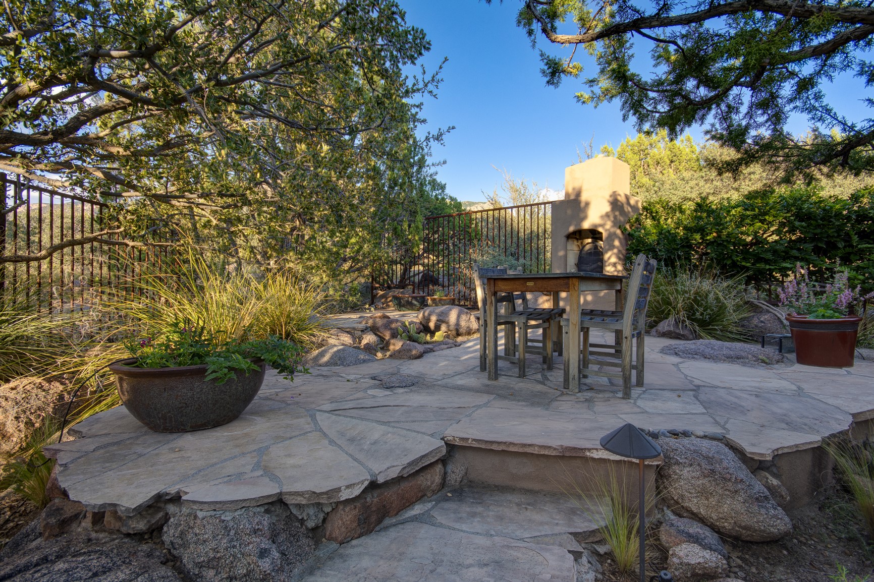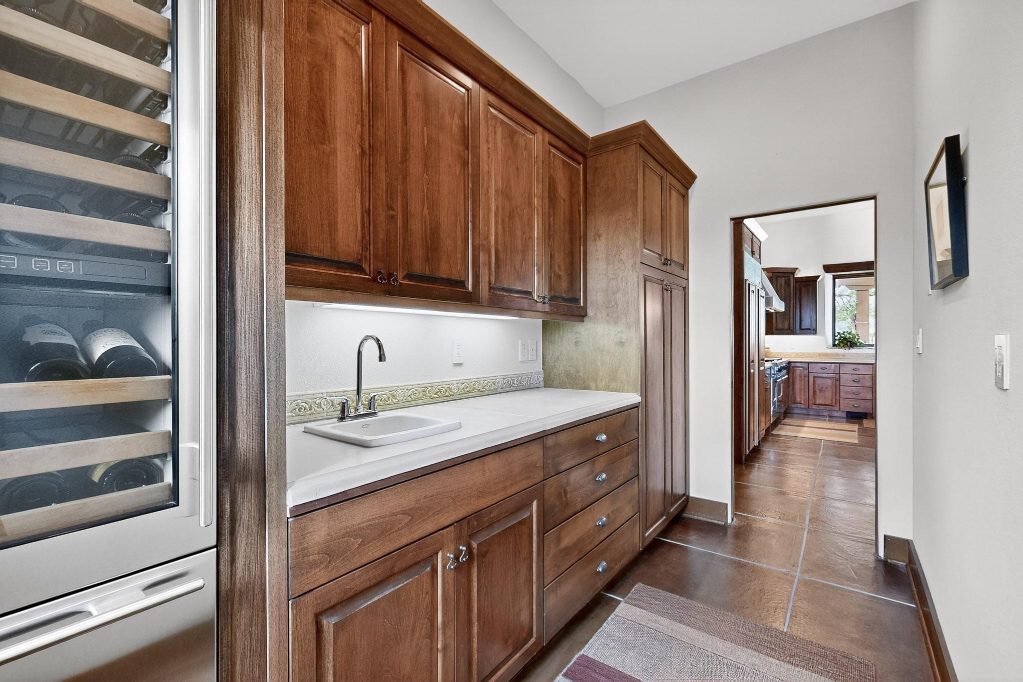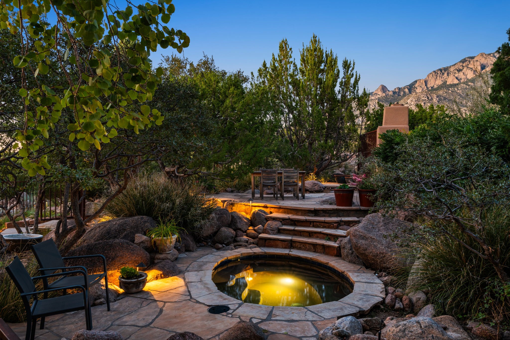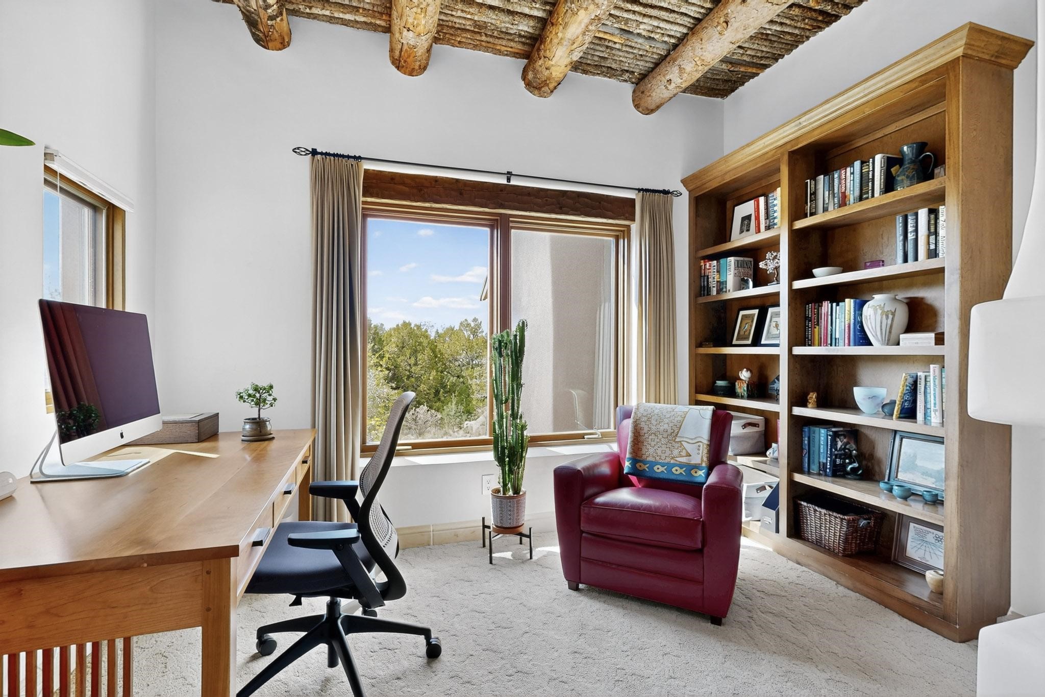 With vistas of the Sandia Mountains and city lights, this spacious 5,513 sq. ft. Sandia Heights estate is a rare blend of artistry, craftsmanship, and luxury. Upon entering the front door, the spacious living area introduces the understated beauty of this special home with hand-crafted details, deep sandstone sills, and a beautiful wood-burning fireplace. Features such as expansive chip-carved beams, custom doors, and diamond plaster walls provide warmth and refinement. Expansive windows frame breathtaking views and bath the house with natural light, magically merging the outdoor and indoor spaces. The kitchen is a chef's dream with a Sub-Zero refrigerator and freezer, Viking Professional 6-burner stove with griddle, and a butler's pantry complete with a Sub-Zero wine and beverage coolerTogether with the eating nook, kiva fireplace seating area, and formal dining room the kitchen area is perfect for evenings with family or elegant entertaining. The primary suite is a true sanctuary featuring a coved ceiling with exposed beams and corbels, a gas log fireplace, and a cozy seating area with latilla ceiling and built-in bookcases. The adjoining spa-inspired bath has it all - a steam shower, dual shower heads, travertine seating, a skylight over the garden jetted tub, and a private yoga and meditation room. Additional living spaces include a home office attached to a secondary living room and multiple generous ensuite bedrooms. The private backyard feels like a Zen oasis under New Mexico skies with a tiered garden, in-ground spa, outdoor fireplace, and covered patio. Modern comforts abound with in-floor hot water radiant heat, large 3-car garage, abundant storage, central vacuum, built-in speakers, new stucco and septic in 2025! This could be your ABQ Dream Home!