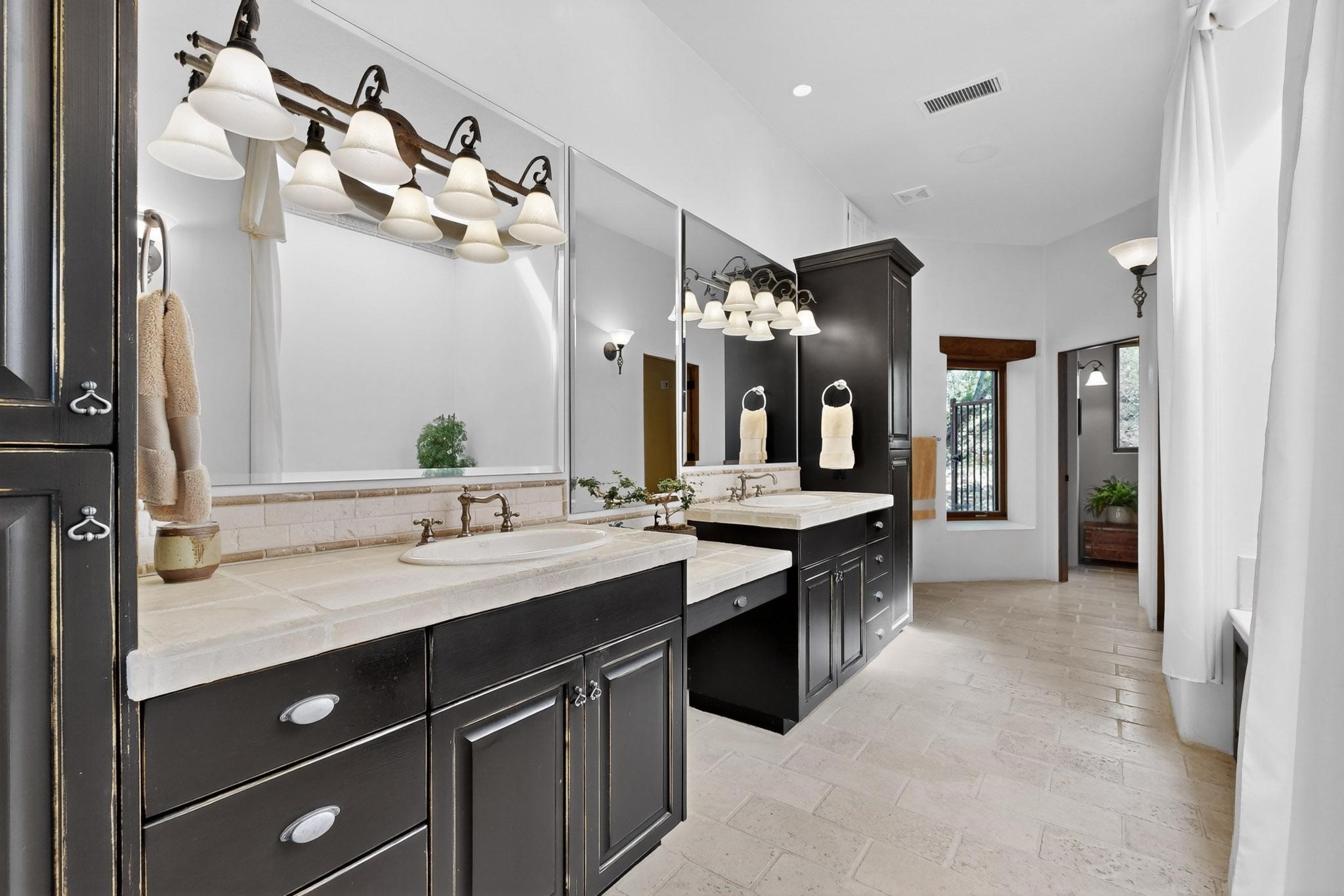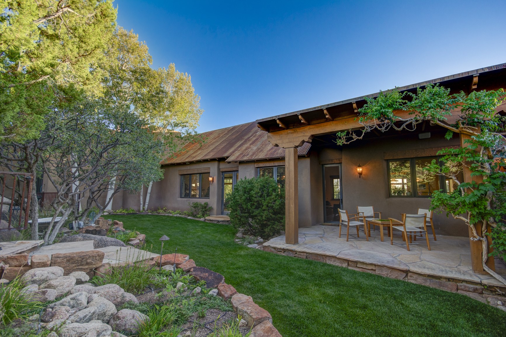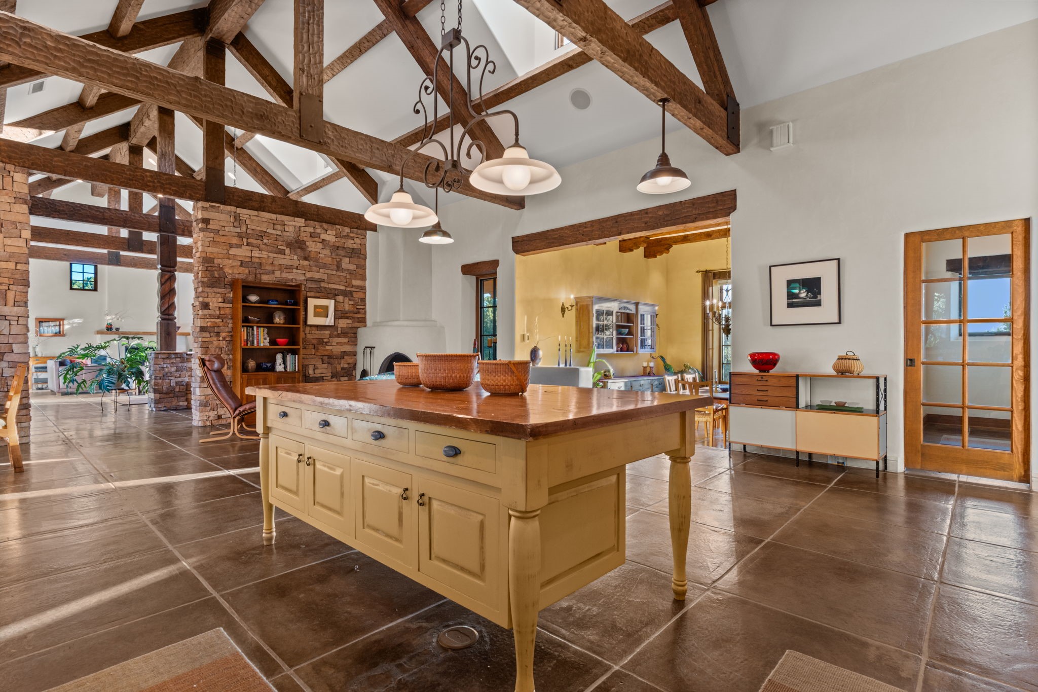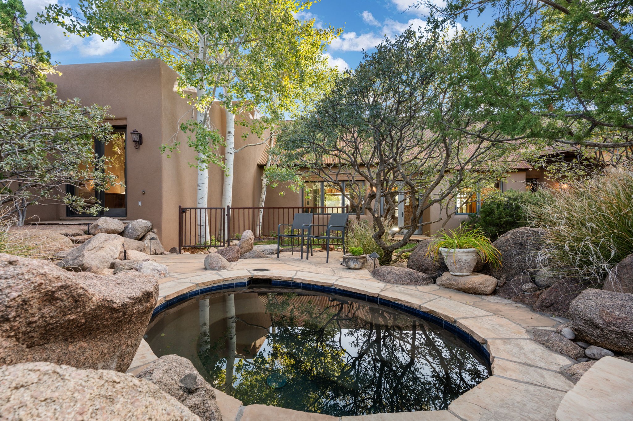 With vistas of the Sandia Mountains and city lights, this spacious 5,513 sq. ft. Sandia Heights estate is a rare blend of artistry, craftsmanship, and luxury. Upon entering the front door, the spacious living area introduces the understated beauty of this special home with hand-crafted details, deep sandstone sills, and a beautiful wood-burning fireplace. Features such as expansive chip-carved beams, custom doors, and diamond plaster walls provide warmth and refinement. Expansive windows frame breathtaking views and bath the house with natural light, magically merging the outdoor and indoor spaces. The kitchen is a chef's dream with a Sub-Zero refrigerator and freezer, Viking Professional 6-burner stove with griddle, and a butler's pantry complete with a Sub-Zero wine and beverage coolerTogether with the eating nook, kiva fireplace seating area, and formal dining room the kitchen area is perfect for evenings with family or elegant entertaining. The primary suite is a true sanctuary featuring a coved ceiling with exposed beams and corbels, a gas log fireplace, and a cozy seating area with latilla ceiling and built-in bookcases. The adjoining spa-inspired bath has it all - a steam shower, dual shower heads, travertine seating, a skylight over the garden jetted tub, and a private yoga and meditation room. Additional living spaces include a home office attached to a secondary living room and multiple generous ensuite bedrooms. The private backyard feels like a Zen oasis under New Mexico skies with a tiered garden, in-ground spa, outdoor fireplace, and covered patio. Modern comforts abound with in-floor hot water radiant heat, large 3-car garage, abundant storage, central vacuum, built-in speakers, new stucco and septic in 2025! This could be your ABQ Dream Home!