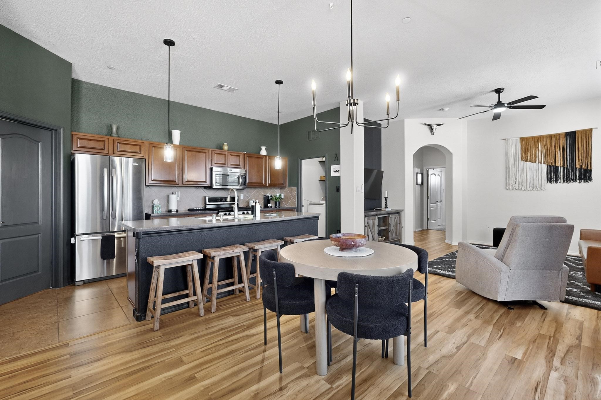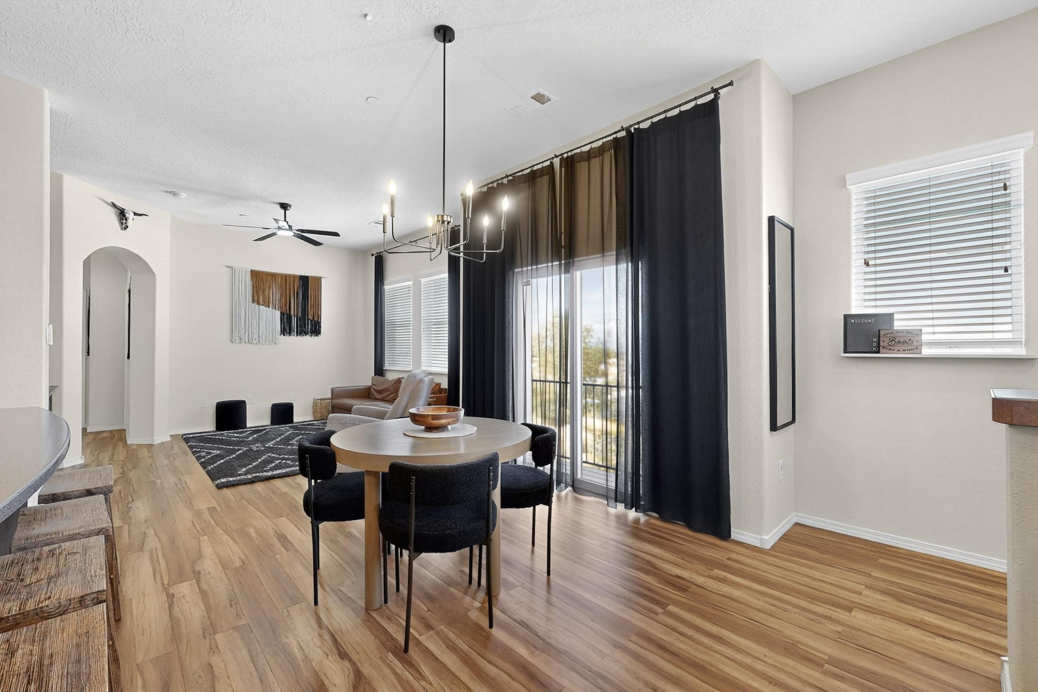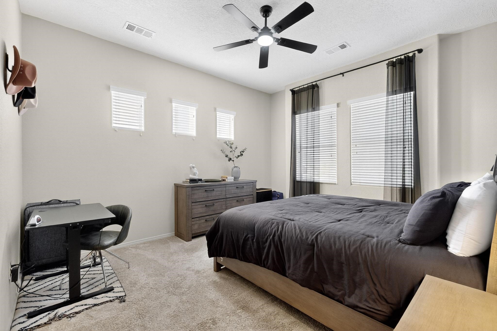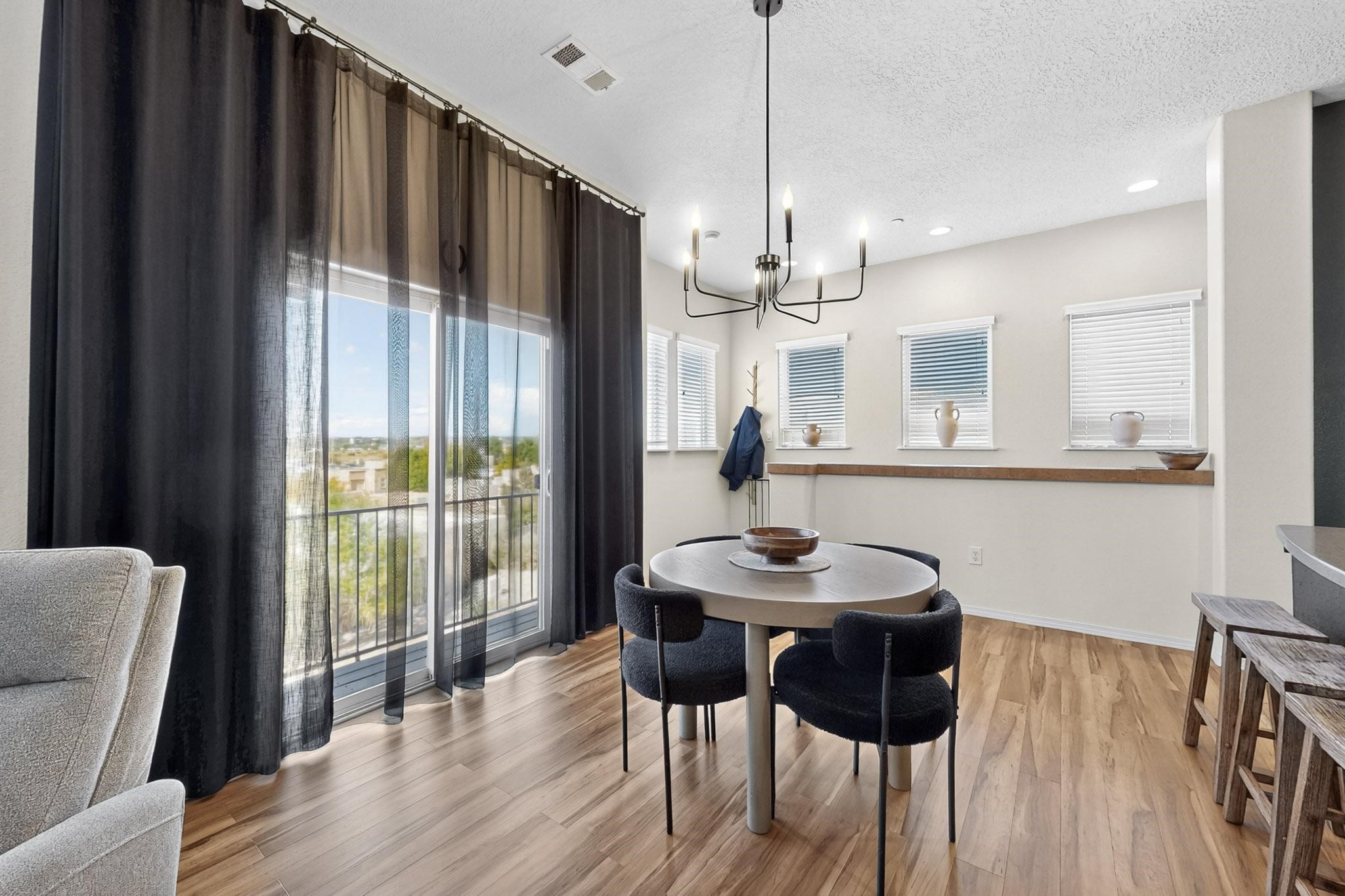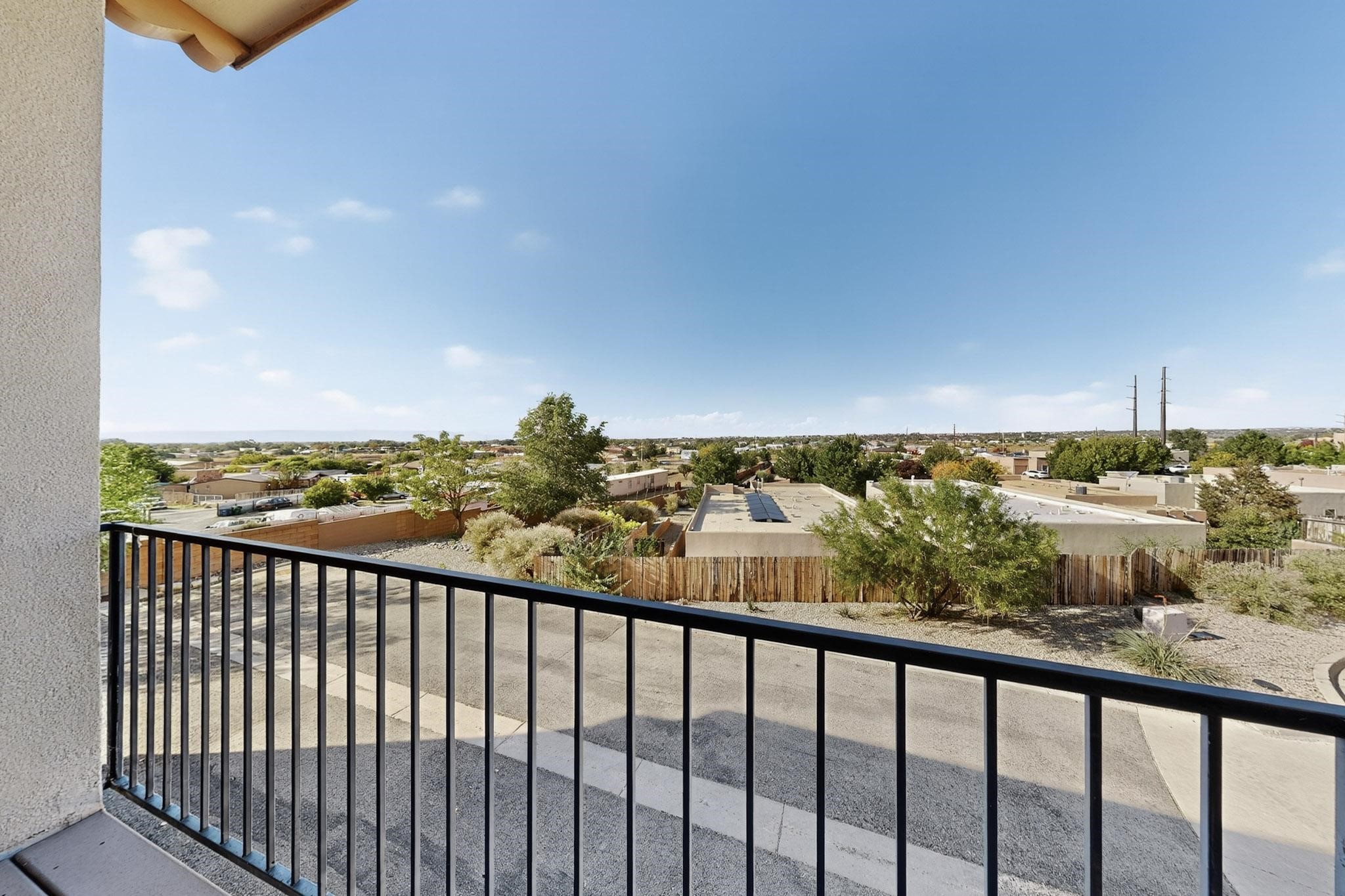 Welcome to this contemporary Southwest-inspired home. This home features modern updates, smart features, and mountain views. It includes a 1-car garage, 10-foot ceilings, updated fixtures, fresh paint, and tile accents throughout the main living, kitchen, and dining areas, with an open floor plan. Engineered vinyl plank flooring extends throughout the main areas. The kitchen has a generous island, pendant lighting, and stainless steel appliances. Both bedrooms feature plush carpet, and the primary bedroom includes a well-organized closet system, with additional shelving in the second bathroom. A dedicated laundry room includes an LG WiFi-enabled washer and dryer. Smart home features include a Yale front door lock, MyQ garage system, Ring doorbell, and Ecobee thermostat. Situated on a quiet cul-de-sac, the elevated corner lot provides views of the Jemez Mountains, sunsets, seasonal snowfall, and summer monsoons. The home receives abundant natural light and airflow throughout. This home is being sold fully furnished, including kitchen, bathroom, and bedroom essentials, along with coordinated furniture and dcor--ready for immediate occupancy (including quality kitchen items such as Calphalon cookware and knives, and OXO utensils). The home is located near a local park, shopping, and dining options, with access to I-25 and US-599.