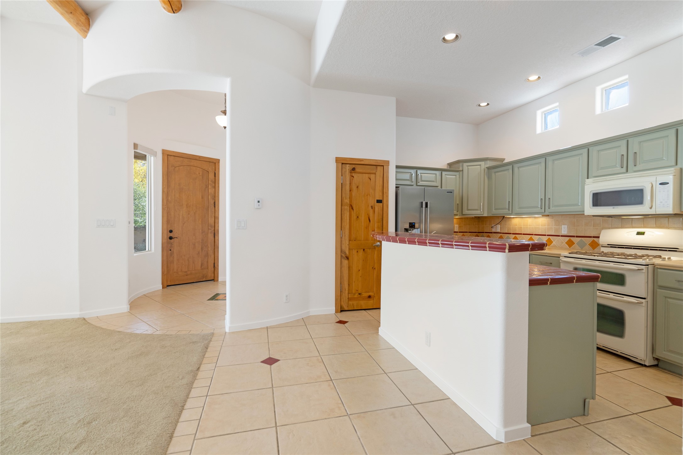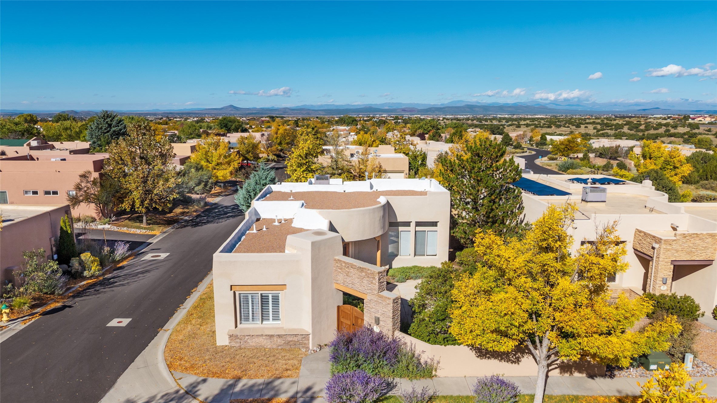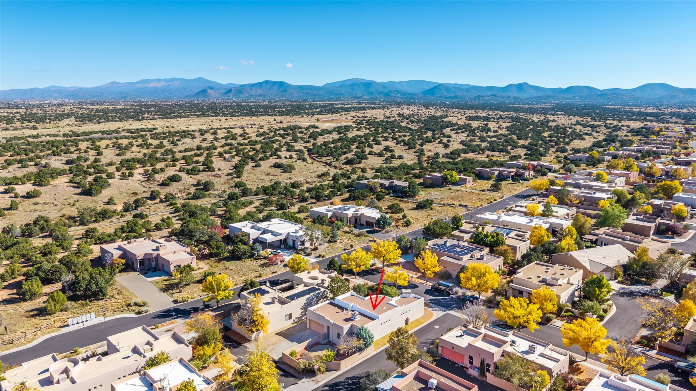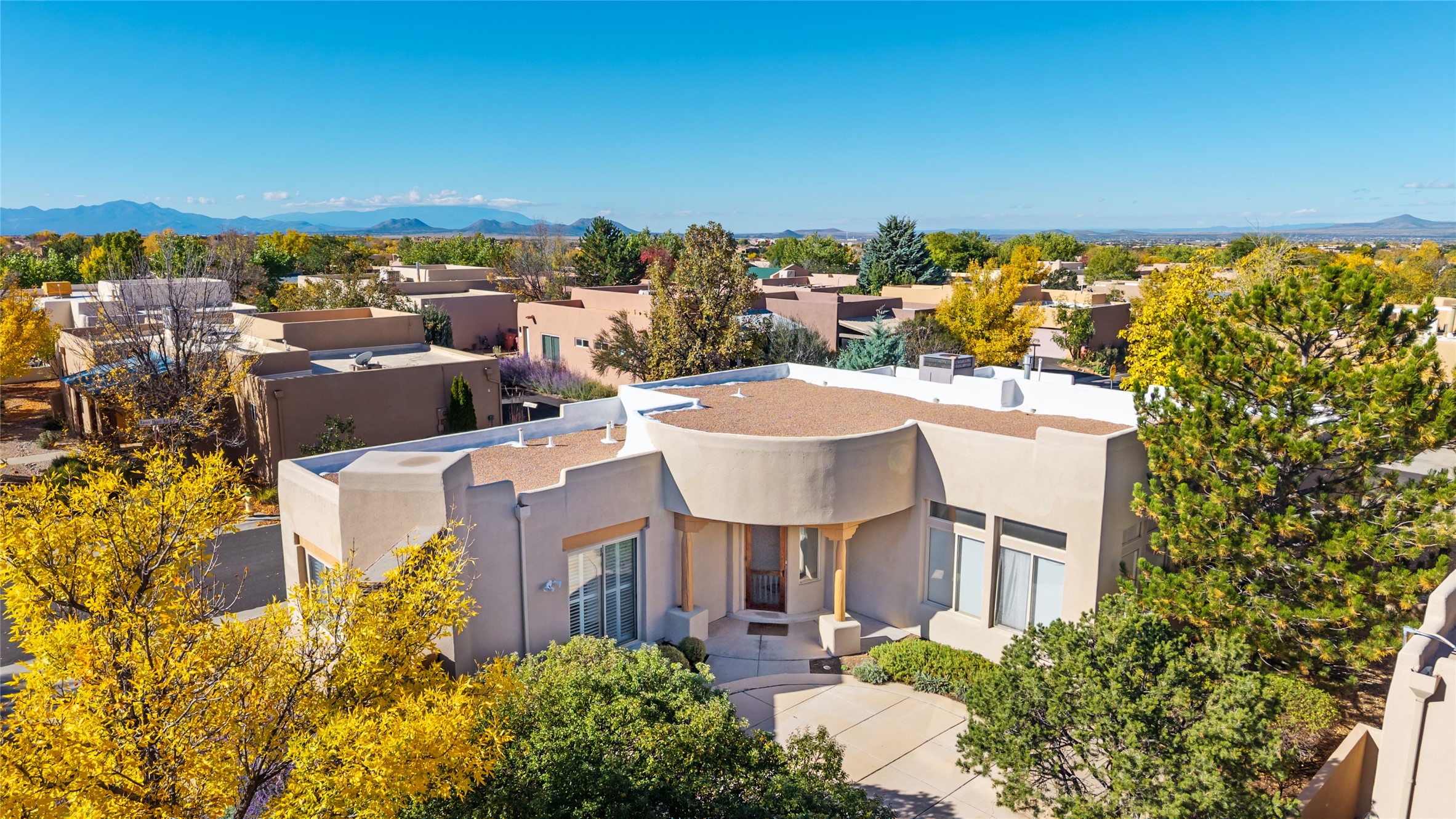 Delightful Rancho Viejo, former "Portal" model home. Beautiful courtyard entrance with mature landscaping. The entire interior has recently been professionally re-painted. Spacious living area with high ceilings and vigas and a gas fired kiva fireplace. Sensible split floorplan featuring 2 bedrooms plus an office with built-in shelving and a built-in desk area. Custom wood doors throughout. Primary bedroom and second bedroom have shutter blinds. Two car garage is finished and has plenty of storage cabinets. Stainless refrigerator and dishwasher replaced in the last 5 years. Roof redone in the last 5 years. Water heater and tankless replaced in 2019. Walled in back area too with nice trees! Rancho Viejo is a master planned community with 11,000 acres; 50% featuring natural open spaces. This home is close to walking trails, parks, the SF Community College, Target, Santa Fe Place Mall, many restaurants and grocery stores. This home is move-in ready!