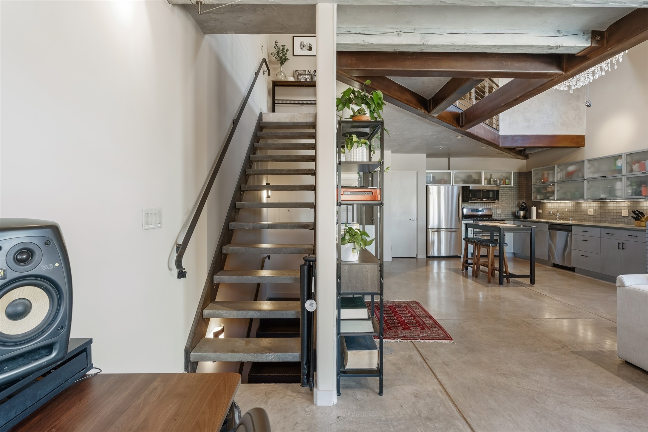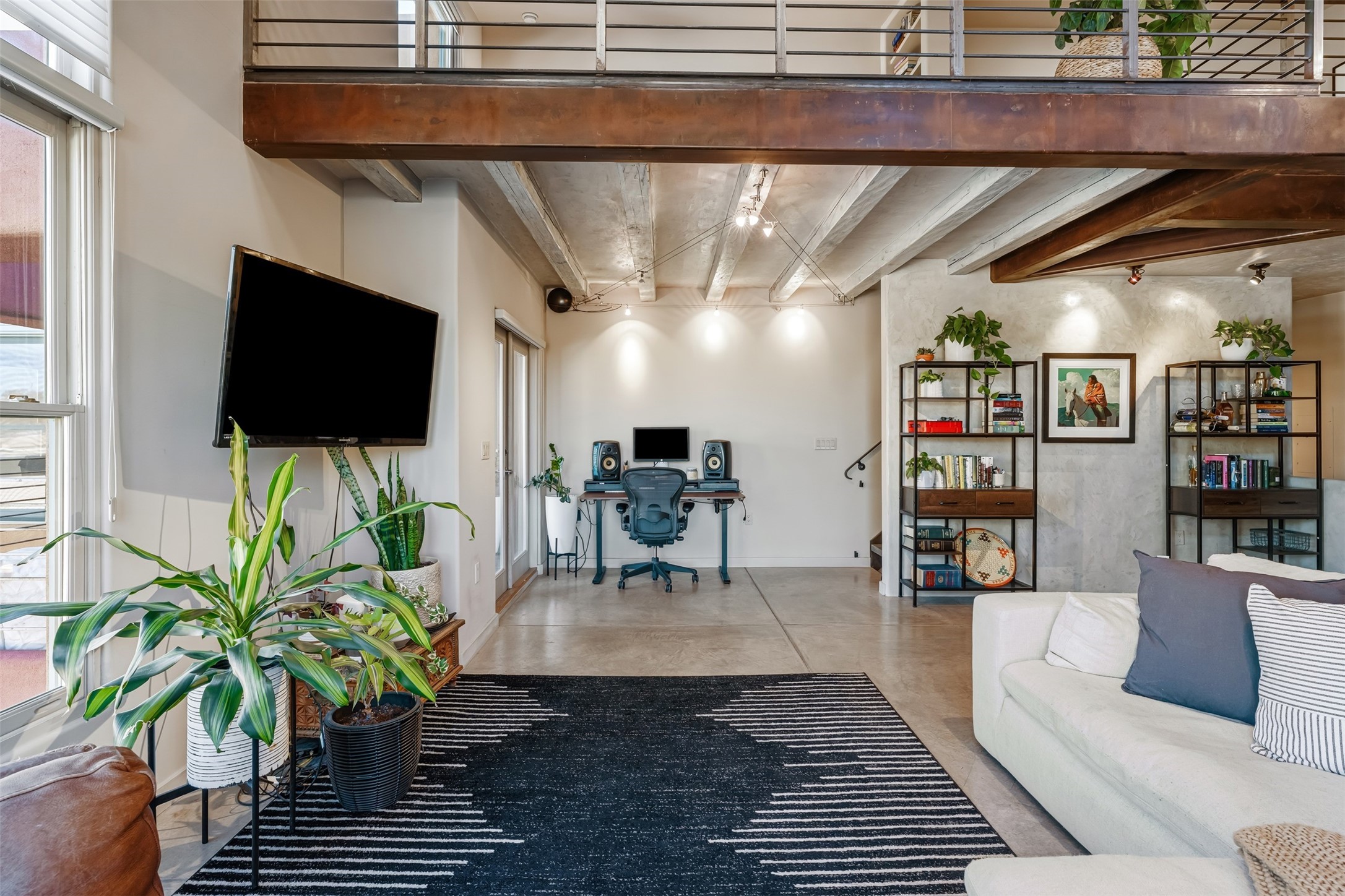 Contemporary live/work condo located in the highly sought-after South Capitol neighborhood--just a short walk to the Santa Fe Plaza and less than a mile from the Railyard District. Enjoy easy access to Whole Foods, Trader Joe's, Natural Grocers, popular restaurants, and a variety of local amenities. This two-level, second-floor residence offers 1 bedroom and 2 baths (1 full, 1 half) and is quietly tucked away at the back of the complex for added privacy. Expansive windows frame views of the Sangre de Cristo Mountains, while clerestory windows and soaring 17' ceilings fill the space with natural light.The open floor plan features a modern kitchen, sleek concrete floors with in-floor radiant heat, and new evaporative cooler. Step out from the living area onto a spacious deck to enjoy outdoor living and mountain views. Upstairs, the lofted bedroom offers generous closet space, a bath with a steam shower, and stackable laundry. Don't miss this unique opportunity to own a stylish and light-filled home in one of Santa Fe's most desirable neighborhoods.