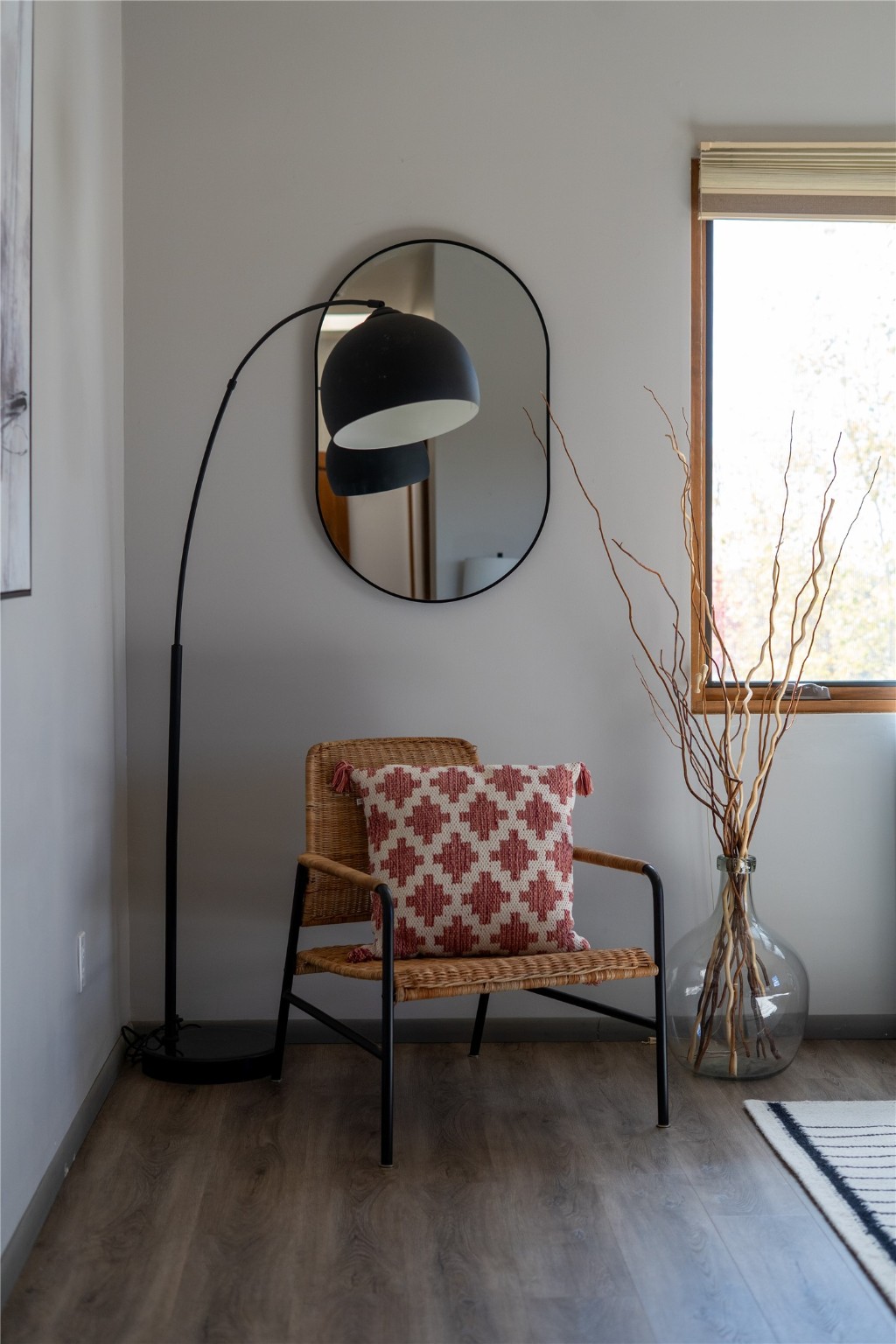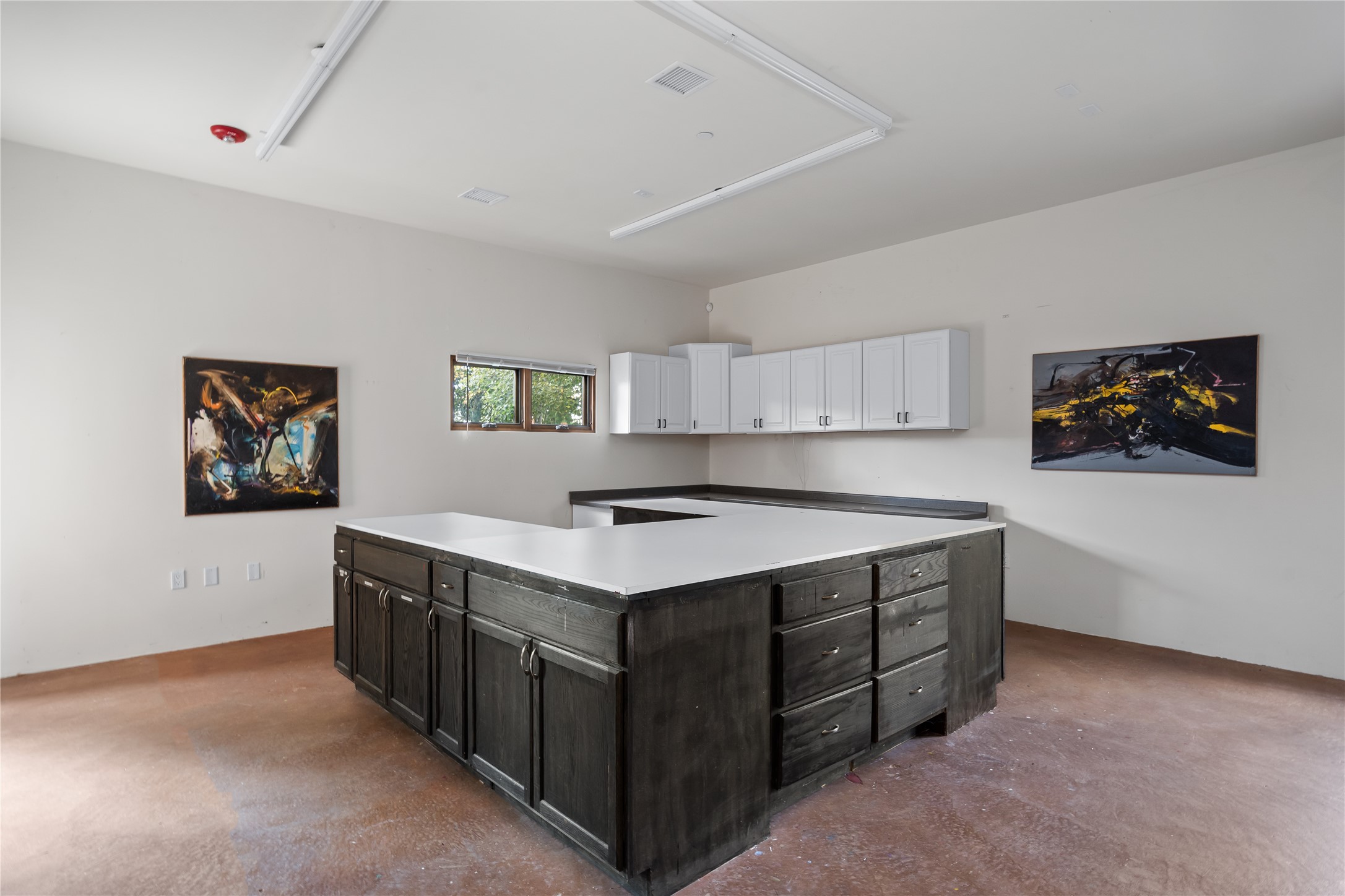 This modern corner-lot property in desirable Oshara Village offers the perfect blend of work and lifestyle flexibility. The ground floor features a spacious gallery/workshop--ideal for an artist, creative professional, or small business--divided into two rooms with expansive windows that flood the space with natural light. Additional highlights include a half-bath, workspace with a sink, durable concrete floors, and a lovely walled courtyard with flagstone, artificial grass, a pergola entertaining area, fountain, and mature landscaping, with direct access to a two-car garage.Upstairs, the light-filled two-bedroom, two-bath residence impresses with soaring ceilings, large windows, and an open floor plan. The chef's kitchen includes abundant workspace, a barstool-friendly island, sleek tile backsplash, and a GE Monogram six-burner cooktop/oven. The living area extends to a delightful outdoor deck, perfect for entertaining or enjoying mountain views. Luxury vinyl plank floors run throughout, creating a warm, modern feel.The spacious primary suite boasts a California Closets walk-in with built-ins, plus a spa-like bathroom with dual sinks, soaking tub, and separate shower. A second upstairs entrance from the back courtyard offers added flexibility--allowing the option to rent one level while living in the other.This unique property is a rare opportunity to combine work and home life in one stylish, functional space--or two separate spaces. Many other adjacent homes have also repurposed the downstairs as living space to provide the ultimate in comfort with multiple living areas. The popular Pantry Dos restaurant is within walking distance, along with an inviting community park and sculpture garden. The Santa Fe Community College with gym and swimming pool is nearby, and Richards and Rabbit Road offer easy access to Cerrillos/Zafarano shopping and the St. Francis Drive shopping area. The Plaza is an easy 15-minute drive.