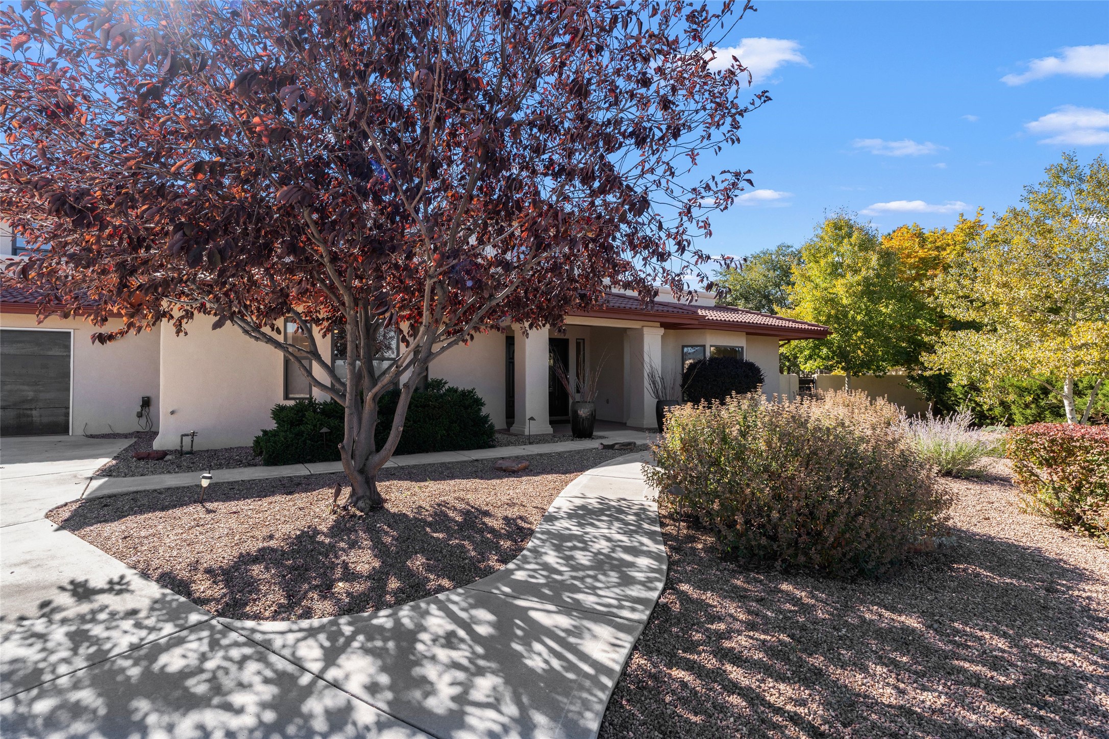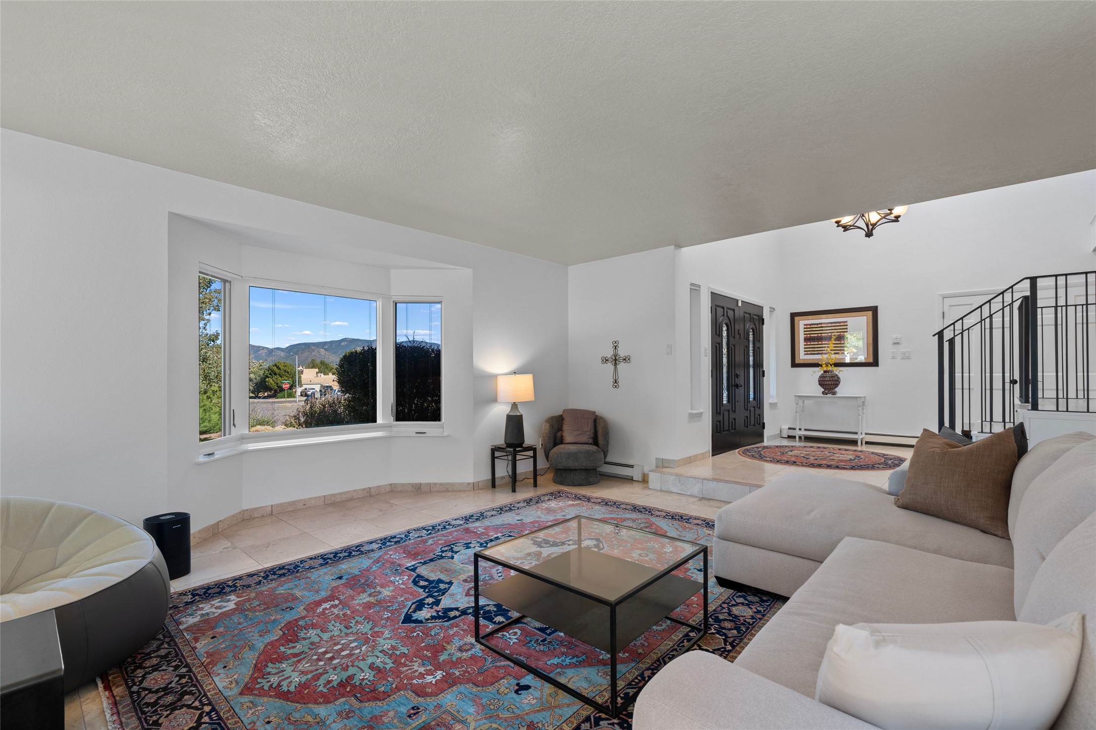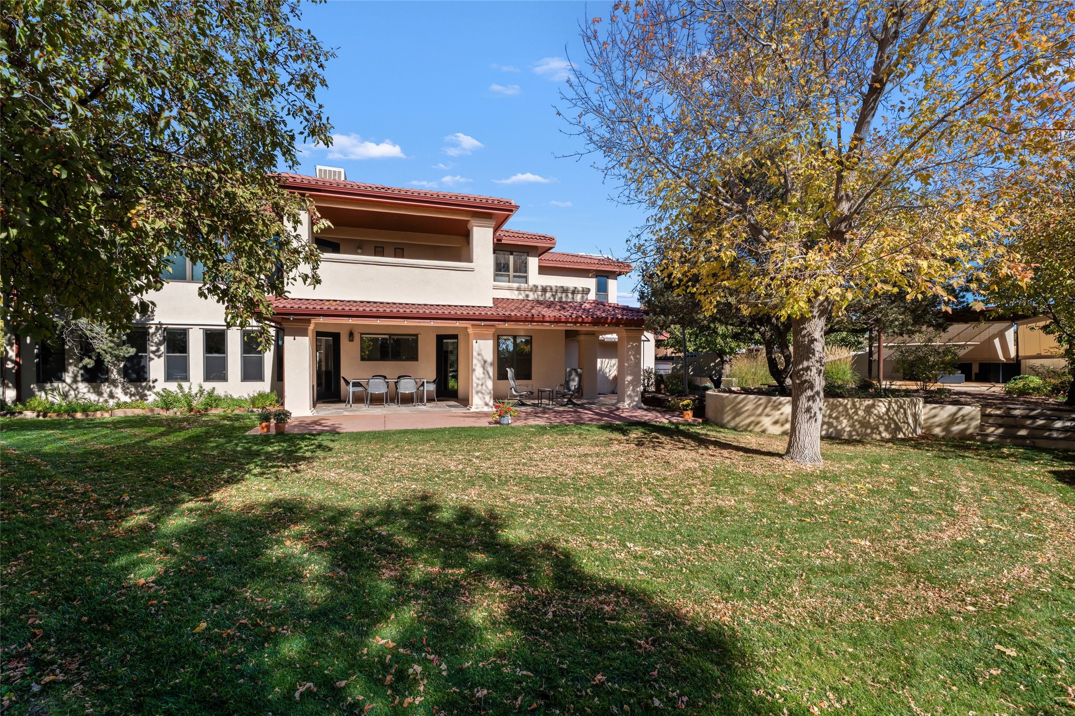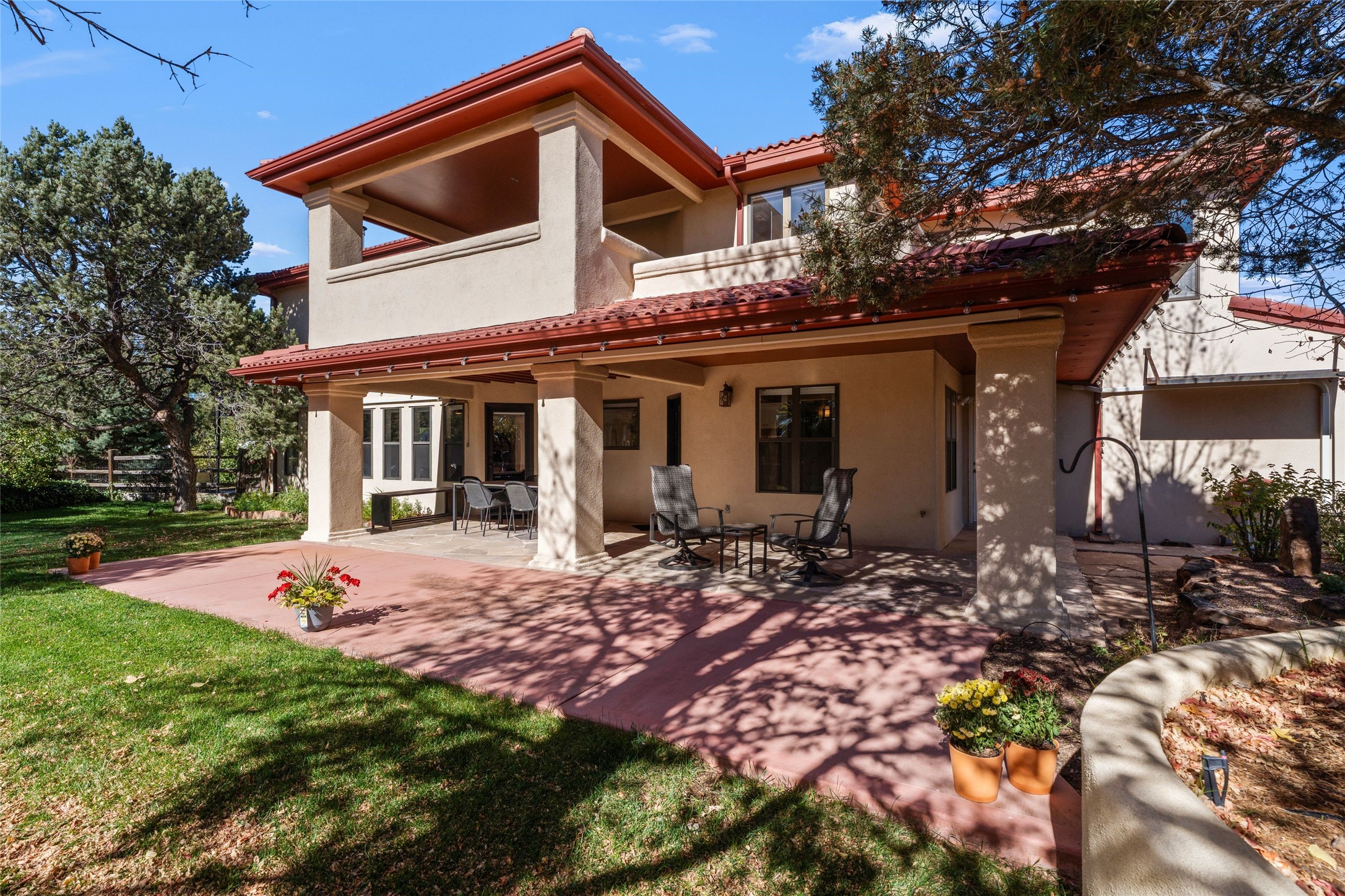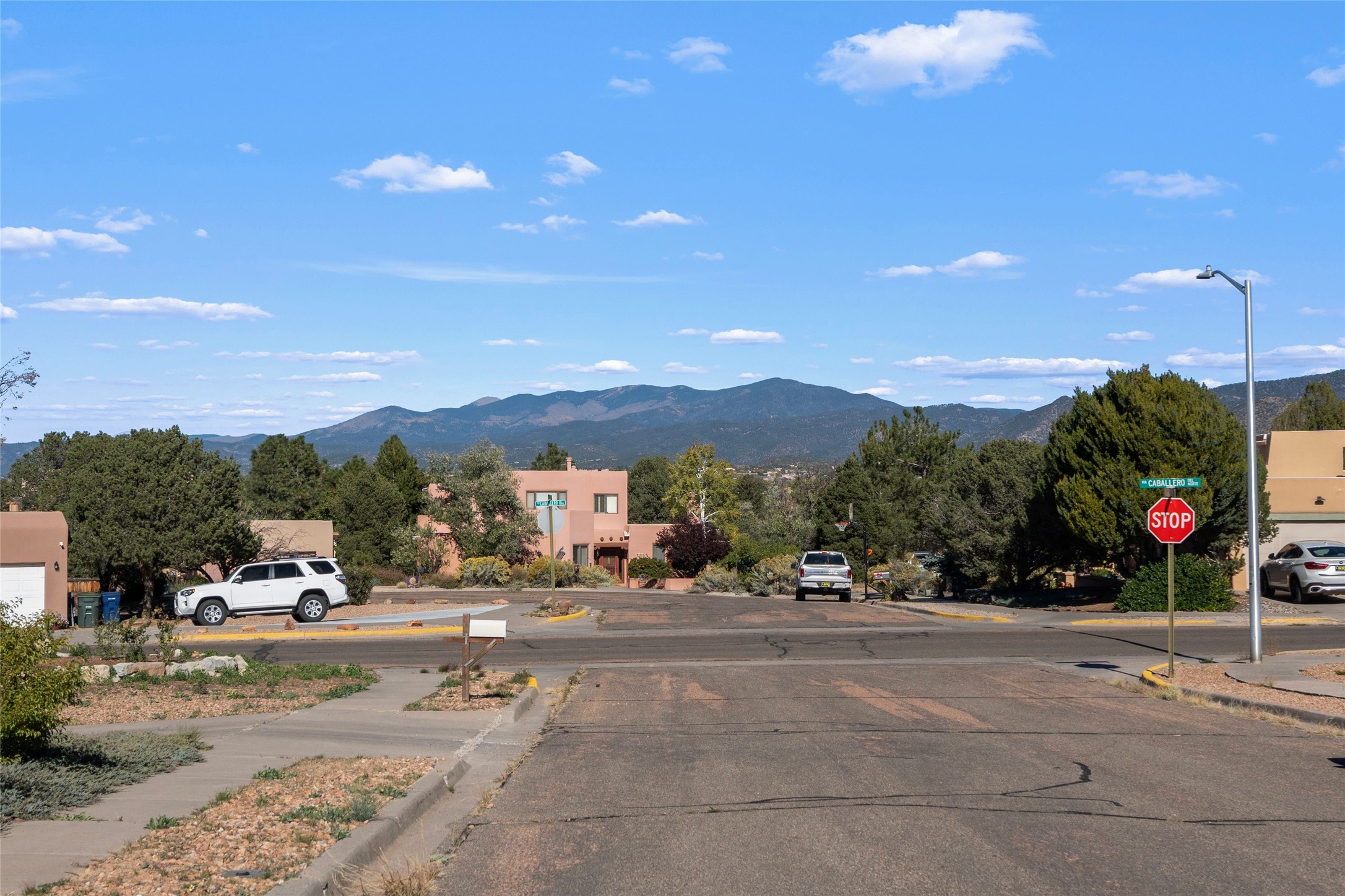 Views, views, views. Breathtaking Sangre de Cristo Views from a Refined Contemporary Mediterranean HomePerched in the desirable Via Caballero III neighborhood, this exceptional 3,660 sq. ft. residence captures panoramic views of the Sangre de Cristo Mountains and the twinkling city lights of Santa Fe. Thoughtfully renovated in 2008, 2016, and 2017, the home blends elegant Mediterranean architecture with modern sophistication.The heart of the home features a sleek, remodeled kitchen with a bright breakfast area and an expansive family room--perfect for gatherings or quiet mornings enjoying the mountain vistas. Travertine floors, energy-efficient windows, custom lighting, and designer interior finishes create a seamless, refined atmosphere throughout.The spacious primary suite offers a serene sitting area, a luxurious bath, and a 15-foot custom California Closet. Step onto the private covered balcony to experience the breathtaking sunsets and sweeping mountain panorama--a daily reminder of Santa Fe's beauty.The flexible 4/5-bedroom layout accommodates a variety of lifestyles, currently configured with three bedrooms plus a study/exercise room, with a generous game room that efficiently serves as a fifth bedroom or guest suite.Outdoor living is equally inviting, with a flagstone-paved portal and terrace ideal for entertaining, walled and landscaped gardens with pion and fruit trees on timed irrigation, and a charming fountain that adds a peaceful ambiance. The backyard is a true sanctuary--private, verdant, and ideally suited for relaxation or play.Experience the magic of Santa Fe's mountain light from a home designed to celebrate it at every turn.