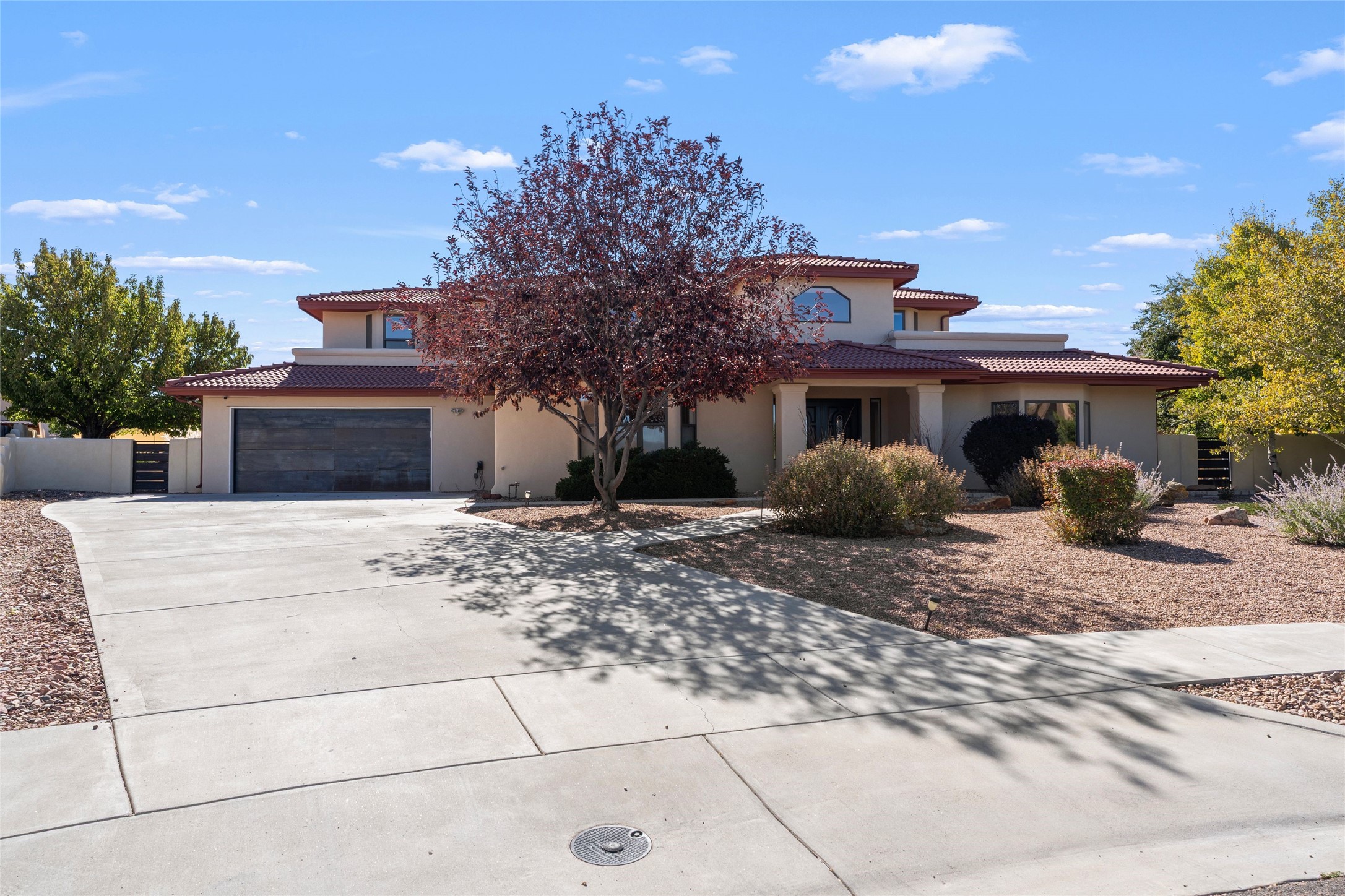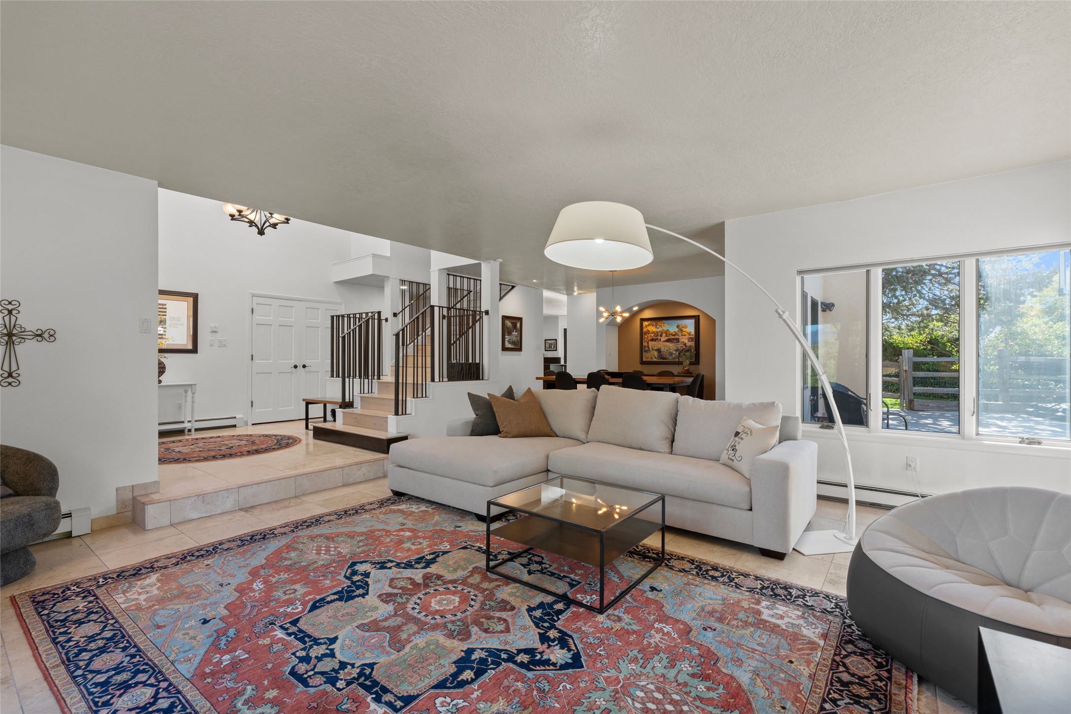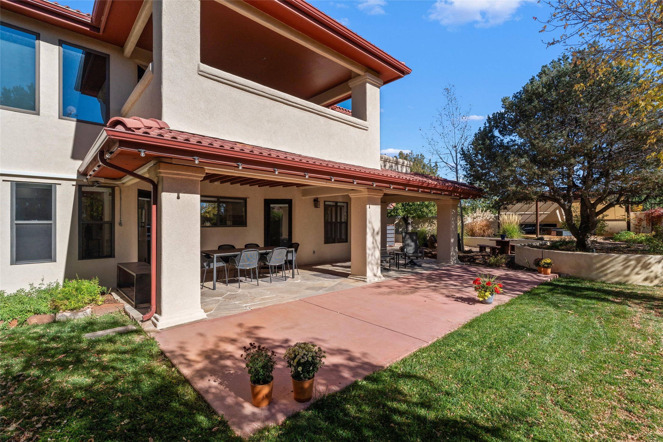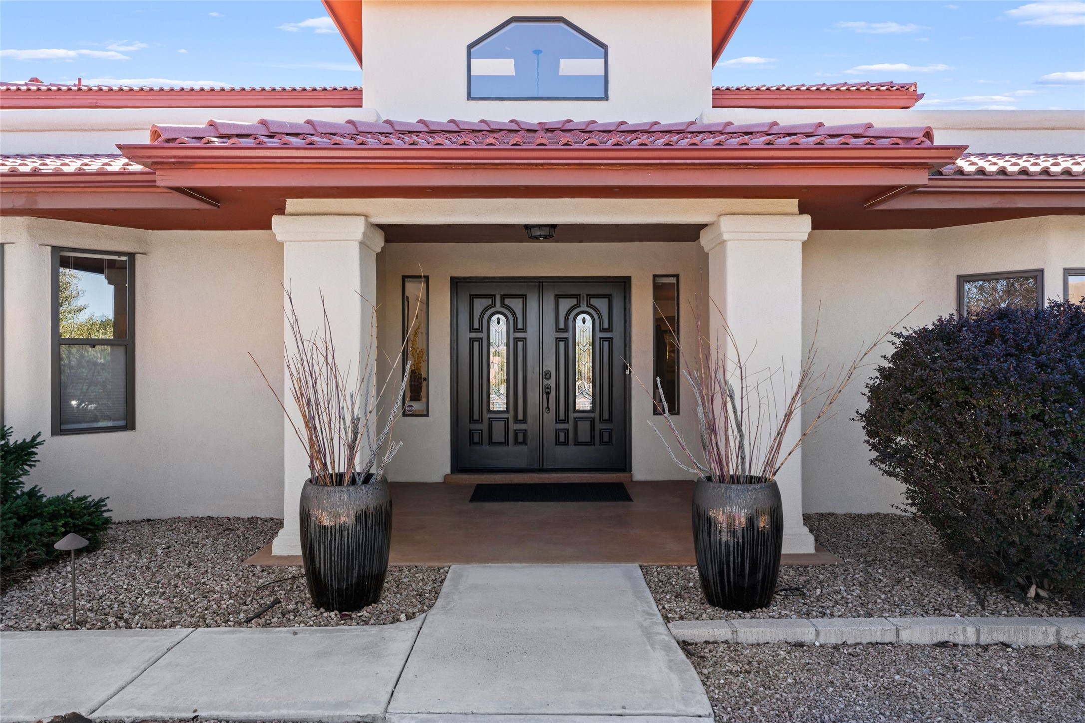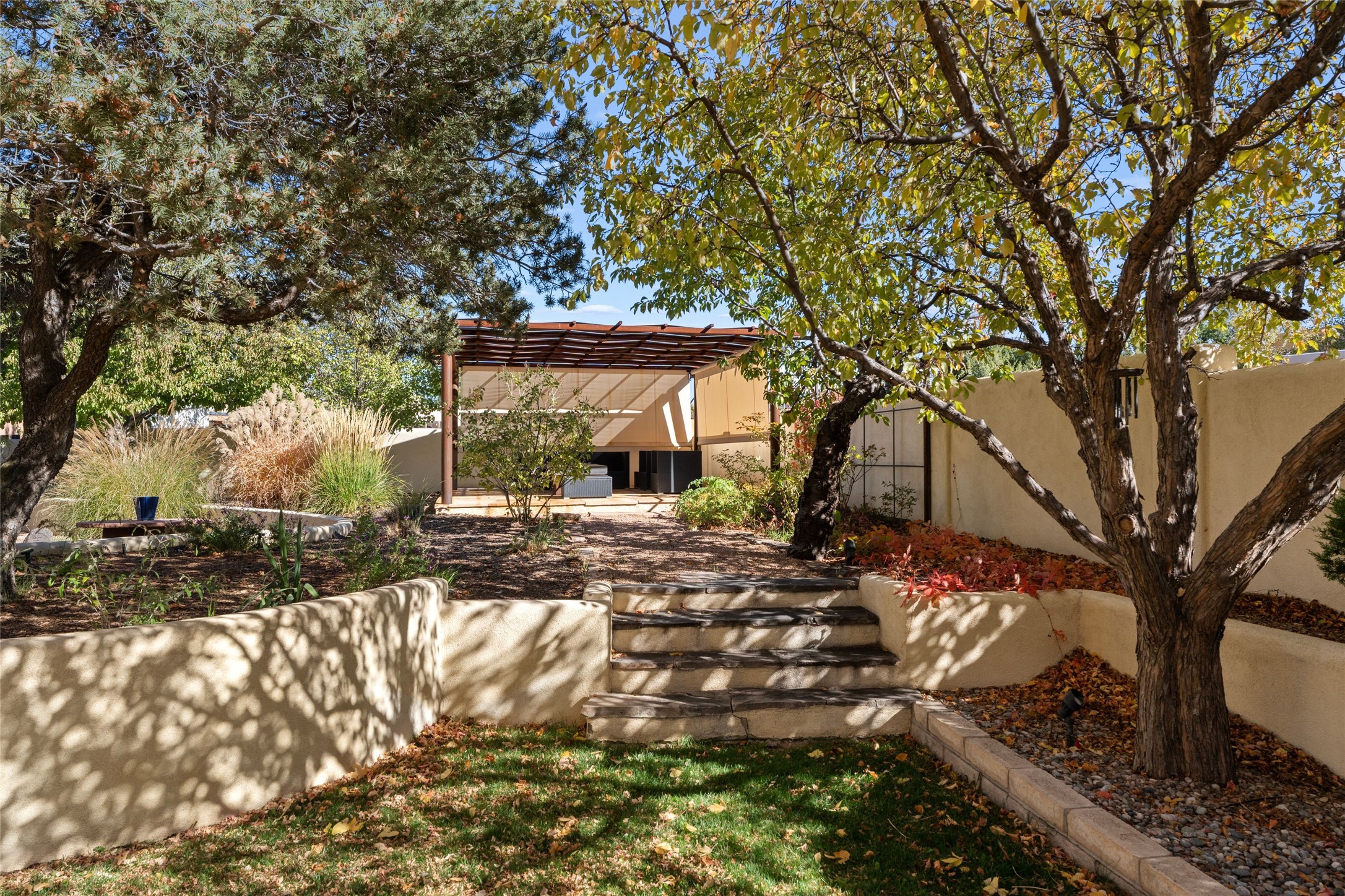 Views, views, views. Breathtaking Sangre de Cristo Views from a Refined Contemporary Mediterranean HomePerched in the desirable Via Caballero III neighborhood, this exceptional 3,660 sq. ft. residence captures panoramic views of the Sangre de Cristo Mountains and the twinkling city lights of Santa Fe. Thoughtfully renovated in 2008, 2016, and 2017, the home blends elegant Mediterranean architecture with modern sophistication.The heart of the home features a sleek, remodeled kitchen with a bright breakfast area and an expansive family room--perfect for gatherings or quiet mornings enjoying the mountain vistas. Travertine floors, energy-efficient windows, custom lighting, and designer interior finishes create a seamless, refined atmosphere throughout.The spacious primary suite offers a serene sitting area, a luxurious bath, and a 15-foot custom California Closet. Step onto the private covered balcony to experience the breathtaking sunsets and sweeping mountain panorama--a daily reminder of Santa Fe's beauty.The flexible 4/5-bedroom layout accommodates a variety of lifestyles, currently configured with three bedrooms plus a study/exercise room, with a generous game room that efficiently serves as a fifth bedroom or guest suite.Outdoor living is equally inviting, with a flagstone-paved portal and terrace ideal for entertaining, walled and landscaped gardens with pion and fruit trees on timed irrigation, and a charming fountain that adds a peaceful ambiance. The backyard is a true sanctuary--private, verdant, and ideally suited for relaxation or play.Experience the magic of Santa Fe's mountain light from a home designed to celebrate it at every turn.