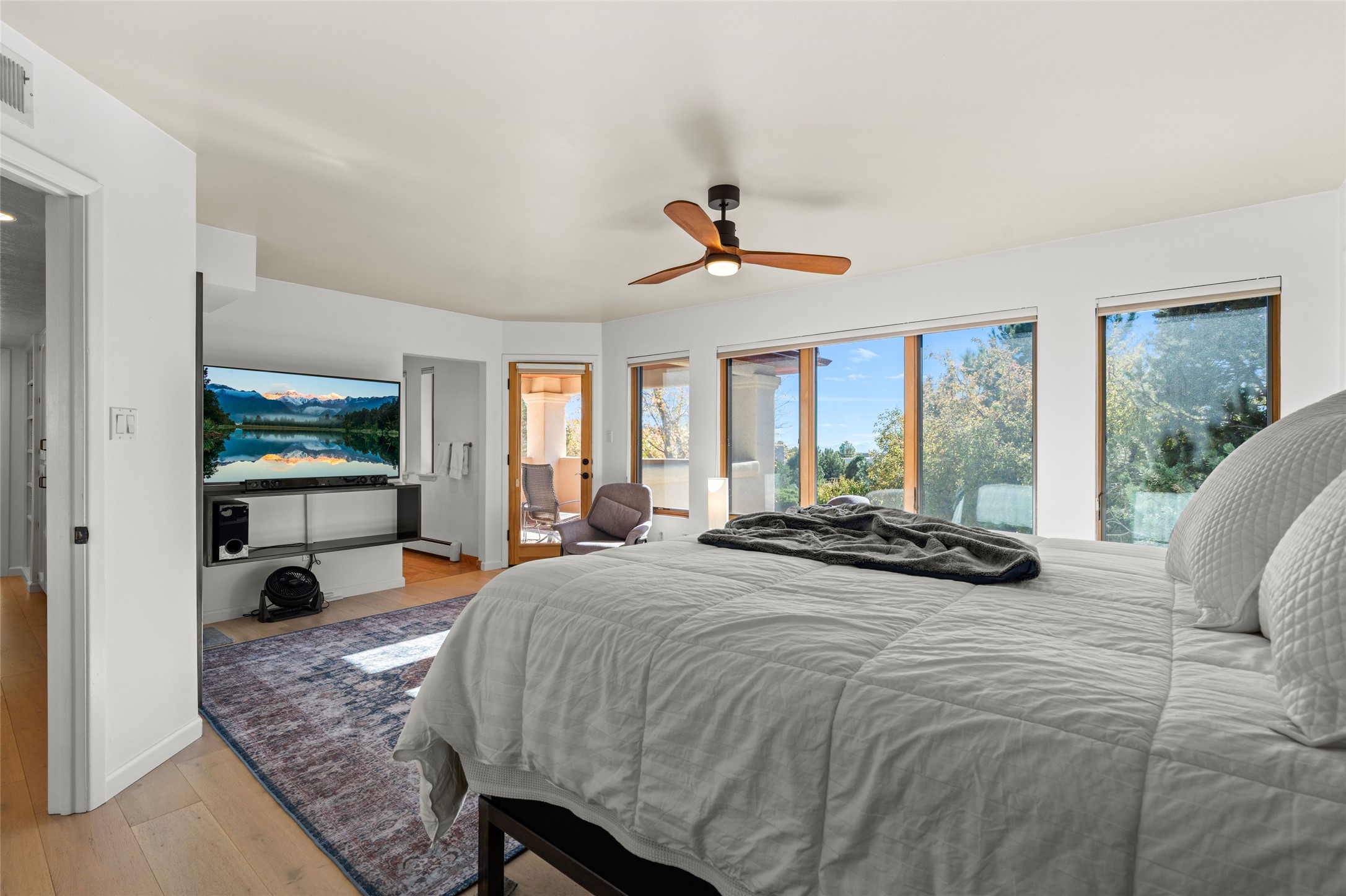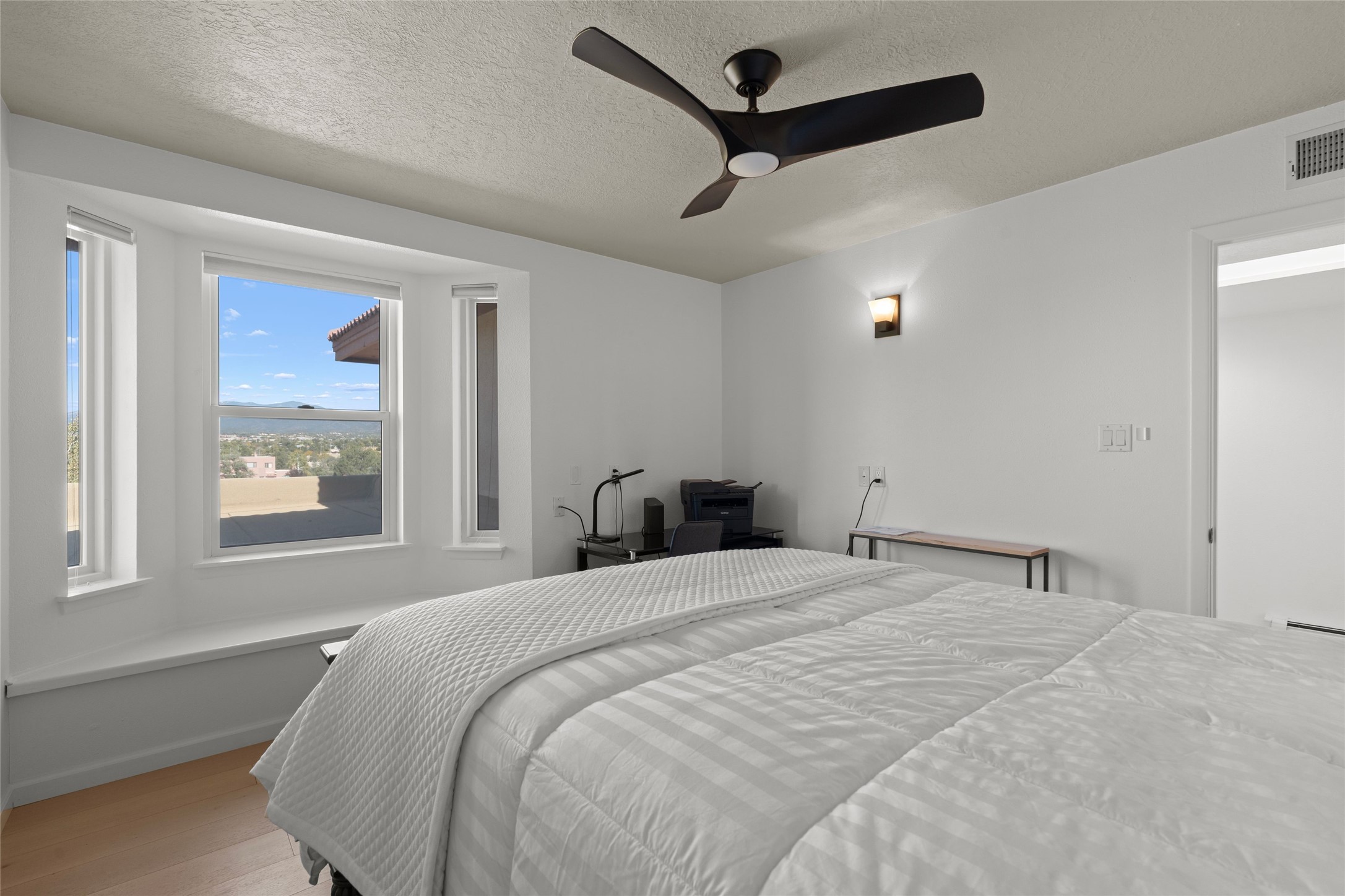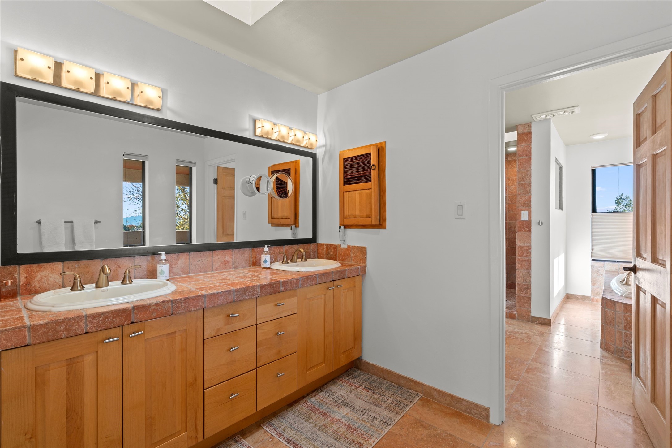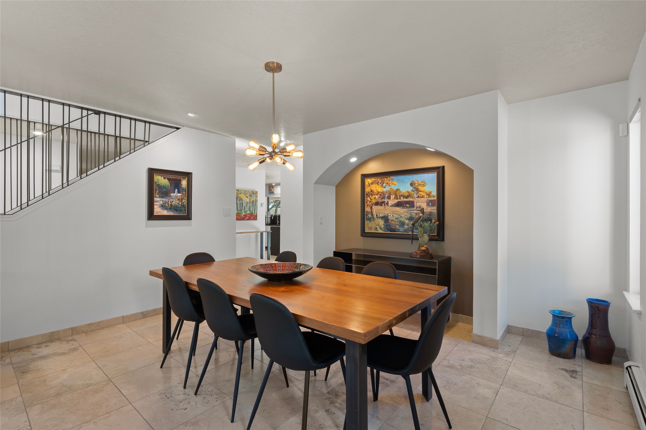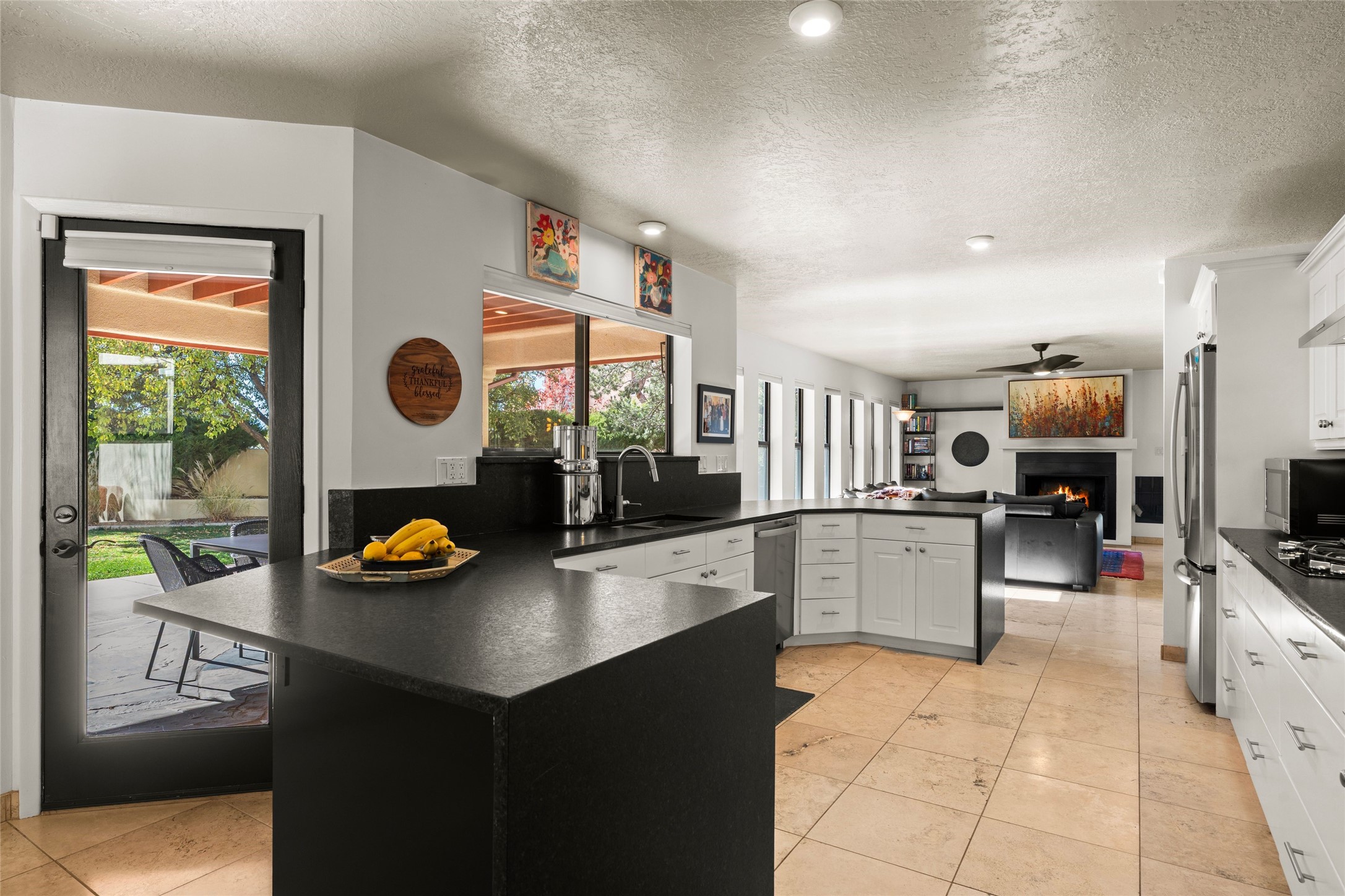 Views, views, views. Breathtaking Sangre de Cristo Views from a Refined Contemporary Mediterranean HomePerched in the desirable Via Caballero III neighborhood, this exceptional 3,660 sq. ft. residence captures panoramic views of the Sangre de Cristo Mountains and the twinkling city lights of Santa Fe. Thoughtfully renovated in 2008, 2016, and 2017, the home blends elegant Mediterranean architecture with modern sophistication.The heart of the home features a sleek, remodeled kitchen with a bright breakfast area and an expansive family room--perfect for gatherings or quiet mornings enjoying the mountain vistas. Travertine floors, energy-efficient windows, custom lighting, and designer interior finishes create a seamless, refined atmosphere throughout.The spacious primary suite offers a serene sitting area, a luxurious bath, and a 15-foot custom California Closet. Step onto the private covered balcony to experience the breathtaking sunsets and sweeping mountain panorama--a daily reminder of Santa Fe's beauty.The flexible 4/5-bedroom layout accommodates a variety of lifestyles, currently configured with three bedrooms plus a study/exercise room, with a generous game room that efficiently serves as a fifth bedroom or guest suite.Outdoor living is equally inviting, with a flagstone-paved portal and terrace ideal for entertaining, walled and landscaped gardens with pion and fruit trees on timed irrigation, and a charming fountain that adds a peaceful ambiance. The backyard is a true sanctuary--private, verdant, and ideally suited for relaxation or play.Experience the magic of Santa Fe's mountain light from a home designed to celebrate it at every turn.