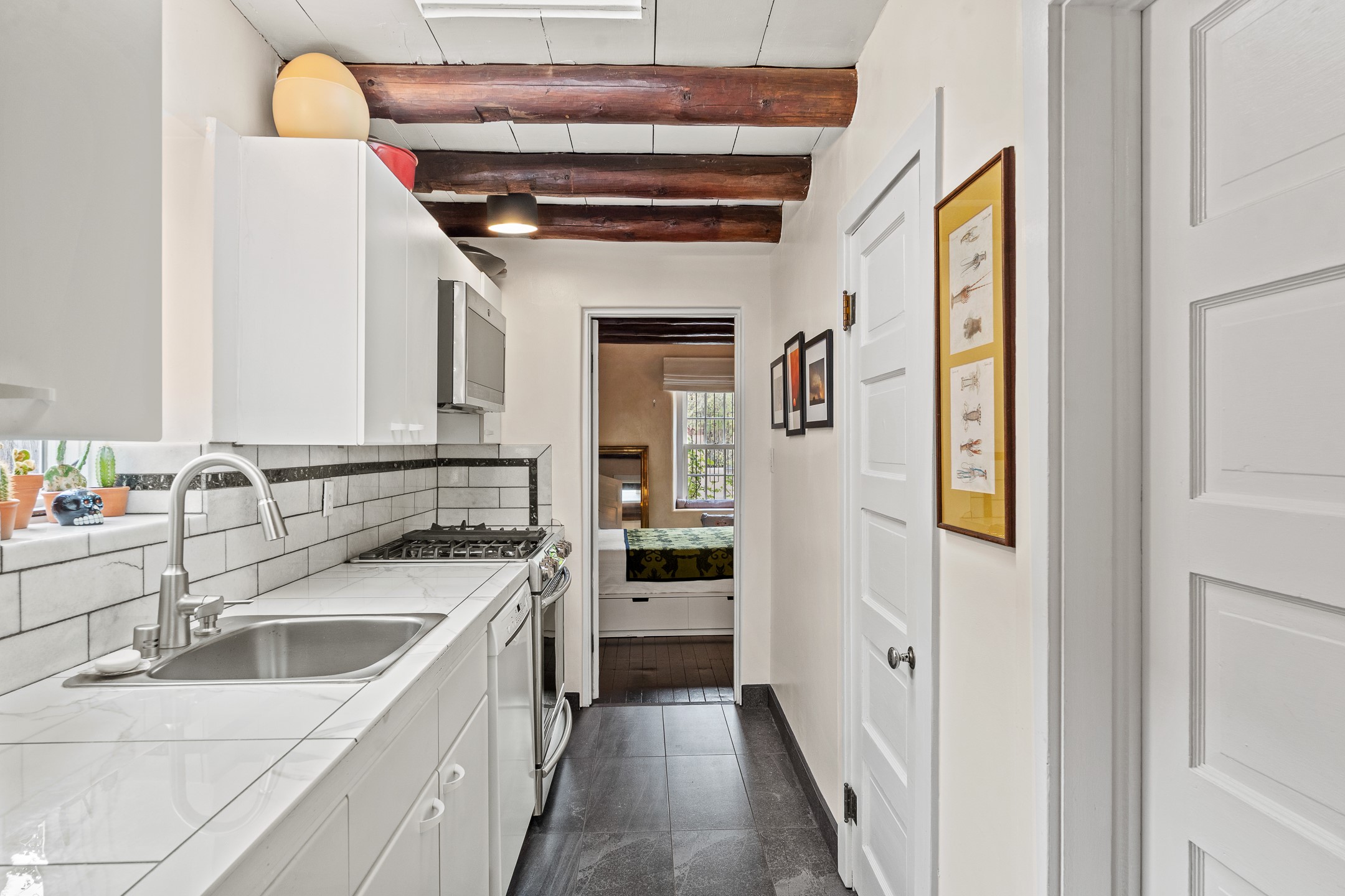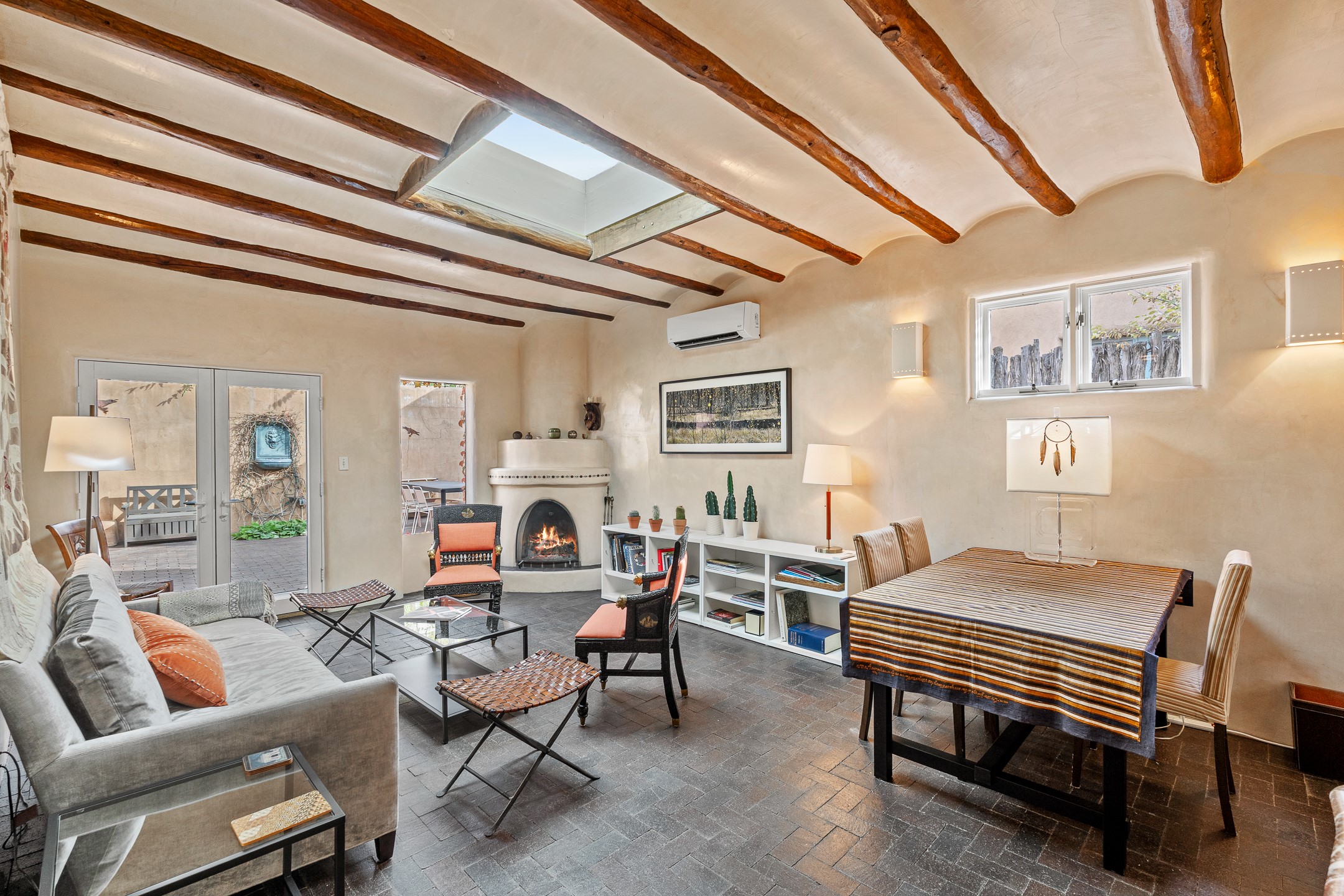Exuding the timeless character of original Santa Fe style, this light-filled 1-bedroom, 1-bath adobe is perfectly positioned on picturesque Arroyo Tenorio--just around the corner from Kaune's, the Plaza, and your morning coffee at Downtown Subscription. The ideal Santa Fe pied--terre, lock-and-leave retreat, or turnkey rental.Showcasing the warmth of classic Territorial adobe architecture, the inviting living room features a wood-burning kiva fireplace, vigas, plaster walls, and tile floors that beautifully reflect the home's authentic character. Sunlight streams through the space, creating a bright and welcoming ambiance. A private outdoor patio extends the living area and offers a sunny, tranquil setting for morning coffee or evening gatherings--complete with its own kiva fireplace for year-round enjoyment. The cozy bedroom offers a peaceful retreat, while the sweet, efficient kitchen blends charm with functionality--perfect for preparing a quiet breakfast or hosting friends. Comfort is ensured with two mini-split systems providing efficient heating and cooling.Beautifully located, beautifully styled, and effortlessly livable--this enchanting home places you just steps from Santa Fe's finest dining, boutiques, galleries, and cultural landmarks. A rare opportunity to own a turnkey treasure in one of the city's most beloved and walkable neighborhoods.